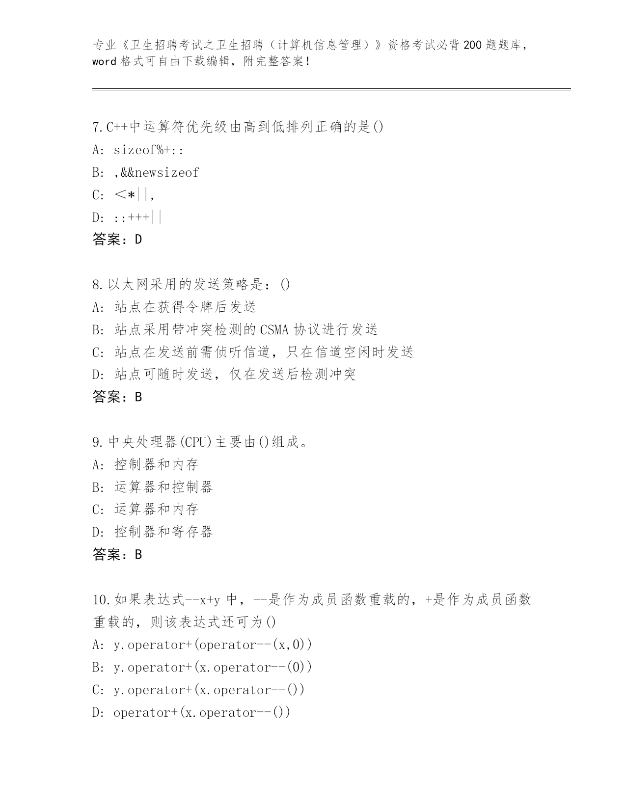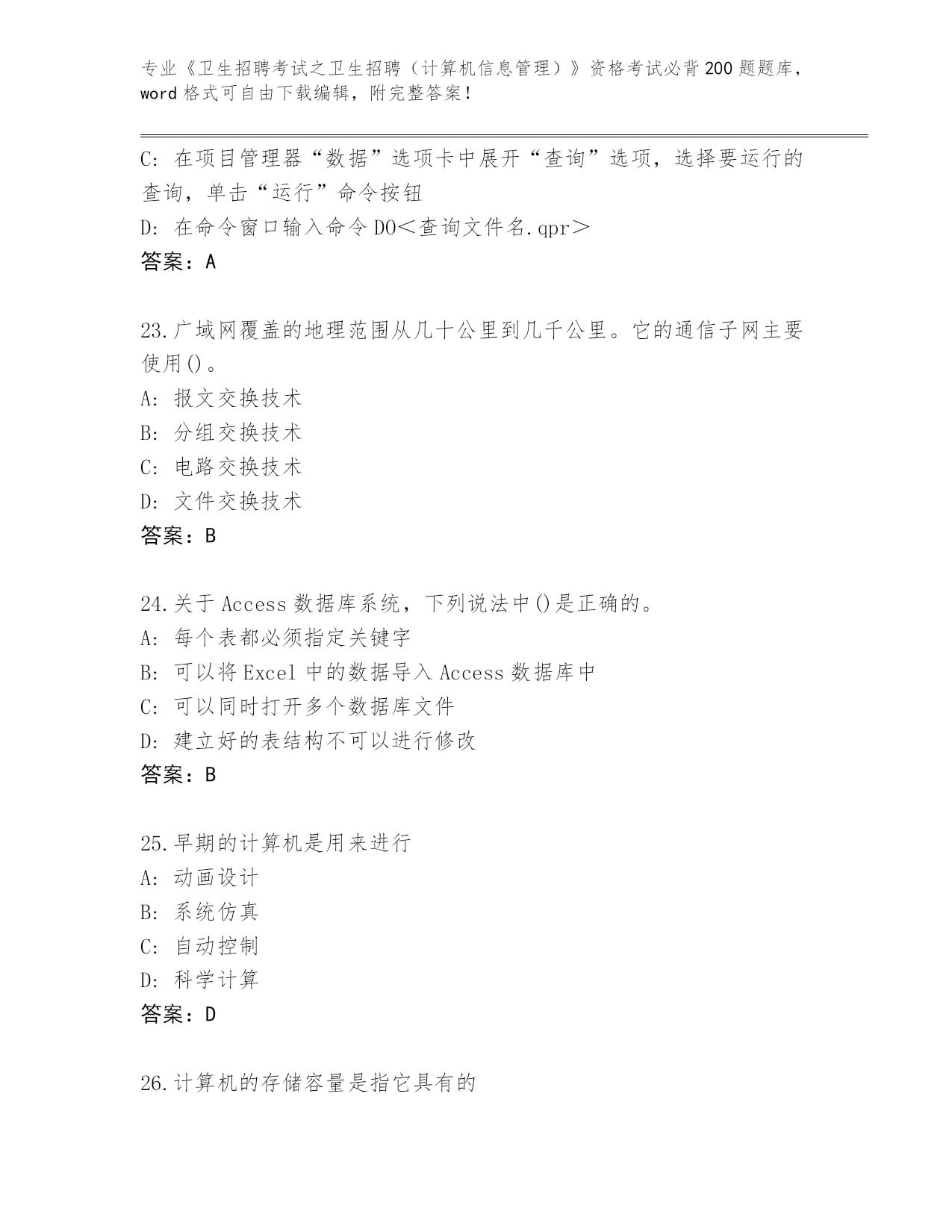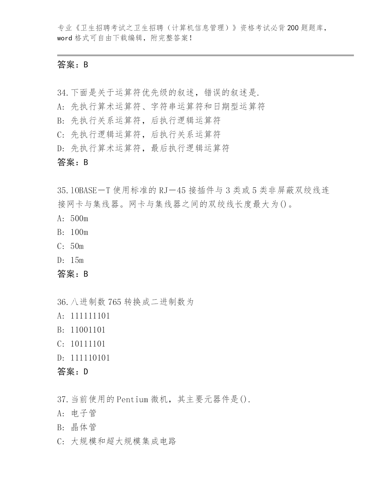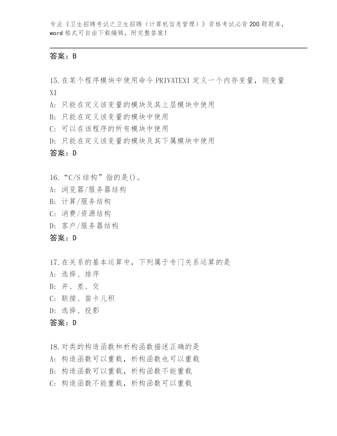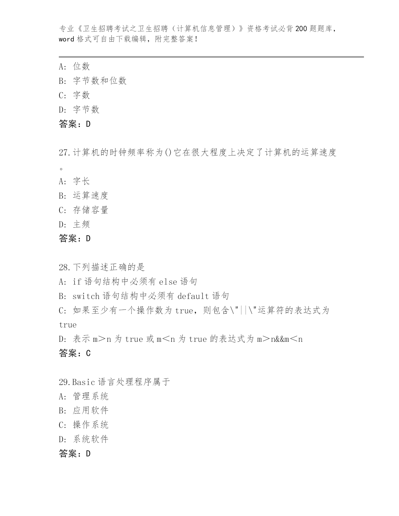 河北省蠡县《卫生招聘考试之卫生招聘(计算机信息管理)》资格考试必背200题大全加答案