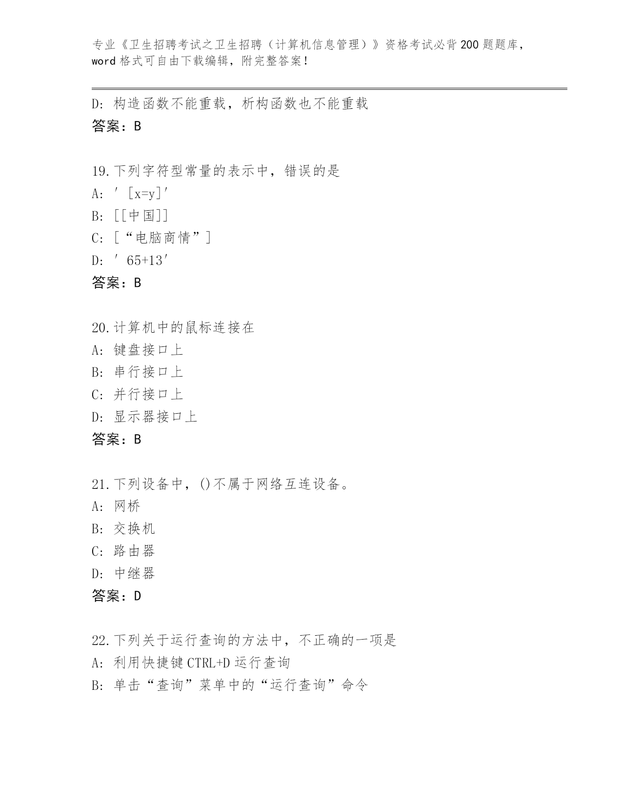 历年湖北省云梦县《卫生招聘考试之卫生招聘(计算机信息管理)》考试必背200题真题(考试直接用)