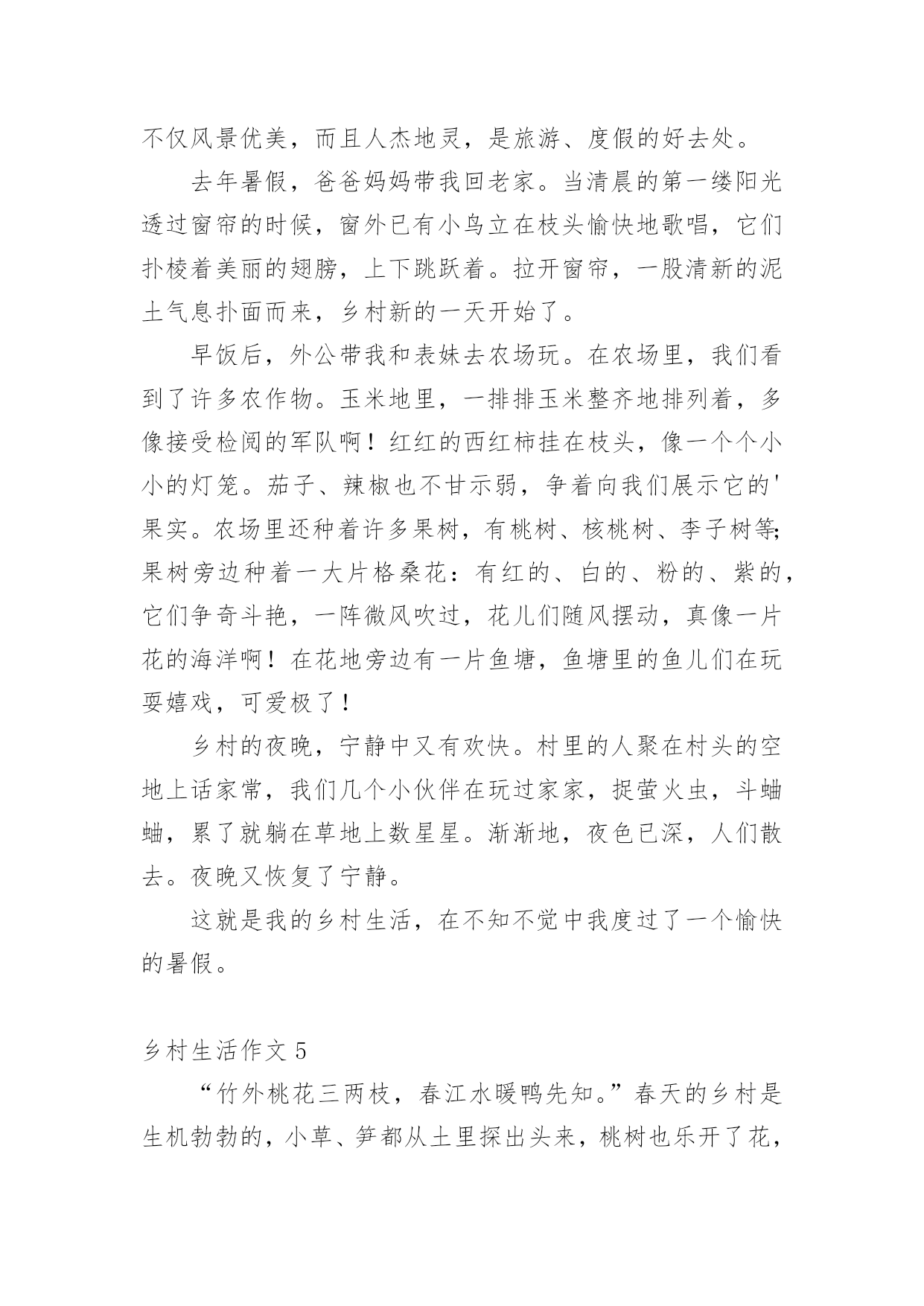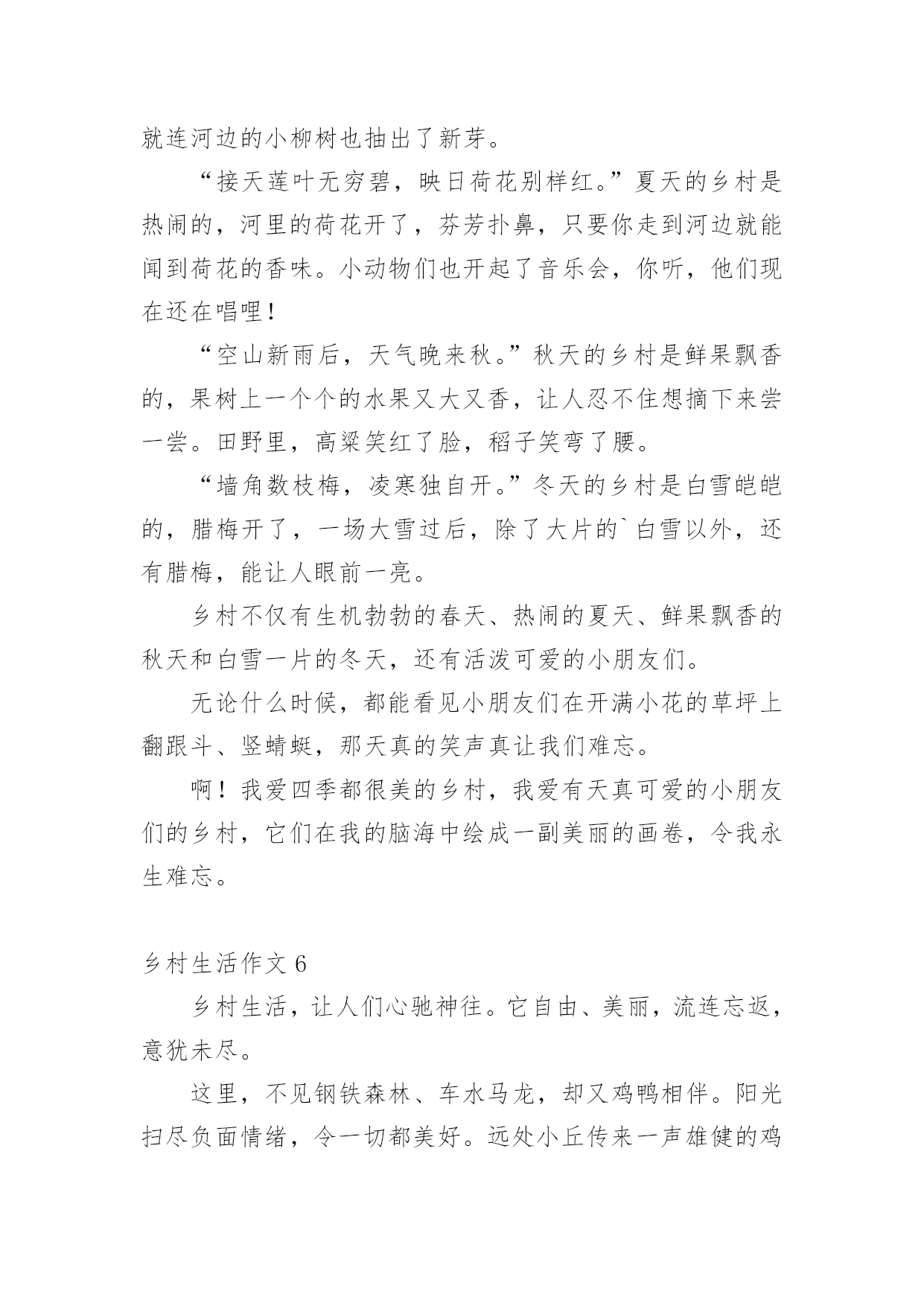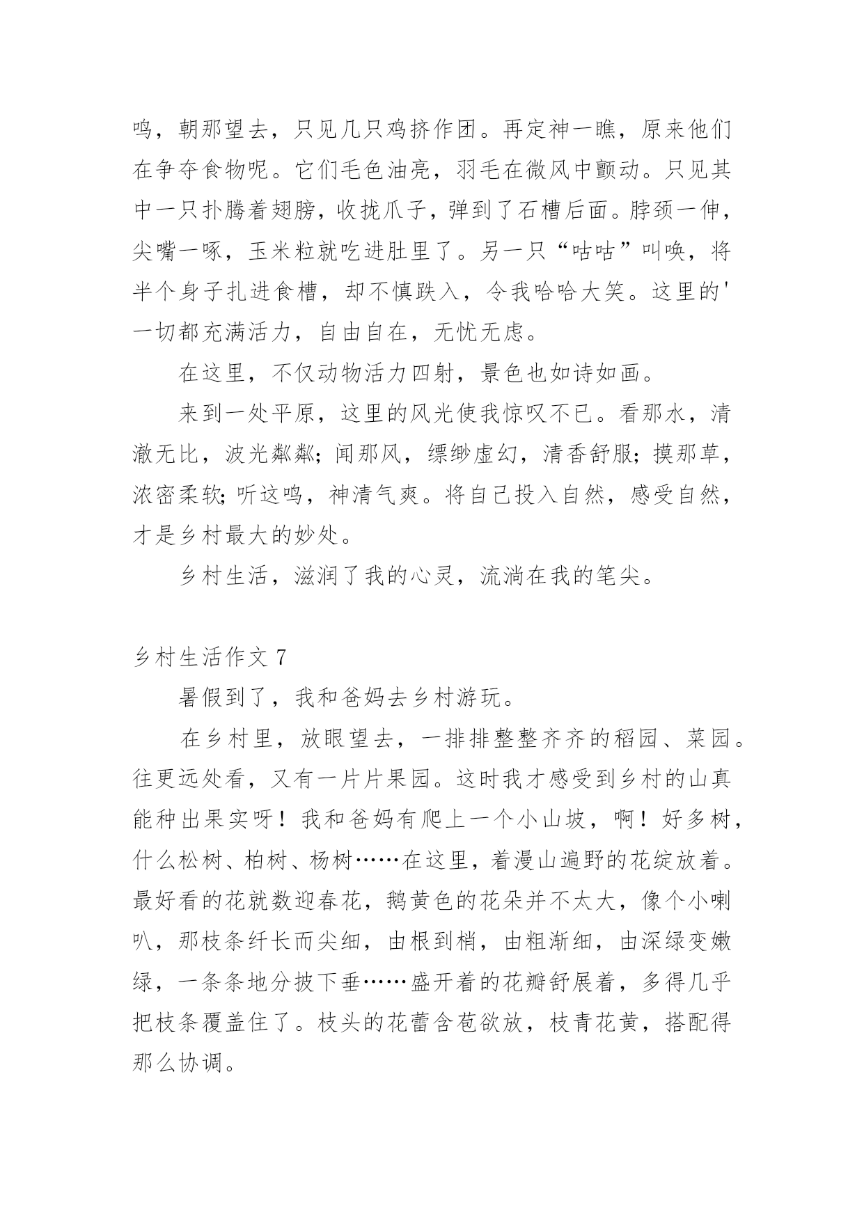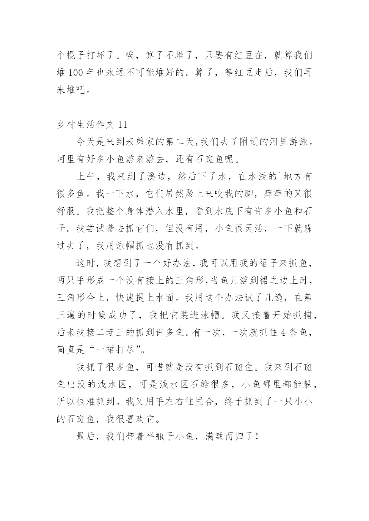 乡村生活作文在日常学习、工作和生活中,大家总免不了要接触或使用作文吧,作文根据写作时限的不同可以分为限时作文和非限时作文。你写作文时总是无从下笔?以下是小编为大家收集的乡村生活作文,欢迎阅读与收藏。乡村生活作文1乡村,虽然住着小小的平房,但是,它的水是清的,天空格外的蓝,树是绿的,我的家就在乡村。我的家住在整个屯子最边上的`一家。我家门口是一条河,河对面就是城里。每到河水涨高的时候,家人或邻居就到竹林里去,砍下几只竹,把竹竿固定在一起,做成竹桥。家门口的路是泥土路,下了雨后,路更是难走,而且会把泥带回到屋子里,弄得很是脏,后来,生活条件好了,政府帮着修了路,现在,每条路都是和城里的柏油马路一样,不管下了多大的雨,人们也不再担心脚下的泥水,大家经常说的一句话:“政府好啊,现在的农村也算是个”城外城“了,过上了城里人希望的”别墅“生活,田园风光自由自在。夏天的时候,河里经常是一群一群鸭子嬉戏的天下,不时的把头扎到水下去觅食。乡村的人家常常要养几只鸡。我家也是如此。一只母鸡领着一群小鸡觅食,大公鸡也会常伴左右,常常抬起灰色的爪子,挥舞着它一身的彩毛,骄傲的向远方眺望。有时大踏步的走来走去。闲暇的时候,大人们总要和邻居在树荫下下棋,我们小孩则是整个村子的疯跑,可以一直玩到太阳落山,乡村的孩子想怎么玩就怎么玩……乡村,无论什么时候,什么季节,都是一道独特的风景。乡村生活作文2每当放假的时候我总是会去乡下的老家看看。乡下人家没有高楼大厦,也没有车水马龙。大多是两层或三层的小洋楼,也有白墙黑瓦的平屋。房前有着特别大的晒场,一般用来晒稻谷或玉米,小孩儿也可以在那里玩耍。时不时邀上三五个朋友在晒场上玩耍,或是在稻田里玩躲猫猫,或是在山坡上打滚。田家做活的大人们弯着腰,擦着汗,听着孩童们的笑声,也不自觉的弯起了嘴角。这一切绘成了一幅美丽的乡村风景画。伴着夕阳,余晖洒向田间。头上飞过一只只归巢的鸟儿,鸭子们也摇摇摆摆,成群结队地回了主人的池塘。我们也跟着队伍奔向家的'方向。不久,袅袅炊烟升起,你会闻到柴火的香味夹杂着饭菜的清香。乡下人家吃饭时,总会把桌椅饭菜搬到门前。边吃边聊,说着一天家里的小事,也聊聊国家的大事。夜晚村子的天空,黑色上点缀着繁星。少了城市的喧嚣,只有鸟儿和蛐蛐的叫声。乡村生活不仅恬静,而且悠闲。乡村生活作文3乡村的生活令人向往,与城市大不相同,但体现了自己的风格,乡下人家总住着小小的房屋,没有城市那样华丽,却有着一番风趣。春天,鸟语花香,百花盛开。人们都忙着播种,种子们在泥土里无忧无虑的,他们有时候土地妈妈对话,有时候和昆虫宝宝游戏,有时和小草们讲故事。夏天,小溪清澈见底,几只鱼儿在水里自由自在的游来游去,有的在睡觉,有的在追逐嬉戏,还有的探出水面欣赏着美丽的风景,河面上,小鸭子披着雪白的羽衣,你追我赶,十分快乐。就算旁边有妇女在捣衣,它们也从不吃惊。秋天,是一个丰收的季节。田野换上了金黄色的衣裳,稻谷压弯了腰,高粱涨红了脸,到处一派丰收的景象。果园里,梨子打着一个个小灯笼,李子好似一个个小孩子挂在枝头,千里外的人都能闻到一片瓜果的香气。冬天,整个世界都成了白雪的天下,雪花到处飞舞,晶莹的.冰霜挂满树梢,孩子们穿着厚厚的棉袄,冲出家门,堆雪人,打雪仗,快活极了。乡村的生活是多姿多彩的。它是一道美丽的彩虹,带给我们快乐,它是一片灿烂的阳光,照亮我们的心灵,它是一束美丽的鲜花,给我们的生活添加了色彩。乡村生活作文4我的老家在陕西省西安市周至县,那里属于关中平原,不仅风景优美,而且人杰地灵,是旅游、度假的好去处。去年暑假,爸爸妈妈带我回老家。当清晨的第一缕阳光透过窗帘的时候,窗外已有小鸟立在枝头愉快地歌唱,它们扑棱着美丽的翅膀,上下跳跃着。拉开窗帘,一股清新的泥土气息扑面而来,乡村新的一天开始了。早饭后,外公带我和表妹去农场玩。在农场里,我们看到了许多农作物。玉米地里,一排排玉米整齐地排列着,多像接受检阅的军队啊!红红的西红柿挂在枝头,像一个个小小的灯笼。茄子、辣椒也不甘示弱,争着向我们展示它的'果实。农场里还种着许多果树,有桃树、核桃树、李子树等;果树旁边种着一大片格桑花:有红的、白的、粉的、紫的,它们争奇斗艳,一阵微风吹过,花儿们随风摆动,真像一片花的海洋啊!在花地旁边有一片鱼塘,鱼塘里的鱼儿们在玩耍嬉戏,可爱极了!乡村的夜晚,宁静中又有欢快。村里的人聚在村头的空地上话家常,我们几个小伙伴在玩过家家,捉萤火虫,斗蛐蛐,累了就躺在草地上数星星。渐渐地,夜色已深,人们散去。夜晚又恢复了宁静。这就是我的乡村生活,在不知不觉中我度过了一个愉快的暑假。乡村生活作文5“竹外桃花三两枝,春江水暖鸭先知。”春天的乡村是生机勃勃的,小草、笋都从土里探出头来,桃树也乐开了花,就连河边的小柳树也抽出了新芽。“接天莲叶无穷碧,映日荷花别样红。”夏天的乡