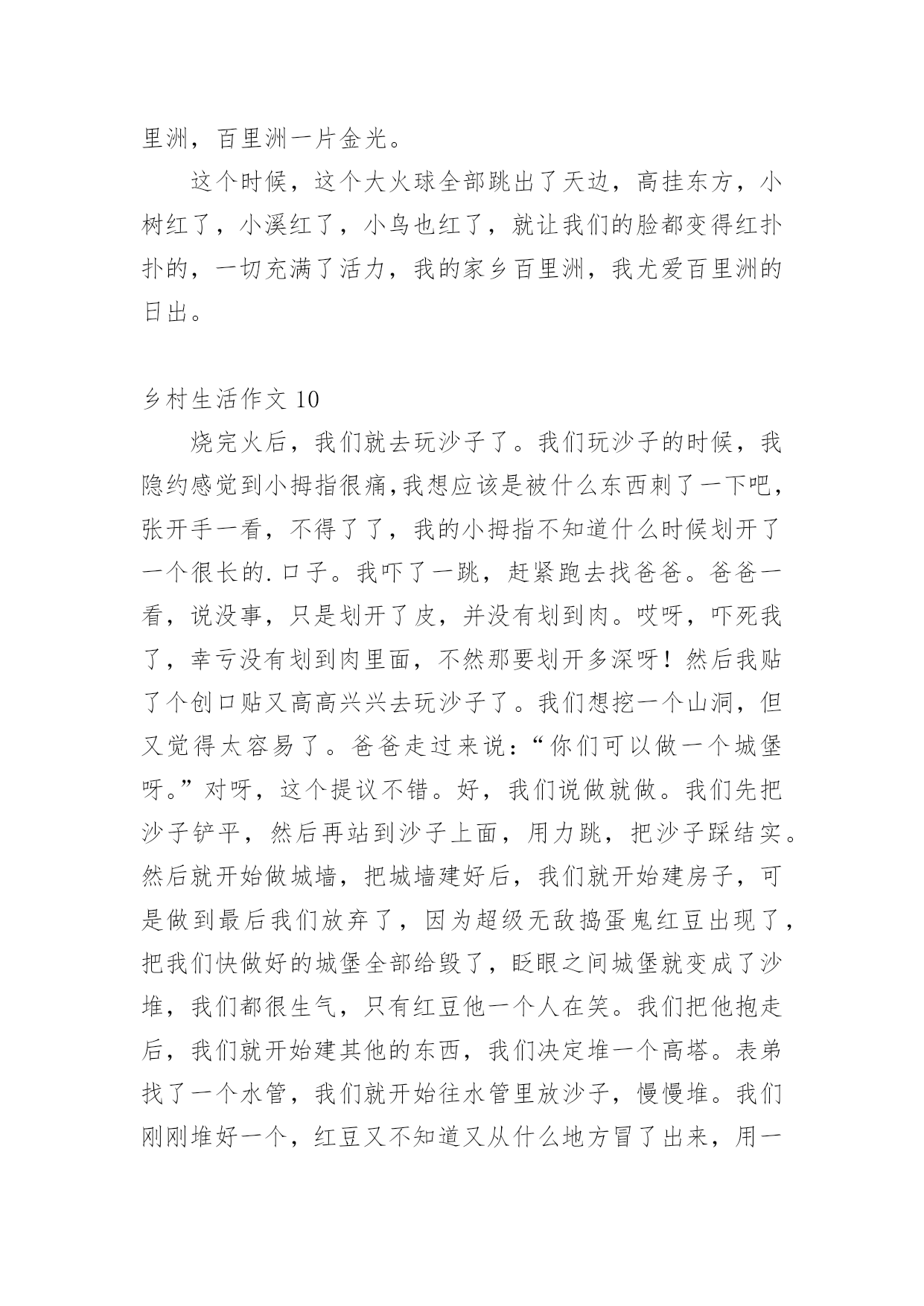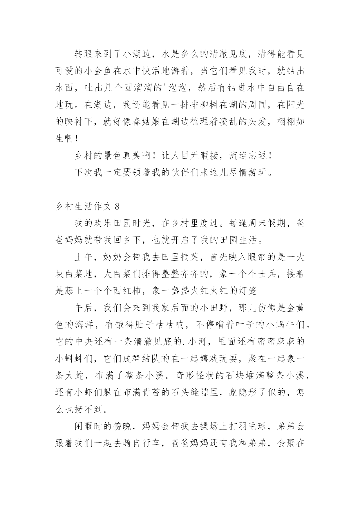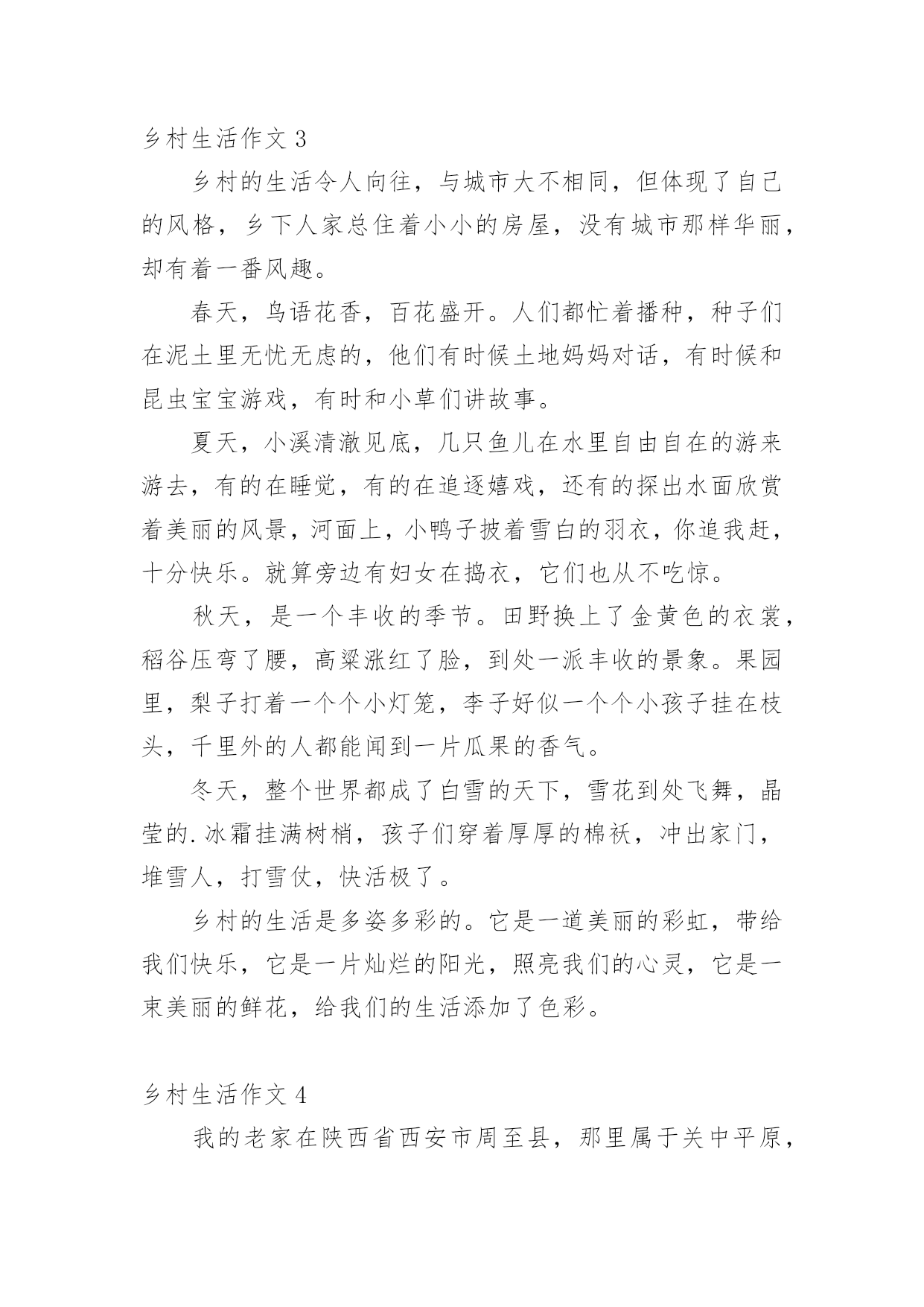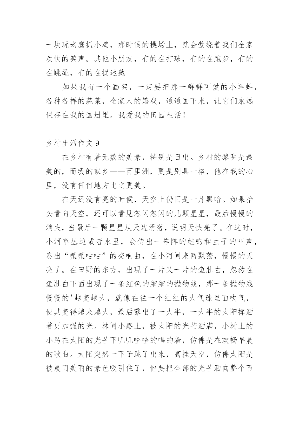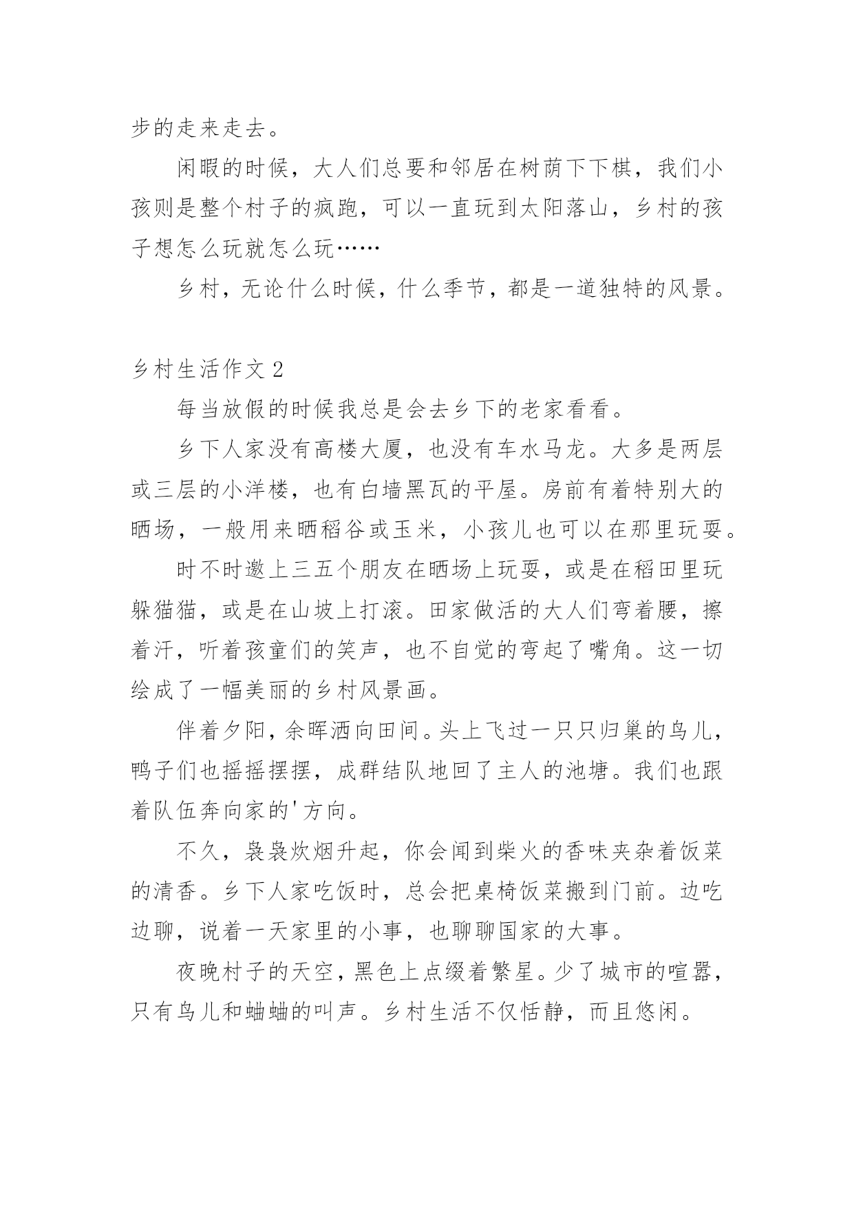 乡村生活作文在日常学习、工作和生活中,大家总免不了要接触或使用作文吧,作文根据写作时限的不同可以分为限时作文和非限时作文。你写作文时总是无从下笔?以下是小编为大家收集的乡村生活作文,欢迎阅读与收藏。乡村生活作文1乡村,虽然住着小小的平房,但是,它的水是清的,天空格外的蓝,树是绿的,我的家就在乡村。我的家住在整个屯子最边上的`一家。我家门口是一条河,河对面就是城里。每到河水涨高的时候,家人或邻居就到竹林里去,砍下几只竹,把竹竿固定在一起,做成竹桥。家门口的路是泥土路,下了雨后,路更是难走,而且会把泥带回到屋子里,弄得很是脏,后来,生活条件好了,政府帮着修了路,现在,每条路都是和城里的柏油马路一样,不管下了多大的雨,人们也不再担心脚下的泥水,大家经常说的一句话:“政府好啊,现在的农村也算是个”城外城“了,过上了城里人希望的”别墅“生活,田园风光自由自在。夏天的时候,河里经常是一群一群鸭子嬉戏的天下,不时的把头扎到水下去觅食。乡村的人家常常要养几只鸡。我家也是如此。一只母鸡领着一群小鸡觅食,大公鸡也会常伴左右,常常抬起灰色的爪子,挥舞着它一身的彩毛,骄傲的向远方眺望。有时大踏步的走来走去。闲暇的时候,大人们总要和邻居在树荫下下棋,我们小孩则是整个村子的疯跑,可以一直玩到太阳落山,乡村的孩子想怎么玩就怎么玩……乡村,无论什么时候,什么季节,都是一道独特的风景。乡村生活作文2每当放假的时候我总是会去乡下的老家看看。乡下人家没有高楼大厦,也没有车水马龙。大多是两层或三层的小洋楼,也有白墙黑瓦的平屋。房前有着特别大的晒场,一般用来晒稻谷或玉米,小孩儿也可以在那里玩耍。时不时邀上三五个朋友在晒场上玩耍,或是在稻田里玩躲猫猫,或是在山坡上打滚。田家做活的大人们弯着腰,擦着汗,听着孩童们的笑声,也不自觉的弯起了嘴角。这一切绘成了一幅美丽的乡村风景画。伴着夕阳,余晖洒向田间。头上飞过一只只归巢的鸟儿,鸭子们也摇摇摆摆,成群结队地回了主人的池塘。我们也跟着队伍奔向家的'方向。不久,袅袅炊烟升起,你会闻到柴火的香味夹杂着饭菜的清香。乡下人家吃饭时,总会把桌椅饭菜搬到门前。边吃边聊,说着一天家里的小事,也聊聊国家的大事。夜晚村子的天空,黑色上点缀着繁星。少了城市的喧嚣,只有鸟儿和蛐蛐的叫声。乡村生活不仅恬静,而且悠闲。乡村生活作文3乡村的生活令人向往,与城市大不相同,但体现了自己的风格,乡下人家总住着小小的房屋,没有城市那样华丽,却有着一番风趣。春天,鸟语花香,百花盛开。人们都忙着播种,种子们在泥土里无忧无虑的,他们有时候土地妈妈对话,有时候和昆虫宝宝游戏,有时和小草们讲故事。夏天,小溪清澈见底,几只鱼儿在水里自由自在的游来游去,有的在睡觉,有的在追逐嬉戏,还有的探出水面欣赏着美丽的风景,河面上,小鸭子披着雪白的羽衣,你追我赶,十分快乐。就算旁边有妇女在捣衣,它们也从不吃惊。秋天,是一个丰收的季节。田野换上了金黄色的衣裳,稻谷压弯了腰,高粱涨红了脸,到处一派丰收的景象。果园里,梨子打着一个个小灯笼,李子好似一个个小孩子挂在枝头,千里外的人都能闻到一片瓜果的香气。冬天,整个世界都成了白雪的天下,雪花到处飞舞,晶莹的.冰霜挂满树梢,孩子们穿着厚厚的棉袄,冲出家门,堆雪人,打雪仗,快活极了。乡村的生活是多姿多彩的。它是一道美丽的彩虹,带给我们快乐,它是一片灿烂的阳光,照亮我们的心灵,它是一束美丽的鲜花,给我们的生活添加了色彩。乡村生活作文4我的老家在陕西省西安市周至县,那里属于关中平原,不仅风景优美,而且人杰地灵,是旅游、度假的好去处。去年暑假,爸爸妈妈带我回老家。当清晨的第一缕阳光透过窗帘的时候,窗外已有小鸟立在枝头愉快地歌唱,它们扑棱着美丽的翅膀,上下跳跃着。拉开窗帘,一股清新的泥土气息扑面而来,乡村新的一天开始了。早饭后,外公带我和表妹去农场玩。在农场里,我们看到了许多农作物。玉米地里,一排排玉米整齐地排列着,多像接受检阅的军队啊!红红的西红柿挂在枝头,像一个个小小的灯笼。茄子、辣椒也不甘示弱,争着向我们展示它的'果实。农场里还种着许多果树,有桃树、核桃树、李子树等;果树旁边种着一大片格桑花:有红的、白的、粉的、紫的,它们争奇斗艳,一阵微风吹过,花儿们随风摆动,真像一片花的海洋啊!在花地旁边有一片鱼塘,鱼塘里的鱼儿们在玩耍嬉戏,可爱极了!乡村的夜晚,宁静中又有欢快。村里的人聚在村头的空地上话家常,我们几个小伙伴在玩过家家,捉萤火虫,斗蛐蛐,累了就躺在草地上数星星。渐渐地,夜色已深,人们散去。夜晚又恢复了宁静。这就是我的乡村生活,在不知不觉中我度过了一个愉快的暑假。乡村生活作文5“竹外桃花三两枝,春江水暖鸭先知。”春天的乡村是生机勃勃的,小草、笋都从土里探出头来,桃树也乐开了花,就连河边的小柳树也抽出了新芽。“接天莲叶无穷碧,映日荷花别样红。”夏天的乡