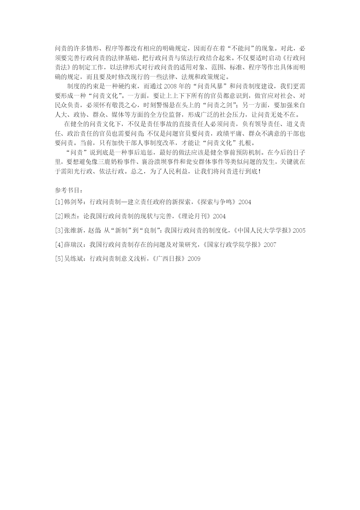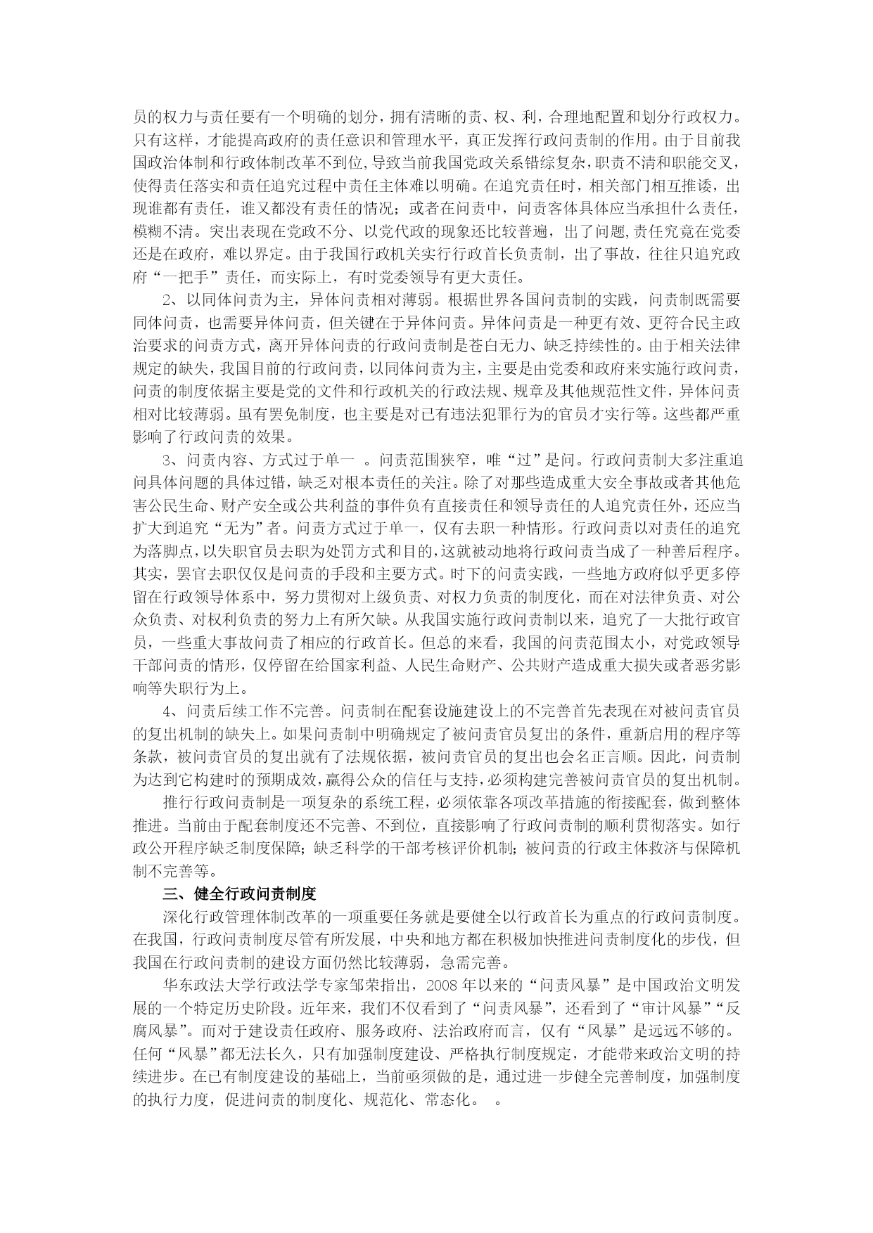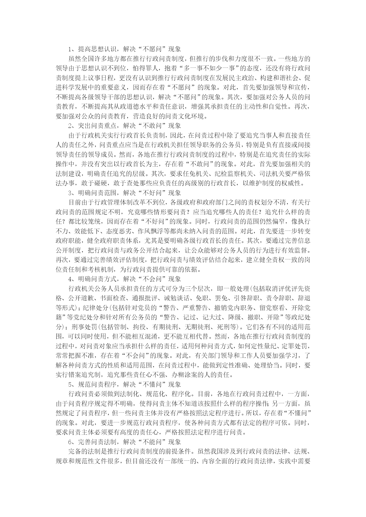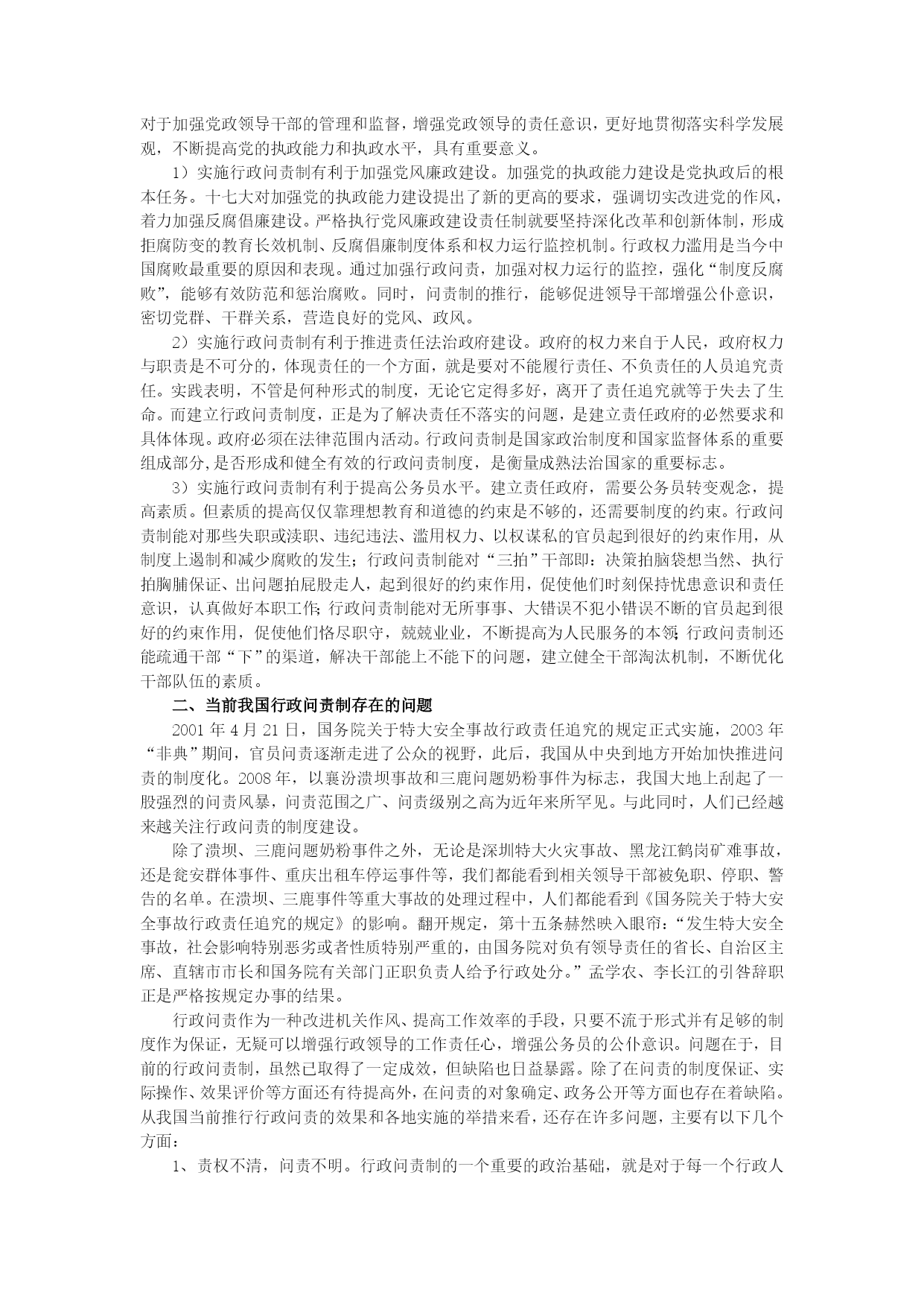 修改意见:1、文章结构有调整,请仔细阅读。2、写出内容摘要、关键词。3、列出文章二级目录,并注明起始页码。邓红梅2011.06.15浅谈我国行政问责制度的完善当前,全面推进行政问责制,是新时期党和国家为进一步落实科学发展,着力构建和谐社会,推进服务型政府、廉洁型政府、人民满意政府建设,努力提高各级政府的履职能力和服务水平的一项重要决策,对于加快政府行政体制改革,推动社会主义民主法制建设,建设和谐社会具有重要意义。一、实施行政问责的意义行政责任是近代国家责任政治的产物,是“主权在民”及“权力分野”原则的必然要求。在政府管理中,行政与责任从来都是一对孪生兄弟,有权力,必有责任;有权力,必有制约。1、行政问责制概念界定行政问责制是在行政责任基础之上提出的一个新的概念。问责制是指问责主体对其管辖范围内各级组织和成员承担职责和义务的履行情况,实施并要求其承担否定性后果的一种责任追究制度。问责机制说到底是一个谁来问责的问题,是一个向谁负责的问题。权力是人民赋予的,当然是要对人民负责。所以问责机制的内驱力就要落实在群众的监督权上。行政问责制概念的引入,主要源于两个方面的因素,一是香港特区政府2002年7月的“主要官员问责制”,为我国第一次带来问责这个概念;二是2003年由非典事件引发了社会对“官员问责制”的深切关注,由此带动了行政问责的理论研究和问责实践的探讨。关于行政问责制的概念内涵,有许多不同的释义。在几种概念界定中,问责主体和问责客体各不相同,涉及的角度也各异。笔者认为,行政问责制是指特定的问责主体针对行政机关及工作人员等问责客体在行政管理过程中由于没有或没有正确履行法定的职责,影响了行政运行的效率和行政机关的口碑、信度或效度,甚至部分损害了行政管理相对人的合法权益,对其追究责任的一种制度。行政问责制是评估行政管理活动效能的一种原则或者说是一种检验行政活动运行效率的一种程序。党的十七大报告指出:“要抓紧制定行政管理体制总体方案,着力转变职能、理顺关系、优化结构、提高效能,形成责权一致、分工合理、决策科学、执行顺畅、监督有力的行政管理体制。健全政府职责体系,完善公共服务体系,推行电子政务,强化社会管理和公共服务。”根据党的十七大报告的精神,深化行政改革的目标是,建设服务型政府、责任政府、效能政府、法治政府。建设责任政府,最重要的是要建立以行政首长为重点的行政问责制度。政府的权力是人民赋予的,必须对人民负责,接受人民监督。问责制要求建立严密的责任追究体制,既要落实行政首长负责制以明确其领导责任,又要各司其职,各负其责;要完善决策失误责任追究、行政执法过错责任追究、监督失察责任追究等制度,切实做到行政权力与责任紧密挂钩、与利益脱钩。2、实施行政问责的意义在我国,推行行政问责制是坚持科学执政、民主执政、依法执政的一个有效制度安排,对于加强党政领导干部的管理和监督,增强党政领导的责任意识,更好地贯彻落实科学发展观,不断提高党的执政能力和执政水平,具有重要意义。1)实施行政问责制有利于加强党风廉政建设。加强党的执政能力建设是党执政后的根本任务。十七大对加强党的执政能力建设提出了新的更高的要求,强调切实改进党的作风,着力加强反腐倡廉建设。严格执行党风廉政建设责任制就要坚持深化改革和创新体制,形成拒腐防变的教育长效机制、反腐倡廉制度体系和权力运行监控机制。行政权力滥用是当今中国腐败最重要的原因和表现。通过加强行政问责,加强对权力运行的监控,强化“制度反腐败”,能够有效防范和惩治腐败。同时,问责制的推行,能够促进领导干部增强公仆意识,密切党群、干群关系,营造良好的党风、政风。2)实施行政问责制有利于推进责任法治政府建设。政府的权力来自于人民,政府权力与职责是不可分的,体现责任的一个方面,就是要对不能履行责任、不负责任的人员追究责任。实践表明,不管是何种形式的制度,无论它定得多好,离开了责任追究就等于失去了生命。而建立行政问责制度,正是为了解决责任不落实的问题,是建立责任政府的必然要求和具体体现。政府必须在法律范围内活动。行政问责制是国家政治制度和国家监督体系的重要组成部分,是否形成和健全有效的行政问责制度,是衡量成熟法治国家的重要标志。3)实施行政问责制有利于提高公务员水平。建立责任政府,需要公务员转变观念,提高素质。但素质的提高仅仅靠理想教育和道德的约束是不够的,还需要制度的约束。行政问责制能对那些失职或渎职、违纪违法、滥用权力、以权谋私的官员起到很好的约束作用,从制度上遏制和减少腐败的发生;行政问责制能对“三拍”干部即:决策拍脑袋想当然、执行拍胸脯保证、出问题拍屁股走人,起到很好的约束作用,促使他们时刻保持忧患意识和责任意识,认真做好本职工作;行政问责制能对无所事事、大错误不犯小错误不断的官员起到很好的