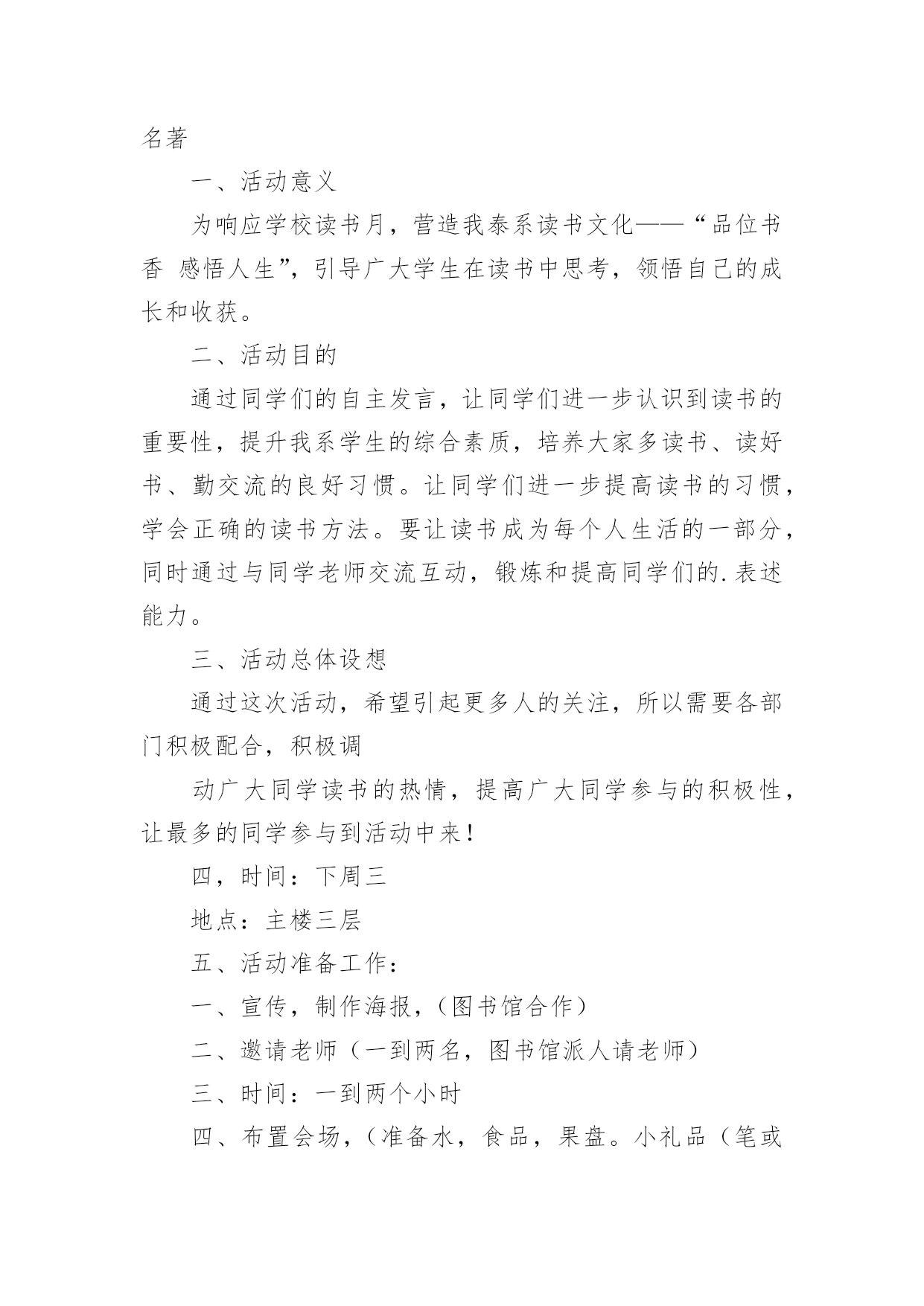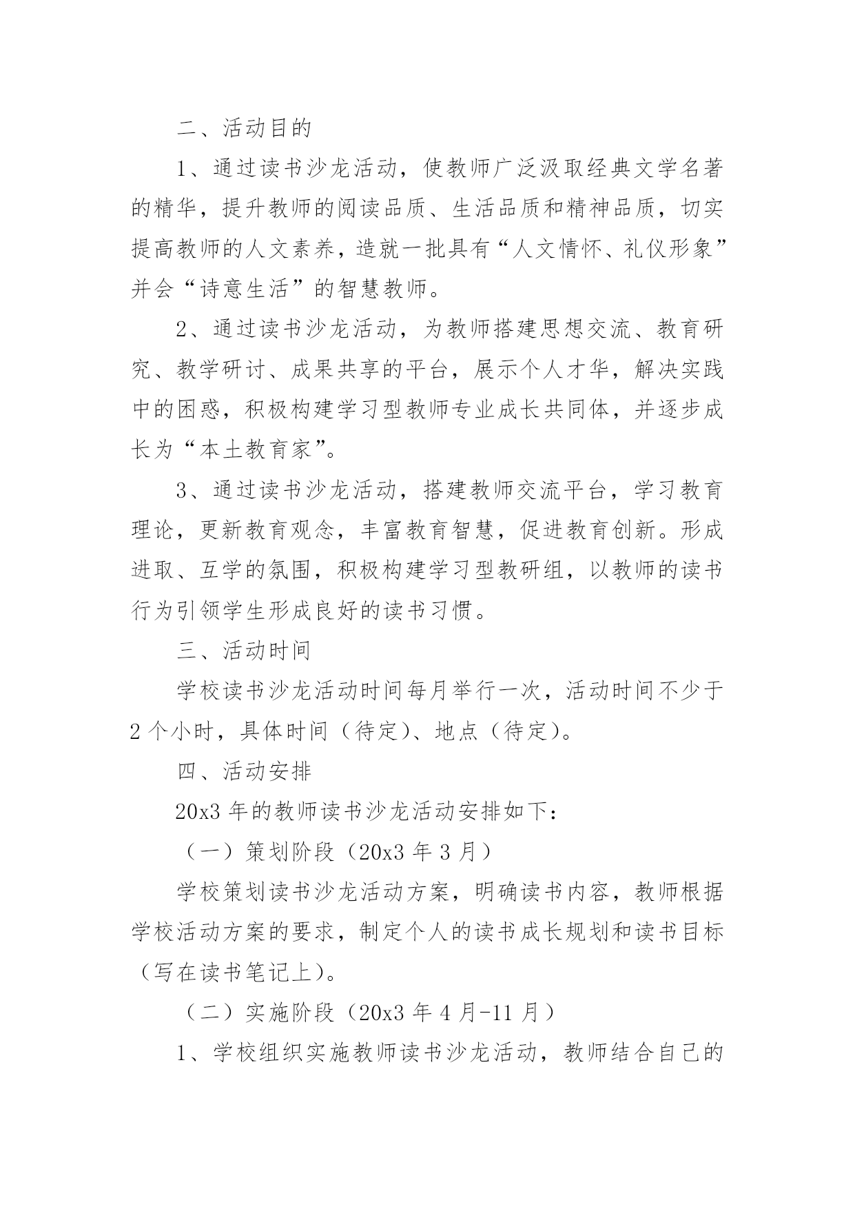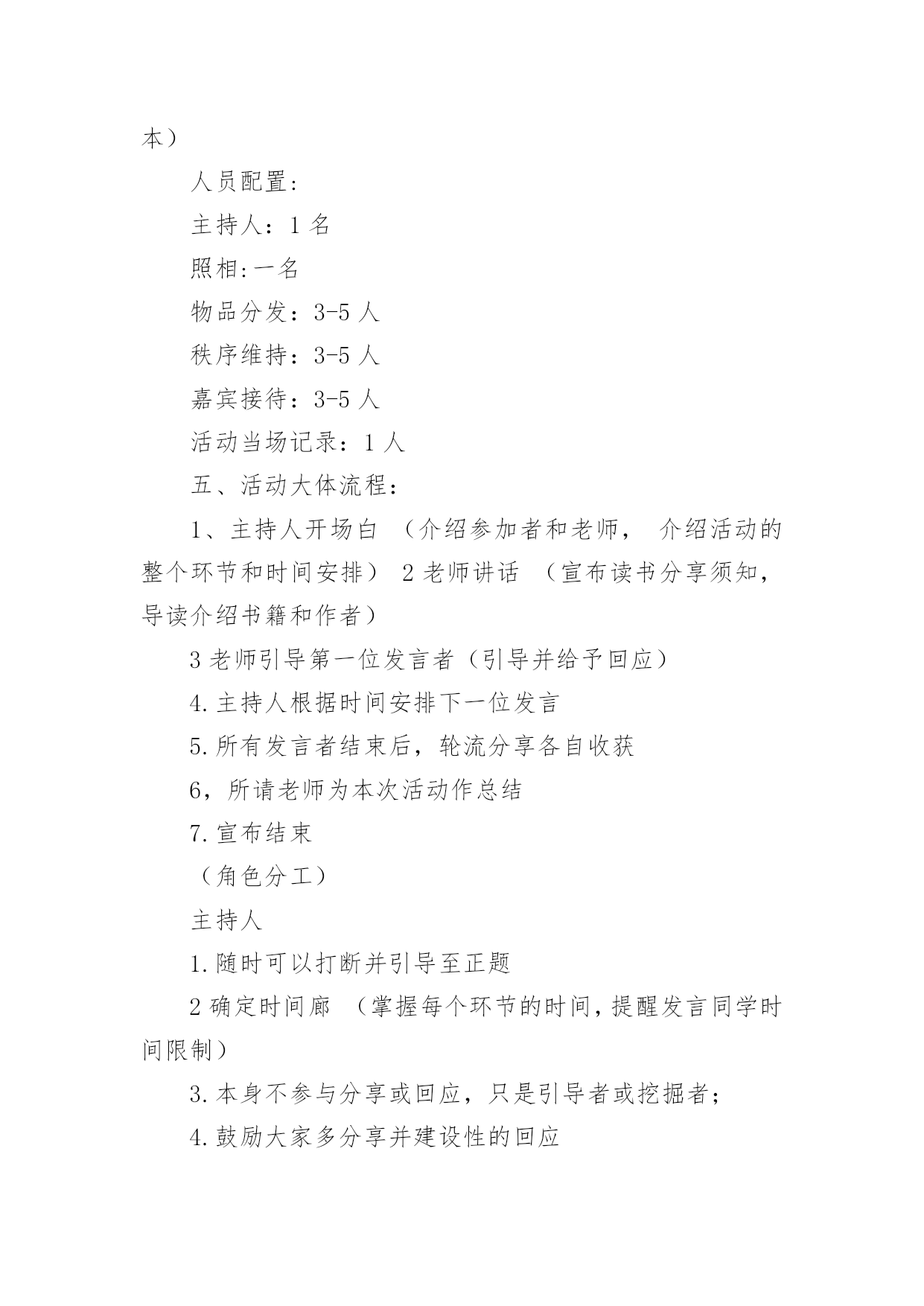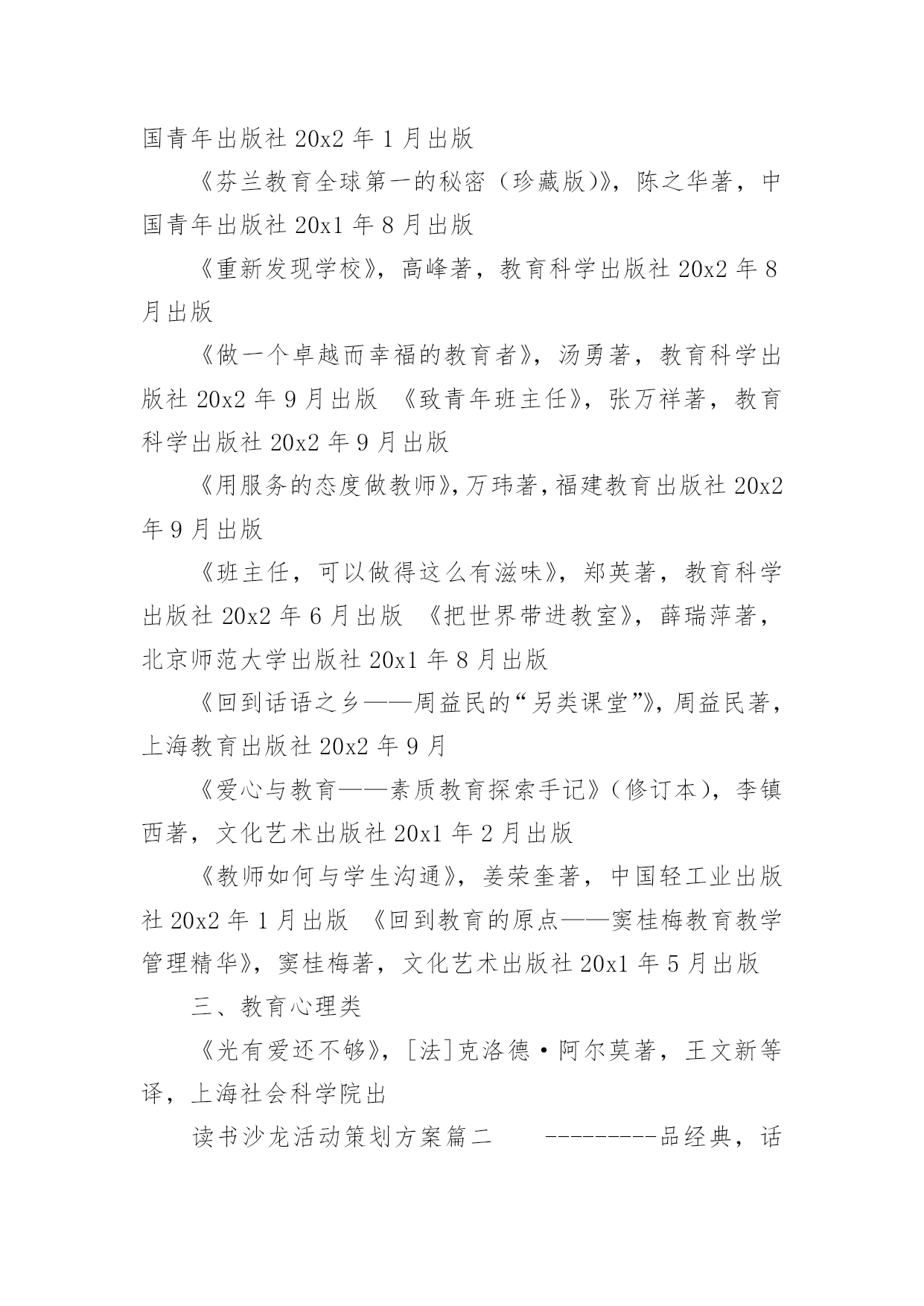 读书沙龙活动策划方案读书沙龙活动策划方案读书沙龙活动策划方案篇一一、指导思想在感动教育框架下,以感动教育为教育信仰,以创建“书香型学校”为导向,以丰富“校园文化生活”为契机,贯彻落实新课程要求,以读书活动为载体,努力营造书香校园,书香教研组,塑造内涵丰富、特色鲜明的校园文化。读书是教师专业成长的有效途径。教师精神成长,需要高品位阅读的滋养;教师专业发展,需要经典教育专著的引领;教师职业特征,需要博学和睿智。读书能增进教师日常工作需要的理性状态,能够促进教育智慧的形成,是教师摆脱职业倦怠最有效的方法之一。教师作为传播文化知识、教育学生、熏陶他人的精神工作者,在读书方面理应走在前列,把学习、充电作为自身需求,且读且思,且思且行,汲取他人的经验,提高并不断完善自我,成就自我。读书是教师淡泊心境、远离浮躁的必然选择。读书可以使人们富有思想,成为一个精神贵族。教书育人是一份淡定自若的职业,教师比其他任何一种职业更需要内心的沉静和淡泊,潜心读书无疑是智慧的选择。为激励教师热爱读书,终身学习,不断促进教师专业发展,努力造就一支师德高尚,业务精良的高素质教师队伍,根据省市文件的.精神要求,结合我校实际,决定在全校开展教师读书沙龙活动。二、活动目的1、通过读书沙龙活动,使教师广泛汲取经典文学名著的精华,提升教师的阅读品质、生活品质和精神品质,切实提高教师的人文素养,造就一批具有“人文情怀、礼仪形象”并会“诗意生活”的智慧教师。2、通过读书沙龙活动,为教师搭建思想交流、教育研究、教学研讨、成果共享的平台,展示个人才华,解决实践中的困惑,积极构建学习型教师专业成长共同体,并逐步成长为“本土教育家”。3、通过读书沙龙活动,搭建教师交流平台,学习教育理论,更新教育观念,丰富教育智慧,促进教育创新。形成进取、互学的氛围,积极构建学习型教研组,以教师的读书行为引领学生形成良好的读书习惯。三、活动时间学校读书沙龙活动时间每月举行一次,活动时间不少于2个小时,具体时间(待定)、地点(待定)。四、活动安排20x3年的教师读书沙龙活动安排如下:(一)策划阶段(20x3年3月)学校策划读书沙龙活动方案,明确读书内容,教师根据学校活动方案的要求,制定个人的读书成长规划和读书目标(写在读书笔记上)。(二)实施阶段(20x3年4月-11月)1、学校组织实施教师读书沙龙活动,教师结合自己的兴趣开通个性化的教育博客。每学期每位教师要至少阅读2部教育名著,在读书过程中要积极做好读书笔记,撰写教学反思不少于5篇,学校定期举办读书笔记展示和教学反思评选活动。年青教师要积极争当每次读书沙龙活动的主持人,精心策划,认真准备,营造浓厚读书氛围,起到“活动一次,提高一次”的效果。2、活动中落实“四个结合”,促进教师的专业成长。一是读书沙龙活动要与课堂探究相结合,积极开展教学研究,探索新课程下的课堂教学问题,提高课堂教学质量;二是要与教学反思相结合,探讨教学中出现的热点、难点问题,实现教师思想交流、观点碰撞,历练师德修养;三是要与案例分析相结合,积极开展教育研究,研讨学校德育、班级管理、学生教育等方面存在的共性、个性问题及解决方案;五是要与名家讲坛相结合,邀请专家或我市名师进行讲座,开阔青年教师教育教学、科研方面的视野。(三)总结阶段(20x3年12月)学校对读书活动的开展情况进行及时总结,提炼活动亮点,认真收集完善读书活动中的各种档案资料。学校将对本次读书活动进行总结表彰。五、活动配档表3月,学校成立读书沙龙活动领导小组,策划读书沙龙活动方案,明确读书内容(每次读书,以学科组为单位,共读一本书;每次活动结束,以级部为单位,统计学科组阅读篇目,报师训处备案)。教师根据学校活动方案的要求,制定个人的读书成长规划和读书目标(写在读书笔记上)。4月,学校创建读书沙龙活动网站,教师开通教育博客。5月,读书笔记、教学反思评选(由教学处牵头,检查、评选)、展示。6月,优秀教育博客评选(由教学处牵头,检查、评选)、展示。7月,阶段性表彰、总结。8月,学校邀请专家进行讲座。9月,由各级部语文组组织“名著品读大讲堂”或名家名著视频展播。10月,组织学生读书沙龙活动。11月,教师交流、总结。12月,学校评优、表彰、总结。六、活动形式1、共读式。在活动初期,学校推荐部分经典书目,引导教师共读共写,引领教师不断成长。2、研讨式。确定研讨主题,围绕主题充分探讨,畅所欲言。参加者既是提问者,也是问题的解答者。3、论坛式。确定论坛主题,围绕主题充分发表意见,加深对某一问题的认识。4、观摩式。观摩教育活动、课堂教学、课题研究并组织观摩后的研讨活动。5、汇报式。选择某一方面较优秀的教师向全体教师做经验汇报,并展开研讨活动。6、报告式。聘请市内外具有丰富教学经验的教师、骨干教师、学科带头人等作主题报告,学员和专家之间围绕主