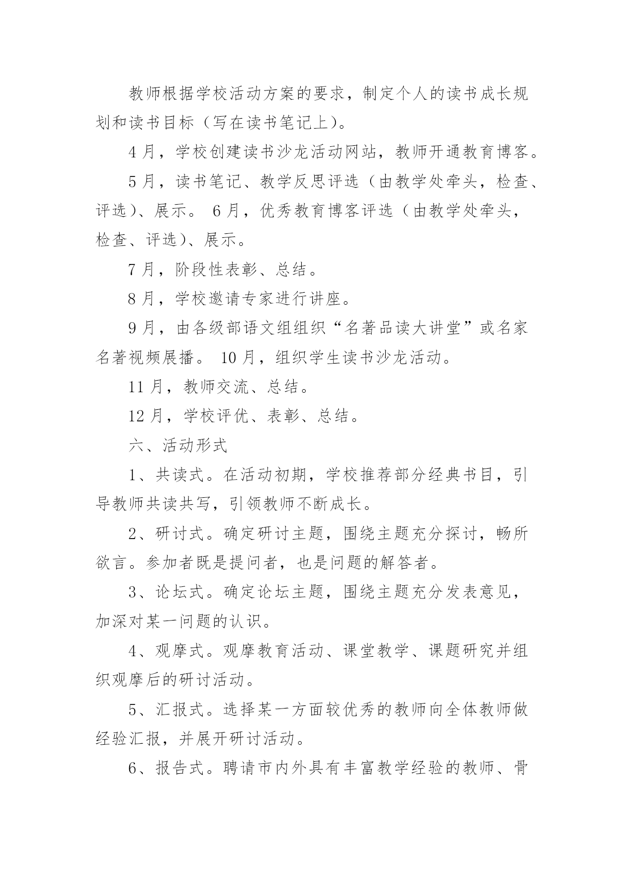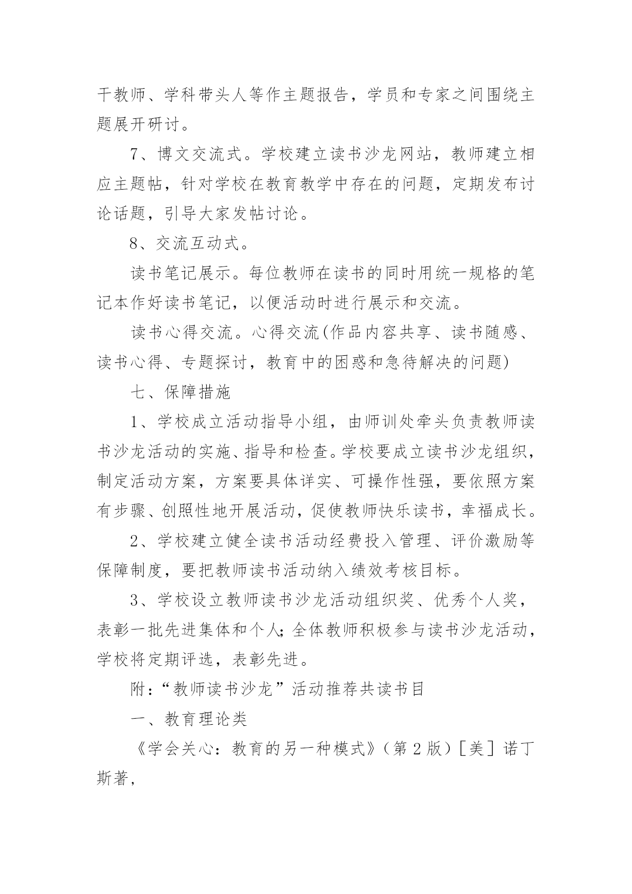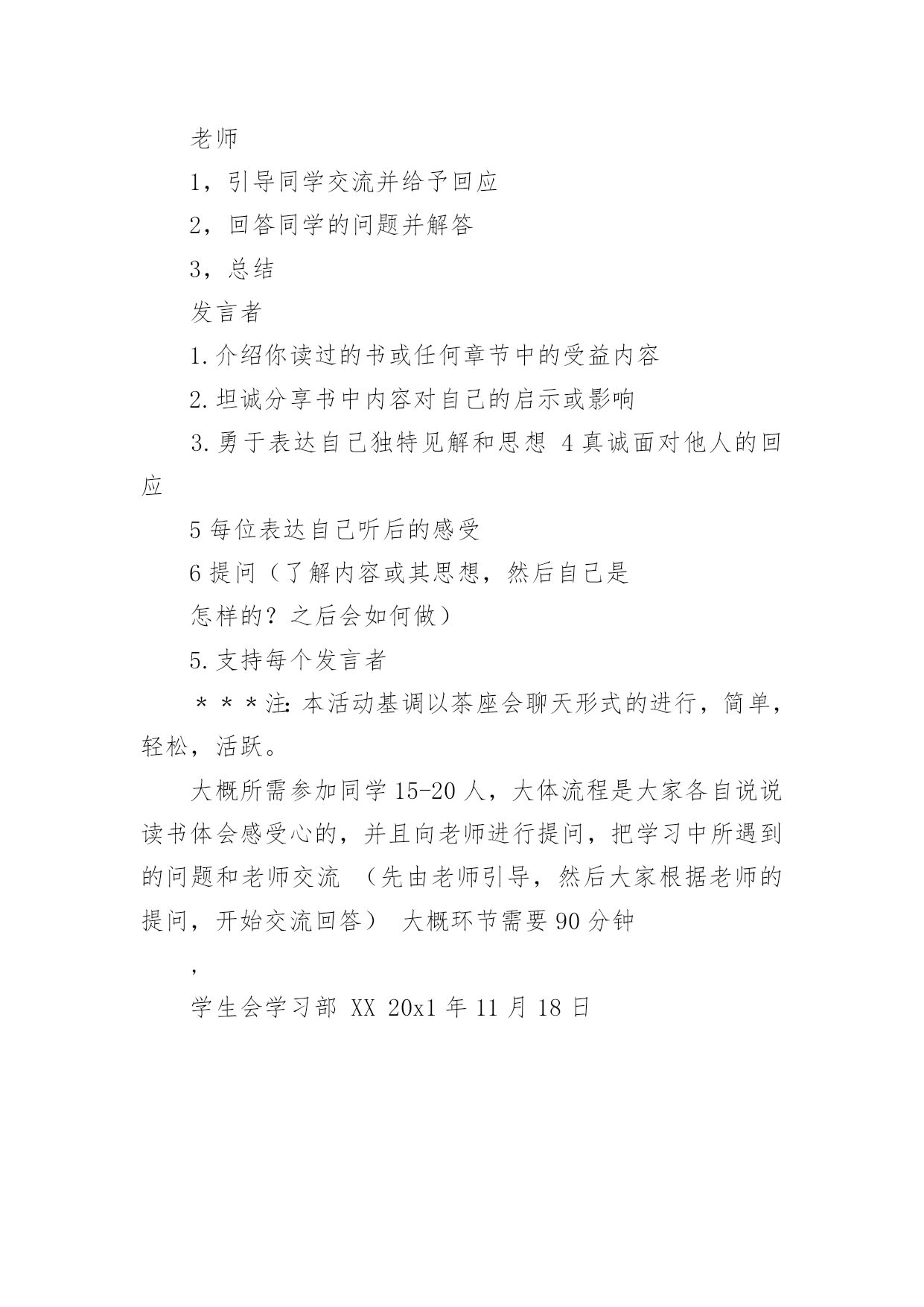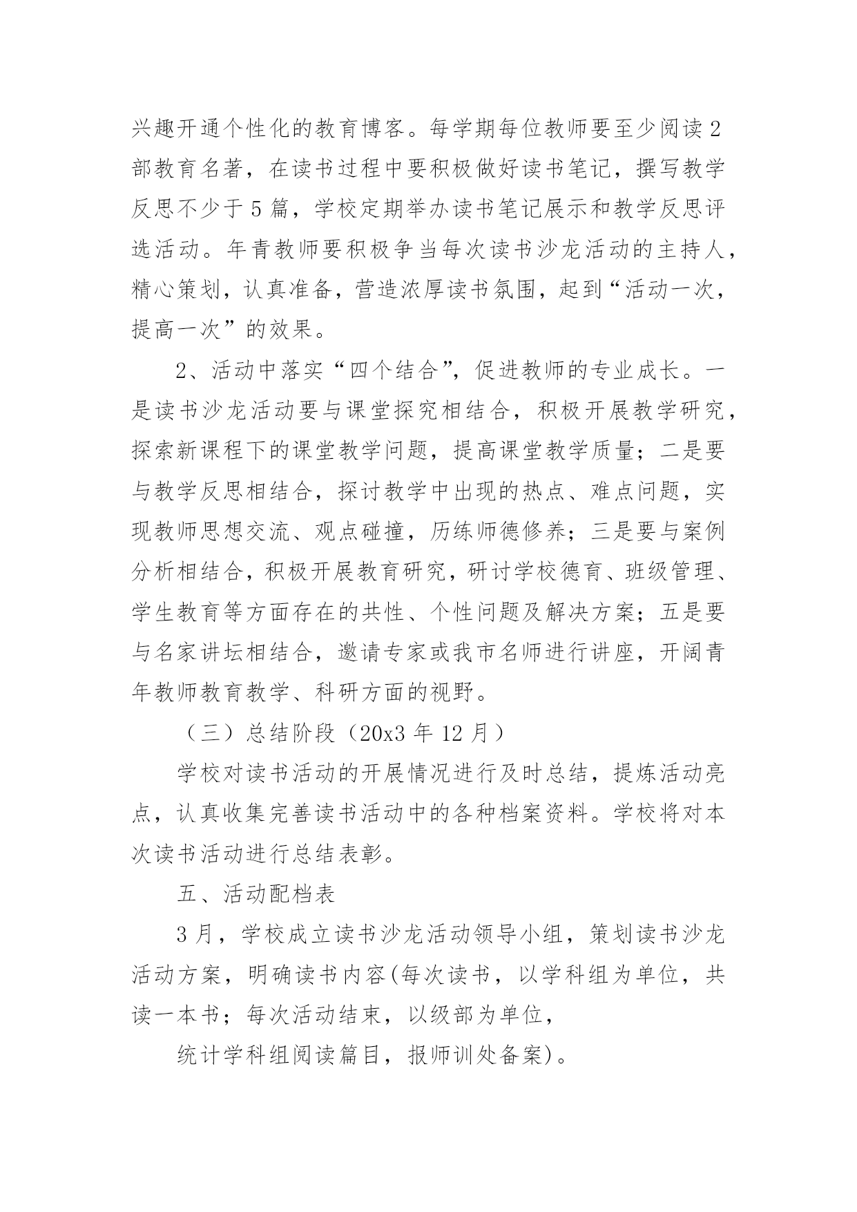 读书沙龙活动策划方案读书沙龙活动策划方案读书沙龙活动策划方案篇一一、指导思想在感动教育框架下,以感动教育为教育信仰,以创建“书香型学校”为导向,以丰富“校园文化生活”为契机,贯彻落实新课程要求,以读书活动为载体,努力营造书香校园,书香教研组,塑造内涵丰富、特色鲜明的校园文化。读书是教师专业成长的有效途径。教师精神成长,需要高品位阅读的滋养;教师专业发展,需要经典教育专著的引领;教师职业特征,需要博学和睿智。读书能增进教师日常工作需要的理性状态,能够促进教育智慧的形成,是教师摆脱职业倦怠最有效的方法之一。教师作为传播文化知识、教育学生、熏陶他人的精神工作者,在读书方面理应走在前列,把学习、充电作为自身需求,且读且思,且思且行,汲取他人的经验,提高并不断完善自我,成就自我。读书是教师淡泊心境、远离浮躁的必然选择。读书可以使人们富有思想,成为一个精神贵族。教书育人是一份淡定自若的职业,教师比其他任何一种职业更需要内心的沉静和淡泊,潜心读书无疑是智慧的选择。为激励教师热爱读书,终身学习,不断促进教师专业发展,努力造就一支师德高尚,业务精良的高素质教师队伍,根据省市文件的.精神要求,结合我校实际,决定在全校开展教师读书沙龙活动。二、活动目的1、通过读书沙龙活动,使教师广泛汲取经典文学名著的精华,提升教师的阅读品质、生活品质和精神品质,切实提高教师的人文素养,造就一批具有“人文情怀、礼仪形象”并会“诗意生活”的智慧教师。2、通过读书沙龙活动,为教师搭建思想交流、教育研究、教学研讨、成果共享的平台,展示个人才华,解决实践中的困惑,积极构建学习型教师专业成长共同体,并逐步成长为“本土教育家”。3、通过读书沙龙活动,搭建教师交流平台,学习教育理论,更新教育观念,丰富教育智慧,促进教育创新。形成进取、互学的氛围,积极构建学习型教研组,以教师的读书行为引领学生形成良好的读书习惯。三、活动时间学校读书沙龙活动时间每月举行一次,活动时间不少于2个小时,具体时间(待定)、地点(待定)。四、活动安排20x3年的教师读书沙龙活动安排如下:(一)策划阶段(20x3年3月)学校策划读书沙龙活动方案,明确读书内容,教师根据学校活动方案的要求,制定个人的读书成长规划和读书目标(写在读书笔记上)。(二)实施阶段(20x3年4月-11月)1、学校组织实施教师读书沙龙活动,教师结合自己的兴趣开通个性化的教育博客。每学期每位教师要至少阅读2部教育名著,在读书过程中要积极做好读书笔记,撰写教学反思不少于5篇,学校定期举办读书笔记展示和教学反思评选活动。年青教师要积极争当每次读书沙龙活动的主持人,精心策划,认真准备,营造浓厚读书氛围,起到“活动一次,提高一次”的效果。2、活动中落实“四个结合”,促进教师的专业成长。一是读书沙龙活动要与课堂探究相结合,积极开展教学研究,探索新课程下的课堂教学问题,提高课堂教学质量;二是要与教学反思相结合,探讨教学中出现的热点、难点问题,实现教师思想交流、观点碰撞,历练师德修养;三是要与案例分析相结合,积极开展教育研究,研讨学校德育、班级管理、学生教育等方面存在的共性、个性问题及解决方案;五是要与名家讲坛相结合,邀请专家或我市名师进行讲座,开阔青年教师教育教学、科研方面的视野。(三)总结阶段(20x3年12月)学校对读书活动的开展情况进行及时总结,提炼活动亮点,认真收集完善读书活动中的各种档案资料。学校将对本次读书活动进行总结表彰。五、活动配档表3月,学校成立读书沙龙活动领导小组,策划读书沙龙活动方案,明确读书内容(每次读书,以学科组为单位,共读一本书;每次活动结束,以级部为单位,统计学科组阅读篇目,报师训处备案)。教师根据学校活动方案的要求,制定个人的读书成长规划和读书目标(写在读书笔记上)。4月,学校创建读书沙龙活动网站,教师开通教育博客。5月,读书笔记、教学反思评选(由教学处牵头,检查、评选)、展示。6月,优秀教育博客评选(由教学处牵头,检查、评选)、展示。7月,阶段性表彰、总结。8月,学校邀请专家进行讲座。9月,由各级部语文组组织“名著品读大讲堂”或名家名著视频展播。10月,组织学生读书沙龙活动。11月,教师交流、总结。12月,学校评优、表彰、总结。六、活动形式1、共读式。在活动初期,学校推荐部分经典书目,引导教师共读共写,引领教师不断成长。2、研讨式。确定研讨主题,围绕主题充分探讨,畅所欲言。参加者既是提问者,也是问题的解答者。3、论坛式。确定论坛主题,围绕主题充分发表意见,加深对某一问题的认识。4、观摩式。观摩教育活动、课堂教学、课题研究并组织观摩后的研讨活动。5、汇报式。选择某一方面较优秀的教师向全体教师做经验汇报,并展开研讨活动。6、报告式。聘请市内外具有丰富教学经验的教师、骨干教师、学科带头人等作主题报告,学员和专家之间围绕主