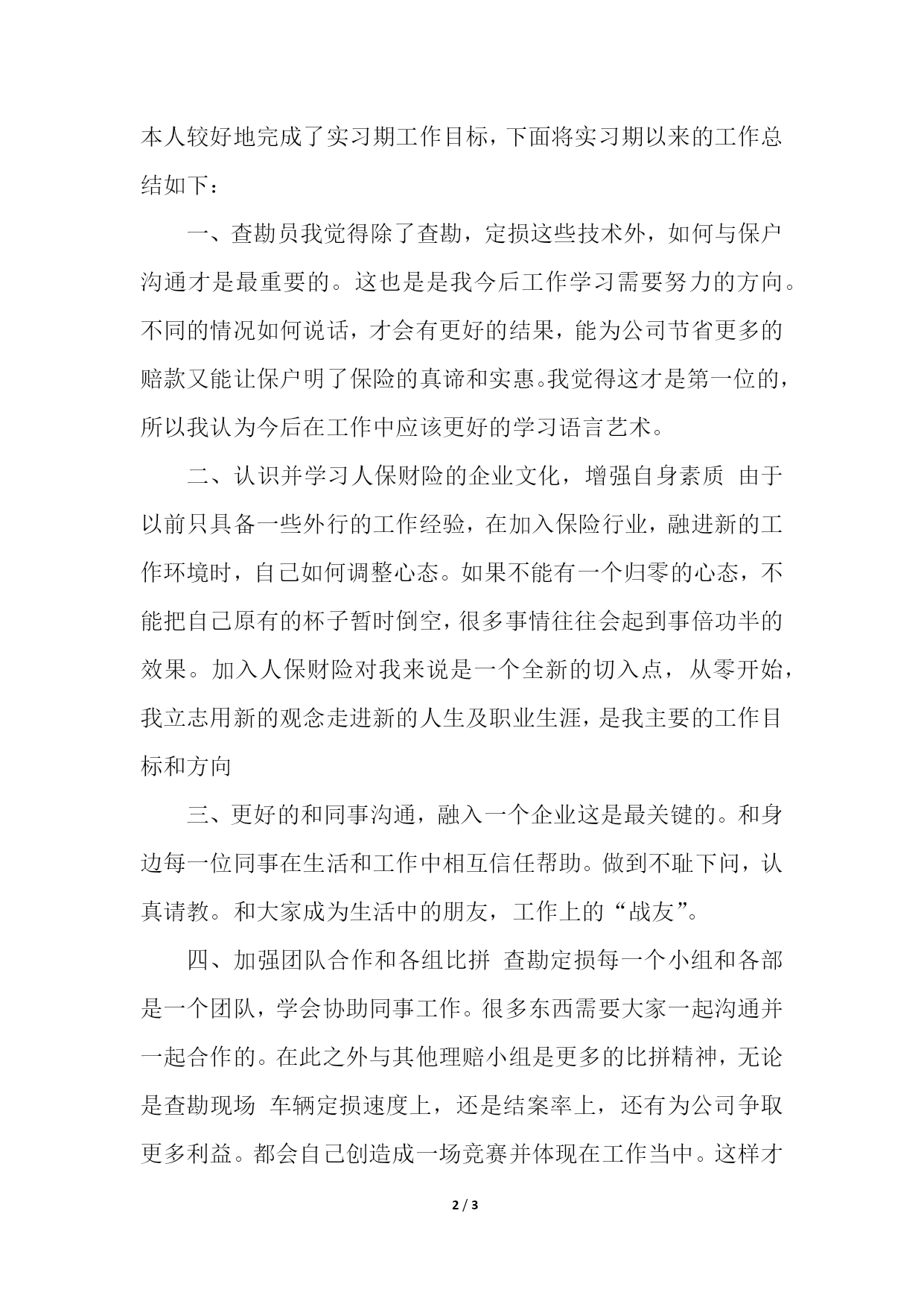 PAGE3/NUMPAGES3保险工作总结保险工作总结1本人自XX年3月2日参加工作至今,两个月实习时间已结束。回溯两个月的实习过程,在分公司领导和同事们的悉心关怀和指导下,通过自身的努力,在各方面都取得了长足的进步。两个月弹指一挥间就毫无声息的流逝,就在此时需要回头总结之际才猛然间意识到日子的匆匆。“千里之行,始于足下”,这两个月短暂又充实的实习使我真正体会到一个保险工作者辛苦,乐趣和责任。由于自己来的较晚和其他新来的同事,还有小小的差距。我一定会加快脚步跟上来,并超过他们。我把实习期分为了三个阶段:熟悉环境、熟悉工作、习惯工作环境和压力及掌握业务知识。在每个阶段中使我我收获良多。第一个阶段:刚到分公司的前几天非常难熬:不认识人、不熟悉工作、工作节奏快、经常加班。使我学会承受工作高压下如何缓解自己,如何和同事交流学习。第二个阶段:了解自己的工作性质职能,学习业务新系统,如何做,怎样做。第三个阶段:真正的把自己融入进工作之中,能够独立查勘定损使用系统与保户交流。由一个车险查勘定损的门外汉,变成了能够独立工作查勘员。本人较好地完成了实习期工作目标,下面将实习期以来的工作总结如下:一、查勘员我觉得除了查勘,定损这些技术外,如何与保户沟通才是最重要的。这也是是我今后工作学习需要努力的方向。不同的情况如何说话,才会有更好的结果,能为公司节省更多的赔款又能让保户明了保险的真谛和实惠。我觉得这才是第一位的,所以我认为今后在工作中应该更好的学习语言艺术。二、认识并学习人保财险的企业文化,增强自身素质由于以前只具备一些外行的工作经验,在加入保险行业,融进新的工作环境时,自己如何调整心态。如果不能有一个归零的心态,不能把自己原有的杯子暂时倒空,很多事情往往会起到事倍功半的效果。加入人保财险对我来说是一个全新的切入点,从零开始,我立志用新的观念走进新的人生及职业生涯,是我主要的工作目标和方向三、更好的和同事沟通,融入一个企业这是最关键的。和身边每一位同事在生活和工作中相互信任帮助。做到不耻下问,认真请教。和大家成为生活中的朋友,工作上的“战友”。四、加强团队合作和各组比拼查勘定损每一个小组和各部是一个团队,学会协助同事工作。很多东西需要大家一起沟通并一起合作的。在此之外与其他理赔小组是更多的比拼精神,无论是查勘现场车辆定损速度上,还是结案率上,还有为公司争取更多利益。都会自己创造成一场竞赛并体现在工作当中。这样才能使工作干的更加起劲。年轻人需要的可以拼搏的环境,公司给了我这么一个大的环境,自己去营造出其中的活力氛围。五、学习更多的保险知识和业务,近俩个月时间主要学习的是查勘定损,在今后工作学习中,多和老同志学习,弥补个人的不足,会依然保持学无止境的精神,学习其他岗位的业务知识。以做保险业务尖子为目标。六、在工作当中,也发现自己的不足,对于承德市区的地形不是很熟悉,对查勘造成很大的不便。刚接触定损,很多配件价格不清楚,会多浏览报价网站充实自己这方面的信息,尽快熟悉起来。以上是我在这两个月里短短总结,也希望得到领导和同事们的认可。我会努力解决自己在工作中遇到的难题。把工作做的更好更优秀。保险工作总结2“认真、务实、创新”这是今年给自我定下的岗位