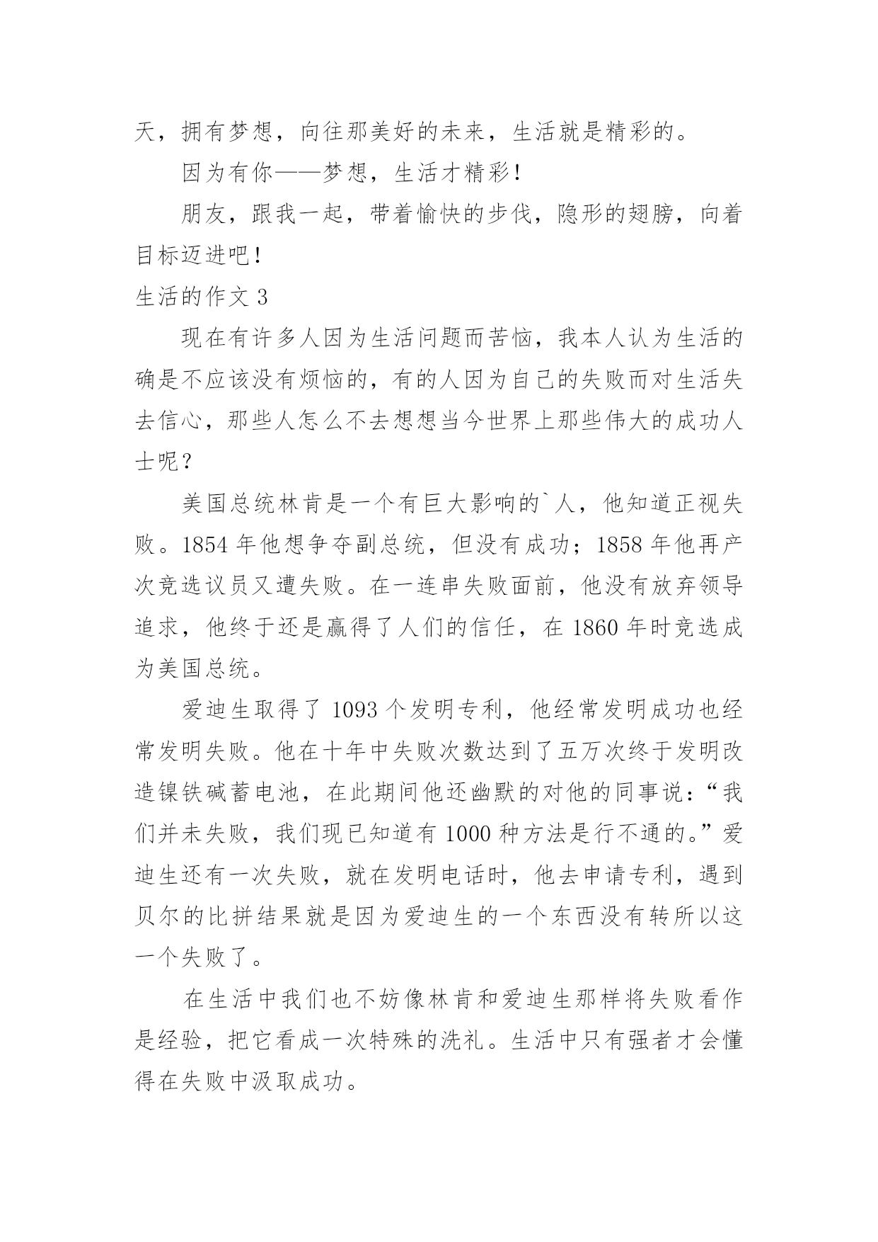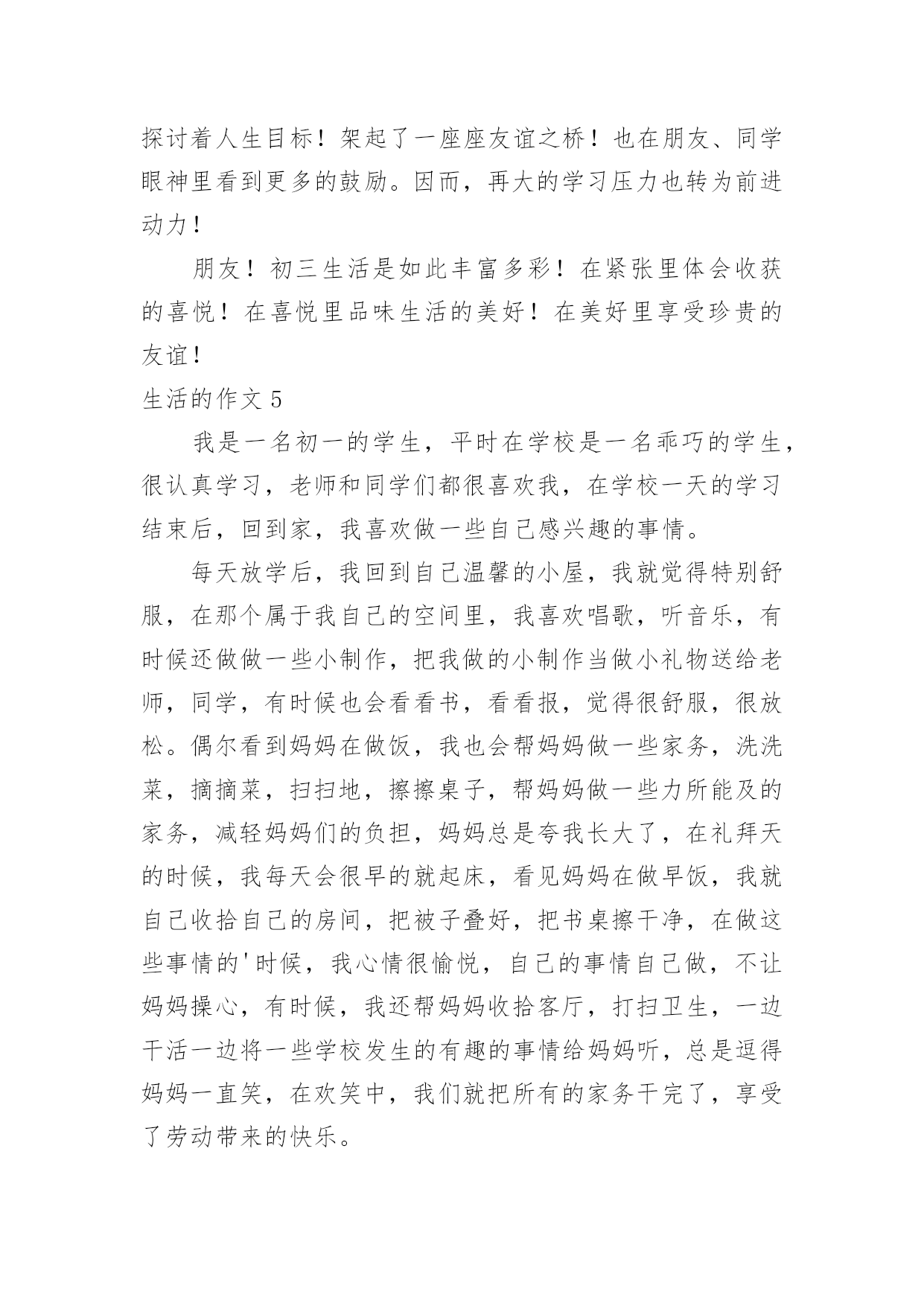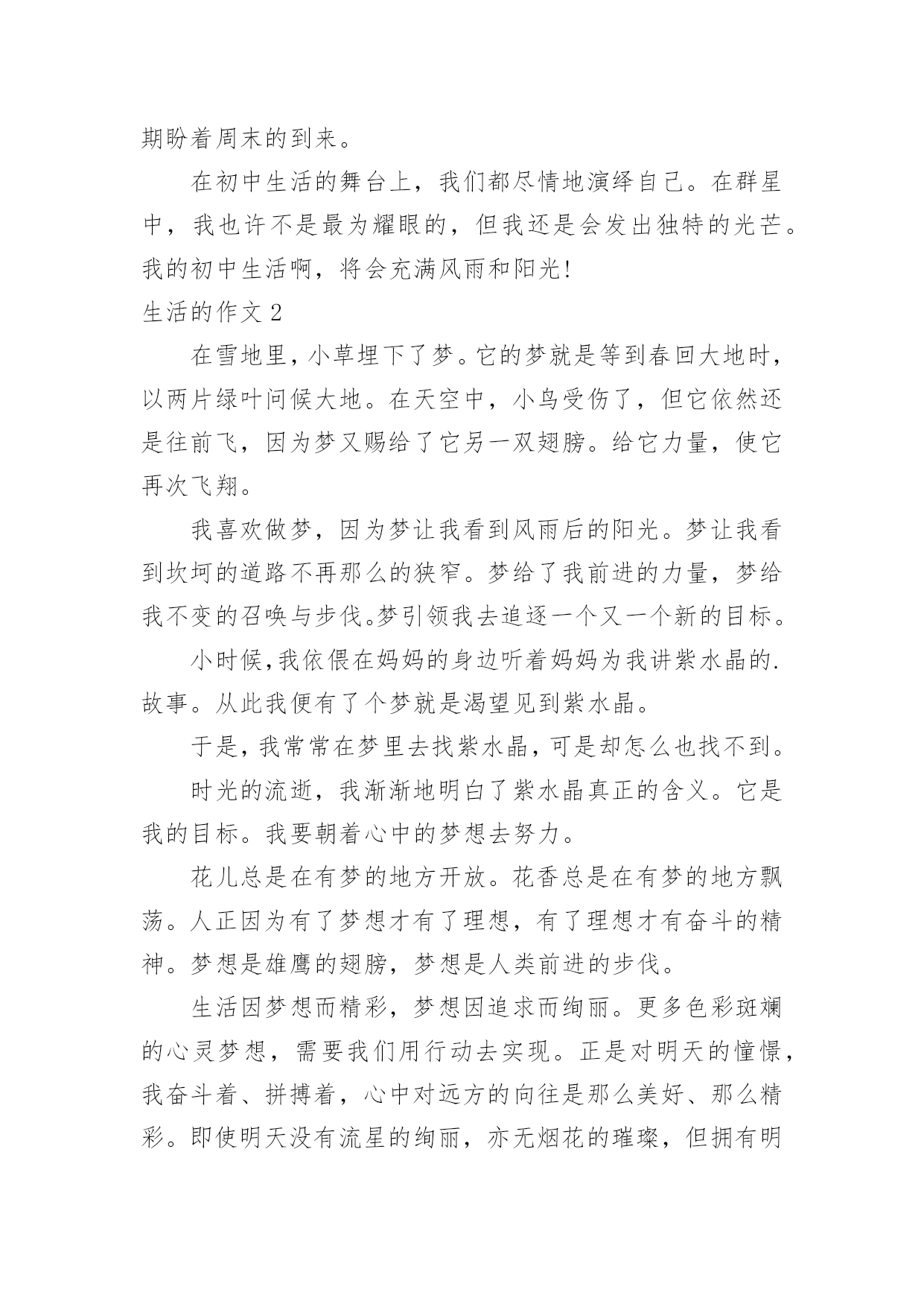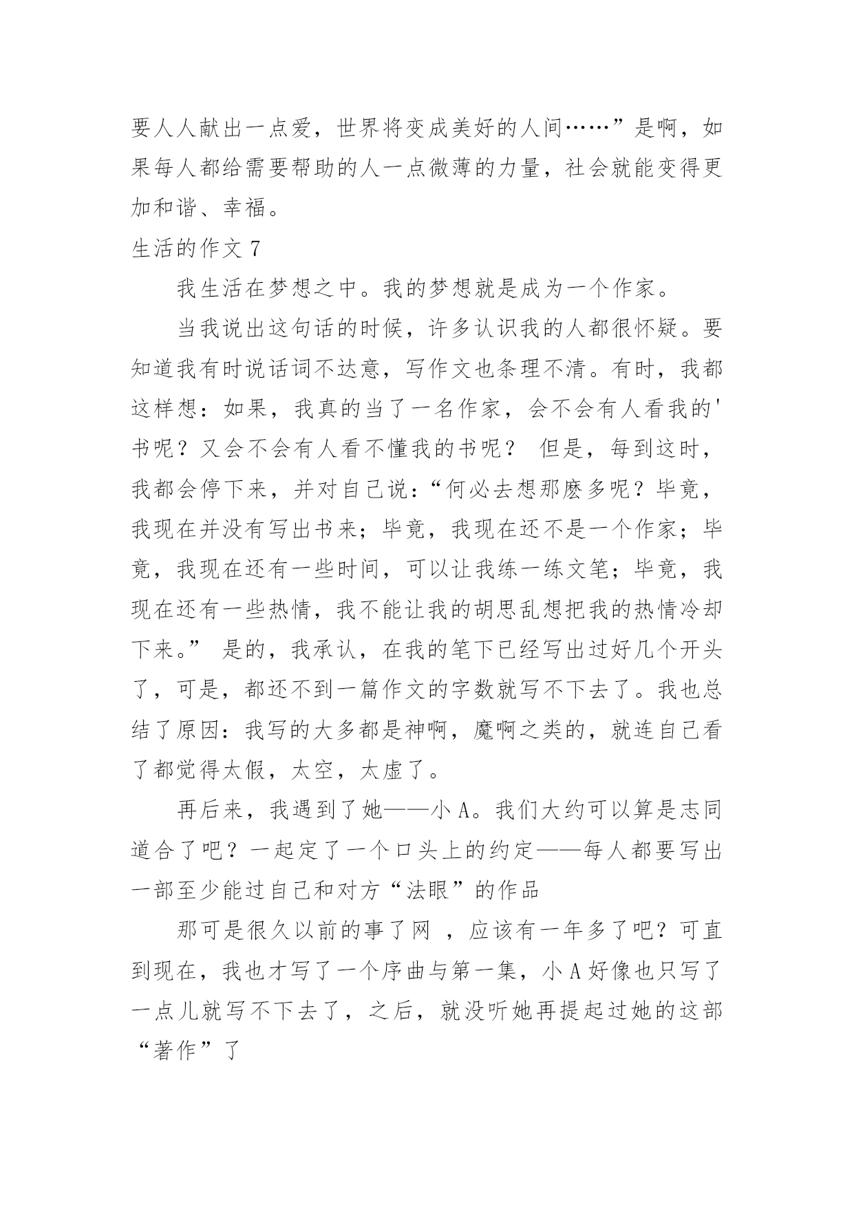 生活的作文(荐)生活的作文在日常学习、工作抑或是生活中,大家最不陌生的就是作文了吧,作文是一种言语活动,具有高度的综合性和创造性。还是对作文一筹莫展吗?下面是小编收集整理的生活的作文,仅供参考,希望能够帮助到大家。生活的作文1告别了小学,进入了初中。初中的生活里,有快乐,有烦恼,有困惑,有伤心。太多太多的情感融合在一起,短短的初中生活变得简单而又复杂,让人烦恼有耐人回味。记得刚刚入学时,怀着的是对未来美好的憧憬和怯懦,一切对我来说都是新鲜的,我的初中生活就这么开始了。说起初中生活的乐趣,那自然就是和同学一起的时光。初一时,最忘不了的是军训,在烈日下一站就是几个小时一动不动。当然,手工制作,象棋,远足等等都是军训的乐趣。初二,和同学们不顾老师的怒吼,每节下课都会兴冲冲的拿起篮球奔向操场,投入到紧张的战斗中。一个帅气的后仰跳投,球稳稳的落入筐中,铃声也随之而起,做个鬼脸转身就跑。虽然每次都会被老师说,但是这完全消灭不了我们的篮球热情。初三就没那么轻松了,活动课没有了,就连下课上厕所的时间都要尽量缩短。只有在星期六和星期天的篮球场上才能释放我们的'“小宇宙”这也成了我们学习的动力,期盼着周末的到来。在初中生活的舞台上,我们都尽情地演绎自己。在群星中,我也许不是最为耀眼的,但我还是会发出独特的光芒。我的初中生活啊,将会充满风雨和阳光!生活的作文2在雪地里,小草埋下了梦。它的梦就是等到春回大地时,以两片绿叶问候大地。在天空中,小鸟受伤了,但它依然还是往前飞,因为梦又赐给了它另一双翅膀。给它力量,使它再次飞翔。我喜欢做梦,因为梦让我看到风雨后的阳光。梦让我看到坎坷的道路不再那么的狭窄。梦给了我前进的力量,梦给我不变的召唤与步伐。梦引领我去追逐一个又一个新的目标。小时候,我依偎在妈妈的身边听着妈妈为我讲紫水晶的.故事。从此我便有了个梦就是渴望见到紫水晶。于是,我常常在梦里去找紫水晶,可是却怎么也找不到。时光的流逝,我渐渐地明白了紫水晶真正的含义。它是我的目标。我要朝着心中的梦想去努力。花儿总是在有梦的地方开放。花香总是在有梦的地方飘荡。人正因为有了梦想才有了理想,有了理想才有奋斗的精神。梦想是雄鹰的翅膀,梦想是人类前进的步伐。生活因梦想而精彩,梦想因追求而绚丽。更多色彩斑斓的心灵梦想,需要我们用行动去实现。正是对明天的憧憬,我奋斗着、拼搏着,心中对远方的向往是那么美好、那么精彩。即使明天没有流星的绚丽,亦无烟花的璀璨,但拥有明天,拥有梦想,向往那美好的未来,生活就是精彩的。因为有你——梦想,生活才精彩!朋友,跟我一起,带着愉快的步伐,隐形的翅膀,向着目标迈进吧!生活的作文3现在有许多人因为生活问题而苦恼,我本人认为生活的确是不应该没有烦恼的,有的人因为自己的失败而对生活失去信心,那些人怎么不去想想当今世界上那些伟大的成功人士呢?美国总统林肯是一个有巨大影响的`人,他知道正视失败。1854年他想争夺副总统,但没有成功;1858年他再产次竞选议员又遭失败。在一连串失败面前,他没有放弃领导追求,他终于还是赢得了人们的信任,在1860年时竞选成为美国总统。爱迪生取得了1093个发明专利,他经常发明成功也经常发明失败。他在十年中失败次数达到了五万次终于发明改造镍铁碱蓄电池,在此期间他还幽默的对他的同事说:“我们并未失败,我们现已知道有1000种方法是行不通的。”爱迪生还有一次失败,就在发明电话时,他去申请专利,遇到贝尔的比拼结果就是因为爱迪生的一个东西没有转所以这一个失败了。在生活中我们也不妨像林肯和爱迪生那样将失败看作是经验,把它看成一次特殊的洗礼。生活中只有强者才会懂得在失败中汲取成功。所以生活中我们所有的烦恼都将只是促进我们进步的一个垫脚石其实这个垫脚石人人都可以办到,只要在失败中吸收自信和成功。只要人人有这种心态那么人生的路上是处处开满鲜花的。生活的作文4十七岁意味着什么?意味着我们步入了雨季,意味着我们将体验初三的生活,意味着我们将在人生的十字路口做出选择。初三,人生的一大转折点!初三生活是忙碌的。每天重复着"三点一线"的生活。在知识的天空飞翔,在题海的世界遨游。课前预习,上课练习,下课复习!时间就在这忙碌、紧张的学习气氛里流逝着。初三是播种的季节,而六月却是收获的季节。努力过的人自然有着好的收成,而不曾努力过的人却只能看着别人硕果累累。初三生活是播种到收获的重要过程。因而,我认为起决定作用的是初三生活!初三生活是愉快的。同学之间一句互勉的话,就能让你有着前进奋斗的`动力!一种鼓励的眼神,就能让你信心大增,一张纯真的笑颜就能让你重拾快乐,不再沮丧。重新扬起你前进的风帆。在初三的愉快生活里,同学们都相处融洽,有什么难题一起探究,在探究中体验成功的喜悦。有什么解法一起讨论,在讨论中得到解题思路。有什么笑话一起分享,用笑话去溶解紧张的学习气氛