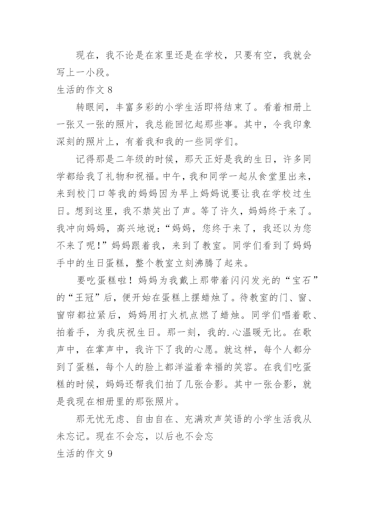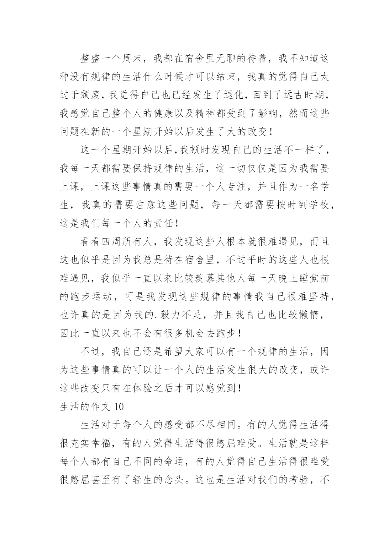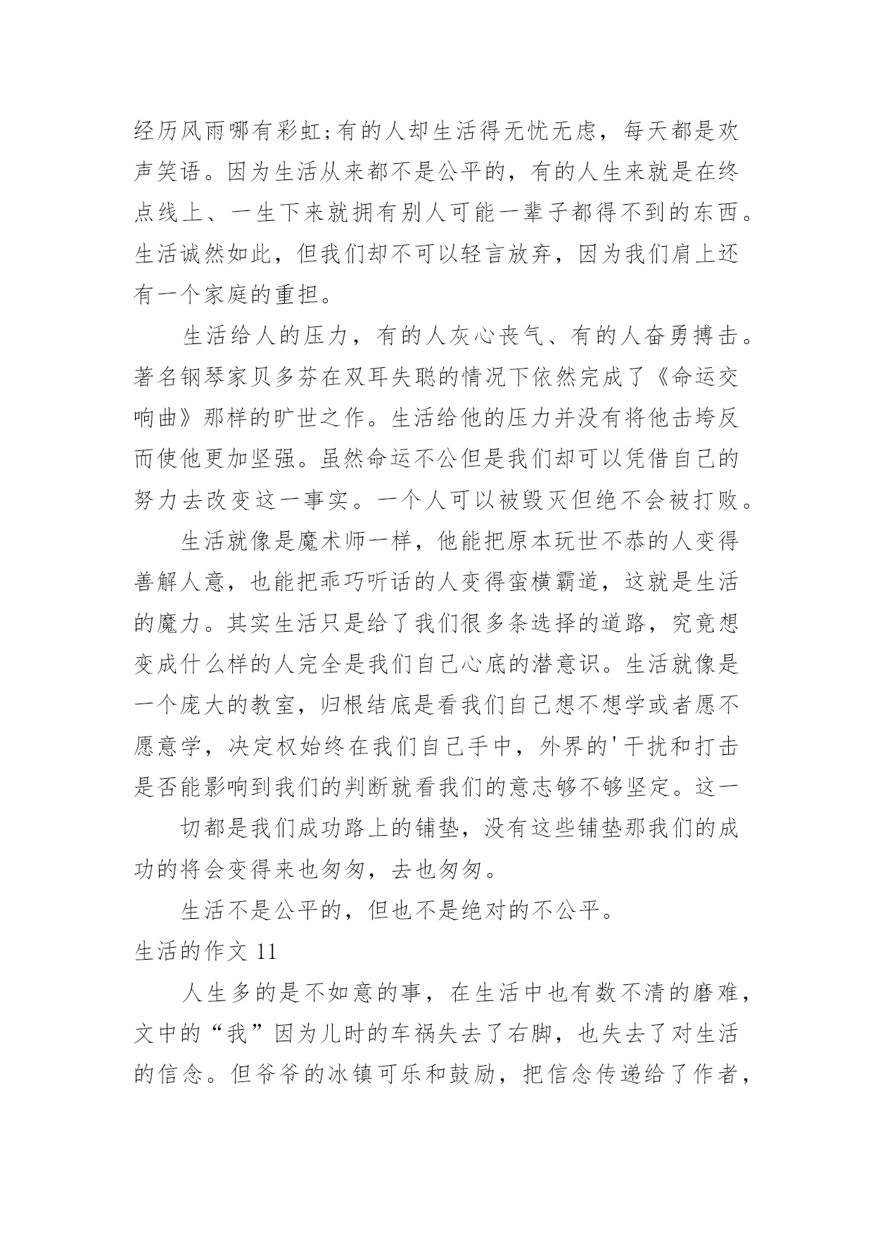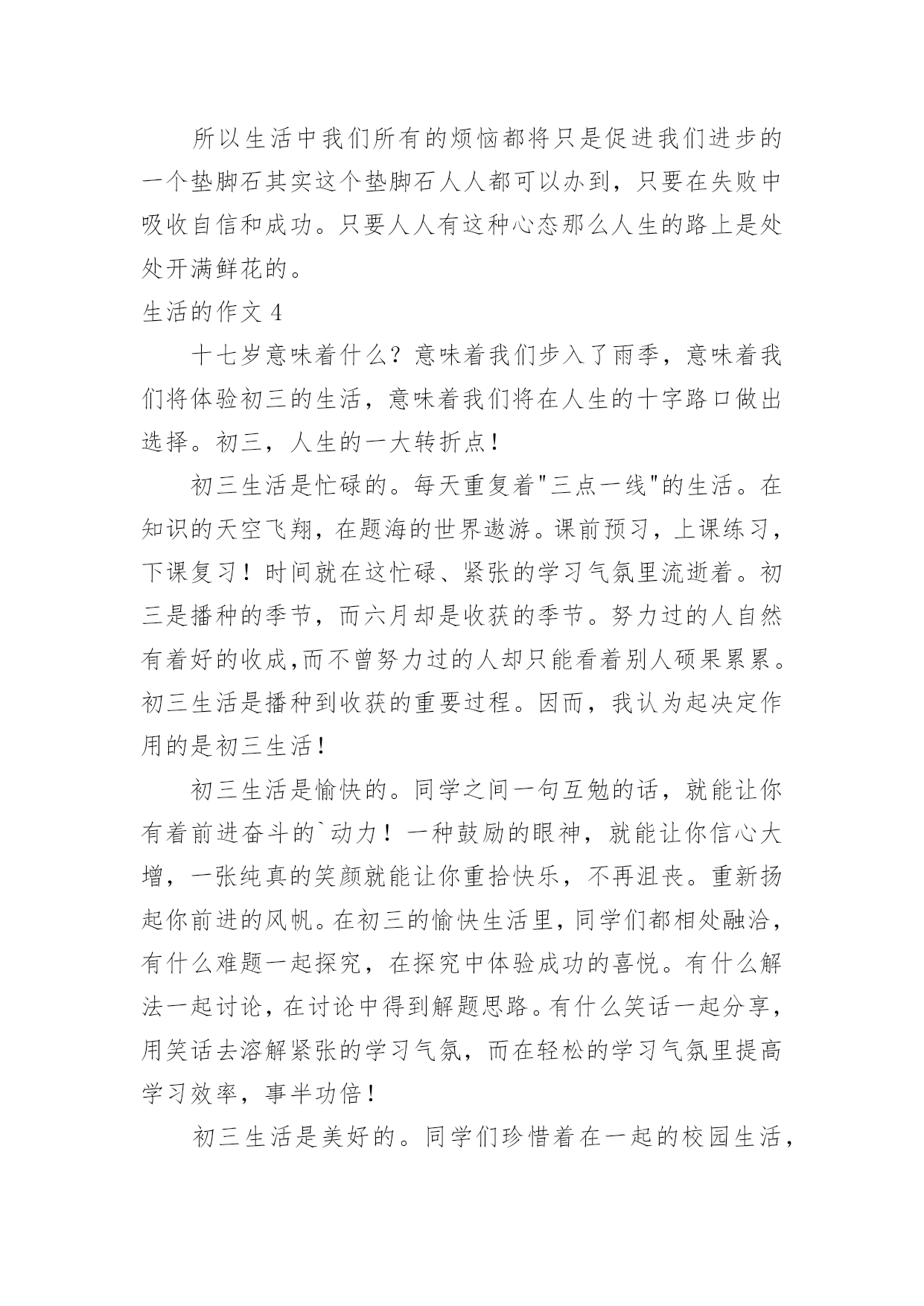 生活的作文(荐)生活的作文在日常学习、工作抑或是生活中,大家最不陌生的就是作文了吧,作文是一种言语活动,具有高度的综合性和创造性。还是对作文一筹莫展吗?下面是小编收集整理的生活的作文,仅供参考,希望能够帮助到大家。生活的作文1告别了小学,进入了初中。初中的生活里,有快乐,有烦恼,有困惑,有伤心。太多太多的情感融合在一起,短短的初中生活变得简单而又复杂,让人烦恼有耐人回味。记得刚刚入学时,怀着的是对未来美好的憧憬和怯懦,一切对我来说都是新鲜的,我的初中生活就这么开始了。说起初中生活的乐趣,那自然就是和同学一起的时光。初一时,最忘不了的是军训,在烈日下一站就是几个小时一动不动。当然,手工制作,象棋,远足等等都是军训的乐趣。初二,和同学们不顾老师的怒吼,每节下课都会兴冲冲的拿起篮球奔向操场,投入到紧张的战斗中。一个帅气的后仰跳投,球稳稳的落入筐中,铃声也随之而起,做个鬼脸转身就跑。虽然每次都会被老师说,但是这完全消灭不了我们的篮球热情。初三就没那么轻松了,活动课没有了,就连下课上厕所的时间都要尽量缩短。只有在星期六和星期天的篮球场上才能释放我们的'“小宇宙”这也成了我们学习的动力,期盼着周末的到来。在初中生活的舞台上,我们都尽情地演绎自己。在群星中,我也许不是最为耀眼的,但我还是会发出独特的光芒。我的初中生活啊,将会充满风雨和阳光!生活的作文2在雪地里,小草埋下了梦。它的梦就是等到春回大地时,以两片绿叶问候大地。在天空中,小鸟受伤了,但它依然还是往前飞,因为梦又赐给了它另一双翅膀。给它力量,使它再次飞翔。我喜欢做梦,因为梦让我看到风雨后的阳光。梦让我看到坎坷的道路不再那么的狭窄。梦给了我前进的力量,梦给我不变的召唤与步伐。梦引领我去追逐一个又一个新的目标。小时候,我依偎在妈妈的身边听着妈妈为我讲紫水晶的.故事。从此我便有了个梦就是渴望见到紫水晶。于是,我常常在梦里去找紫水晶,可是却怎么也找不到。时光的流逝,我渐渐地明白了紫水晶真正的含义。它是我的目标。我要朝着心中的梦想去努力。花儿总是在有梦的地方开放。花香总是在有梦的地方飘荡。人正因为有了梦想才有了理想,有了理想才有奋斗的精神。梦想是雄鹰的翅膀,梦想是人类前进的步伐。生活因梦想而精彩,梦想因追求而绚丽。更多色彩斑斓的心灵梦想,需要我们用行动去实现。正是对明天的憧憬,我奋斗着、拼搏着,心中对远方的向往是那么美好、那么精彩。即使明天没有流星的绚丽,亦无烟花的璀璨,但拥有明天,拥有梦想,向往那美好的未来,生活就是精彩的。因为有你——梦想,生活才精彩!朋友,跟我一起,带着愉快的步伐,隐形的翅膀,向着目标迈进吧!生活的作文3现在有许多人因为生活问题而苦恼,我本人认为生活的确是不应该没有烦恼的,有的人因为自己的失败而对生活失去信心,那些人怎么不去想想当今世界上那些伟大的成功人士呢?美国总统林肯是一个有巨大影响的`人,他知道正视失败。1854年他想争夺副总统,但没有成功;1858年他再产次竞选议员又遭失败。在一连串失败面前,他没有放弃领导追求,他终于还是赢得了人们的信任,在1860年时竞选成为美国总统。爱迪生取得了1093个发明专利,他经常发明成功也经常发明失败。他在十年中失败次数达到了五万次终于发明改造镍铁碱蓄电池,在此期间他还幽默的对他的同事说:“我们并未失败,我们现已知道有1000种方法是行不通的。”爱迪生还有一次失败,就在发明电话时,他去申请专利,遇到贝尔的比拼结果就是因为爱迪生的一个东西没有转所以这一个失败了。在生活中我们也不妨像林肯和爱迪生那样将失败看作是经验,把它看成一次特殊的洗礼。生活中只有强者才会懂得在失败中汲取成功。所以生活中我们所有的烦恼都将只是促进我们进步的一个垫脚石其实这个垫脚石人人都可以办到,只要在失败中吸收自信和成功。只要人人有这种心态那么人生的路上是处处开满鲜花的。生活的作文4十七岁意味着什么?意味着我们步入了雨季,意味着我们将体验初三的生活,意味着我们将在人生的十字路口做出选择。初三,人生的一大转折点!初三生活是忙碌的。每天重复着"三点一线"的生活。在知识的天空飞翔,在题海的世界遨游。课前预习,上课练习,下课复习!时间就在这忙碌、紧张的学习气氛里流逝着。初三是播种的季节,而六月却是收获的季节。努力过的人自然有着好的收成,而不曾努力过的人却只能看着别人硕果累累。初三生活是播种到收获的重要过程。因而,我认为起决定作用的是初三生活!初三生活是愉快的。同学之间一句互勉的话,就能让你有着前进奋斗的`动力!一种鼓励的眼神,就能让你信心大增,一张纯真的笑颜就能让你重拾快乐,不再沮丧。重新扬起你前进的风帆。在初三的愉快生活里,同学们都相处融洽,有什么难题一起探究,在探究中体验成功的喜悦。有什么解法一起讨论,在讨论中得到解题思路。有什么笑话一起分享,用笑话去溶解紧张的学习气氛