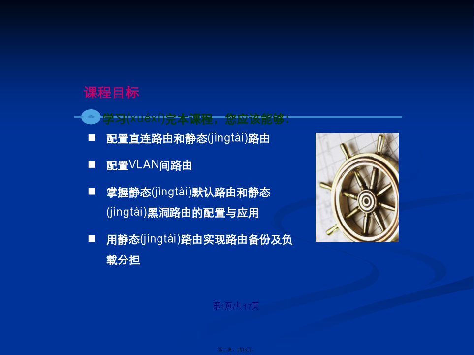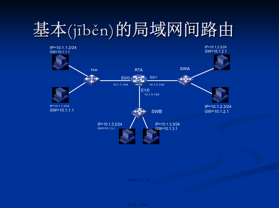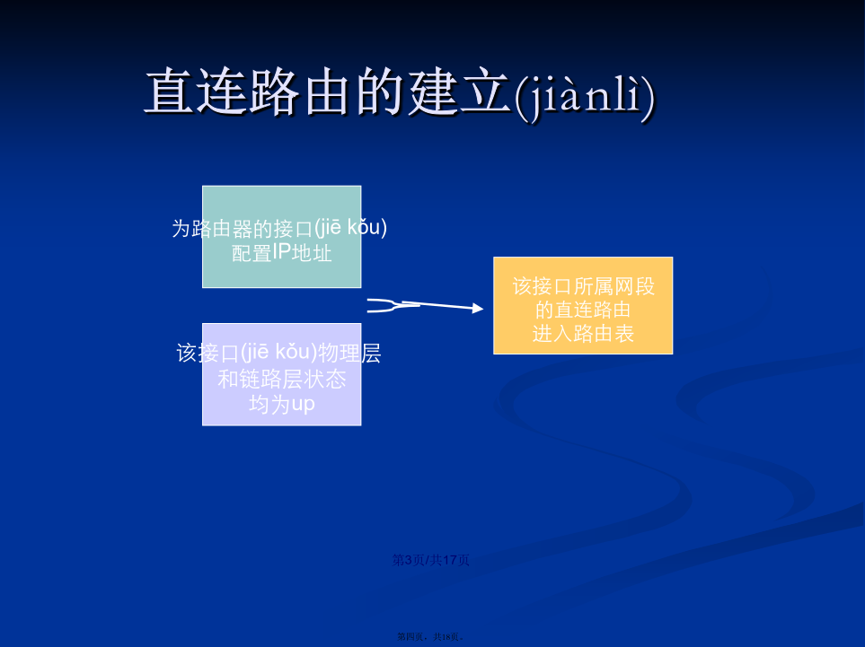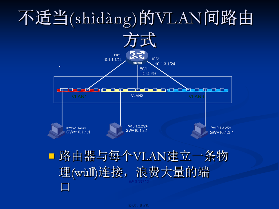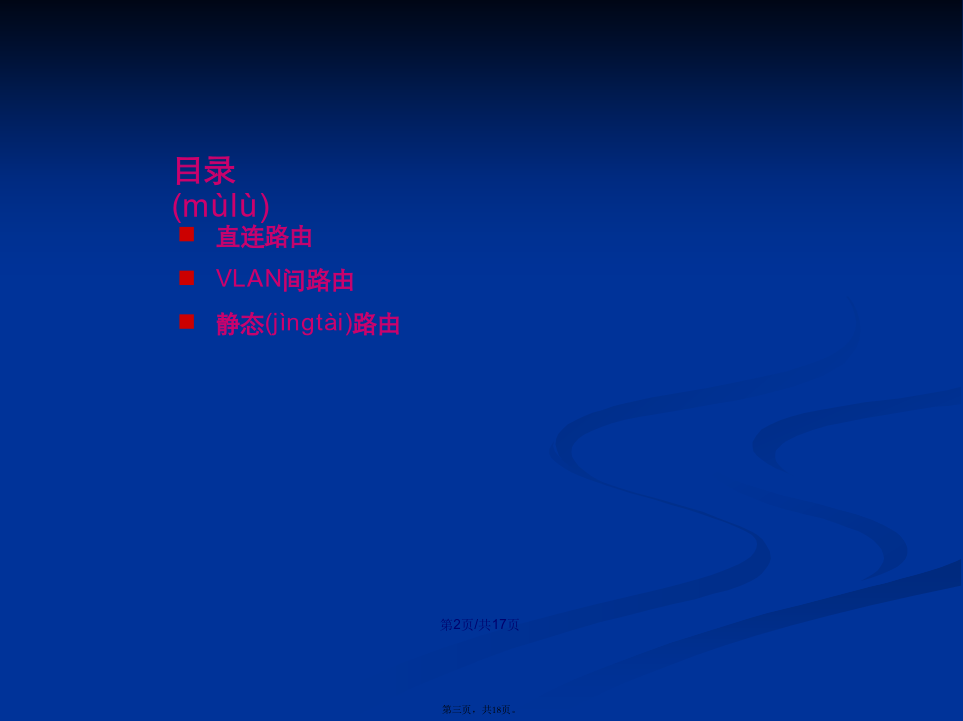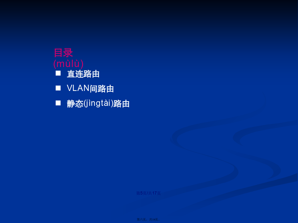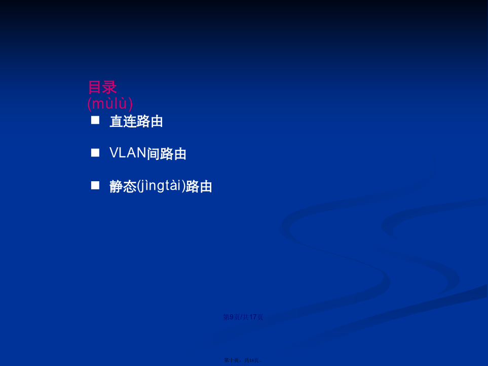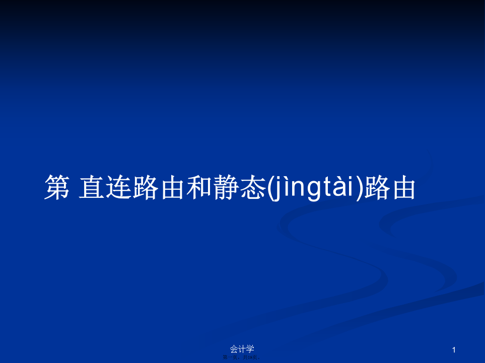 会计学直连路由VLAN间路由静态(jìngtài)路由直连路由的建立(jiànlì)基本(jīběn)的局域网间路由直连路由VLAN间路由静态(jìngtài)路由不适当(shìdàng)的VLAN间路由方式用802.1Q和子接口(jiēkǒu)实现VLAN间路由用三层交换机实现(shíxiàn)VLAN间路由直连路由VLAN间路由静态(jìngtài)路由静态(jìngtài)路由配置静态路由实现路由备份(bèifèn)和负载分担直连路由和VLAN间路由的配置静态路由的配置静态默认路由的配置利用静态路由实现路由备份(bèifèn)或负载分担黑洞路由的合理应用/感谢您的观看(guānkàn)!