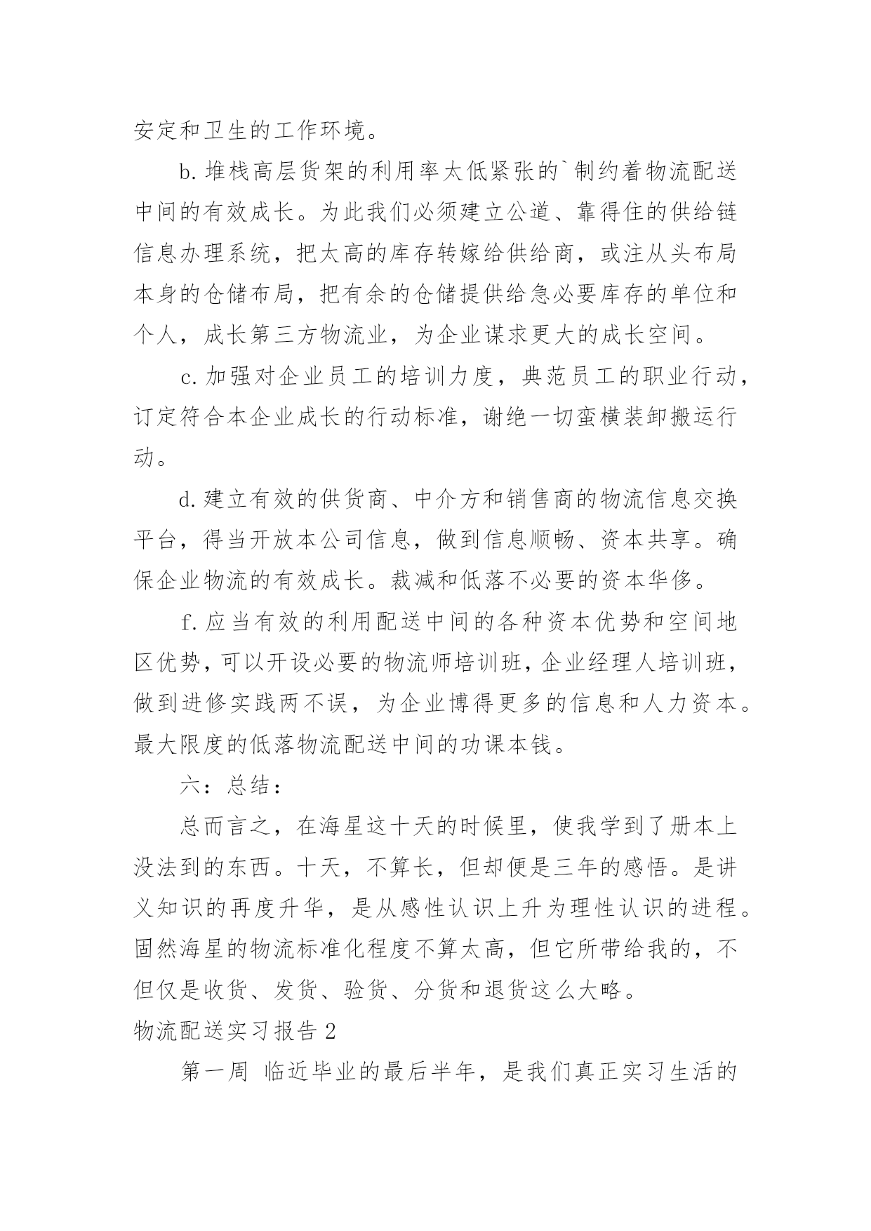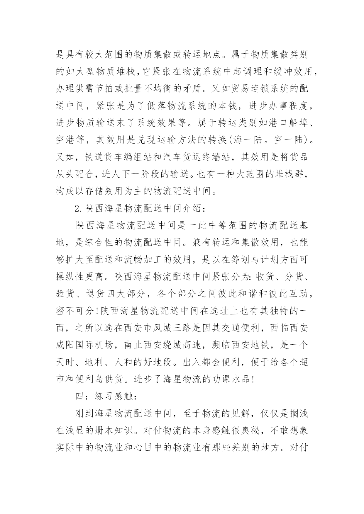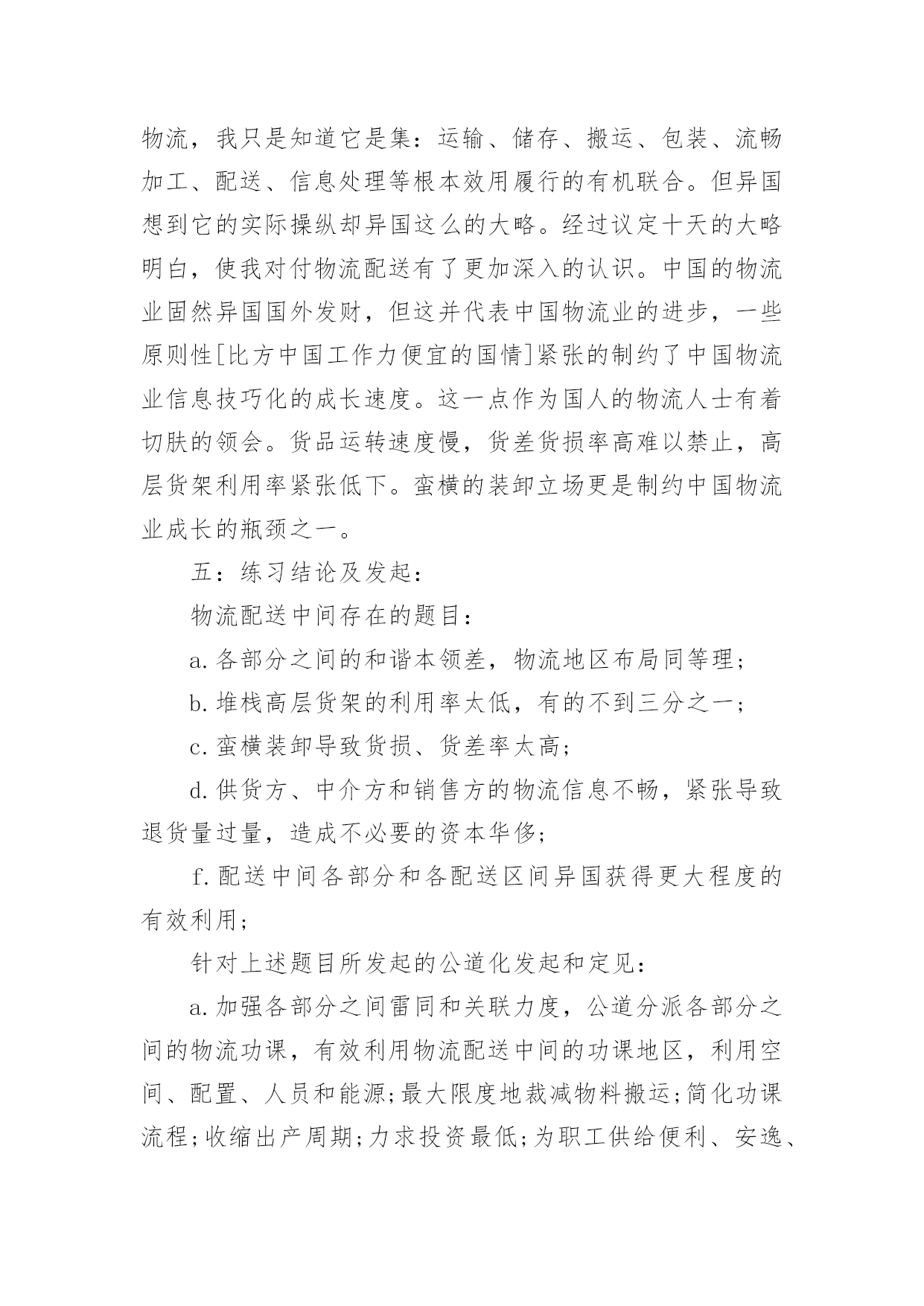 物流配送实习报告物流配送实习报告随着社会一步步向前发展,需要使用报告的情况越来越多,其在写作上有一定的技巧。你知道怎样写报告才能写的好吗?以下是小编为大家收集的物流配送实习报告,仅供参考,欢迎大家阅读。物流配送实习报告1一:练习目标:为了更好的适应今后的进修和工作,在本学期末,由黉舍联合构造到陕西省海星物流配送中间练习,练习时候总计十天。在这十天时候里我们紧张感官物流业的宏观和微观成长以及紧张的物流流程。为今后的进修和工作打下坚固的根本,让我们对中国物流业的成长状况有一个比较全新的认识。二:练习要求:明白物流的特点,紧张配置和功课流程,对其进行分析.并根据进修的表面发起本身的定见.明白物流配送中间的紧张流程。三:练习单位撮要:1.物流配送中间简介:物流配送中间是社会物流收集中处于紧张位置的结点,但不是扫数物流结点都能称为物流中间。物流配送中间必须是具有较大范围的物质集散或转运地点。属于物质集散类别的如大型物质堆栈,它紧张在物流系统中起调理和缓冲效用,办理供需节拍或批量不均衡的矛盾。又如贸易连锁系统的配送中间,紧张是为了低落物流系统的本钱,进步办事程度,进步物质输送末了系统效果等。属于转运类别如港口船埠、空港等,其效用是兑现运输方法的转换(海一陆。空一陆)。又如,铁道货车编组站和汽车货运终端站,其效用是将货品从头配合,进人下一阶段的输送。也有一种大范围的堆栈群,构成以存储效用为主的物流配送中间。2.陕西海星物流配送中间介绍:陕西海星物流配送中间是一此中等范围的物流配送基地,是综合性的物流配送中间。兼有转运和集散效用,也能够扩大至配送和流畅加工的效用,是以在筹划与计划方面可操纵性更高。陕西海星物流配送中间紧张分为:收货、分货、验货、退货四大部分,各个部分之间彼此和谐和彼此互助,密不可分!陕西海星物流配送中间在选址上也有其独特的一面,之所以选在西安市凤城三路是因其交通便利,西临西安咸阳国际机场,南止西安绕城高速,濒临西安地铁,是一个天时、地利、人和的好地段。出入都会便利,便于给各个超市和便利岛供货。进步了海星物流的功课水品!四:练习感触:刚到海星物流配送中间,至于物流的见解,仅仅是搁浅在浅显的册本知识。对付物流的本身感触很奥秘,不敢想象实际中的物流业和心目中的物流业有那些差别的地方。对付物流,我只是知道它是集:运输、储存、搬运、包装、流畅加工、配送、信息处理等根本效用履行的有机联合。但异国想到它的实际操纵却异国这么的大略。经过议定十天的大略明白,使我对付物流配送有了更加深入的认识。中国的物流业固然异国国外发财,但这并代表中国物流业的进步,一些原则性[比方中国工作力便宜的国情]紧张的制约了中国物流业信息技巧化的成长速度。这一点作为国人的物流人士有着切肤的领会。货品运转速度慢,货差货损率高难以禁止,高层货架利用率紧张低下。蛮横的装卸立场更是制约中国物流业成长的瓶颈之一。五:练习结论及发起:物流配送中间存在的题目:a.各部分之间的和谐本领差,物流地区布局同等理;b.堆栈高层货架的利用率太低,有的不到三分之一;c.蛮横装卸导致货损、货差率太高;d.供货方、中介方和销售方的物流信息不畅,紧张导致退货量过量,造成不必要的资本华侈;f.配送中间各部分和各配送区间异国获得更大程度的有效利用;针对上述题目所发起的公道化发起和定见:a.加强各部分之间雷同和关联力度,公道分派各部分之间的物流功课,有效利用物流配送中间的功课地区,利用空间、配置、人员和能源;最大限度地裁减物料搬运;简化功课流程;收缩出产周期;力求投资最低;为职工供给便利、安逸、安定和卫生的工作环境。b.堆栈高层货架的利用率太低紧张的`制约着物流配送中间的有效成长。为此我们必须建立公道、靠得住的供给链信息办理系统,把太高的库存转嫁给供给商,或注从头布局本身的仓储布局,把有余的仓储提供给急必要库存的单位和个人,成长第三方物流业,为企业谋求更大的成长空间。c.加强对企业员工的培训力度,典范员工的职业行动,订定符合本企业成长的行动标准,谢绝一切蛮横装卸搬运行动。d.建立有效的供货商、中介方和销售商的物流信息交换平台,得当开放本公司信息,做到信息顺畅、资本共享。确保企业物流的有效成长。裁减和低落不必要的资本华侈。f.应当有效的利用配送中间的各种资本优势和空间地区优势,可以开设必要的物流师培训班,企业经理人培训班,做到进修实践两不误,为企业博得更多的信息和人力资本。最大限度的低落物流配送中间的功课本钱。六:总结:总而言之,在海星这十天的时候里,使我学到了册本上没法到的东西。十天,不算长,但却便是三年的感悟。是讲义知识的再度升华,是从感性认识上升为理性认识的进程。固然海星的物流标准化程度不算太高,但它所带给我的,不但仅是收货、发货、验货、分货和退货这么大略。物流配送实习报告2第一周临近毕业的最后半年