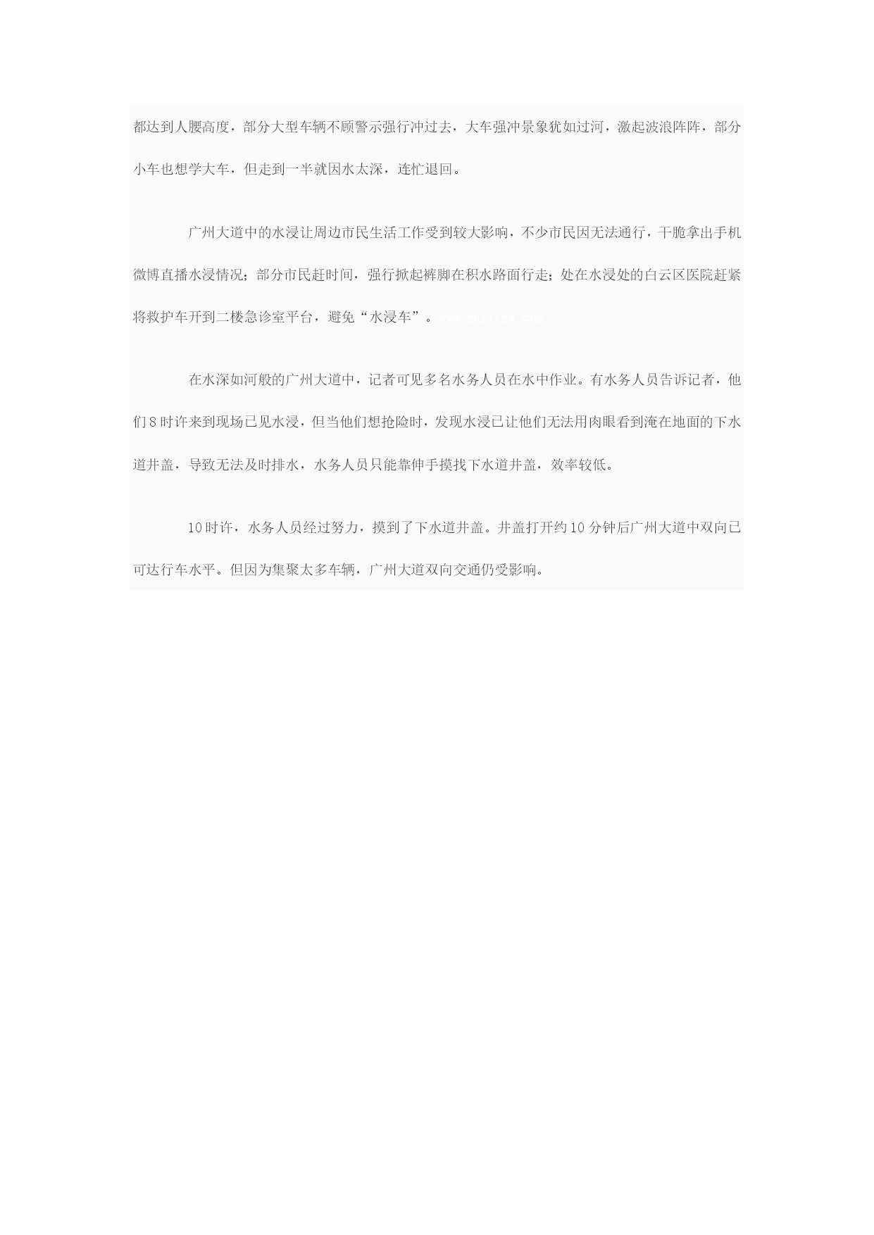 广州遭暴雨袭击成泽国交通瘫痪7月15日早晨,受暴雨影响,广州市区多处水浸。其中,水浸最严重的广州大道中白云区医院路段,水深一度及人腰,双向交通一度中断。影响广州的暴雨在7月15日晨8时许开始下。大约半小时后,羊城晚报新闻报料热线开始接到读者打来有关水浸的报料。大约8时45分,羊城晚报记者巡城看到,过往的水浸黑点东风东路梅东路口路段有水浸情况出现,交通受阻;水务人员约在9时到场,打开下水道井盖排水,大约10分钟后道路水浸退去。就在这短短十分钟左右的时间,让东风东路东往西方向出现拥堵,龙尾一直堵到黄埔大道马场路路段。在东风东路上方的内环路,双向同样交通拥堵。据了解,由于内环路AB线在动物园路段都出现水浸,导致内环路东半环今早交通几乎中断。9时30分,记者来到广州大道中白云区路段,只见该路段行车道双向都遭水浸,交警在沙河立交和林和西横路各设一个交通管制点,提醒车辆不要驶入水深路段。记者看到,双向行车道水深都达到人腰高度,部分大型车辆不顾警示强行冲过去,大车强冲景象犹如过河,激起波浪阵阵,部分小车也想学大车,但走到一半就因水太深,连忙退回。广州大道中的水浸让周边市民生活工作受到较大影响,不少市民因无法通行,干脆拿出手机微博直播水浸情况;部分市民赶时间,强行掀起裤脚在积水路面行走;处在水浸处的白云区医院赶紧将救护车开到二楼急诊室平台,避免“水浸车”。www.ruilizx.com在水深如河般的广州大道中,记者可见多名水务人员在水中作业。有水务人员告诉记者,他们8时许来到现场已见水浸,但当他们想抢险时,发现水浸已让他们无法用肉眼看到淹在地面的下水道井盖,导致无法及时排水,水务人员只能靠伸手摸找下水道井盖,效率较低。10时许,水务人员经过努力,摸到了下水道井盖。井盖打开约10分钟后广州大道中双向已可达行车水平。但因为集聚太多车辆,广州大道双向交通仍受影响。