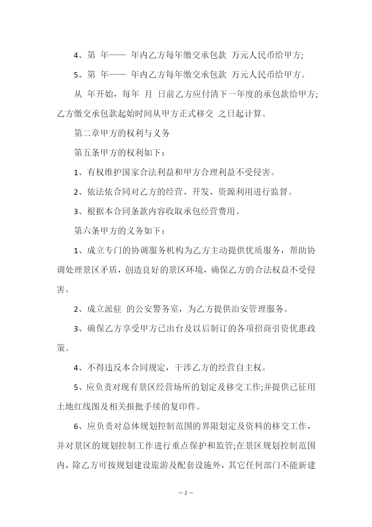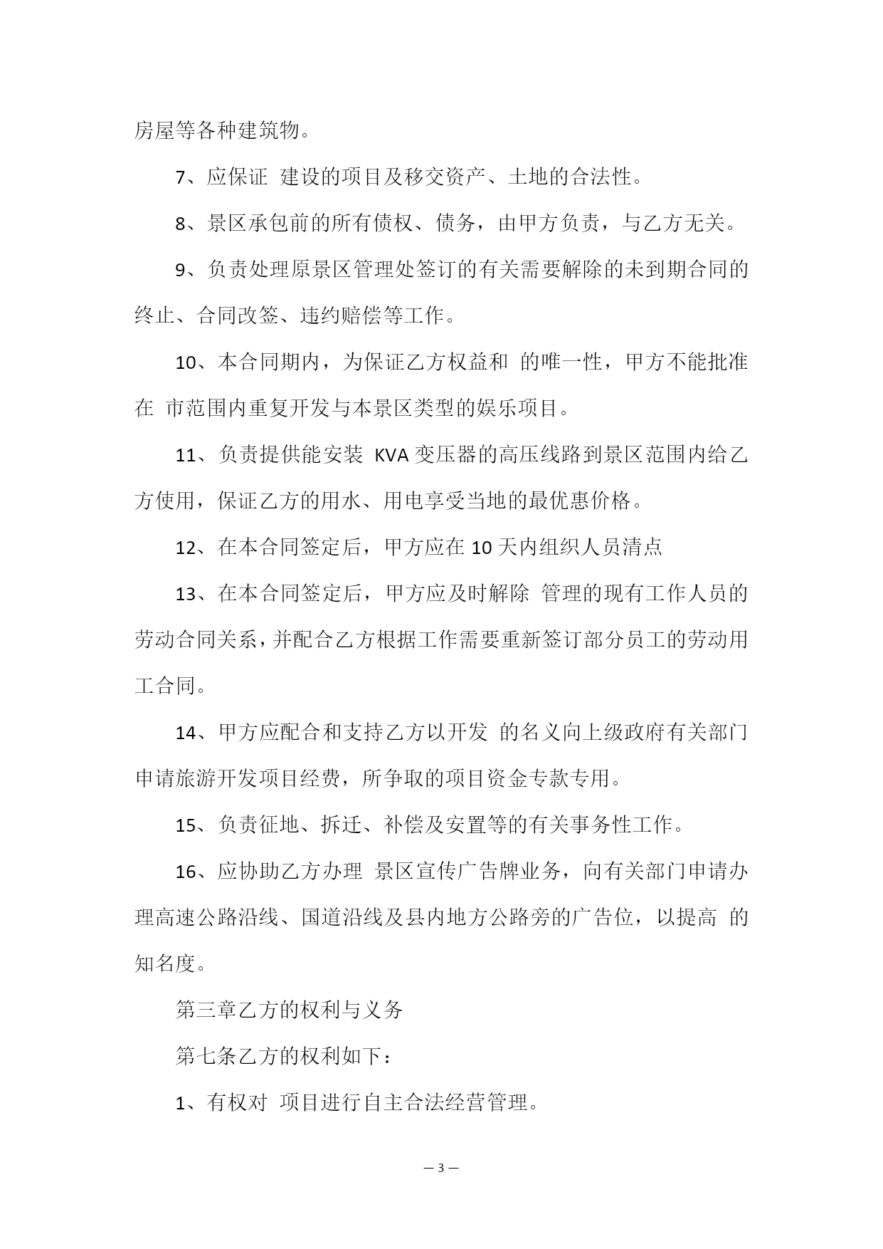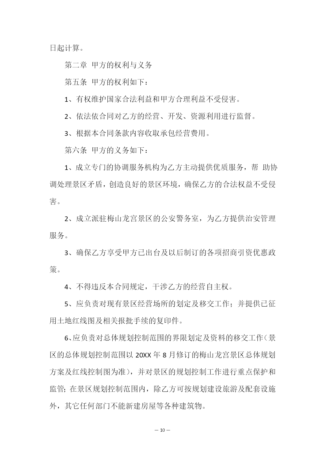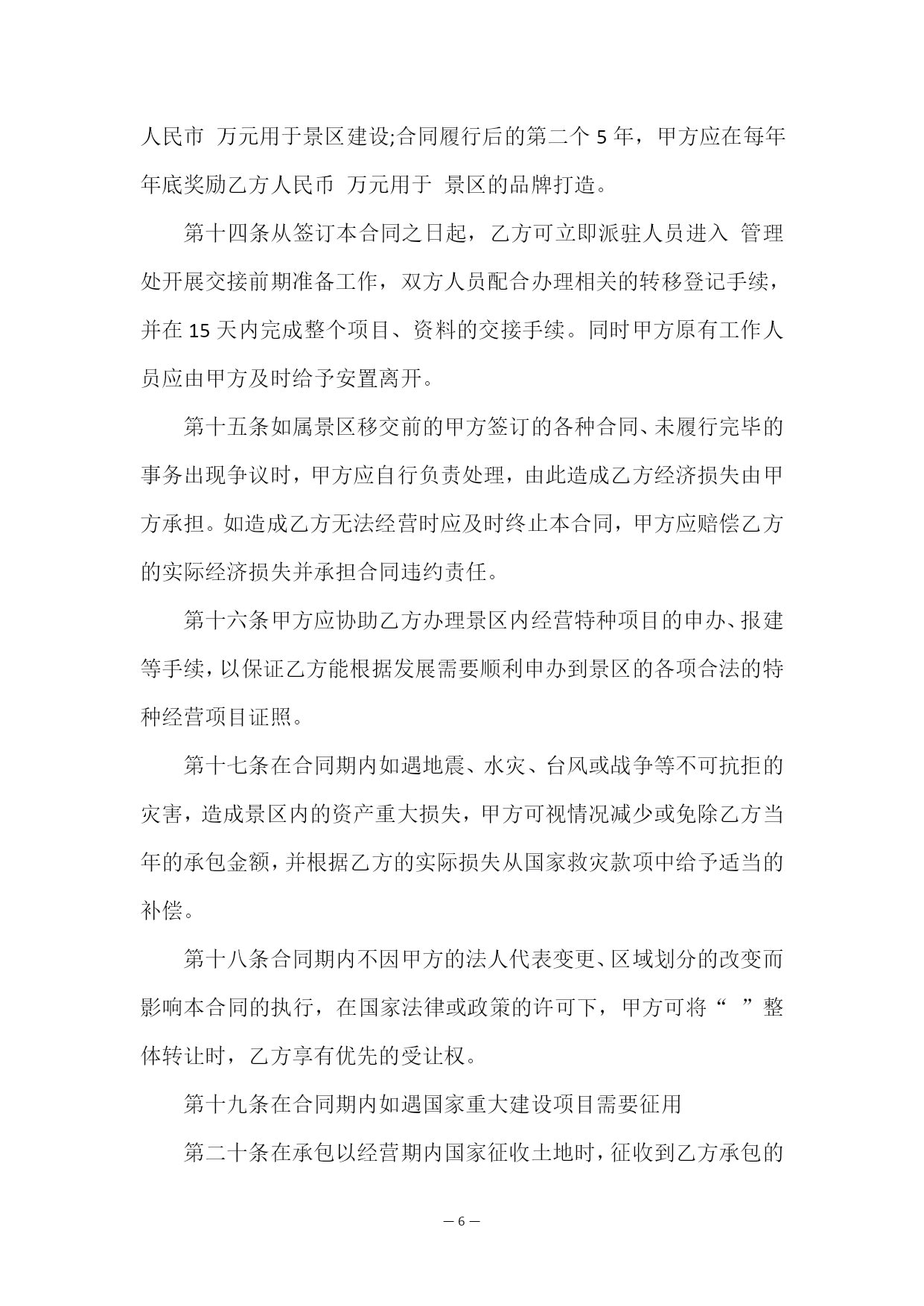 —PAGE\*MERGEFORMAT28—景区承包经营合同景区承包经营合同1发包方:人民政府法定代表人:承包方:旅游开发有限公司法定代表人:为加快的旅游发展,打造品牌,甲方决定将经营权发包给乙方。秉着互惠互利的原则,经双方共同协商一致,签订本合同。第一章承包经营范围、期限、形式和主要指标第一条承包经营范围:风景管理处经营管理的梅山龙宫龙区项目:具体包括已开发的主体,已修建的等景区配套设施。第二条承包经营年限:本合同承包经营期限为年,即从年月日起至年月日止。第三条承包经营方式:由乙方独资承包自主经营。第四条承包款及支付方式:本全合同的承包费用总额固定为人民币亿元。本合签订后30天内,乙方须向甲方支付承包经营费万元人民币,其余的承包经营费按如下方案缴交:1、第年——年内乙方每年缴交承包款万元人民币给甲方;2、第年——年内乙方每年缴交承包款万元人民币给甲方;3、第年——年内乙方每年缴交承包款万元人民币给甲方;4、第年——年内乙方每年缴交承包款万元人民币给甲方;5、第年——年内乙方每年缴交承包款万元人民币给甲方。从年开始,每年月日前乙方应付清下一年度的承包款给甲方;乙方缴交承包款起始时间从甲方正式移交之日起计算。第二章甲方的权利与义务第五条甲方的权利如下:1、有权维护国家合法利益和甲方合理利益不受侵害。2、依法依合同对乙方的经营、开发、资源利用进行监督。3、根据本合同条款内容收取承包经营费用。第六条甲方的义务如下:1、成立专门的协调服务机构为乙方主动提供优质服务,帮助协调处理景区矛盾,创造良好的景区环境,确保乙方的合法权益不受侵害。2、成立派驻的公安警务室,为乙方提供治安管理服务。3、确保乙方享受甲方已出台及以后制订的各项招商引资优惠政策。4、不得违反本合同规定,干涉乙方的经营自主权。5、应负责对现有景区经营场所的划定及移交工作;并提供已征用土地红线图及相关报批手续的复印件。6、应负责对总体规划控制范围的界限划定及资料的移交工作,并对景区的规划控制工作进行重点保护和监管;在景区规划控制范围内,除乙方可按规划建设旅游及配套设施外,其它任何部门不能新建房屋等各种建筑物。7、应保证建设的项目及移交资产、土地的合法性。8、景区承包前的所有债权、债务,由甲方负责,与乙方无关。9、负责处理原景区管理处签订的有关需要解除的未到期合同的终止、合同改签、违约赔偿等工作。10、本合同期内,为保证乙方权益和的唯一性,甲方不能批准在市范围内重复开发与本景区类型的娱乐项目。11、负责提供能安装KVA变压器的高压线路到景区范围内给乙方使用,保证乙方的用水、用电享受当地的最优惠价格。12、在本合同签定后,甲方应在10天内组织人员清点13、在本合同签定后,甲方应及时解除管理的现有工作人员的劳动合同关系,并配合乙方根据工作需要重新签订部分员工的劳动用工合同。14、甲方应配合和支持乙方以开发的名义向上级政府有关部门申请旅游开发项目经费,所争取的项目资金专款专用。15、负责征地、拆迁、补偿及安置等的有关事务性工作。16、应协助乙方办理景区宣传广告牌业务,向有关部门申请办理高速公路沿线、国道沿线及县内地方公路旁的广告位,以提高的知名度。第三章乙方的权利与义务第七条乙方的权利如下:1、有权对项目进行自主合法经营管理。2、有权将内的经营项目进行承包管理。3、有权享受甲方出台的有关各项招商引资优惠政策和国家税收优惠政策。合同履行后前五年内,乙方的景区建设项目行政性收费全免,服务性收费减半收取。4、有权根据需要申请对景区整体规划进行调整,分期开发利用与改变部分土地用途,但必须征得甲方同意并按程序报批。5、有权自主决定景区的内部机构设置、人员安排和招工用工等,在同等条件下乙方应优先安排甲方原有的员工就业。6、在同等条件下,对其它景区的承包经营权享有优先权。第八条乙方的义务如下:1、景区的旅游资源是不可再生的,乙方应按照国家有关法律法规规定确实履行保护管理景区内旅游资源的责任。2、加强景区配套景点、设施的建设,合同履行后的前5年乙方确保平均每年投入景区建设的资金不少于万元人民币。3、乙方每年应有一定资金投入景区旅游项目品牌的宣传推广工作,努力提高“”的知名度。4、在合同期内,乙方应每年向甲方免费提供张参观景区的门票,但甲方应指定县旅游局代表政府领取该赠票。5、如需要申报国家级风景名胜区、自然文化遗产、景区承包经营合同景区及国家地质公园等,所需费用由乙方承担。6不得将甲方的景区资源、土地使用权和移交的固定资产进行抵押融资。第四章违约责任第九条本合同签订后,任何一方均不得违约,否则,违约方应向守约方支付本合同总金额的10%违约金;守约方并可视情况有权单方终止合同