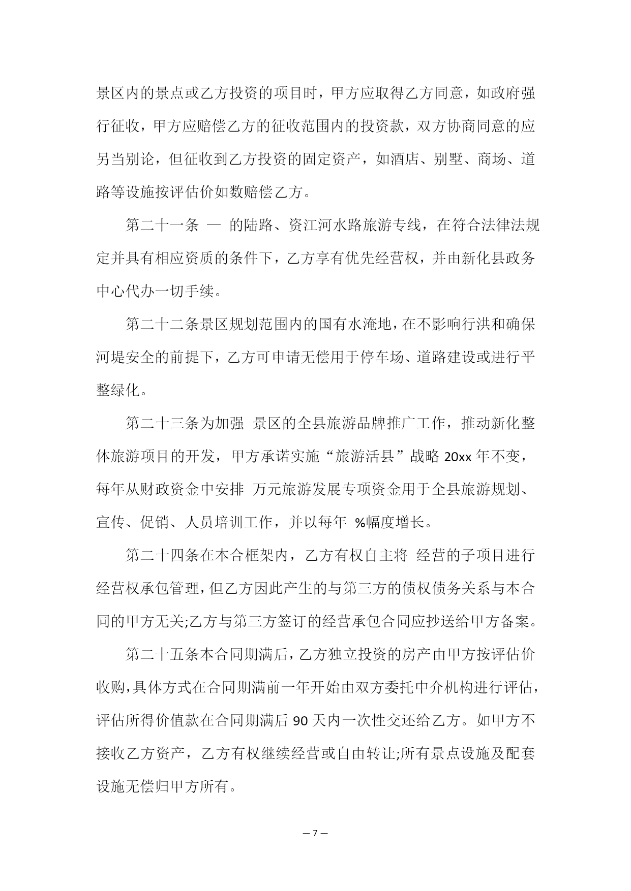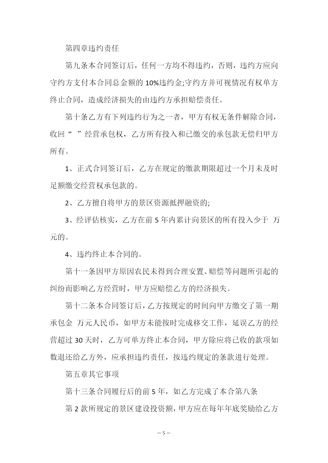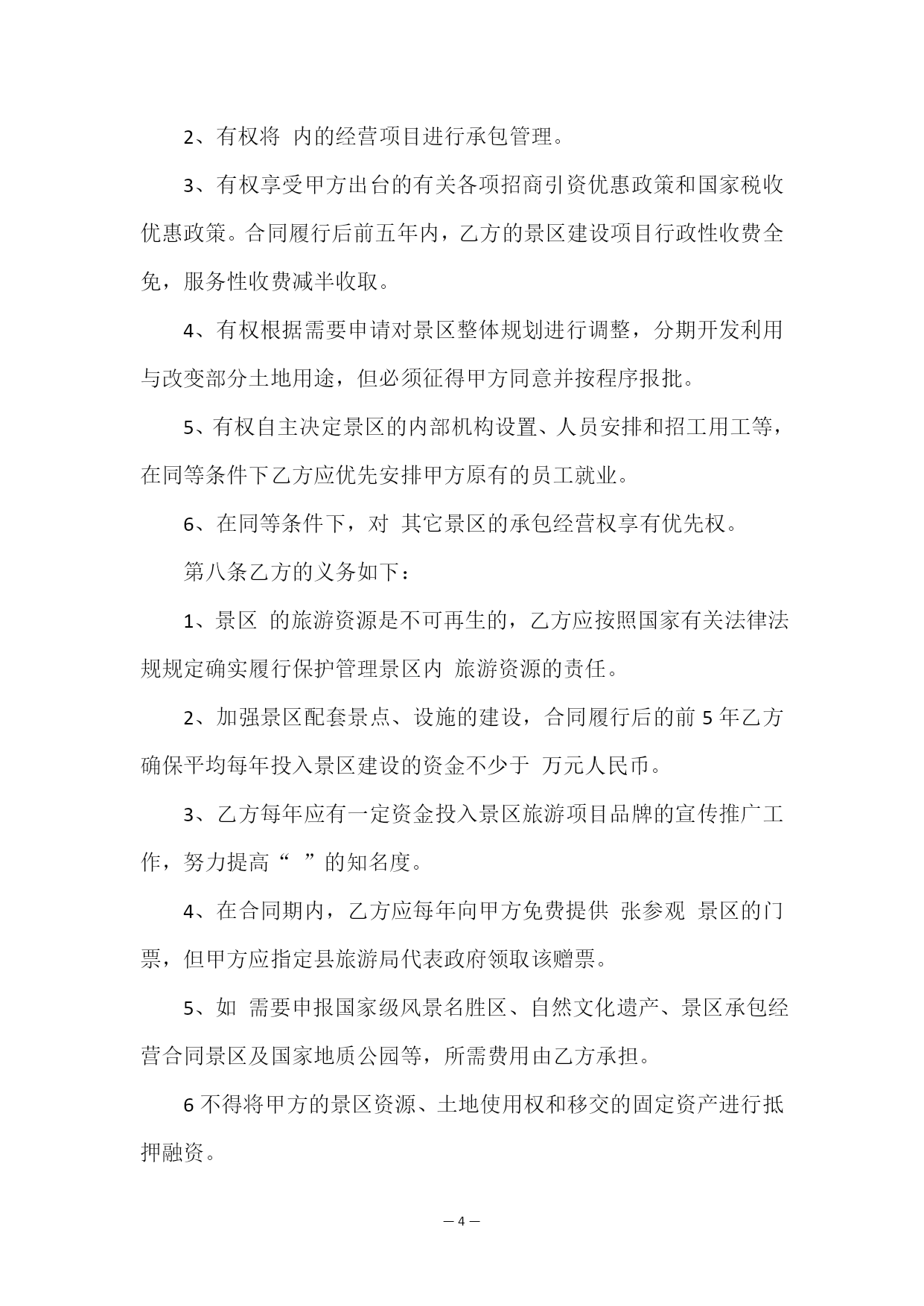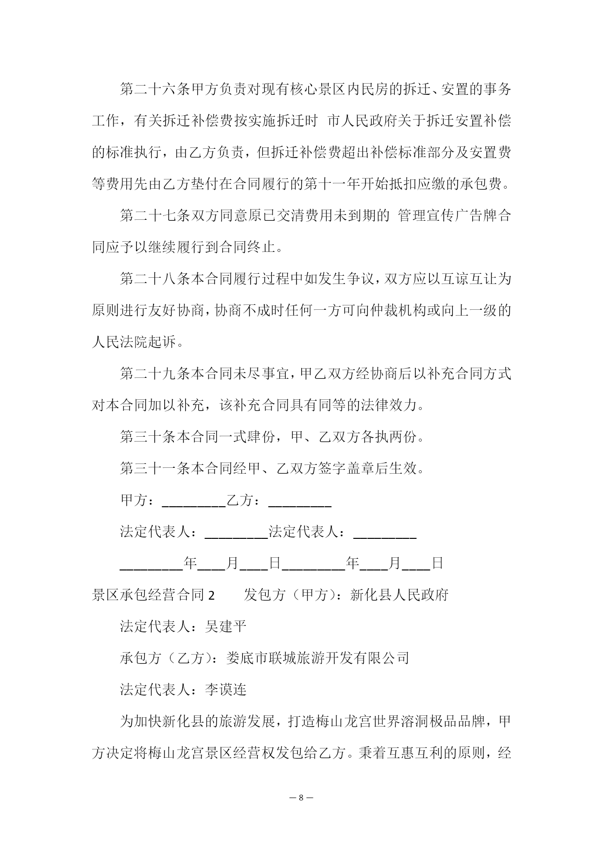 —PAGE\*MERGEFORMAT28—景区承包经营合同景区承包经营合同1发包方:人民政府法定代表人:承包方:旅游开发有限公司法定代表人:为加快的旅游发展,打造品牌,甲方决定将经营权发包给乙方。秉着互惠互利的原则,经双方共同协商一致,签订本合同。第一章承包经营范围、期限、形式和主要指标第一条承包经营范围:风景管理处经营管理的梅山龙宫龙区项目:具体包括已开发的主体,已修建的等景区配套设施。第二条承包经营年限:本合同承包经营期限为年,即从年月日起至年月日止。第三条承包经营方式:由乙方独资承包自主经营。第四条承包款及支付方式:本全合同的承包费用总额固定为人民币亿元。本合签订后30天内,乙方须向甲方支付承包经营费万元人民币,其余的承包经营费按如下方案缴交:1、第年——年内乙方每年缴交承包款万元人民币给甲方;2、第年——年内乙方每年缴交承包款万元人民币给甲方;3、第年——年内乙方每年缴交承包款万元人民币给甲方;4、第年——年内乙方每年缴交承包款万元人民币给甲方;5、第年——年内乙方每年缴交承包款万元人民币给甲方。从年开始,每年月日前乙方应付清下一年度的承包款给甲方;乙方缴交承包款起始时间从甲方正式移交之日起计算。第二章甲方的权利与义务第五条甲方的权利如下:1、有权维护国家合法利益和甲方合理利益不受侵害。2、依法依合同对乙方的经营、开发、资源利用进行监督。3、根据本合同条款内容收取承包经营费用。第六条甲方的义务如下:1、成立专门的协调服务机构为乙方主动提供优质服务,帮助协调处理景区矛盾,创造良好的景区环境,确保乙方的合法权益不受侵害。2、成立派驻的公安警务室,为乙方提供治安管理服务。3、确保乙方享受甲方已出台及以后制订的各项招商引资优惠政策。4、不得违反本合同规定,干涉乙方的经营自主权。5、应负责对现有景区经营场所的划定及移交工作;并提供已征用土地红线图及相关报批手续的复印件。6、应负责对总体规划控制范围的界限划定及资料的移交工作,并对景区的规划控制工作进行重点保护和监管;在景区规划控制范围内,除乙方可按规划建设旅游及配套设施外,其它任何部门不能新建房屋等各种建筑物。7、应保证建设的项目及移交资产、土地的合法性。8、景区承包前的所有债权、债务,由甲方负责,与乙方无关。9、负责处理原景区管理处签订的有关需要解除的未到期合同的终止、合同改签、违约赔偿等工作。10、本合同期内,为保证乙方权益和的唯一性,甲方不能批准在市范围内重复开发与本景区类型的娱乐项目。11、负责提供能安装KVA变压器的高压线路到景区范围内给乙方使用,保证乙方的用水、用电享受当地的最优惠价格。12、在本合同签定后,甲方应在10天内组织人员清点13、在本合同签定后,甲方应及时解除管理的现有工作人员的劳动合同关系,并配合乙方根据工作需要重新签订部分员工的劳动用工合同。14、甲方应配合和支持乙方以开发的名义向上级政府有关部门申请旅游开发项目经费,所争取的项目资金专款专用。15、负责征地、拆迁、补偿及安置等的有关事务性工作。16、应协助乙方办理景区宣传广告牌业务,向有关部门申请办理高速公路沿线、国道沿线及县内地方公路旁的广告位,以提高的知名度。第三章乙方的权利与义务第七条乙方的权利如下:1、有权对项目进行自主合法经营管理。2、有权将内的经营项目进行承包管理。3、有权享受甲方出台的有关各项招商引资优惠政策和国家税收优惠政策。合同履行后前五年内,乙方的景区建设项目行政性收费全免,服务性收费减半收取。4、有权根据需要申请对景区整体规划进行调整,分期开发利用与改变部分土地用途,但必须征得甲方同意并按程序报批。5、有权自主决定景区的内部机构设置、人员安排和招工用工等,在同等条件下乙方应优先安排甲方原有的员工就业。6、在同等条件下,对其它景区的承包经营权享有优先权。第八条乙方的义务如下:1、景区的旅游资源是不可再生的,乙方应按照国家有关法律法规规定确实履行保护管理景区内旅游资源的责任。2、加强景区配套景点、设施的建设,合同履行后的前5年乙方确保平均每年投入景区建设的资金不少于万元人民币。3、乙方每年应有一定资金投入景区旅游项目品牌的宣传推广工作,努力提高“”的知名度。4、在合同期内,乙方应每年向甲方免费提供张参观景区的门票,但甲方应指定县旅游局代表政府领取该赠票。5、如需要申报国家级风景名胜区、自然文化遗产、景区承包经营合同景区及国家地质公园等,所需费用由乙方承担。6不得将甲方的景区资源、土地使用权和移交的固定资产进行抵押融资。第四章违约责任第九条本合同签订后,任何一方均不得违约,否则,违约方应向守约方支付本合同总金额的10%违约金;守约方并可视情况有权单方终止合同