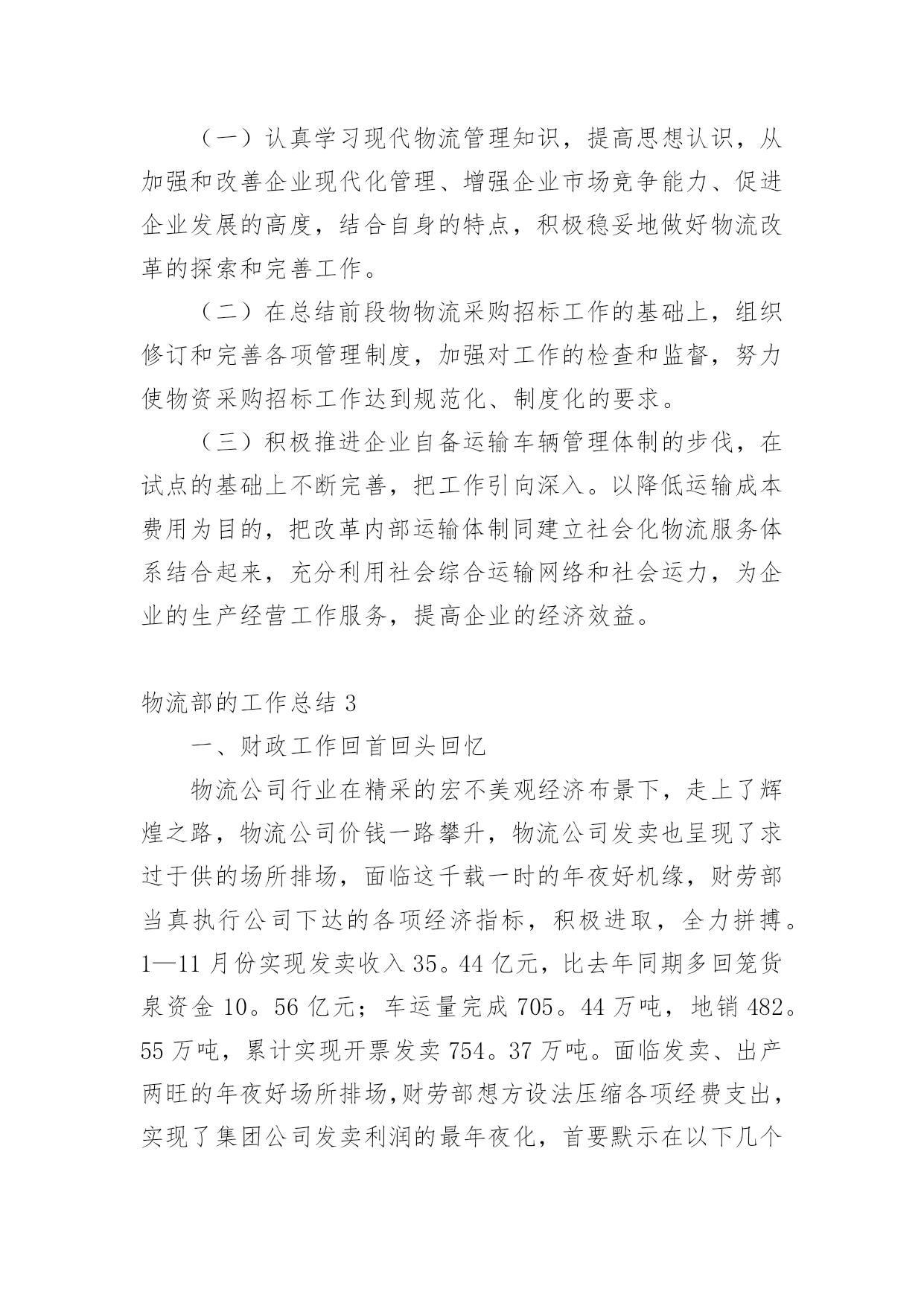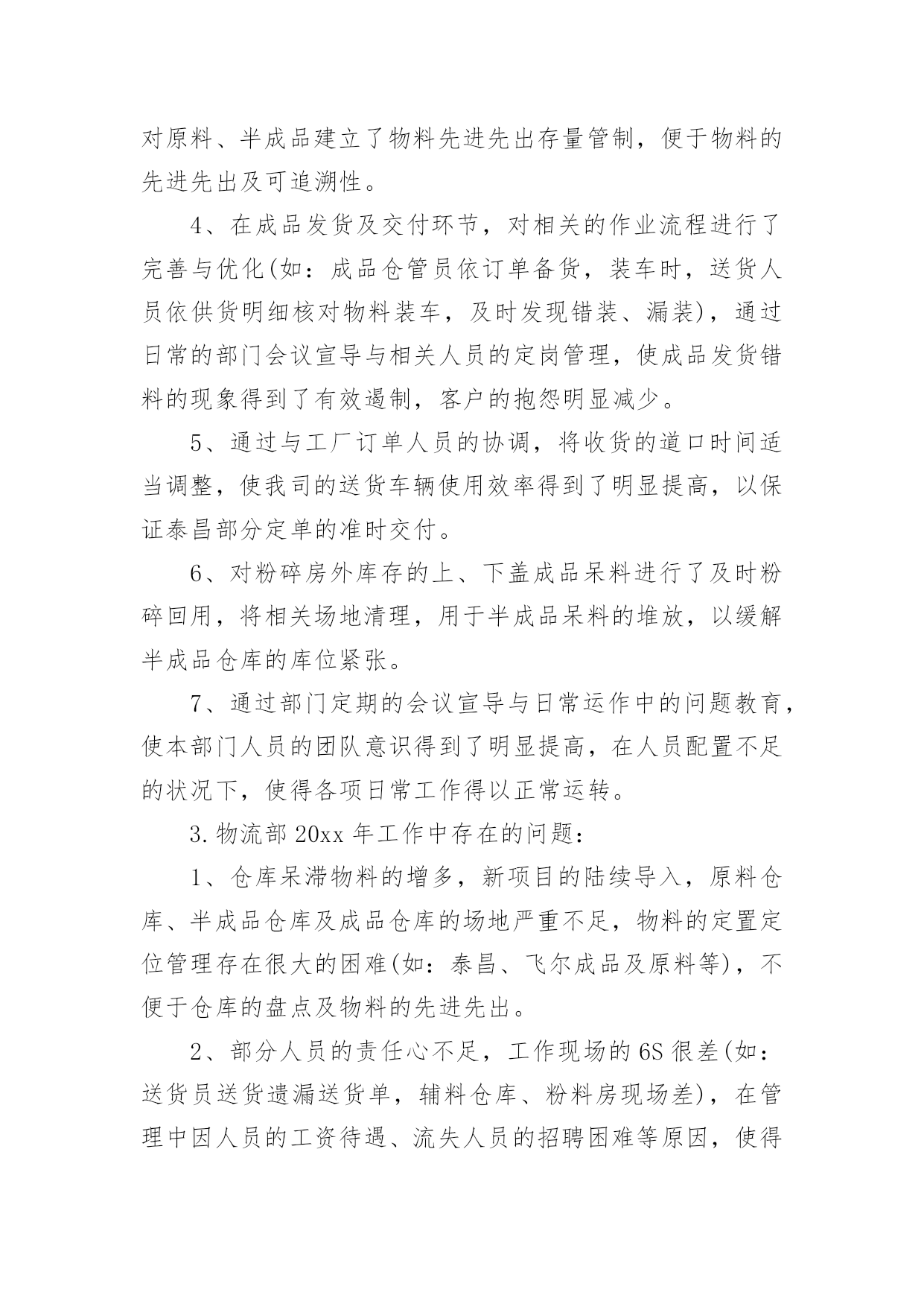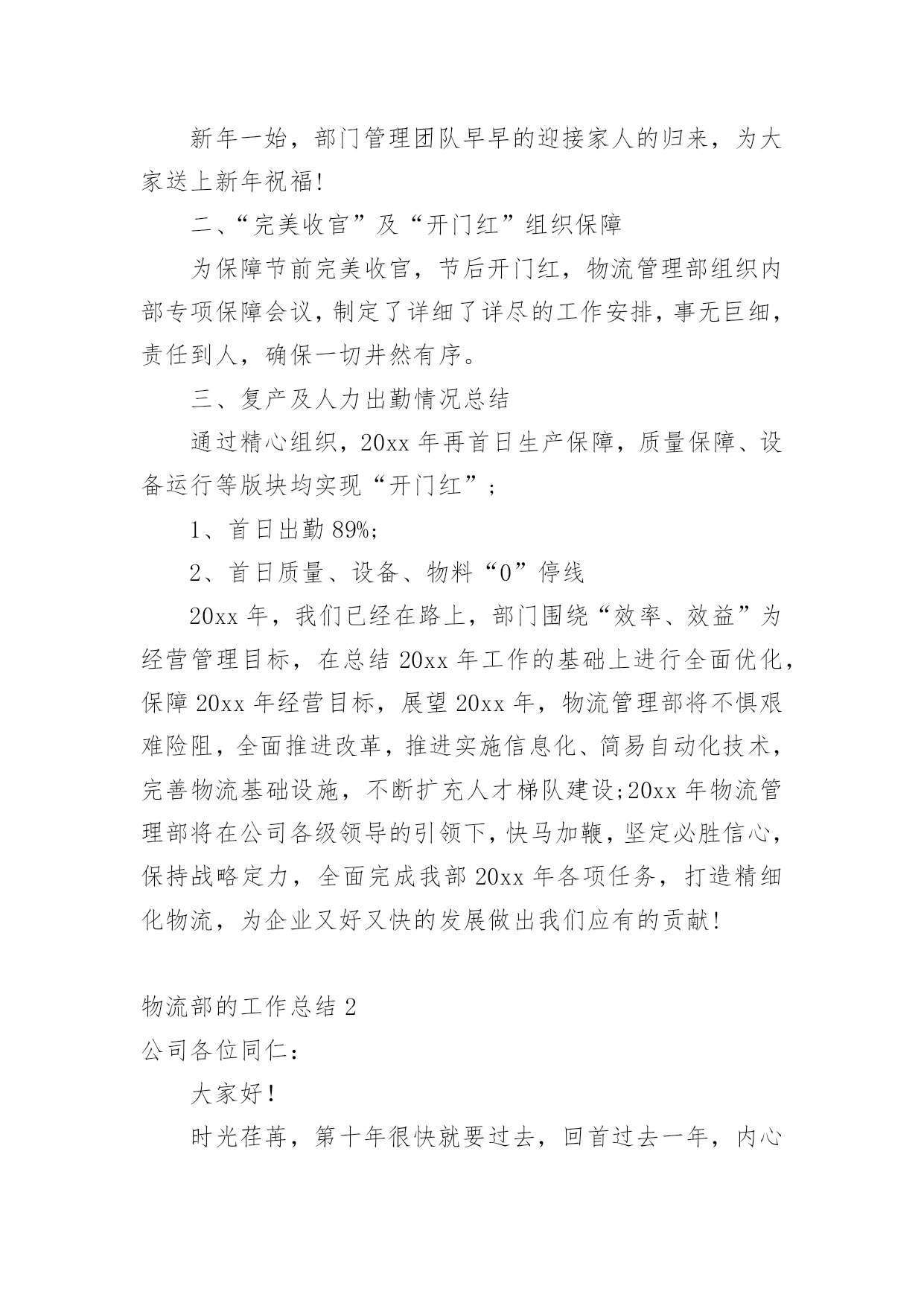 物流部的工作总结总结就是把一个时段的学习、工作或其完成情况进行一次全面系统的总结,它在我们的学习、工作中起到呈上启下的作用,快快来写一份总结吧。如何把总结做到重点突出呢?以下是小编为大家收集的物流部的工作总结,仅供参考,希望能够帮助到大家。物流部的工作总结1告别20xx年,迎来20xx,物流管理部全体员工在部门领导的带领下热情高涨,斗志昂扬,完美收官的同时部署了节后工作安排,制定了保障计划,确保20xx年“开门红”!一、员工关怀为激励全体员工,确保完美收官,在寒冷的天气里为员工送上一份温暖;部门领导组织管理人员开展节前民主座谈会,倾听员工的心声,为员工解决生活中、工作中的困难。下班后,还到员工宿舍以及就近员工家庭进行节前慰问,并送上真挚新年祝福语;“开心工作,快乐生活”,管理人员面带微笑服务团队,处处透着一家人的温馨。回首20xx年,我们不畏艰难,一起奋斗,共同拼搏,物流管理部发展稳中求进。这其中离不开员工无私奉献和辛勤耕耘,更离不开领导们的高瞻远瞩和正确决策。物流管理部于20xx年1月24日召开了20xx年年度表彰大会,为一年里表现优异的个人集团的进行表彰。新年一始,部门管理团队早早的迎接家人的归来,为大家送上新年祝福!二、“完美收官”及“开门红”组织保障为保障节前完美收官,节后开门红,物流管理部组织内部专项保障会议,制定了详细了详尽的工作安排,事无巨细,责任到人,确保一切井然有序。三、复产及人力出勤情况总结通过精心组织,20xx年再首日生产保障,质量保障、设备运行等版块均实现“开门红”;1、首日出勤89%;2、首日质量、设备、物料“0”停线20xx年,我们已经在路上,部门围绕“效率、效益”为经营管理目标,在总结20xx年工作的基础上进行全面优化,保障20xx年经营目标,展望20xx年,物流管理部将不惧艰难险阻,全面推进改革,推进实施信息化、简易自动化技术,完善物流基础设施,不断扩充人才梯队建设;20xx年物流管理部将在公司各级领导的引领下,快马加鞭,坚定必胜信心,保持战略定力,全面完成我部20xx年各项任务,打造精细化物流,为企业又好又快的发展做出我们应有的贡献!物流部的工作总结2公司各位同仁:大家好!时光荏苒,第十年很快就要过去,回首过去一年,内心不禁感慨万千。经过又一年的物流管理工作,公司的物流工作已进入了稳步发展阶段,同时自己在物流管理方面的能力也得到了锻炼与提高。我部门在公司的领导下,顺利的完成了全年原材料运输、产品陪送任务和业务外包,这和全部门员工的努力配合密切相关。物流部门主要工作内容:负责公司原材料的日常运输、原材料的保管以及入库、出库管理和半成品的陪送。负责公司销售货物的发送运输工作。部门工作宗旨:团结合作积极配合支持前台热情工作物流部工作重要性:我部门的工作任重道远,承担着与公司成本密切相关的几大类业务,物流、仓储,陪送已成为公司成本管理的重要一部份,成本犹如“冰山”一角,公司好比一艘航行在大海中的“油轮”。“冰山”露出来的只是一小部份,看不见的大部份是埋藏在海底,埋藏的“冰山”直接影响到“油轮”的沉浮。采购价格合理化,降低采购成本、物流成本、业务分包成本将是一项重要任务。合理规划采购,确保主要库存货物的充足供应,满足零星货物及时采购,降低缺货风险。采购商品质量好坏直接决定了本企业工程质量好坏。采购是企业和资源市场的关系接口,是企业外部供应链的操作点。物流采购是企业科学管理的开端。配合、支持:积极全力支持前台部门各项工作,从采购发货送货寻找物流公司签定业务外包包合同,认真完成前台部门所需每项工作,哪里有需要哪里就有我们,充分发挥了后备军的作用。采购部同仁为了采购到物美价廉的货物,每天不厌其烦地与供应商沟通。严格执行采购功能,每天询价、比价、议价及订货、交货的跟催与协调、物料来源的开发与价格调查、退货与索赔等工作。确保主要库存货物的充足供应,零星货物及时采购,库管员认真负责,备货、发货、收货、下货、打包干得热火朝天。出入库手续的执行,收发货记录,定时盘点进出货物,做到有据可查、有序可循。定期上报库存货物缺损与积压库存情况,督促客户经理极时出货,合理调整库存,减少新增积压库存。司机安全行车,全年无重大行车事故,提货、送货、长途发货、完成后勤运输工作。合理规划送货线路和发货途径,降低物流费用,节省开支。对本部门的车辆定期清洗、保养、故障及时排除,保证公司车况良好。工程核算员不辞辛苦地到采购市场收集工程材料资料、询价。与分包工程队谈判、签约,利争节省每一分工程分包费用。严格执行本部门工作流程,采购价格合理化,降低采购成本、物流成本。配合其它部门做好采购、仓库、分包各项工作,确保了公司管理体系正常运行。工作上的不足:1.在库存控制上存在一些问题,将在第十年重点解决这些问题2.与采购部的沟通不够,以至于出现许多一