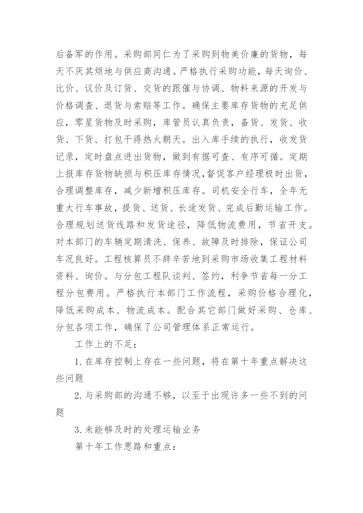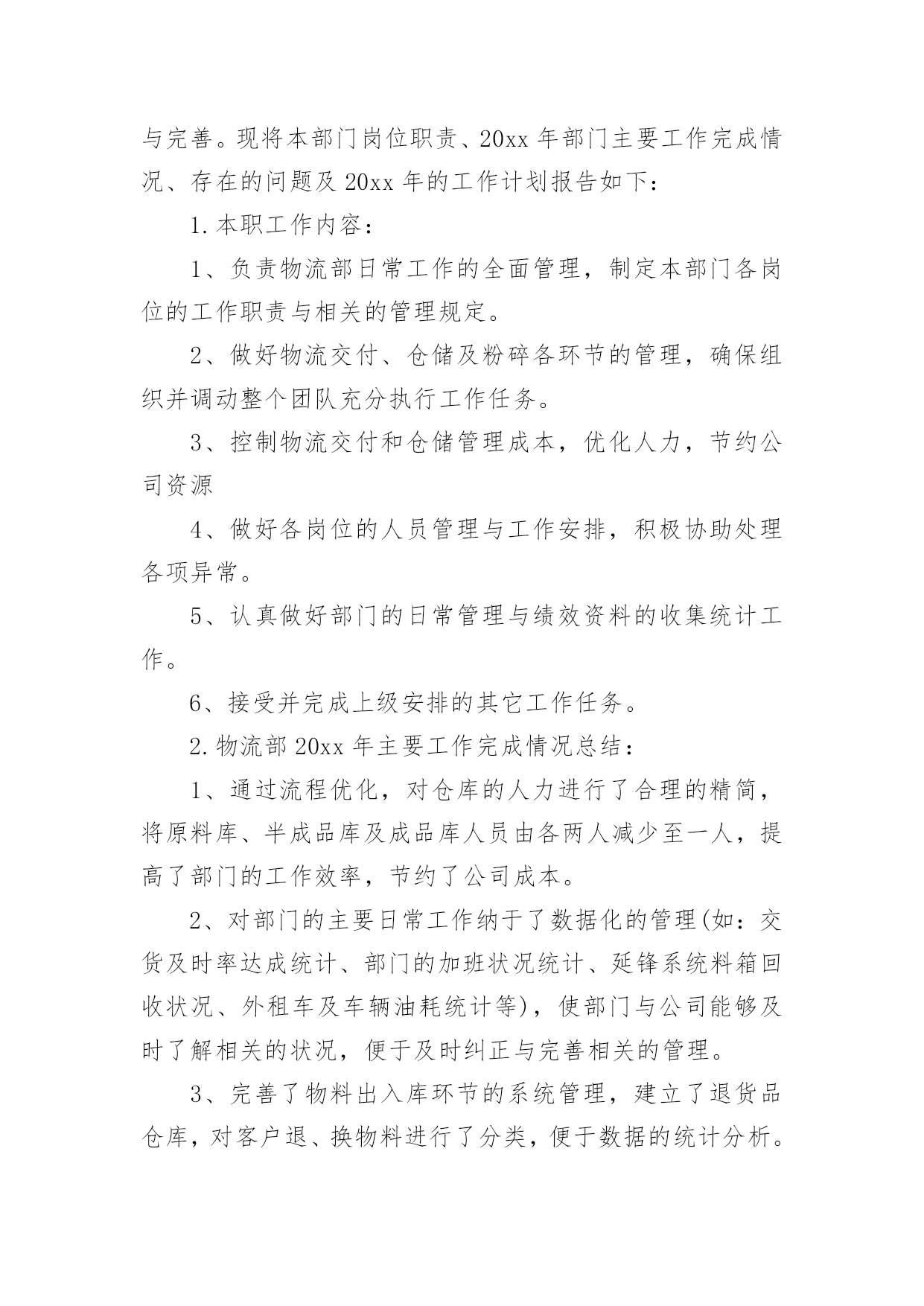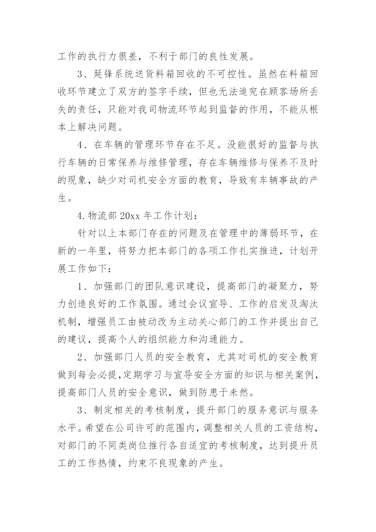 物流部的工作总结总结就是把一个时段的学习、工作或其完成情况进行一次全面系统的总结,它在我们的学习、工作中起到呈上启下的作用,快快来写一份总结吧。如何把总结做到重点突出呢?以下是小编为大家收集的物流部的工作总结,仅供参考,希望能够帮助到大家。物流部的工作总结1告别20xx年,迎来20xx,物流管理部全体员工在部门领导的带领下热情高涨,斗志昂扬,完美收官的同时部署了节后工作安排,制定了保障计划,确保20xx年“开门红”!一、员工关怀为激励全体员工,确保完美收官,在寒冷的天气里为员工送上一份温暖;部门领导组织管理人员开展节前民主座谈会,倾听员工的心声,为员工解决生活中、工作中的困难。下班后,还到员工宿舍以及就近员工家庭进行节前慰问,并送上真挚新年祝福语;“开心工作,快乐生活”,管理人员面带微笑服务团队,处处透着一家人的温馨。回首20xx年,我们不畏艰难,一起奋斗,共同拼搏,物流管理部发展稳中求进。这其中离不开员工无私奉献和辛勤耕耘,更离不开领导们的高瞻远瞩和正确决策。物流管理部于20xx年1月24日召开了20xx年年度表彰大会,为一年里表现优异的个人集团的进行表彰。新年一始,部门管理团队早早的迎接家人的归来,为大家送上新年祝福!二、“完美收官”及“开门红”组织保障为保障节前完美收官,节后开门红,物流管理部组织内部专项保障会议,制定了详细了详尽的工作安排,事无巨细,责任到人,确保一切井然有序。三、复产及人力出勤情况总结通过精心组织,20xx年再首日生产保障,质量保障、设备运行等版块均实现“开门红”;1、首日出勤89%;2、首日质量、设备、物料“0”停线20xx年,我们已经在路上,部门围绕“效率、效益”为经营管理目标,在总结20xx年工作的基础上进行全面优化,保障20xx年经营目标,展望20xx年,物流管理部将不惧艰难险阻,全面推进改革,推进实施信息化、简易自动化技术,完善物流基础设施,不断扩充人才梯队建设;20xx年物流管理部将在公司各级领导的引领下,快马加鞭,坚定必胜信心,保持战略定力,全面完成我部20xx年各项任务,打造精细化物流,为企业又好又快的发展做出我们应有的贡献!物流部的工作总结2公司各位同仁:大家好!时光荏苒,第十年很快就要过去,回首过去一年,内心不禁感慨万千。经过又一年的物流管理工作,公司的物流工作已进入了稳步发展阶段,同时自己在物流管理方面的能力也得到了锻炼与提高。我部门在公司的领导下,顺利的完成了全年原材料运输、产品陪送任务和业务外包,这和全部门员工的努力配合密切相关。物流部门主要工作内容:负责公司原材料的日常运输、原材料的保管以及入库、出库管理和半成品的陪送。负责公司销售货物的发送运输工作。部门工作宗旨:团结合作积极配合支持前台热情工作物流部工作重要性:我部门的工作任重道远,承担着与公司成本密切相关的几大类业务,物流、仓储,陪送已成为公司成本管理的重要一部份,成本犹如“冰山”一角,公司好比一艘航行在大海中的“油轮”。“冰山”露出来的只是一小部份,看不见的大部份是埋藏在海底,埋藏的“冰山”直接影响到“油轮”的沉浮。采购价格合理化,降低采购成本、物流成本、业务分包成本将是一项重要任务。合理规划采购,确保主要库存货物的充足供应,满足零星货物及时采购,降低缺货风险。采购商品质量好坏直接决定了本企业工程质量好坏。采购是企业和资源市场的关系接口,是企业外部供应链的操作点。物流采购是企业科学管理的开端。配合、支持:积极全力支持前台部门各项工作,从采购发货送货寻找物流公司签定业务外包包合同,认真完成前台部门所需每项工作,哪里有需要哪里就有我们,充分发挥了后备军的作用。采购部同仁为了采购到物美价廉的货物,每天不厌其烦地与供应商沟通。严格执行采购功能,每天询价、比价、议价及订货、交货的跟催与协调、物料来源的开发与价格调查、退货与索赔等工作。确保主要库存货物的充足供应,零星货物及时采购,库管员认真负责,备货、发货、收货、下货、打包干得热火朝天。出入库手续的执行,收发货记录,定时盘点进出货物,做到有据可查、有序可循。定期上报库存货物缺损与积压库存情况,督促客户经理极时出货,合理调整库存,减少新增积压库存。司机安全行车,全年无重大行车事故,提货、送货、长途发货、完成后勤运输工作。合理规划送货线路和发货途径,降低物流费用,节省开支。对本部门的车辆定期清洗、保养、故障及时排除,保证公司车况良好。工程核算员不辞辛苦地到采购市场收集工程材料资料、询价。与分包工程队谈判、签约,利争节省每一分工程分包费用。严格执行本部门工作流程,采购价格合理化,降低采购成本、物流成本。配合其它部门做好采购、仓库、分包各项工作,确保了公司管理体系正常运行。工作上的不足:1.在库存控制上存在一些问题,将在第十年重点解决这些问题2.与采购部的沟通不够,以至于出现许多一