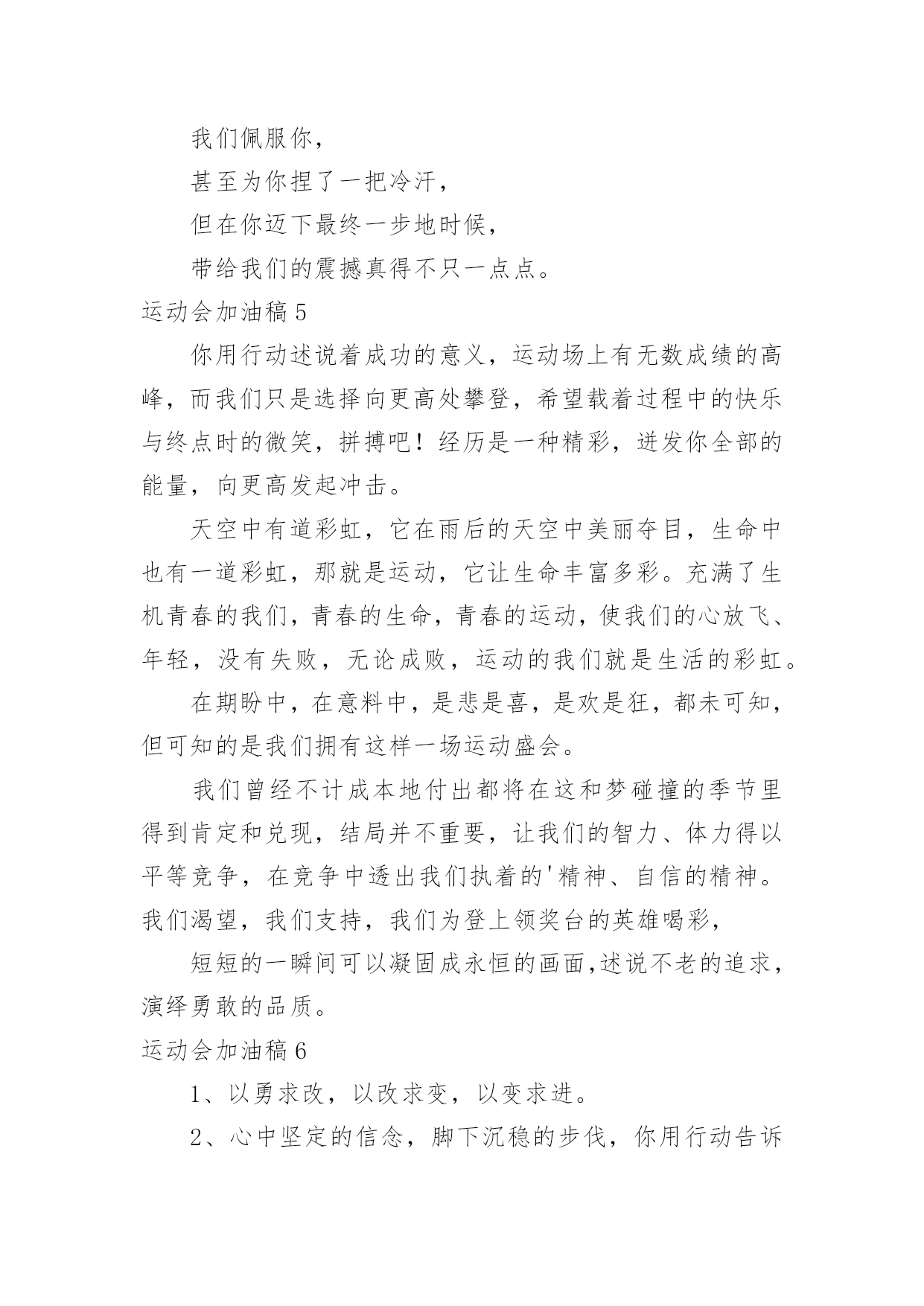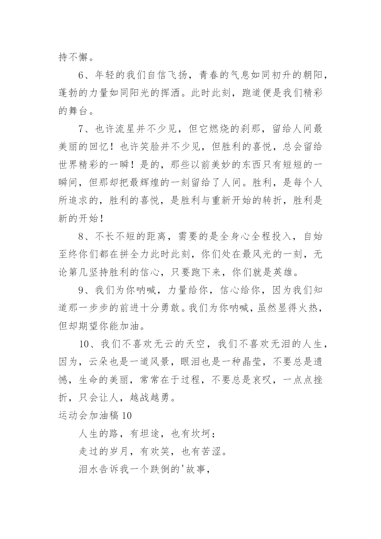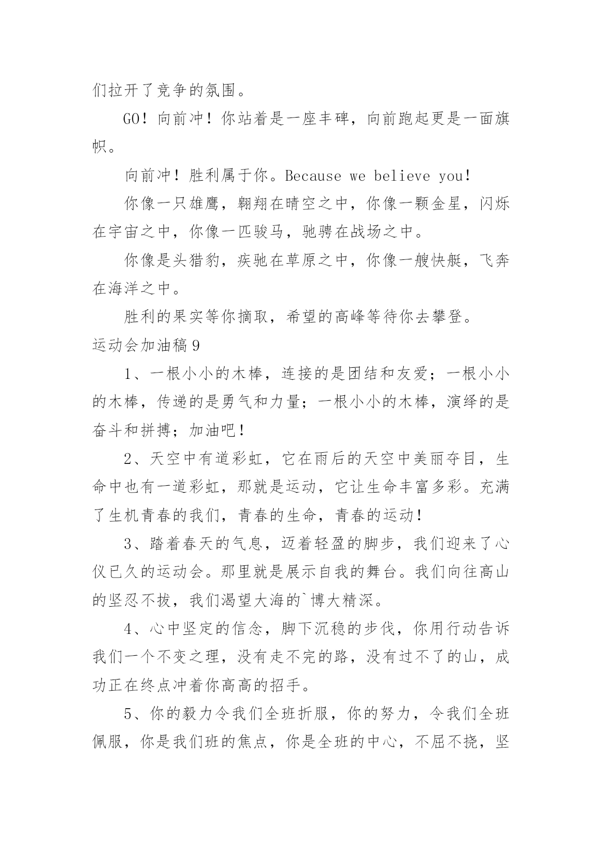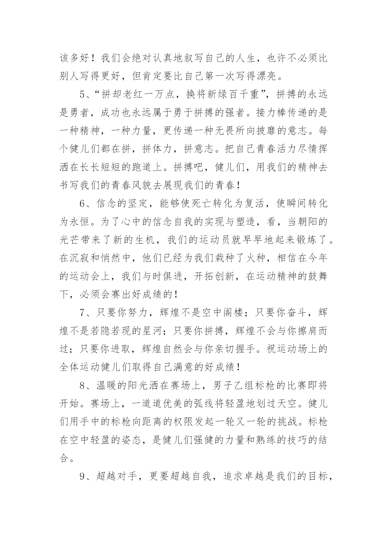 运动会加油稿运动会加油稿在不断进步的社会中,能够利用到加油稿的场合越来越多,借助加油稿可以激起人的希望,催人奋进。你所见过的加油稿是什么样的呢?下面是小编帮大家整理的运动会加油稿,欢迎大家分享。运动会加油稿11、青春在飞扬,个性在张扬,运动场上的运动健儿们,拿出你们的热情,拿出你们的自信,让运动展现你们的风采吧!伴随着激动人心的音乐,你的心必须在跳跃着。让行动证明你们的魅力吧!我们永远支持你们,无论成败,无论结果如何,你们始终是我们心中的英雄。2、那轻盈的步伐似飞鸟的翅膀,那清脆的枪声响彻天际,它粲然升起那跃动的渴望,起跑加速超越冲刺,一步一步延向胜利的曙光。3、运动员们,你们就像一只飞鸟一样,为自己的目标而不放弃任何一点希望。在这么闷热的`时候,在这么激动的时刻,我们为你们而欢呼,你们是最棒的,要相信自己,不管结果如何,只要你们努力拼搏,努力为自己的目标而奋斗,我们相信,胜利的结果永远属于你们,努力地向前冲吧!4、真的,人生要是能有一个草稿,能再誊写一次,那该多好!我们会绝对认真地叙写自己的人生,也许不必须比别人写得更好,但肯定要比自己第一次写得漂亮。5、“拼却老红一万点,换将新绿百千重”,拼搏的永远是勇者,成功也永远属于勇于拼搏的强者。接力棒传递的是一种精神,一种力量,更传递一种无畏所向披靡的意志。每个健儿们都在拼,拼体力,拼意志。把自己青春活力尽情挥洒在长长短短的跑道上。拼搏吧,健儿们,用我们的精神去书写我们的青春风貌去展现我们的青春!6、信念的坚定,能够使死亡转化为复活,使瞬间转化为永恒。为了心中的信念自我的实现与塑造,看,当朝阳的光芒带来了新的生机,我们的运动员就早早地起来锻炼了。在沉寂和悄然中,他们已经为我们栽种了火种,相信在今年的运动会上,我们与时俱进,开拓创新,在运动精神的鼓舞下,必须会赛出好成绩的!7、只要你努力,辉煌不是空中阁楼;只要你奋斗,辉煌不是若隐若现的星河;只要你拼搏,辉煌不会与你擦肩而过;只要你进取,辉煌自然会与你亲切握手。祝运动场上的全体运动健儿们取得自己满意的好成绩!8、温暖的阳光洒在赛场上,男子乙组标枪的比赛即将开始。赛场上,一道道优美的弧线将轻盈地划过天空。健儿们用手中的标枪向距离的权限发起一轮又一轮的挑战。标枪在空中轻盈的姿态,是健儿们强健的力量和熟练的技巧的结合。9、超越对手,更要超越自我,追求卓越是我们的目标,是我们的信念,在清爽的秋季,在喧嚣的赛场,你们点燃了似火的热情,无论成败,你们永远是我们的骄傲,我们都为你们感到自豪!运动会加油稿21、致100米运动员运动场上有你们的步伐,那是辛苦汗水的抒发,你就像天边的云端,有彩霞的绚丽色彩。奔驰的骏马,飞奔的步伐让你的胜利在前方等待。2、为你们祝福,为你们喝彩!致运动员某一天,醒在梦的旁边;手指间,光线有些特别;我看得见,看见光在变,变成七彩的寓言,飞向梦的起点。3、某一天,飞奔在跑道间;两腮间,汗水不断流出;我感觉到,感觉你在变,变成生活的强者,奔向成功的边缘!虽然,天阴沉沉的,虽然,有些隐隐的寒意。但是,每个人都昂首向前,每个人都精神焕发,每个人都向着终点向着胜利冲去!4、运动员们,你们是我们的骄傲,我们,为你们加油!为你们欢呼!为你们喝彩!以你们为荣!你们永远是体育宝座上灿烂夺目的珍珠,你们是在蓝天中展翅飞翔的雏鹰。茫茫中,胜利永远属于你。加油!5、不要怕失败,不要怕冷落,无论何时,我们以你为荣,为你们骄傲!致运动员一千五百米是时间的磨练,是毅力的考验。虽然前途茫茫,但只要努力,总会胜利到达成功的彼岸。运动员们,不要因为前途茫茫而灰心丧气,不要因为成绩不理想而放弃自己。6、风行天下你没有忘记,把闪亮的`青春飞扬,你没有忘记,把身姿驰向胜利的方向,风一样的驰骋,风一样的纵横,不要轻言放弃,因为我们已为青春宣誓——风行天下!7、致运动员你是跑道上划过的流星,燃烧自己,洒下光辉,也许你并没有看到成功像你挥手,但你已奋斗拼搏过,相信自己,力量就在心中。8、风雨中洒脱你的激情,阳光下释放你的希冀,没有你过去的过去,只有把握现在,没有你明天的明天,只有眼前的路。逝去的已经逝去,要明白,今天的才是真正的你,用你的真实,你的所有,挥洒出心中的希望。运动会加油稿3前一轮的准备已经结束,下一轮的激烈竞争已经开始。在我们的花样年华中,你们磨砺锻造了自己,就是全世界最好的;你们不畏强敌,展示了自己,就是最勇敢最有魄力的!人不是为了失败而生,但也不是为了成功而存活,只要你有一颗不断进取的心,你就是最优秀的。挑战就在眼前,在运动会开幕的前一天,谨代表全体支持体育运动的同学和老师们对全体为运动会而付出的同学们道一声:你们辛苦了!我们跃过春天的原野,我们迎过秋天的落叶,我们穿过弯曲的小巷,我们跑过宽阔的大街,每天早起和朝霞,每天傍晚把晚霞采撷,今天我们要飞过银