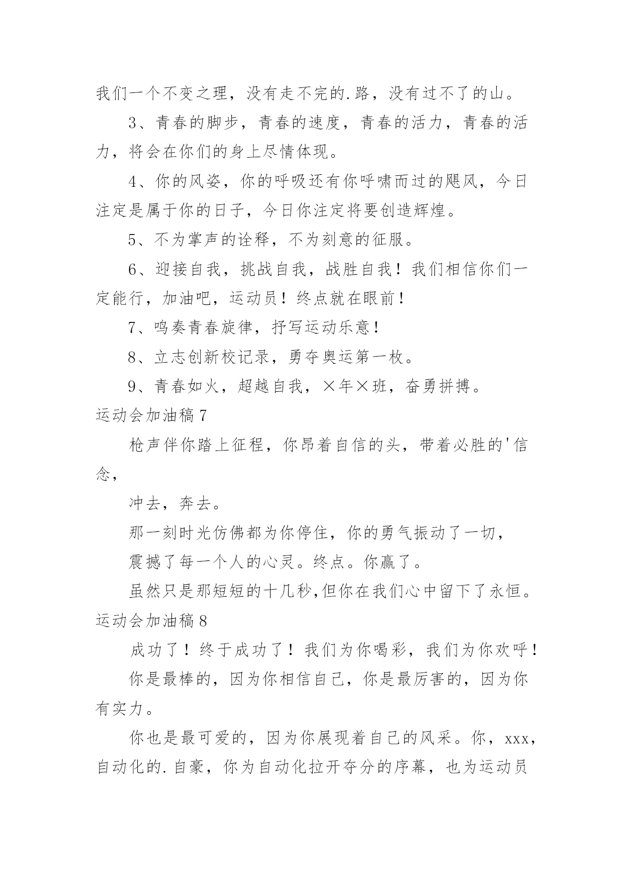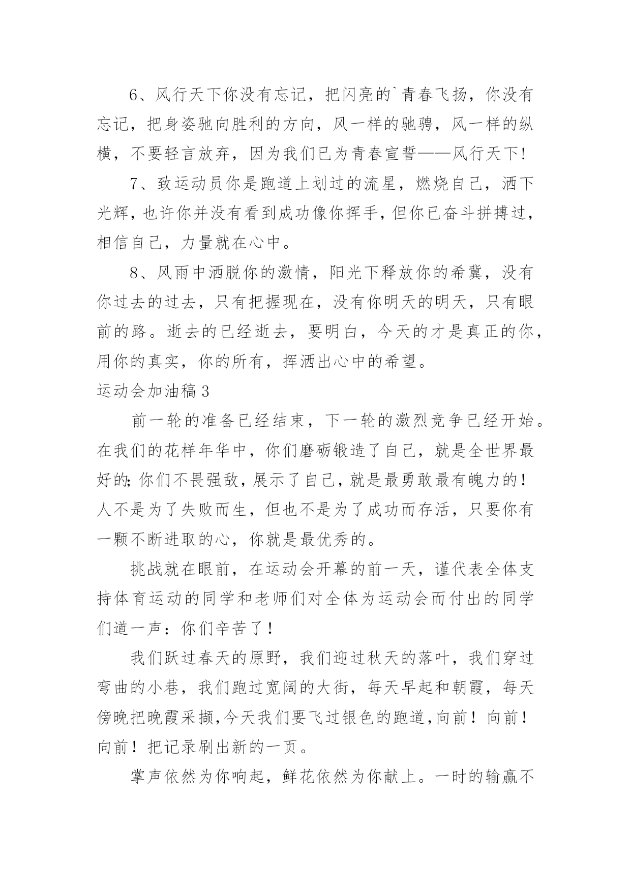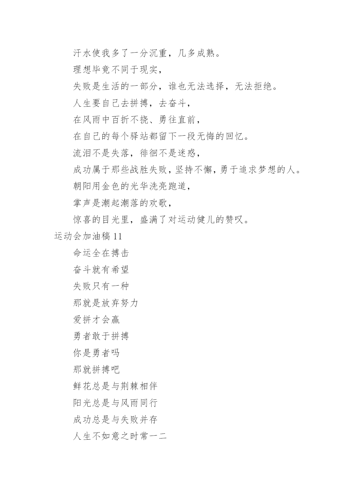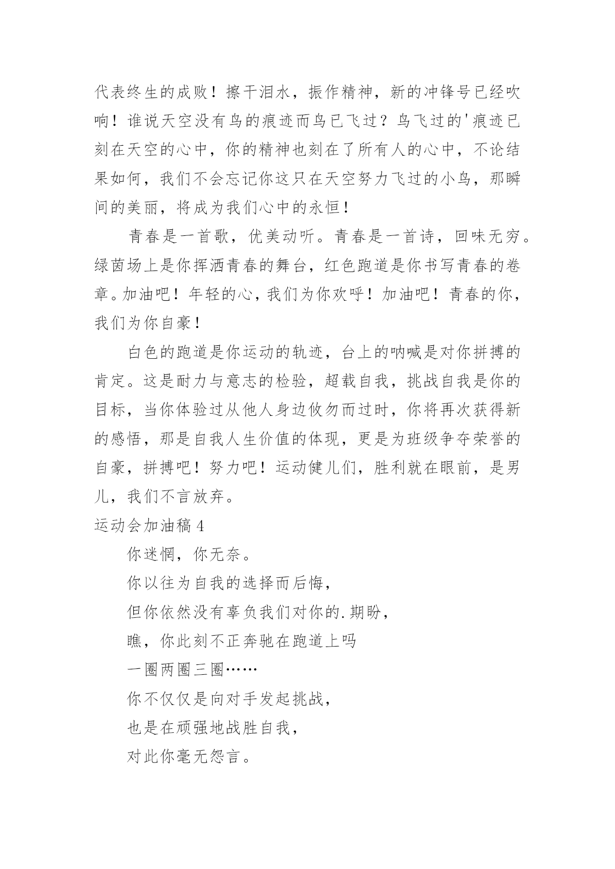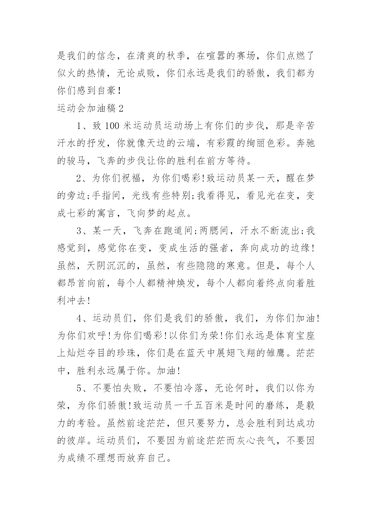运动会加油稿运动会加油稿在不断进步的社会中,能够利用到加油稿的场合越来越多,借助加油稿可以激起人的希望,催人奋进。你所见过的加油稿是什么样的呢?下面是小编帮大家整理的运动会加油稿,欢迎大家分享。运动会加油稿11、青春在飞扬,个性在张扬,运动场上的运动健儿们,拿出你们的热情,拿出你们的自信,让运动展现你们的风采吧!伴随着激动人心的音乐,你的心必须在跳跃着。让行动证明你们的魅力吧!我们永远支持你们,无论成败,无论结果如何,你们始终是我们心中的英雄。2、那轻盈的步伐似飞鸟的翅膀,那清脆的枪声响彻天际,它粲然升起那跃动的渴望,起跑加速超越冲刺,一步一步延向胜利的曙光。3、运动员们,你们就像一只飞鸟一样,为自己的目标而不放弃任何一点希望。在这么闷热的`时候,在这么激动的时刻,我们为你们而欢呼,你们是最棒的,要相信自己,不管结果如何,只要你们努力拼搏,努力为自己的目标而奋斗,我们相信,胜利的结果永远属于你们,努力地向前冲吧!4、真的,人生要是能有一个草稿,能再誊写一次,那该多好!我们会绝对认真地叙写自己的人生,也许不必须比别人写得更好,但肯定要比自己第一次写得漂亮。5、“拼却老红一万点,换将新绿百千重”,拼搏的永远是勇者,成功也永远属于勇于拼搏的强者。接力棒传递的是一种精神,一种力量,更传递一种无畏所向披靡的意志。每个健儿们都在拼,拼体力,拼意志。把自己青春活力尽情挥洒在长长短短的跑道上。拼搏吧,健儿们,用我们的精神去书写我们的青春风貌去展现我们的青春!6、信念的坚定,能够使死亡转化为复活,使瞬间转化为永恒。为了心中的信念自我的实现与塑造,看,当朝阳的光芒带来了新的生机,我们的运动员就早早地起来锻炼了。在沉寂和悄然中,他们已经为我们栽种了火种,相信在今年的运动会上,我们与时俱进,开拓创新,在运动精神的鼓舞下,必须会赛出好成绩的!7、只要你努力,辉煌不是空中阁楼;只要你奋斗,辉煌不是若隐若现的星河;只要你拼搏,辉煌不会与你擦肩而过;只要你进取,辉煌自然会与你亲切握手。祝运动场上的全体运动健儿们取得自己满意的好成绩!8、温暖的阳光洒在赛场上,男子乙组标枪的比赛即将开始。赛场上,一道道优美的弧线将轻盈地划过天空。健儿们用手中的标枪向距离的权限发起一轮又一轮的挑战。标枪在空中轻盈的姿态,是健儿们强健的力量和熟练的技巧的结合。9、超越对手,更要超越自我,追求卓越是我们的目标,是我们的信念,在清爽的秋季,在喧嚣的赛场,你们点燃了似火的热情,无论成败,你们永远是我们的骄傲,我们都为你们感到自豪!运动会加油稿21、致100米运动员运动场上有你们的步伐,那是辛苦汗水的抒发,你就像天边的云端,有彩霞的绚丽色彩。奔驰的骏马,飞奔的步伐让你的胜利在前方等待。2、为你们祝福,为你们喝彩!致运动员某一天,醒在梦的旁边;手指间,光线有些特别;我看得见,看见光在变,变成七彩的寓言,飞向梦的起点。3、某一天,飞奔在跑道间;两腮间,汗水不断流出;我感觉到,感觉你在变,变成生活的强者,奔向成功的边缘!虽然,天阴沉沉的,虽然,有些隐隐的寒意。但是,每个人都昂首向前,每个人都精神焕发,每个人都向着终点向着胜利冲去!4、运动员们,你们是我们的骄傲,我们,为你们加油!为你们欢呼!为你们喝彩!以你们为荣!你们永远是体育宝座上灿烂夺目的珍珠,你们是在蓝天中展翅飞翔的雏鹰。茫茫中,胜利永远属于你。加油!5、不要怕失败,不要怕冷落,无论何时,我们以你为荣,为你们骄傲!致运动员一千五百米是时间的磨练,是毅力的考验。虽然前途茫茫,但只要努力,总会胜利到达成功的彼岸。运动员们,不要因为前途茫茫而灰心丧气,不要因为成绩不理想而放弃自己。6、风行天下你没有忘记,把闪亮的`青春飞扬,你没有忘记,把身姿驰向胜利的方向,风一样的驰骋,风一样的纵横,不要轻言放弃,因为我们已为青春宣誓——风行天下!7、致运动员你是跑道上划过的流星,燃烧自己,洒下光辉,也许你并没有看到成功像你挥手,但你已奋斗拼搏过,相信自己,力量就在心中。8、风雨中洒脱你的激情,阳光下释放你的希冀,没有你过去的过去,只有把握现在,没有你明天的明天,只有眼前的路。逝去的已经逝去,要明白,今天的才是真正的你,用你的真实,你的所有,挥洒出心中的希望。运动会加油稿3前一轮的准备已经结束,下一轮的激烈竞争已经开始。在我们的花样年华中,你们磨砺锻造了自己,就是全世界最好的;你们不畏强敌,展示了自己,就是最勇敢最有魄力的!人不是为了失败而生,但也不是为了成功而存活,只要你有一颗不断进取的心,你就是最优秀的。挑战就在眼前,在运动会开幕的前一天,谨代表全体支持体育运动的同学和老师们对全体为运动会而付出的同学们道一声:你们辛苦了!我们跃过春天的原野,我们迎过秋天的落叶,我们穿过弯曲的小巷,我们跑过宽阔的大街,每天早起和朝霞,每天傍晚把晚霞采撷,今天我们要飞过银