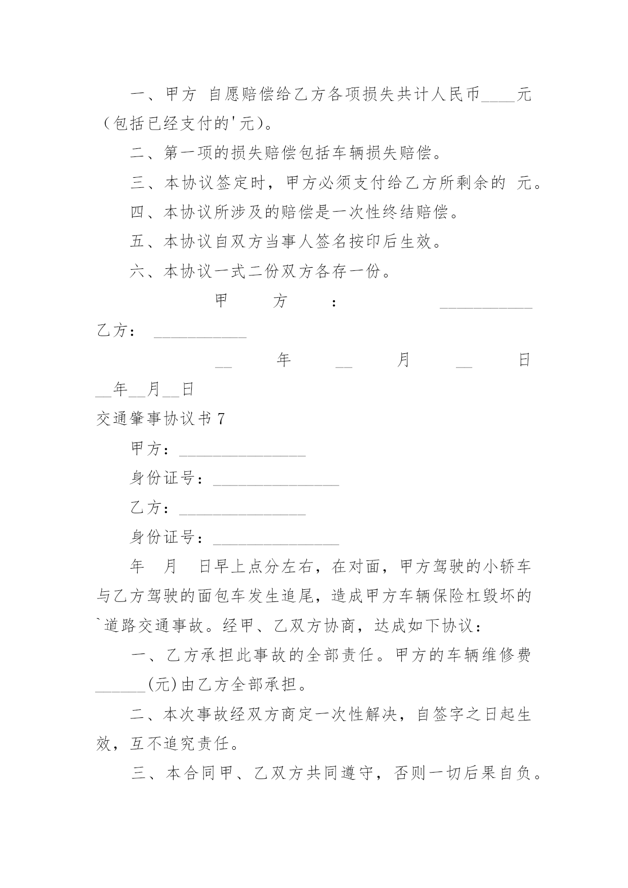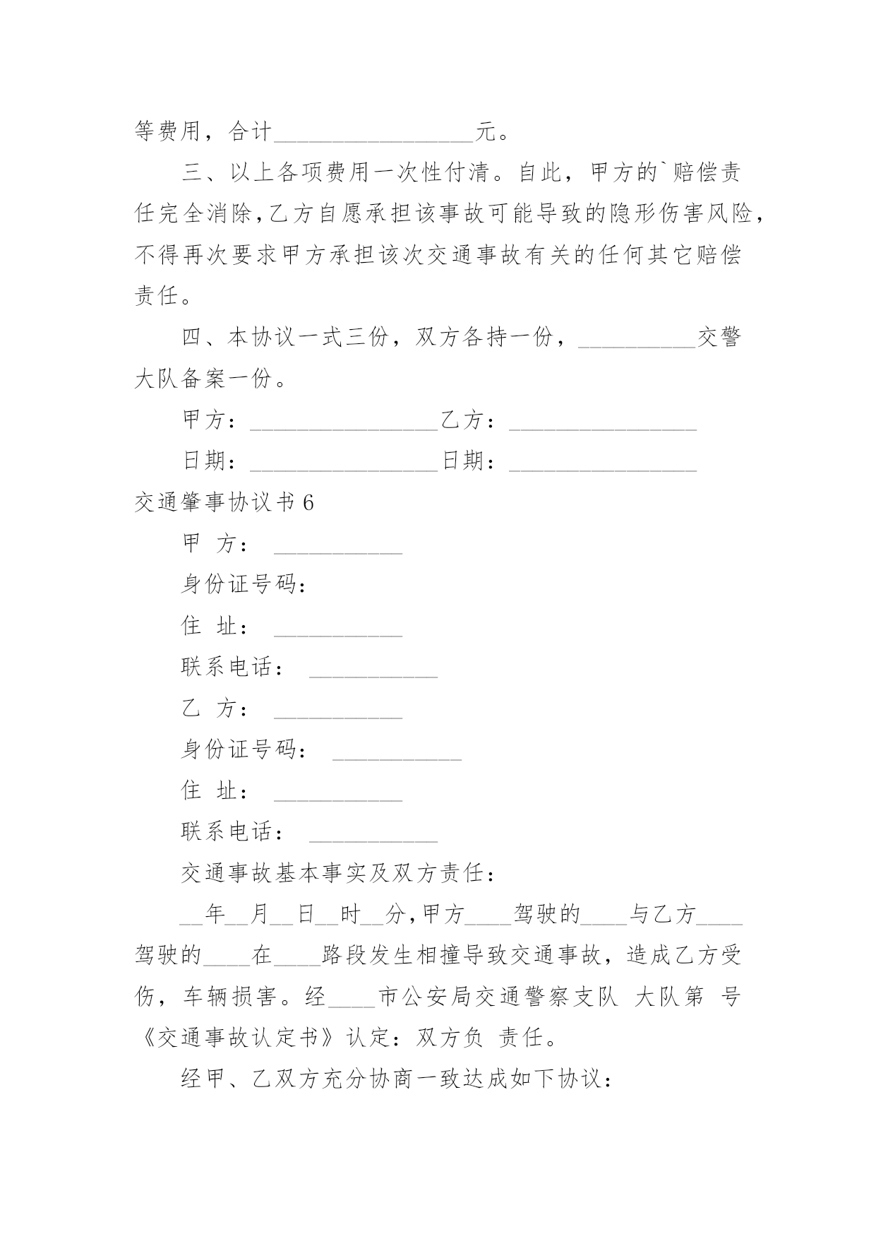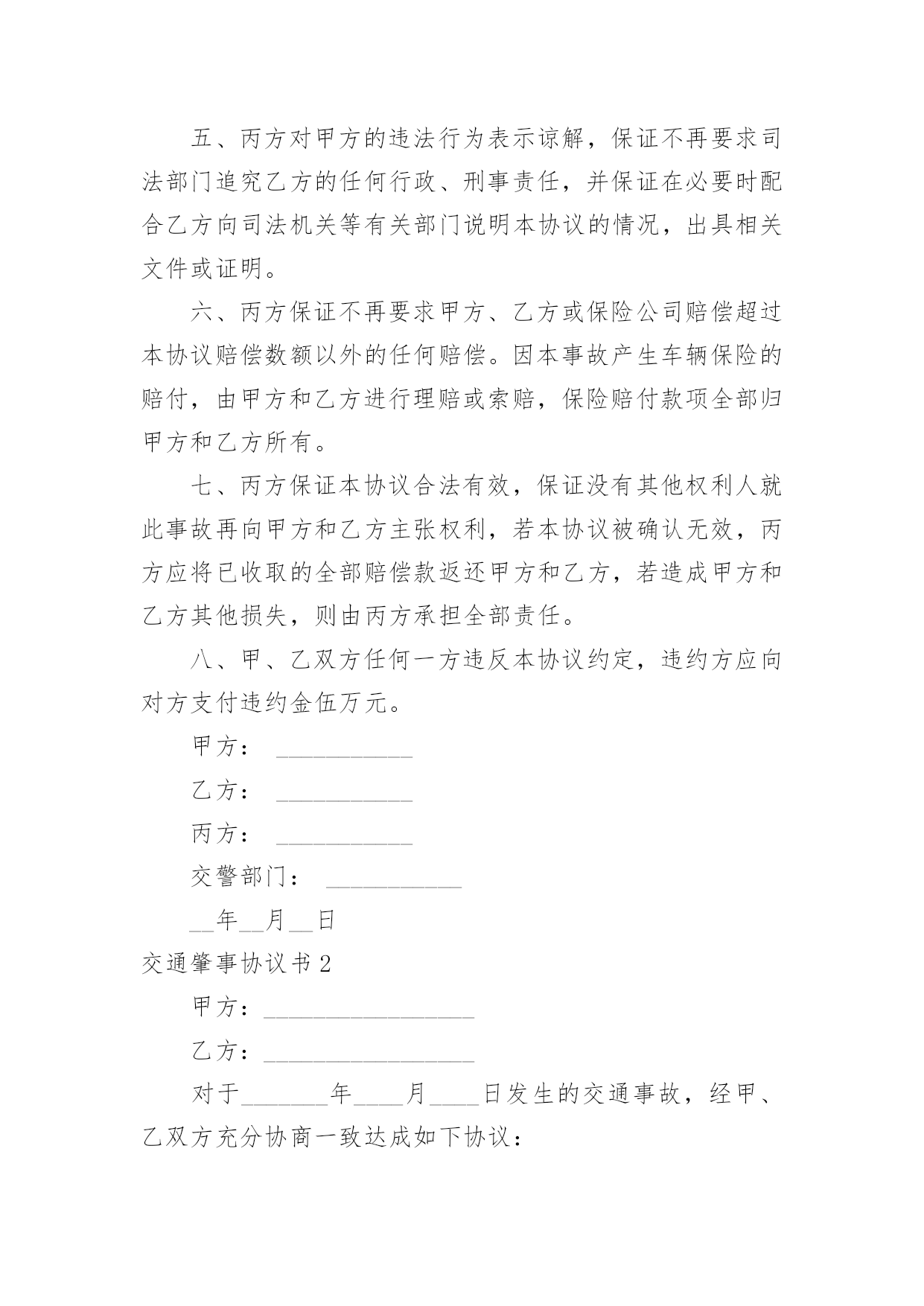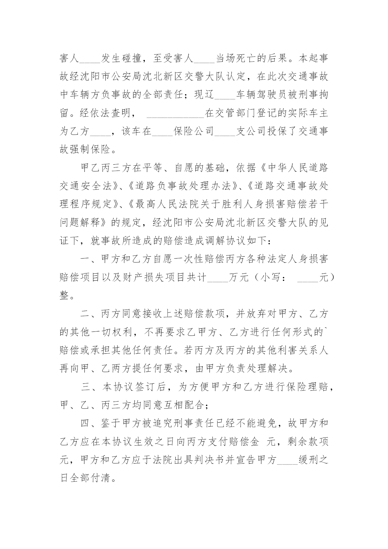 交通肇事协议书交通肇事协议书现如今,用到协议的地方越来越多,签订协议可以保障自身的权益不被侵害。想写协议却不知道该请教谁?以下是小编为大家收集的交通肇事协议书,仅供参考,希望能够帮助到大家。交通肇事协议书1甲方(赔偿义务人):姓名___________、性别___________、年龄___________、住址___________、身份证号码___________,工作单位___________,系辽___________车辆驾驶员乙方(赔偿义务人):姓名___________、性别___________、年龄___________、住址___________、身份证号码___________,工作单位___________,系辽___________登记车主丙方(赔偿权利人):姓名___________、性别___________、年龄______、住址___________、身份证号码___________,工作单位___________,系受害人___________(包括配偶、父母、子女)____年____月____日,甲方___________驾驶___________号____牌轿车行驶至____路段____公里处与受害人____发生碰撞,至受害人____当场死亡的后果。本起事故经沈阳市公安局沈北新区交警大队认定,在此次交通事故中车辆方负事故的全部责任;现辽____车辆驾驶员被刑事拘留。经依法查明,___________在交管部门登记的实际车主为乙方____,该车在____保险公司____支公司投保了交通事故强制保险。甲乙丙三方在平等、自愿的基础,依据《中华人民道路交通安全法》、《道路负事故处理办法》、《道路交通事故处理程序规定》、《最高人民法院关于胜利人身损害赔偿若干问题解释》的规定,经沈阳市公安局沈北新区交警大队的见证下,就事故所造成的赔偿造成调解协议如下:一、甲方和乙方自愿一次性赔偿丙方各种法定人身损害赔偿项目以及财产损失项目共计____万元(小写:____元)整。二、丙方同意接收上述赔偿款项,并放弃对甲方、乙方的其他一切权利,不再要求乙甲方、乙方进行任何形式的`赔偿或承担其他任何责任。若丙方及丙方的其他利害关系人再向甲、乙两方提任何要求,由甲方负责处理解决。三、本协议签订后,为方便甲方和乙方进行保险理赔,甲、乙、丙三方均同意互相配合;四、鉴于甲方被追究刑事责任已经不能避免,故甲方和乙方应在本协议生效之日向丙方支付赔偿金元,剩余款项元,甲方和乙方应于法院出具判决书并宣告甲方____缓刑之日全部付清。五、丙方对甲方的违法行为表示谅解,保证不再要求司法部门追究乙方的任何行政、刑事责任,并保证在必要时配合乙方向司法机关等有关部门说明本协议的情况,出具相关文件或证明。六、丙方保证不再要求甲方、乙方或保险公司赔偿超过本协议赔偿数额以外的任何赔偿。因本事故产生车辆保险的赔付,由甲方和乙方进行理赔或索赔,保险赔付款项全部归甲方和乙方所有。七、丙方保证本协议合法有效,保证没有其他权利人就此事故再向甲方和乙方主张权利,若本协议被确认无效,丙方应将已收取的全部赔偿款返还甲方和乙方,若造成甲方和乙方其他损失,则由丙方承担全部责任。八、甲、乙双方任何一方违反本协议约定,违约方应向对方支付违约金伍万元。甲方:___________乙方:___________丙方:___________交警部门:_____________年__月__日交通肇事协议书2甲方:_________________乙方:_________________对于_______年____月____日发生的交通事故,经甲、乙双方充分协商一致达成如下协议:一、甲方自愿赔偿给乙方各项损失共计________元人民币(包括已经支付的_____元)。二、损失赔偿包括乙方的交通费、护理费、误工费、伙食住宿费、被扶养人生活费、后续治疗费、精神损失费、残疾赔偿金等各项损失赔偿。三、本协议签定时,甲方支付乙方________元,余款在乙方配合甲方向保险公司理赔后,支付给乙方。乙方的具体配合工作是指本协议第七条的`约定。乙方不配合甲方工作的,甲方有权拒绝支付剩余款项。四、本协议所涉及的赔偿是一次性终结赔偿,甲方支付乙方费用后,今后乙方不得以任何理由向甲方主张任何权利,甲方不再负有任何赔偿责任。五、本协议签订时,双方均是在自愿的情形下签订的,不存在任何重大误解或显示公平的情形,甲、乙双方不得以任何理由对于协议提出反悔。六、在甲方赔偿乙方后,在甲方向保险公司理赔时,乙方应积极配合甲方和保险公司的工作,内容包括做伤残鉴定、提供所有票据等等,如果因为乙方不配合甲方的工作造成了甲方不能向保险公司理赔时,乙方应当返还相当于保险公司理赔给甲方的金额。七、本协议自双方当事人签字后生效。八、本协