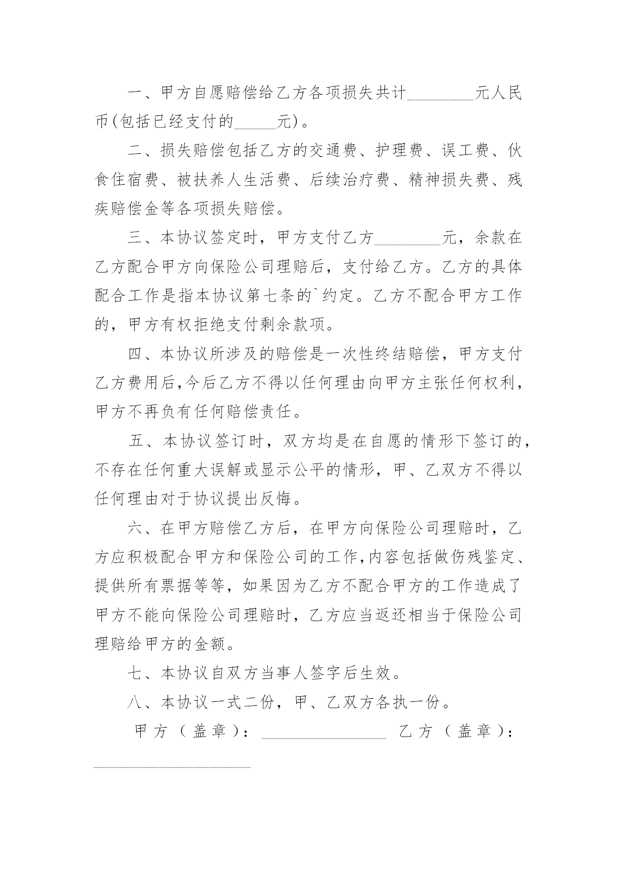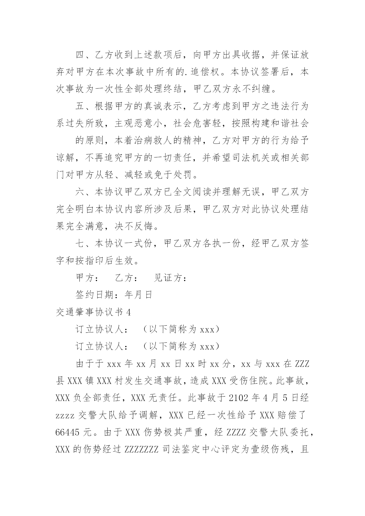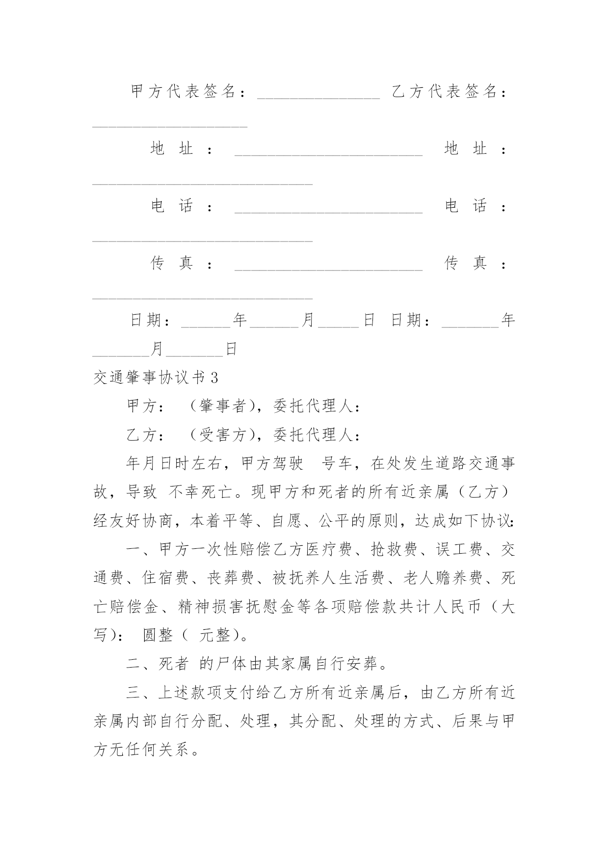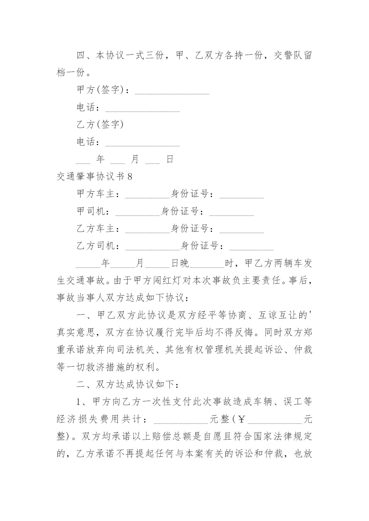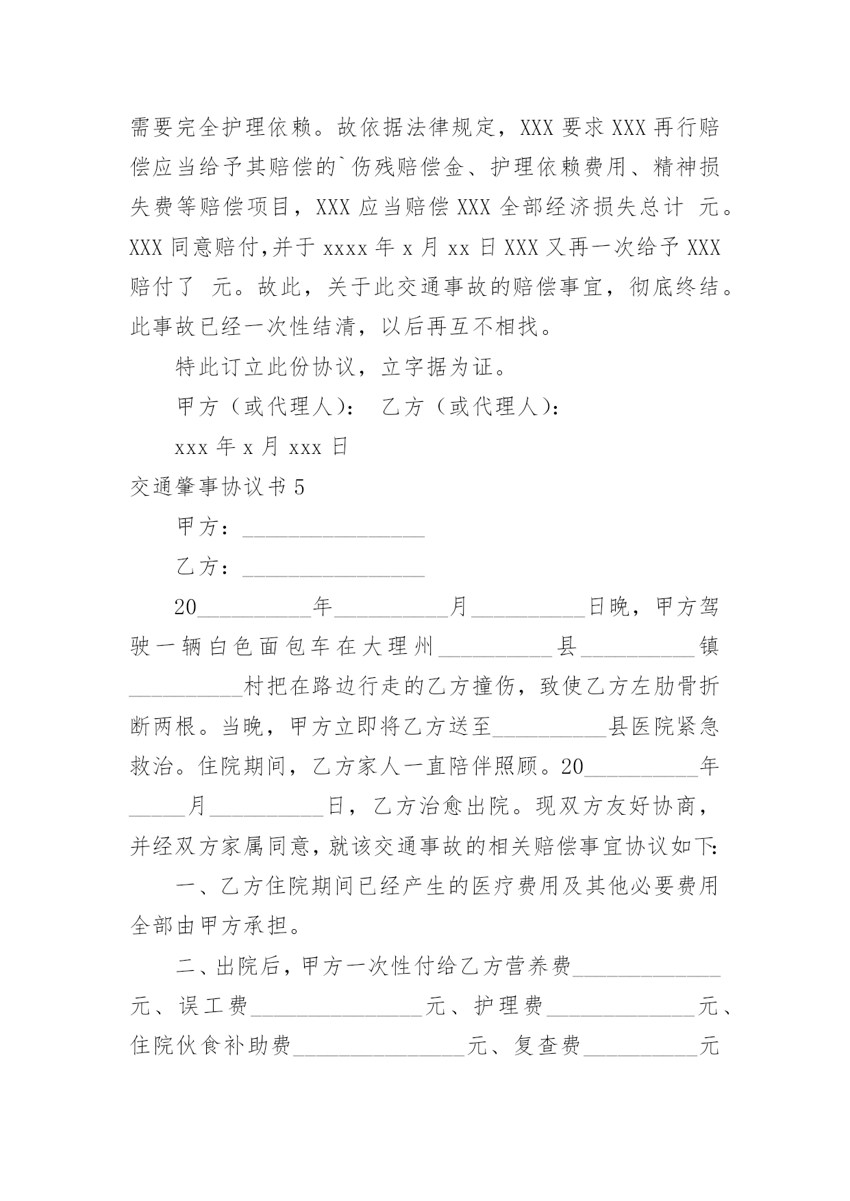 交通肇事协议书交通肇事协议书现如今,用到协议的地方越来越多,签订协议可以保障自身的权益不被侵害。想写协议却不知道该请教谁?以下是小编为大家收集的交通肇事协议书,仅供参考,希望能够帮助到大家。交通肇事协议书1甲方(赔偿义务人):姓名___________、性别___________、年龄___________、住址___________、身份证号码___________,工作单位___________,系辽___________车辆驾驶员乙方(赔偿义务人):姓名___________、性别___________、年龄___________、住址___________、身份证号码___________,工作单位___________,系辽___________登记车主丙方(赔偿权利人):姓名___________、性别___________、年龄______、住址___________、身份证号码___________,工作单位___________,系受害人___________(包括配偶、父母、子女)____年____月____日,甲方___________驾驶___________号____牌轿车行驶至____路段____公里处与受害人____发生碰撞,至受害人____当场死亡的后果。本起事故经沈阳市公安局沈北新区交警大队认定,在此次交通事故中车辆方负事故的全部责任;现辽____车辆驾驶员被刑事拘留。经依法查明,___________在交管部门登记的实际车主为乙方____,该车在____保险公司____支公司投保了交通事故强制保险。甲乙丙三方在平等、自愿的基础,依据《中华人民道路交通安全法》、《道路负事故处理办法》、《道路交通事故处理程序规定》、《最高人民法院关于胜利人身损害赔偿若干问题解释》的规定,经沈阳市公安局沈北新区交警大队的见证下,就事故所造成的赔偿造成调解协议如下:一、甲方和乙方自愿一次性赔偿丙方各种法定人身损害赔偿项目以及财产损失项目共计____万元(小写:____元)整。二、丙方同意接收上述赔偿款项,并放弃对甲方、乙方的其他一切权利,不再要求乙甲方、乙方进行任何形式的`赔偿或承担其他任何责任。若丙方及丙方的其他利害关系人再向甲、乙两方提任何要求,由甲方负责处理解决。三、本协议签订后,为方便甲方和乙方进行保险理赔,甲、乙、丙三方均同意互相配合;四、鉴于甲方被追究刑事责任已经不能避免,故甲方和乙方应在本协议生效之日向丙方支付赔偿金元,剩余款项元,甲方和乙方应于法院出具判决书并宣告甲方____缓刑之日全部付清。五、丙方对甲方的违法行为表示谅解,保证不再要求司法部门追究乙方的任何行政、刑事责任,并保证在必要时配合乙方向司法机关等有关部门说明本协议的情况,出具相关文件或证明。六、丙方保证不再要求甲方、乙方或保险公司赔偿超过本协议赔偿数额以外的任何赔偿。因本事故产生车辆保险的赔付,由甲方和乙方进行理赔或索赔,保险赔付款项全部归甲方和乙方所有。七、丙方保证本协议合法有效,保证没有其他权利人就此事故再向甲方和乙方主张权利,若本协议被确认无效,丙方应将已收取的全部赔偿款返还甲方和乙方,若造成甲方和乙方其他损失,则由丙方承担全部责任。八、甲、乙双方任何一方违反本协议约定,违约方应向对方支付违约金伍万元。甲方:___________乙方:___________丙方:___________交警部门:_____________年__月__日交通肇事协议书2甲方:_________________乙方:_________________对于_______年____月____日发生的交通事故,经甲、乙双方充分协商一致达成如下协议:一、甲方自愿赔偿给乙方各项损失共计________元人民币(包括已经支付的_____元)。二、损失赔偿包括乙方的交通费、护理费、误工费、伙食住宿费、被扶养人生活费、后续治疗费、精神损失费、残疾赔偿金等各项损失赔偿。三、本协议签定时,甲方支付乙方________元,余款在乙方配合甲方向保险公司理赔后,支付给乙方。乙方的具体配合工作是指本协议第七条的`约定。乙方不配合甲方工作的,甲方有权拒绝支付剩余款项。四、本协议所涉及的赔偿是一次性终结赔偿,甲方支付乙方费用后,今后乙方不得以任何理由向甲方主张任何权利,甲方不再负有任何赔偿责任。五、本协议签订时,双方均是在自愿的情形下签订的,不存在任何重大误解或显示公平的情形,甲、乙双方不得以任何理由对于协议提出反悔。六、在甲方赔偿乙方后,在甲方向保险公司理赔时,乙方应积极配合甲方和保险公司的工作,内容包括做伤残鉴定、提供所有票据等等,如果因为乙方不配合甲方的工作造成了甲方不能向保险公司理赔时,乙方应当返还相当于保险公司理赔给甲方的金额。七、本协议自双方当事人签字后生效。八、本协