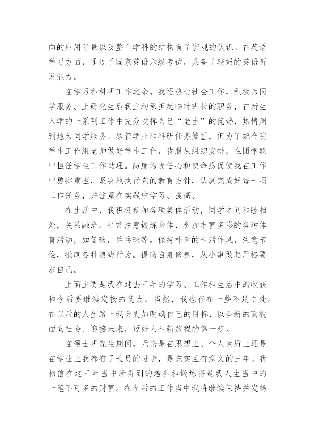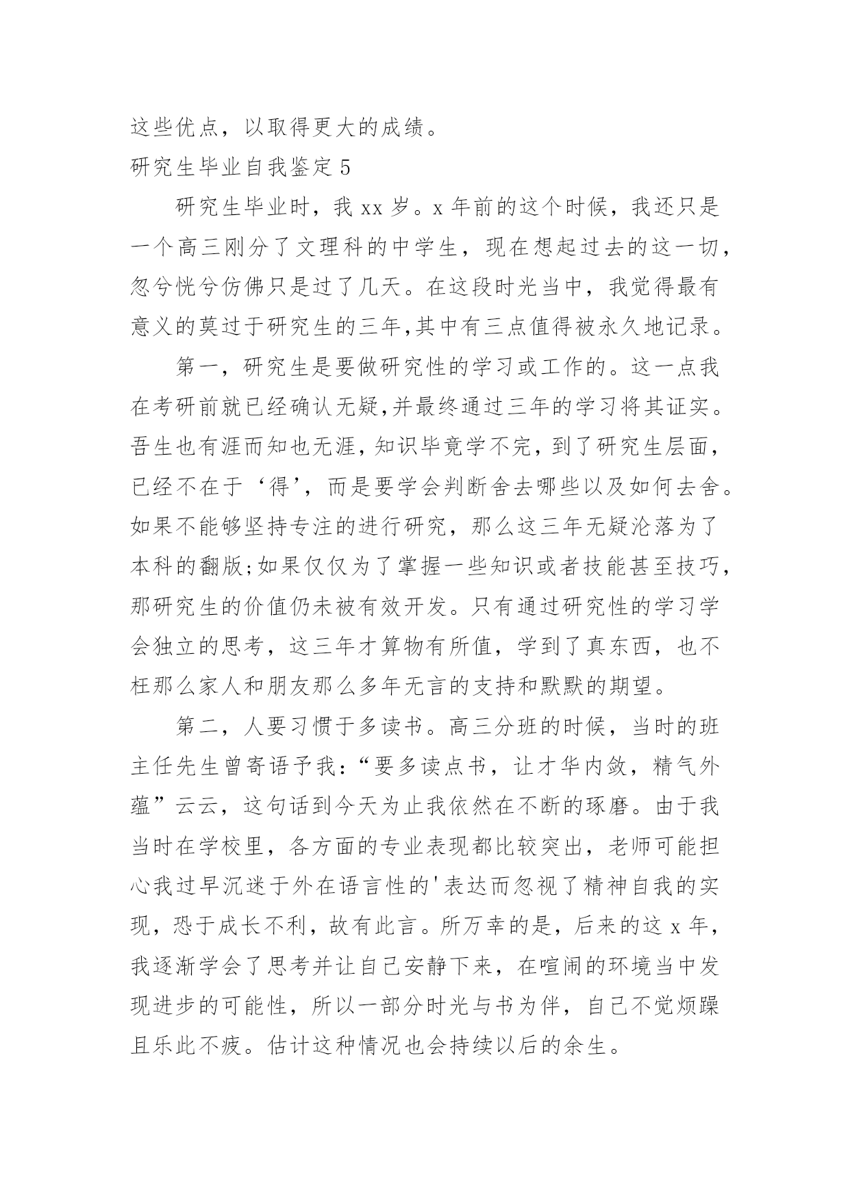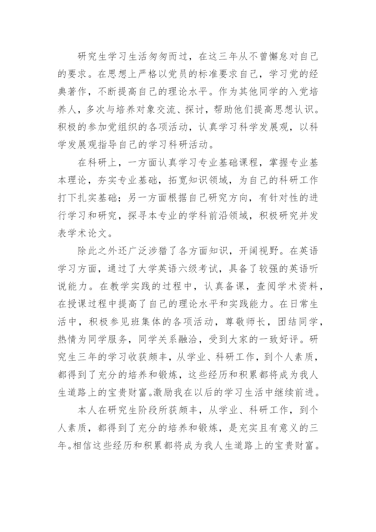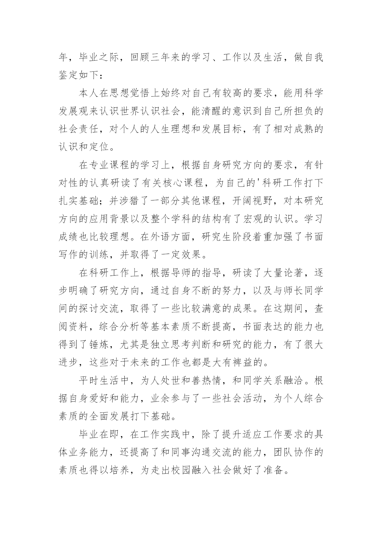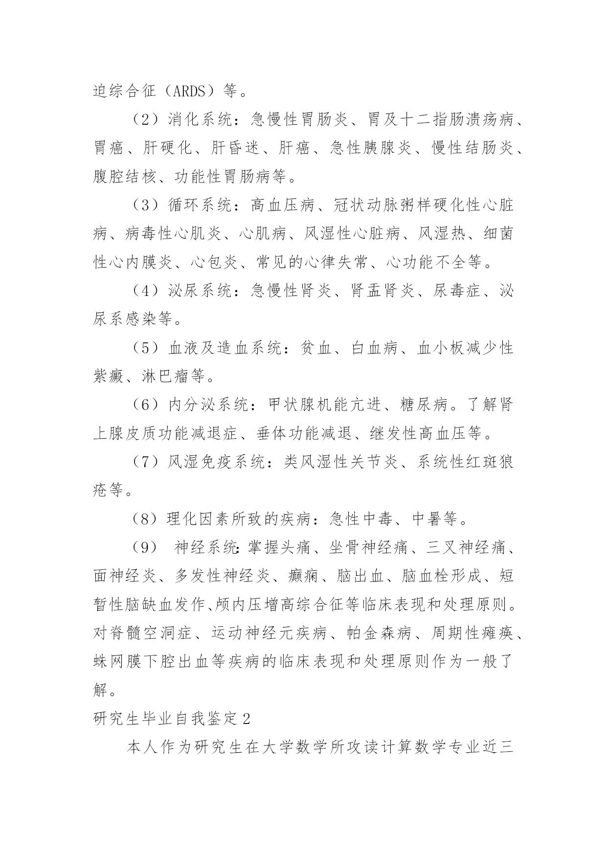 研究生毕业自我鉴定研究生毕业自我鉴定15篇自我鉴定是一个人对某一特定时间段内的学习和工作生活等表现的自我总结,写自我鉴定有利于我们工作能力的提高,不妨坐下来好好写写自我鉴定吧。那么如何把自我鉴定写出新花样呢?以下是小编为大家收集的研究生毕业自我鉴定,欢迎大家借鉴与参考,希望对大家有所帮助。研究生毕业自我鉴定1一、实习目的临床(毕业)实习是医学教育的一个重要阶段,是理论联系实际,进一步学习、巩固医学基础理论知识,熟练基本技能和培养独立工作能力的综合性训练。临床实习,应体现以病人为中心的思想,积极实践生物—心理—社会医学模式,养成良好的医德,树立全心全意为人民服务的思想;熟悉医院工作制度、规则、程序;培养独立分析问题、解决问题的能力;掌握基本诊疗技术;对各科常见病、多发病能够独立地诊治,对较复杂的疾病和急诊也能够判断病情轻重和进行一般处理。实习结束时,达到初级住院医师的要求。二、实习内容(一)、内科学1、病案记录。熟练掌握病史采集。正确、熟练掌握书写病历、病程记录、各种申请单、会诊记录、转科记录、阶段小结、出院记录、死亡报告等医疗文书,要求项目齐全、内容确切、重点突出、字迹清楚整洁;描述要有顺序,医学术语运用得当。能够较准确地下达医嘱和观察病情。2、诊疗技术。(1)熟练掌握各种基本诊疗操作:如测体温、血压、脉搏、呼吸、抽血、输液、物理降温、鼻饲、给氧、吸痰、褥疮护理、青霉素皮试及抗破伤风类毒素皮试等。实习期间,要求每个学员做皮内注射、皮下注射、肌肉注射、静脉注射、静脉穿刺各20次;护送及搬运危重病人,导尿、灌肠、洗胃5~10次。(2)掌握常用的技术操作。实习期间,要求每个学员做腰椎穿刺、胸腔穿刺、骨髓穿刺各3~5次,腹腔穿刺2~3次。熟练掌握插胃管、胃液抽取及十二指肠引流、人工呼吸、胸外心脏挤压及心内注射、某些新疗法等,并能掌握上述技术操作的适应症、禁忌症和并发症的处理。(3)掌握血、尿、粪常规检验方法及临床意义。掌握痰常规,痰培养,出、凝血时间,血沉,大便潜血试验,基础代谢测定,脑脊液常规,胸腹水常规,肝肾功能及血液生化检验标本的采取方法和临床意义,并能正确分析其检验结果;了解胃肠镜、超声检查、脑电图、肌心图、脑血管造影的临床意义。能分析临床常见的心电图改变和常见疾病的X线和CT照片。(4)掌握视、触、扣、听等物理诊断的检查方法。能熟练辨别下列常见体征并掌握其临床意义:呼吸困难、紫绀、语颤增强或减弱、浊音、鼓音、呼吸音增强或减弱、支气管呼吸音、干湿性罗音、胸膜摩擦音、心尖搏动强弱及范围、心界大小、震颤、心脏杂音、肝脾肿大、腹部包块、移动性浊音、肠鸣音增强或减弱等。初步掌握精神检查方法:如知觉、思维、动作、情感、智能、意识障碍等。(5)掌握内科常见症状的分析方法、治疗原则和护理常规;如发热、昏迷、头痛、呕血、便血、呼吸困难、咳嗽及咳痰、紫瘢、紫绀、贫血、黄疸、腹痛、呕吐、腹泻、胸水、腹水、肝脾肿大、腹部包块、水肿等。(6)在指导老师指导下,能诊断和处理常见的.内科急症:如上消化道出血、大咯血、气胸、急性心力衰竭、急性肾功能衰竭、哮喘持续状态、呼吸衰竭、肝昏迷、糖尿病酸中毒昏迷、甲状腺危象、感染中毒性休克、心跳骤停、急性药物中毒等。(7)熟练掌握病区和重症监护病房、门诊的工作制度和对病人的管理方法。熟练掌握门诊病历和厨房的正确书写;基本掌握门诊常见病和多发病的诊断和处理。(8)掌握本科常用药物的药名、作用、剂量、用法、适应症、禁忌症、副作用及中毒的急救。3、重点掌握下列疾病的诊断、鉴别诊断和处理(1)呼吸系统:急慢性支气管炎、支气管哮喘、支气管扩张、肺炎、肺脓肿、阻塞性肺气肿、肺癌、结核性胸膜炎、气胸、肺结核、肺源性心脏病、呼吸衰竭、急性呼吸窘迫综合征(ARDS)等。(2)消化系统:急慢性胃肠炎、胃及十二指肠溃疡病、胃癌、肝硬化、肝昏迷、肝癌、急性胰腺炎、慢性结肠炎、腹腔结核、功能性胃肠病等。(3)循环系统:高血压病、冠状动脉粥样硬化性心脏病、病毒性心肌炎、心肌病、风湿性心脏病、风湿热、细菌性心内膜炎、心包炎、常见的心律失常、心功能不全等。(4)泌尿系统:急慢性肾炎、肾盂肾炎、尿毒症、泌尿系感染等。(5)血液及造血系统:贫血、白血病、血小板减少性紫癜、淋巴瘤等。(6)内分泌系统:甲状腺机能亢进、糖尿病。了解肾上腺皮质功能减退症、垂体功能减退、继发性高血压等。(7)风湿免疫系统:类风湿性关节炎、系统性红斑狼疮等。(8)理化因素所致的疾病:急性中毒、中暑等。(9)神经系统:掌握头痛、坐骨神经痛、三叉神经痛、面神经炎、多发性神经炎、癫痫、脑出血、脑血栓形成、短暂性脑缺血发作、颅内压增高综合征等临床表现和处理原则。对脊髓空洞症、运动神经元疾病、帕金森病、周期性瘫痪、蛛网膜下腔出血等疾病的临床表现和处理原则作为一般了解。研究生毕业自我鉴定