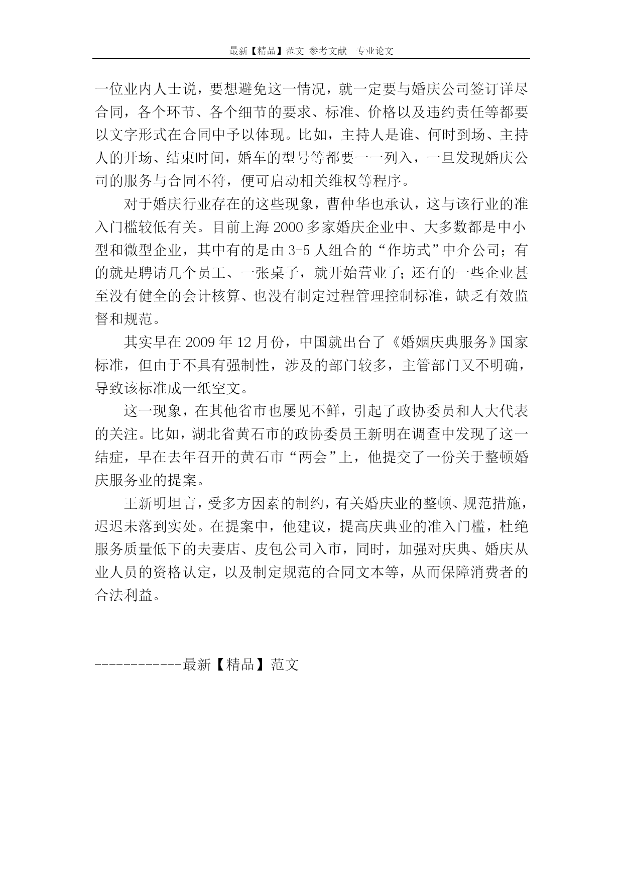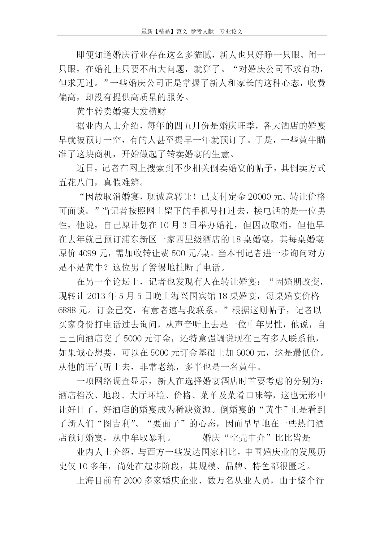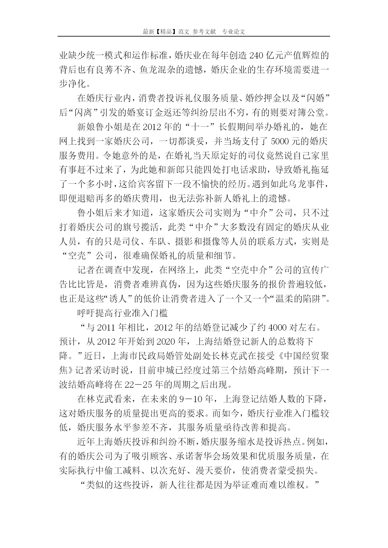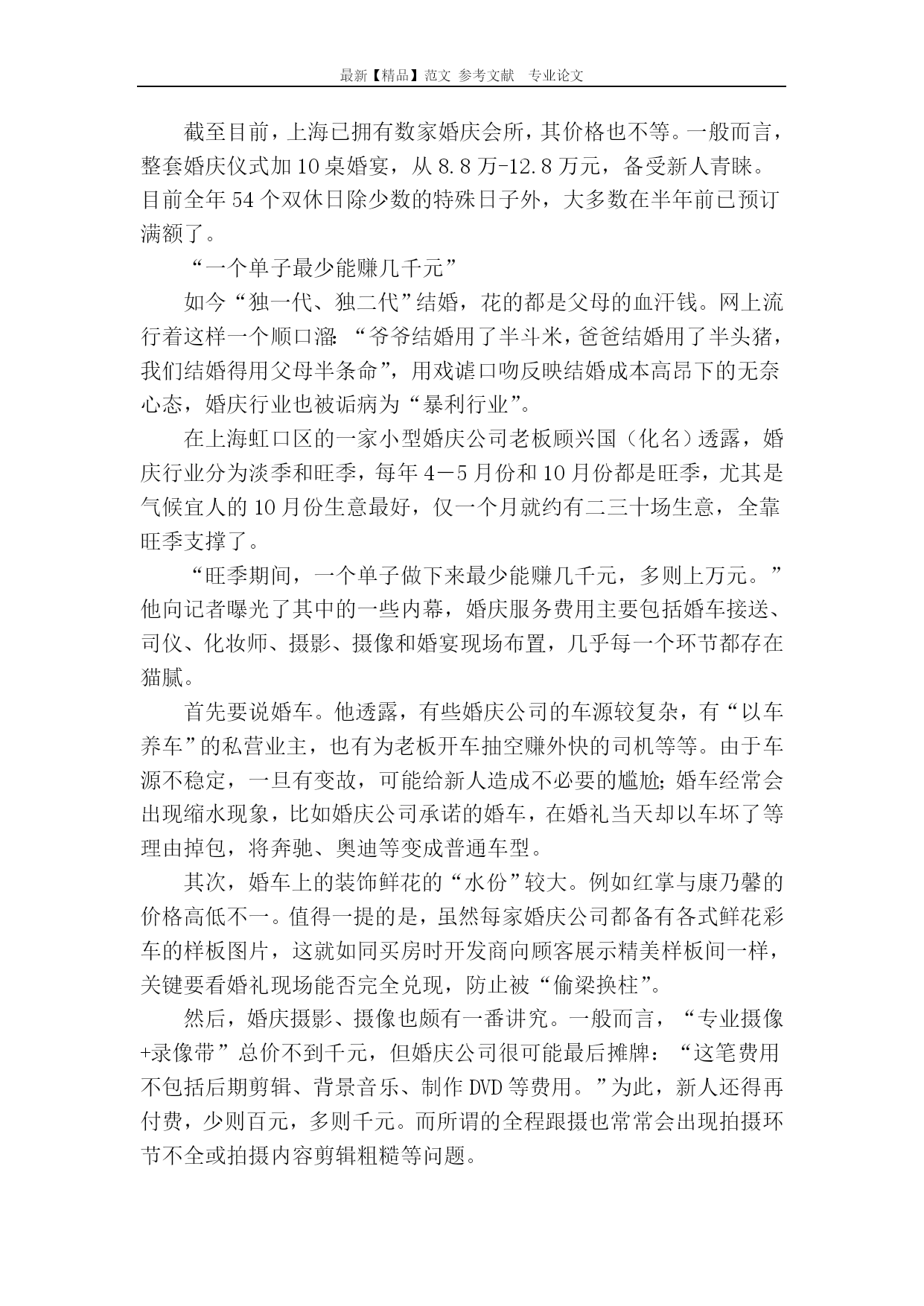 最新【精品】范文参考文献专业论文婚庆行业有点乱婚庆行业有点乱过去的近10年,申城正值结婚登记高峰期,促使婚庆业的发展规模迅速壮大。然而,由于缺乏相关的行业规范和监管、行业准入门槛很低,婚庆企业鱼龙混杂,纠纷也随之不断。婚庆“蛋糕”越做越大据上海市民政局统计,申城2007年结婚登记达11万多对;2008年上升至13万多对,直至2012年有14万多对新人登记结婚。对此,上海市婚庆协会会长曹仲华算了一笔账:2012年申城有超过12万场的婚庆典礼,以每场消费20万元计,便呈现了240亿元的“玫瑰经济”之魅,预计今年申城的婚庆经济规模与去年持平,消费势头旺盛。据悉,上海现在共有66个关联产业共同整合成婚庆产业链,婚纱礼服、婚纱摄影、婚车租赁、婚宴酒席、珠宝首饰等为相关产业;家电、家具、床上用品、室内装修、房地产,汽车等为相联产业,婚庆这块市场“蛋糕”越做越大。根据一份全国婚庆业的相关调查报告,在登记结婚的新人中,88.4%要拍婚纱照;49.15%要请婚庆公司策划婚礼;78.7%举办婚宴;36.8%购买婚纱;67.7%要蜜月旅游,全国每对新人平均婚庆消费12.58万元。随着物价的上涨,近年上海的婚庆服务费用也一路飙升。曹仲华举例说,2000年婚庆服务收费在8000-20000元之间,2012年达15000-35000元,2013年的婚庆服务收费更高。另据相关调查表明,为筹备一次称心如意的婚礼,新人需要采购60-200次,新人因此而疲惫不堪,面色憔悴。曹仲华介绍,上海婚庆行业引入了世界通行的“婚庆会馆”模式,提供“一门式”婚庆服务,新人既可以在仪式堂举行求婚、证婚、婚誓等仪式;又能在隔壁的宴会厅举办婚宴,然后入住婚庆会馆楼上的豪华“洞房”,整个过程在一个婚庆会馆里全部完成,新人无需四处奔波了。截至目前,上海已拥有数家婚庆会所,其价格也不等。一般而言,整套婚庆仪式加10桌婚宴,从8.8万-12.8万元,备受新人青睐。目前全年54个双休日除少数的特殊日子外,大多数在半年前已预订满额了。“一个单子最少能赚几千元”如今“独一代、独二代”结婚,花的都是父母的血汗钱。网上流行着这样一个顺口溜:“爷爷结婚用了半斗米,爸爸结婚用了半头猪,我们结婚得用父母半条命”,用戏谑口吻反映结婚成本高昂下的无奈心态,婚庆行业也被诟病为“暴利行业”。在上海虹口区的一家小型婚庆公司老板顾兴国(化名)透露,婚庆行业分为淡季和旺季,每年4―5月份和10月份都是旺季,尤其是气候宜人的10月份生意最好,仅一个月就约有二三十场生意,全靠旺季支撑了。“旺季期间,一个单子做下来最少能赚几千元,多则上万元。”他向记者曝光了其中的一些内幕,婚庆服务费用主要包括婚车接送、司仪、化妆师、摄影、摄像和婚宴现场布置,几乎每一个环节都存在猫腻。首先要说婚车。他透露,有些婚庆公司的车源较复杂,有“以车养车”的私营业主,也有为老板开车抽空赚外快的司机等等。由于车源不稳定,一旦有变故,可能给新人造成不必要的尴尬;婚车经常会出现缩水现象,比如婚庆公司承诺的婚车,在婚礼当天却以车坏了等理由掉包,将奔驰、奥迪等变成普通车型。其次,婚车上的装饰鲜花的“水份”较大。例如红掌与康乃馨的价格高低不一。值得一提的是,虽然每家婚庆公司都备有各式鲜花彩车的样板图片,这就如同买房时开发商向顾客展示精美样板间一样,关键要看婚礼现场能否完全兑现,防止被“偷梁换柱”。然后,婚庆摄影、摄像也颇有一番讲究。一般而言,“专业摄像+录像带”总价不到千元,但婚庆公司很可能最后摊牌:“这笔费用不包括后期剪辑、背景音乐、制作DVD等费用。”为此,新人还得再付费,少则百元,多则千元。而所谓的全程跟摄也常常会出现拍摄环节不全或拍摄内容剪辑粗糙等问题。即便知道婚庆行业存在这么多猫腻,新人也只好睁一只眼、闭一只眼,在婚礼上只要不出大问题,就算了。“对婚庆公司不求有功,但求无过。”一些婚庆公司正是掌握了新人和家长的这种心态,收费偏高,却没有提供高质量的服务。黄牛转卖婚宴大发横财据业内人士介绍,每年的四五月份是婚庆旺季,各大酒店的婚宴早就被预订一空,有的人甚至提早一年就预订了。于是,一些黄牛瞄准了这块商机,开始做起了转卖婚宴的生意。近日,记者在网上搜索到不少相关倒卖婚宴的帖子,其倒卖方式五花八门,真假难辨。“因故取消婚宴,现诚意转让!已支付定金20000元。转让价格可面谈。”当记者按照网上留下的手机号打过去,接电话的是一位男性,他说,自己原计划在10月3日举办婚礼,但因故取消,但他早在去年就已预订浦东新区一家四星级酒店的18桌婚宴,其每桌婚宴原价4099元,需加收转让费500元/桌。当本刊记者进一步询问对方是不是黄牛?这位男子警惕地挂断了电话。在另一个论坛上,记者也发现有人在转让婚宴:“因婚期改变,现转让20