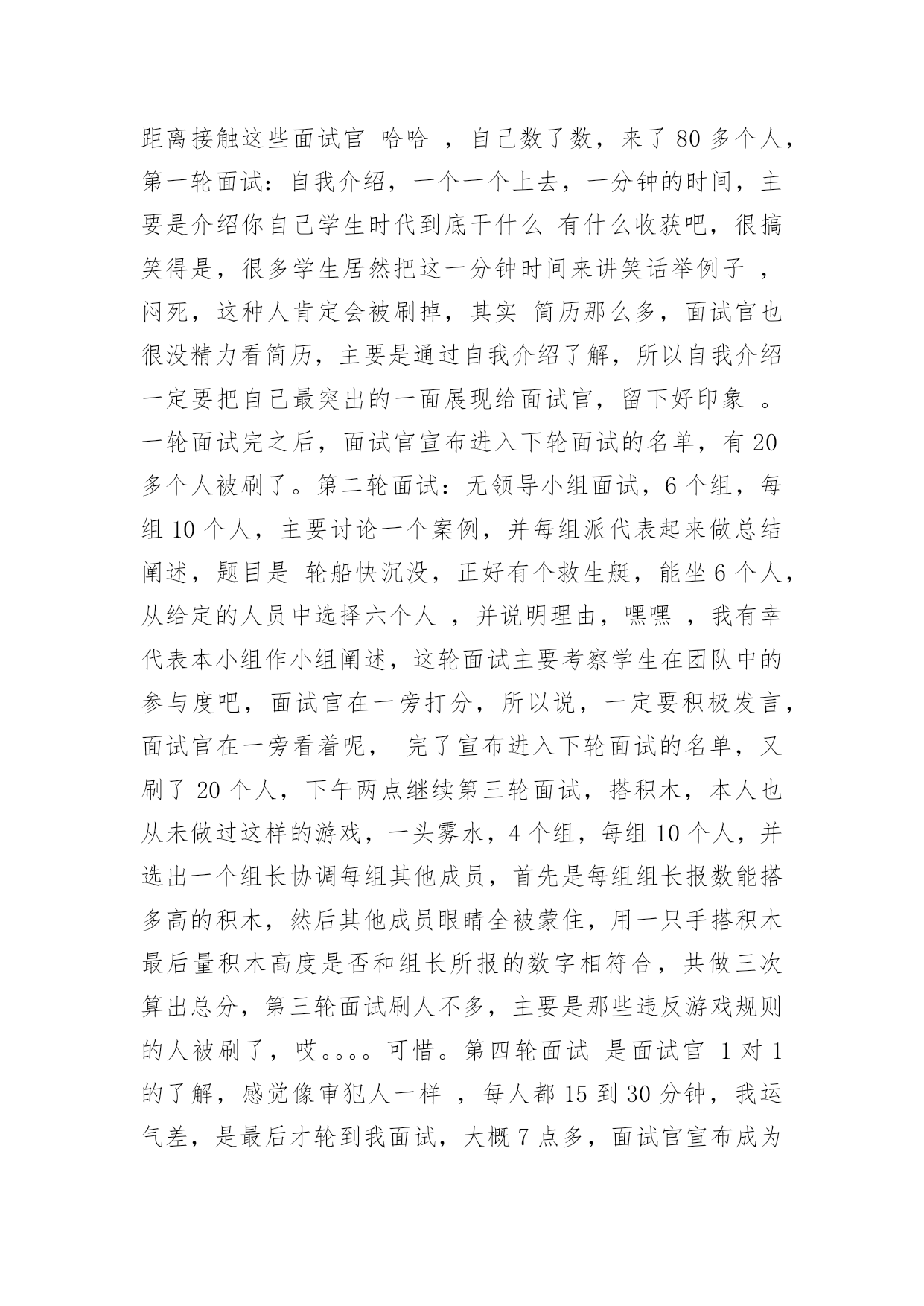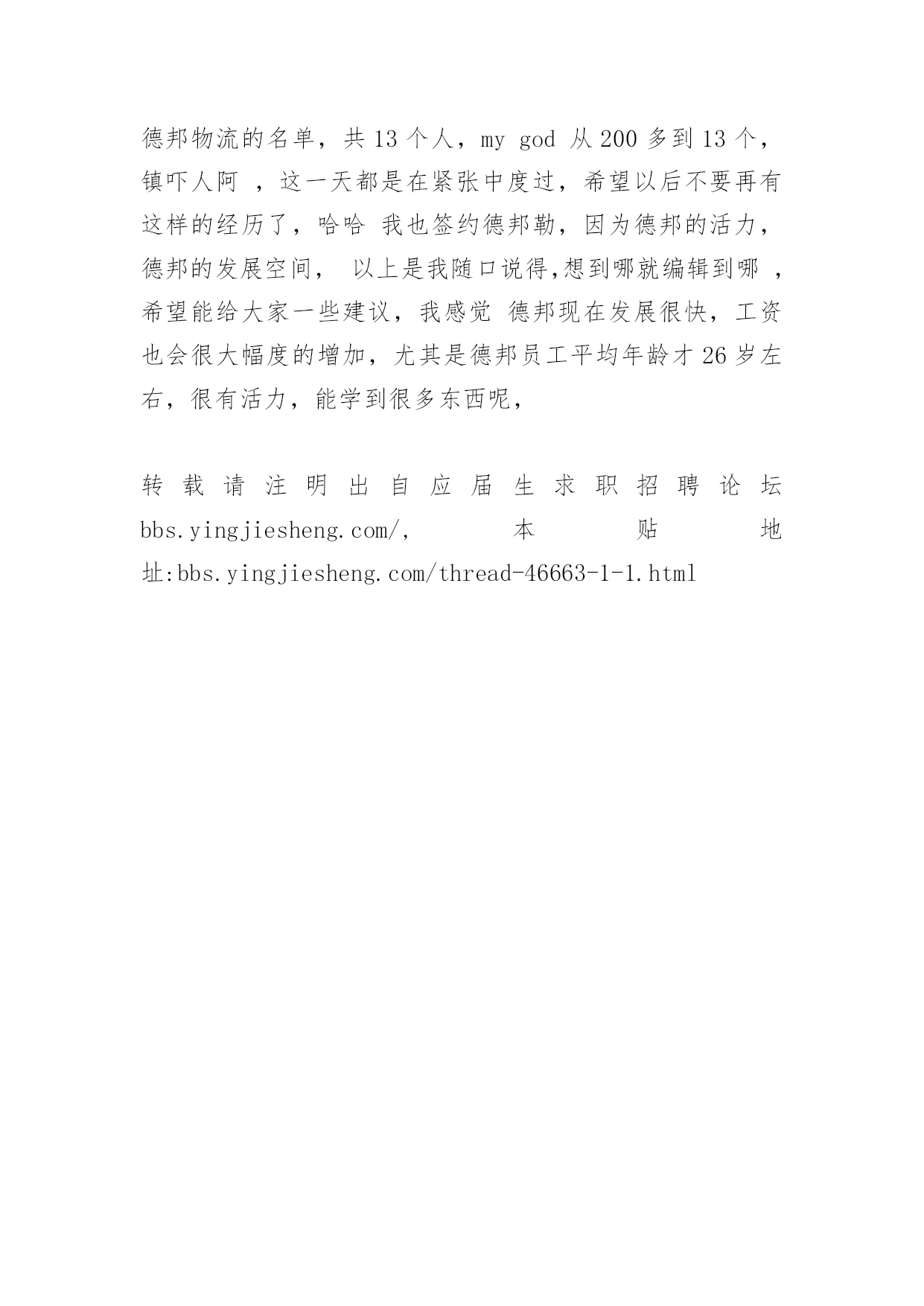 德邦物流面试归来德邦物流面试归来......工资,薪酬,德邦物流[此帖已被设为推荐]2008年10月中旬本人正好学习物流专业,就有幸参加学校举办的第一场专场招聘会,德邦物流公司,第一天宣讲,人山人海,至少有200百名学生把,德邦来了三个hr,一身德邦的西服,看上去很不错呢,嘿嘿,都是年轻人阿,宣讲了一个多钟头,给你介绍什么公司文化,公司培训体制等等,还有公司的薪酬制度,我现在还清楚记得,研究生试用期3200,转正底薪4000,本科生211的2100,转正2300吧,一般本科1900,转正2100吧,也许加点福利什么的本科也最多2400左右吧,在广州这个工资不算很高,但在物流行业算中等偏上了吧,不过据我了解,德邦09年之前招聘工资开得比较低,好像1500有过,居然09年校园招聘会开1900,长了这么多,看来这个企业以后工资还要长把这是个人估计哈,嘿嘿,:经过一番洗脑,面试官让有意者留下做笔试,并交简历,笔试算简单吧,不用什么准备,全市性格测试的题,只要认真对待,说出真实情况就ok啦,笔试完了就等通知第二天面试了阿,晚上接到通知说我可以去复式,mygod,我居然能过真是万幸啊。据说面试有4轮呢好怕怕阿。早上一大早抢了个好地方,能近距离接触这些面试官哈哈,自己数了数,来了80多个人,第一轮面试:自我介绍,一个一个上去,一分钟的时间,主要是介绍你自己学生时代到底干什么有什么收获吧,很搞笑得是,很多学生居然把这一分钟时间来讲笑话举例子,闷死,这种人肯定会被刷掉,其实简历那么多,面试官也很没精力看简历,主要是通过自我介绍了解,所以自我介绍一定要把自己最突出的一面展现给面试官,留下好印象。一轮面试完之后,面试官宣布进入下轮面试的名单,有20多个人被刷了。第二轮面试:无领导小组面试,6个组,每组10个人,主要讨论一个案例,并每组派代表起来做总结阐述,题目是轮船快沉没,正好有个救生艇,能坐6个人,从给定的人员中选择六个人,并说明理由,嘿嘿,我有幸代表本小组作小组阐述,这轮面试主要考察学生在团队中的参与度吧,面试官在一旁打分,所以说,一定要积极发言,面试官在一旁看着呢,完了宣布进入下轮面试的名单,又刷了20个人,下午两点继续第三轮面试,搭积木,本人也从未做过这样的游戏,一头雾水,4个组,每组10个人,并选出一个组长协调每组其他成员,首先是每组组长报数能搭多高的积木,然后其他成员眼睛全被蒙住,用一只手搭积木最后量积木高度是否和组长所报的数字相符合,共做三次算出总分,第三轮面试刷人不多,主要是那些违反游戏规则的人被刷了,哎。。。。可惜。第四轮面试是面试官1对1的了解,感觉像审犯人一样,每人都15到30分钟,我运气差,是最后才轮到我面试,大概7点多,面试官宣布成为德邦物流的名单,共13个人,mygod从200多到13个,镇吓人阿,这一天都是在紧张中度过,希望以后不要再有这样的经历了,哈哈我也签约德邦勒,因为德邦的活力,德邦的发展空间,以上是我随口说得,想到哪就编辑到哪,希望能给大家一些建议,我感觉德邦现在发展很快,工资也会很大幅度的增加,尤其是德邦员工平均年龄才26岁左右,很有活力,能学到很多东西呢,转载请注明出自应届生求职招聘论坛bbs.yingjiesheng.com/,本贴地址:bbs.yingjiesheng.com/thread-46663-1-1.html