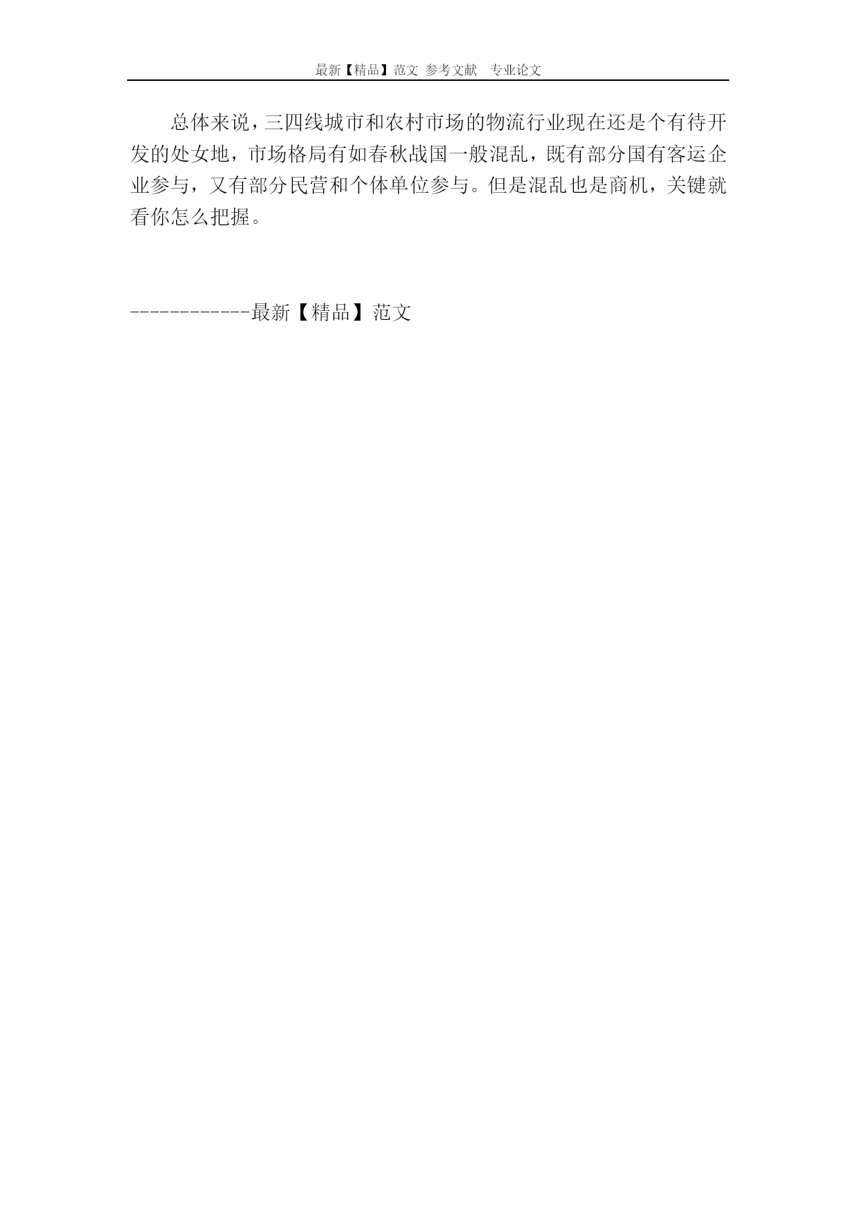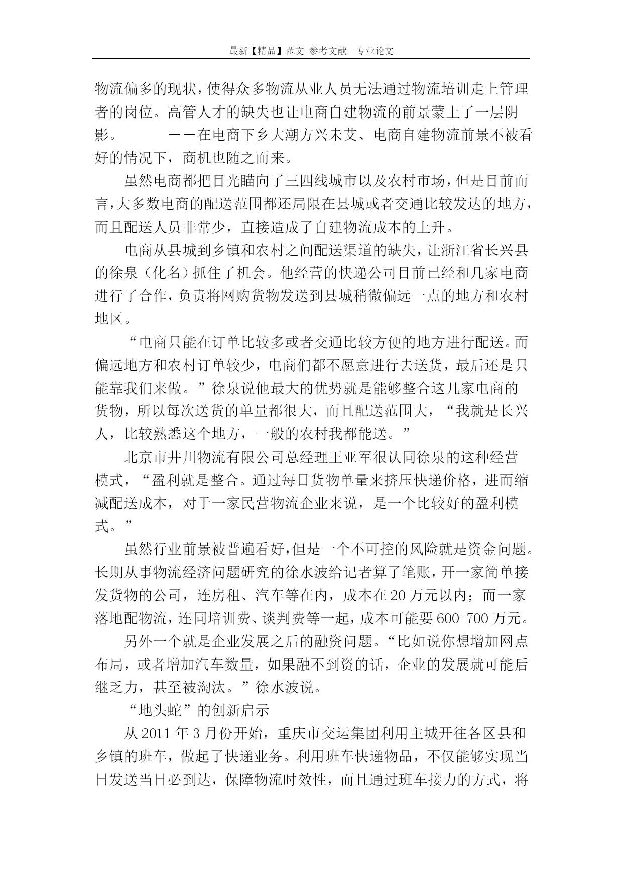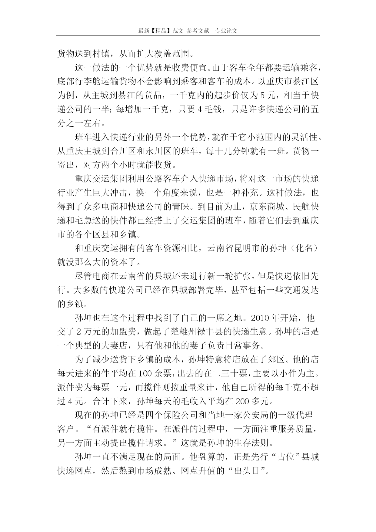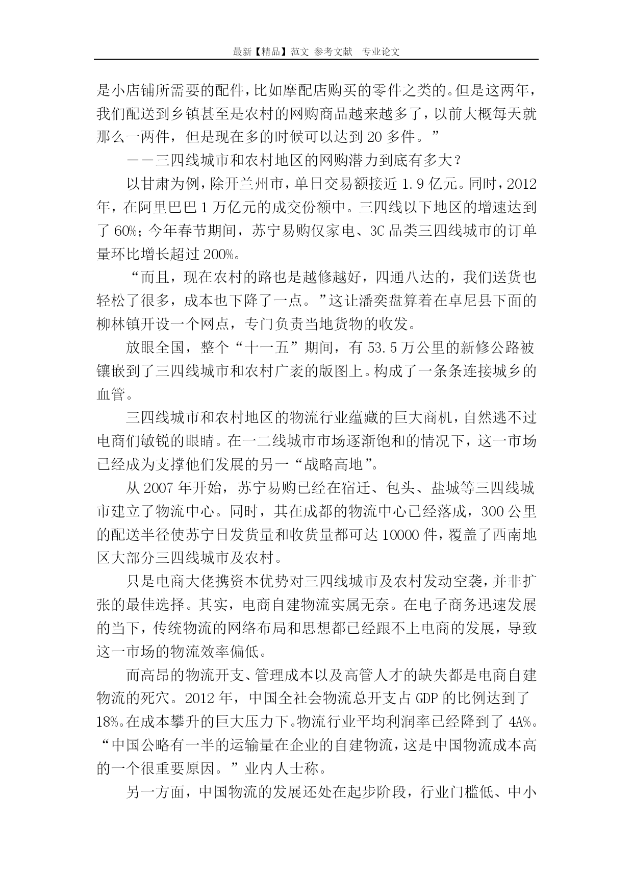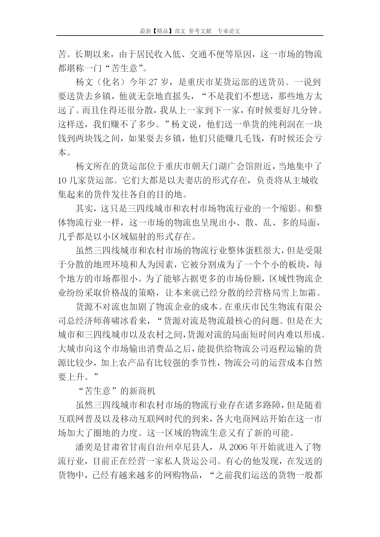 最新【精品】范文参考文献专业论文三四线城市的物流商机三四线城市的物流商机网购的发展,凸显了三四线城市和农村地区物流行业的“不给力”。因此,掘金这一区域市场的“最后一公里”,将成为未来五年内触手可及的商业机会。今天,用“香饽饽”三个字来形容三四线城市及农村地区的物流市场,一点都不为过:城镇化浪潮正如火如荼、电商下乡方兴未艾、农村地区的网购习惯开始悄然养成……――种种利好因素让上述区域的物流行业备受关注,去三四线城市办家物流公司俨然成为看似前景无限的商机。正所谓“站在风口上,猪都可以飞上天”,目前看来,三四线城市的物流市场增长势能着实很大,但其真能构成下一波投资热潮的“风口”?我们习惯用整体蛋糕来描述三四线城市的物流市场。但一个必须提及的信息是,中国两千多个县级城市已经将这一蛋糕分割成为了一个个小的板块,受限于交通硬件设施、公司规模、人力成本等,每个区域板块的物流蛋糕其实并不大。目前,一般物流企业能覆盖的范围基本局限在县城级别。自2011年来,各大电商纷纷携巨量资本自建物流渠道,但其难以突破的瓶颈,也恰好出现在各县级城市与所辖乡镇间的物流配送环节。简言之,这一资本巨头一时淮以下沉到位的空白环节,才是区域性物流公司的真正突破口。所谓“最后一公里”上的潜在需求,正是今天物流行业最真实和最接地气的投资方向。“最后一公里”的路障马晓(化名)的老家在四川省资阳市安岳县兴隆镇。去年年底,他回老家过年。在外地工作多年,马晓早已养成了网购的习惯。趁着过年,他准备从网上给父母买两件冬装。但是他发现,所有快递居然都无法将衣服送到家。快递公司给出的解释是:兴隆镇地点太偏,无法送达,只能送到安岳县。无奈之下,马晓只能作罢。身处三四线城市和农村市场的马晓们一直饱受物流“不给力”之苦。长期以来,由于居民收入低、交通不便等原因,这一市场的物流都堪称一门“苦生意”。杨文(化名)今年27岁,是重庆市某货运部的送货员。一说到要送货去乡镇,他就无奈地直摇头,“不是我们不想送,那些地方太远了。而且住得还很分散,我从上一家到下一家,有时候要好几分钟。这样送,我们赚不了多少。”杨文说,他们送一单货的纯利润在一块钱到两块钱之间,如果耍去乡镇,他们只能赚几毛钱,有时候还会亏本。杨文所在的货运部位于重庆市朝天门湖广会馆附近,当地集中了10几家货运部。它们大都是以夫妻店的形式存在,负责将从主城收集起来的货件发往各自的目的地。其实,这只是三四线城市和农村市场物流行业的一个缩影。和整体物流行业一样,这一市场的物流也呈现出小、散、乱、多的局面,几乎都是以小区域辐射的形式存在。虽然三四线城市和农村市场的物流行业整体蛋糕很大,但是受限于分散的地理环境和人为因素,它被分割成为了一个个小的板块,每个地方的市场都很小。为了能够占据更多的市场份额,区域性物流企业纷纷采取价格战的策略,让本来就已经分散的经营格局雪上加霜。货源不对流也加剧了物流企业的成本。在重庆市民生物流有限公司总经济师蒋啸冰看来,“货源对流是物流最核心的问题。但是在大城市和三四线城市以及农村之间,货源对流的局面短时间内难以形成。大城市向这个市场输出消费品之后,能提供给物流公司返程运输的货源比较少,加上农产品有比较强的季节性,物流公司的运营成本自然要上升。”“苦生意”的新商机虽然三四线城市和农村市场的物流行业存在诸多路障,但是随着互联网普及以及移动互联网时代的到来,各大电商网站开始在这一市场加大了圈地的力度。这一区域的物流生意又有了新的可能。潘奕是甘肃省甘南自治州卓尼县人,从2006年开始就进入了物流行业,目前正在经营一家私人货运公司。有心的他发现,在发送的货物中,已经有越来越多的网购物品,“之前我们运送的货物一般都是小店铺所需要的配件,比如摩配店购买的零件之类的。但是这两年,我们配送到乡镇甚至是农村的网购商品越来越多了,以前大概每天就那么一两件,但是现在多的时候可以达到20多件。”――三四线城市和农村地区的网购潜力到底有多大?以甘肃为例,除开兰州市,单日交易额接近1.9亿元。同时,2012年,在阿里巴巴1万亿元的成交份额中。三四线以下地区的增速达到了60%;今年春节期间,苏宁易购仅家电、3C品类三四线城市的订单量环比增长超过200%。“而且,现在农村的路也是越修越好,四通八达的,我们送货也轻松了很多,成本也下降了一点。”这让潘奕盘算着在卓尼县下面的柳林镇开设一个网点,专门负责当地货物的收发。放眼全国,整个“十一五”期间,有53.5万公里的新修公路被镶嵌到了三四线城市和农村广袤的版图上。构成了一条条连接城乡的血管。三四线城市和农村地区的物流行业蕴藏的巨大商机,自然逃不过电商们敏锐的眼睛。在一二线城市市场逐渐饱和的情况下,这一市场已经成为支撑他们发展的另一“战略高地”。从2007年开始