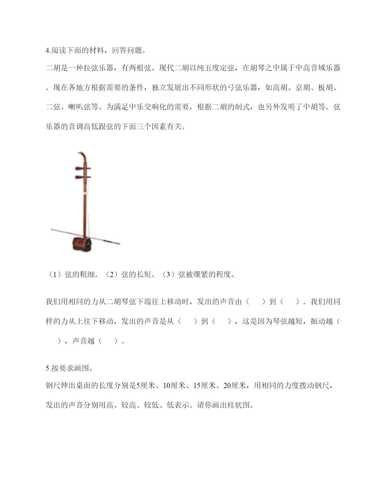 小学科学《声音》综合练习题一.选择题(共10题,共20分)1.同一个物体,振动幅度越(),发出的声音越强。A.大B.均匀C.小2.小明用手摸着自己的喉结并说话,体会喉结在振动的感觉;小红在桌上用手按住钢尺然后拨动钢尺伸出桌面的那部分,观察尺子的状态;小强在鼓面上放一些碎纸屑然后敲击鼓面,观察纸屑的状态。这三位同学研究的问题是()。A.声音是怎样产生的B.声音的强弱C.声音的高低3.鼓膜受外耳道传递的声波而产生()。A.声音B.振动C.音质4.声音不能在()中传播。A.真空B.固体C.液体5.当我们把玻璃钟罩里的空气逐渐抽掉时,钟罩里的闹钟铃声会()。A.越来越轻,甚至听不见B.越来越响C.没有什么变化6.要让正在发声的锣立刻停止发声,应该()。A.不再敲了B.马上用手按住锣面,使它不再振动C.继续轻轻地敲7.描述声音高低的是()。A.音高B.大声C.音量8.把敲响的音叉放在水面上,会看到()。A.水面十分平静B.水会向一个方向流动C.水花四溅,水面出现-圈圈波纹9.小明发现有一根琴弦声音有些低,他应该()。A.用力弹B.将这根琴弦调松一些C.将这根琴弦调紧一些10.敲击下图三根铁钉,发出声音最高的是()。A.B.C.二.填空题(共10题,共58分)1.声音的()可以用音高来描述,音高是由物体振动的()决定的。振动越快,发出的声音就();振动越慢,发出的声音就()。单位:赫兹(HZ),它表示物体一秒钟振动的()。2.轻轻拨动钢尺,钢尺振动的(),它发出的声音()。用力拨动钢尺,钢尺振动的幅度()它发出的声音()。声音的强弱和物体()有关。物体振动的幅度越大,声音越();物体振动的幅度越小,声音越()。3.大量事实证明:声音因物体振动而()。振动停止,声音()。4.用不同的力度敲击同一个音叉,用力小时发出的声音(),用力大时发出的声音()。5.()收集声音,()把声音转化为振动。6.要发出强弱不同的声音,关键是()。7.音量的大小与物体()有关。振动幅度越(),声音越();振动幅度越(),声音越()。8.吹竖笛是()振动发出声音。9.用相同的力拨动钢尺时,钢尺伸出桌面越短,发出的声音越();钢尺伸出桌面越长,发出的声音越()。10.探索尺子的音高变化实验中,尺子伸出桌面的长度越长,发出的声音越(),振动得越()。三.判断题(共10题,共20分)1.声音能在液体、固体中传播,在气体中不能传播。()2.我们听到的声音有的强有的弱。()3.如果有大陨石撞上月球,我们地球上的人也能听到撞击声。()4.为了防止琴弦松脱,琴弦调得越紧越好。()5.当我们潜伏在水里时,就完全听不到水面上的声音了。()6.声带越紧,发出的声音就越高。()7.汽车鸣笛的声音和摩托车大喇叭声是一样的。()8.物体一般都能传播声音,它们传播声音的本领有所不同。()9.在水中敲击音叉,音叉不会发出声音。()10.同一物体振动得越快,发出的声音就越高。()四.连线题(共1题,共8分)1.连一连。拨动拉得较紧的橡皮筋听到的声音高拨动拉得较松的橡皮筋用力敲击锣听到的声音低轻轻敲击锣鼓皮振动得快听到的声音强鼓皮振动得慢弹拨伸出桌面距离长的尺子听到的声音弱弹拨伸出桌面距离短的尺子五.填表题(共2题,共22分)1.猜想:声音强弱与物体振动幅度有关,振幅越大,声音越();物体振幅越小,声音越()。实验器材:钢尺,桌子改变的条件:()不改变的条件:()填写表格。实验结论是什么?2.根据你对耳朵的了解,完成下表。六.简答题(共5题,共26分)1.声音在传播的过程中借助了什么物质?2.物体振动的幅度与声音的强弱有什么关系?3.抽出玻璃罩内的空气,闹钟的声音有什么变化?怎样解释我们看到的现象?声音的传播与空气有关系吗?4.我们通常用哪些词来描述听到的声音?5.简单说说如何改变古筝上的某一根弦的音高?七.材料题(共3题,共19分)1.写出下图各部分的名称。2.小明有3根长短相同,粗细不同的钢管,小丽说:“我可以闭上眼睛,只通过用相同的力敲击钢管就可以判断它们的粗细。”请解释其中的原理。3.用三个塑料袋分别装上沙子、水和空气封口,将三个塑料袋分别放在桌子上,一只耳朵轻轻地贴在塑料袋上,捂住另一只耳朵。在距离一臂远处,用铅笔上的橡皮轻轻敲击桌面。请分析隔着哪个塑料袋听到的声音效果好,并试着排序。八.综合题(共5题,共37分)1.如图,鼓面上放少量的碎纸屑。(1)如图1,鼓槌没有敲击鼓面时,碎纸屑是()(“静止”或“跳动”)的。(2)如图2,鼓槌敲击鼓面的时候,碎纸屑是()(“静止”或“跳动”)的,鼓槌用力越小,碎纸屑跳跃的高度(),鼓槌