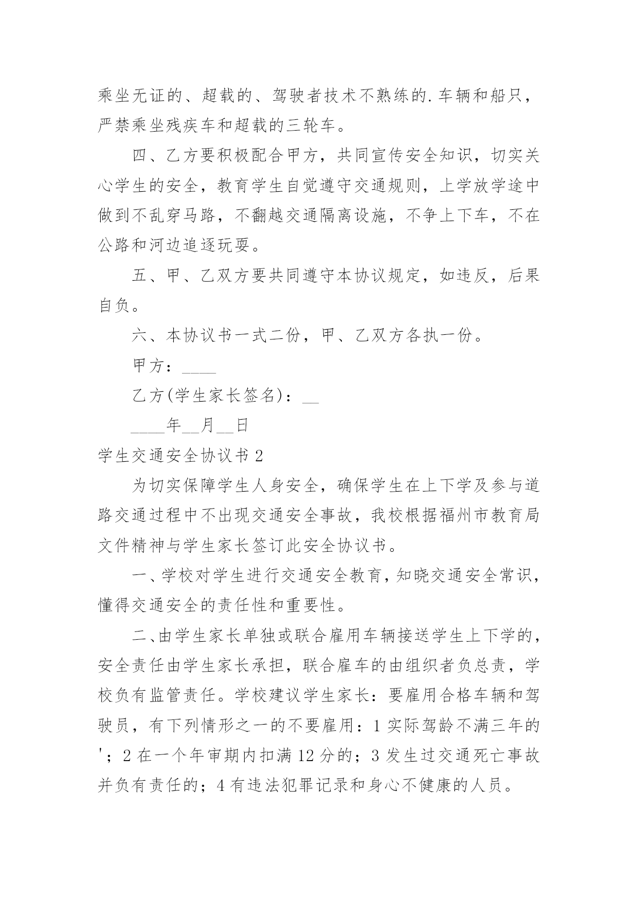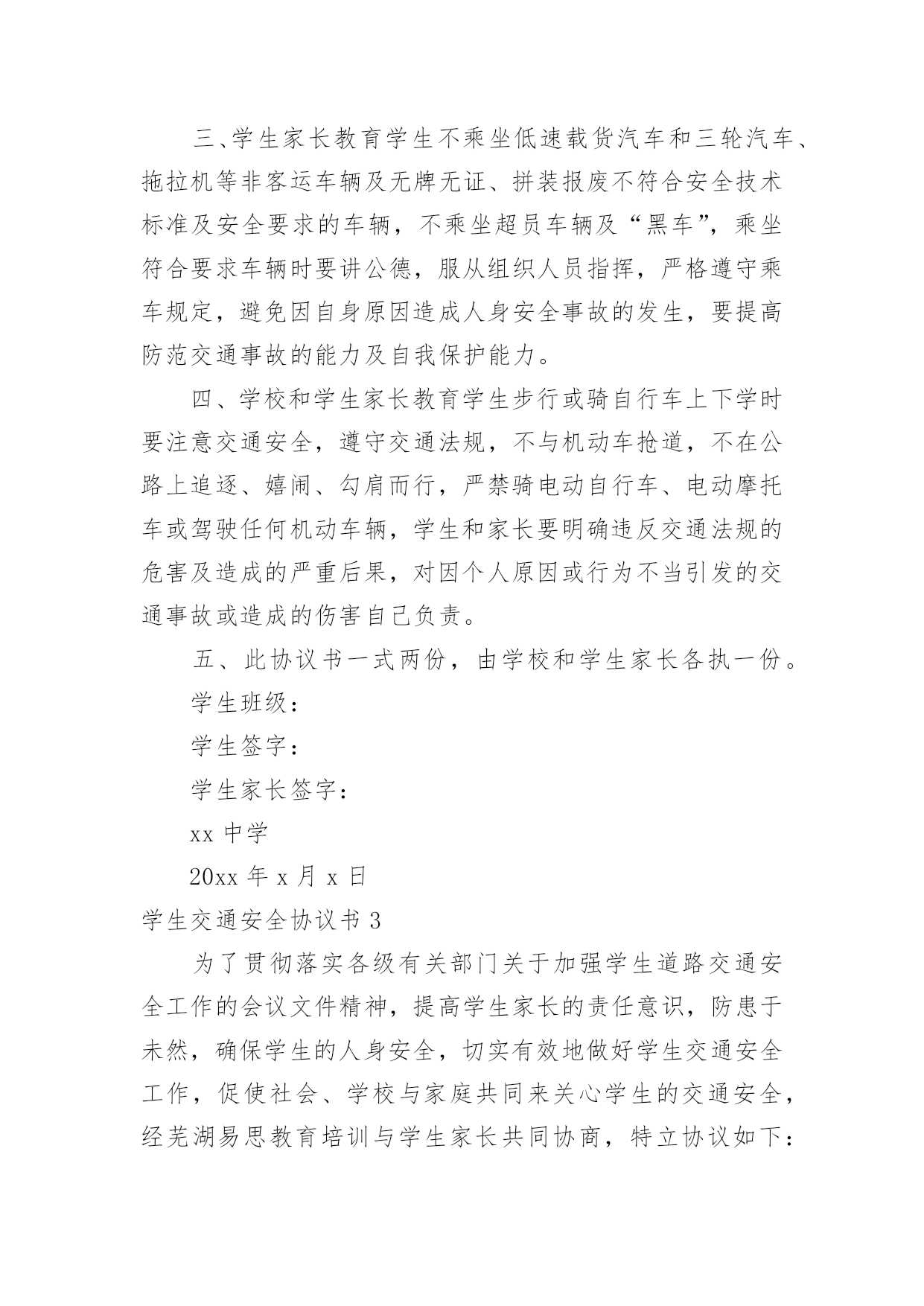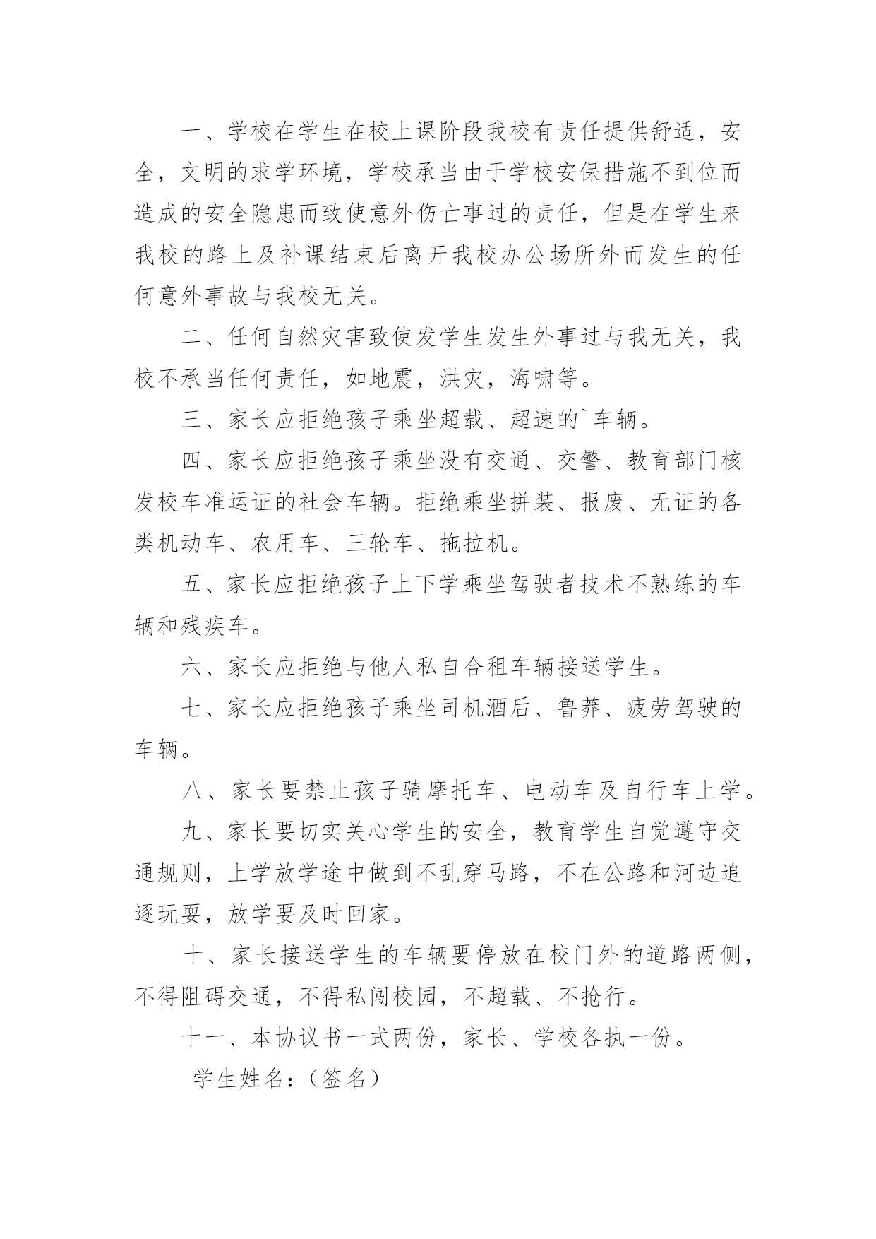 学生交通安全协议书学生交通安全协议书随着社会不断地进步,各种协议频频出现,签订了协议就有了法律依靠。相信很多朋友都对拟协议感到非常苦恼吧,下面是小编为大家整理的学生交通安全协议书,仅供参考,大家一起来看看吧。学生交通安全协议书1为了贯彻落实省、市、县各级教育行政部门关于加强校园安全工作的精神,切实有效地做好大埔县洲瑞镇实验学校的安全教育及管理工作,落实学校安全教育工作责任制,做到学校与家庭共同来关心学生的安全,促使安全教育工作管理制度化、规范化。经学校(以下简称甲方)与学生家长(以简称乙方)的共同协商,特立协议如下:一、甲方要认真贯彻上级有关安全工作的法规、政策,加强宣传力度,做到安全警钟长鸣,常抓不懈。二、小学生系无民事行为能力或者限制民事行为能力人,为了确保乙方子女上下学途中的安全,甲方要求乙方对子女上下学进行按时接送,积极履行监护职责。三、乙方要教育子女严格执行《中华人民共和国道路交通安全法》第五十五条第三款、第七十二条第一款的规定:未满十二周岁的儿童,不准在道路上骑自行车、三轮车、推拉人力车,更不准骑自行车上学;甲方严禁乙方子女上下学乘坐无证的、超载的、驾驶者技术不熟练的.车辆和船只,严禁乘坐残疾车和超载的三轮车。四、乙方要积极配合甲方,共同宣传安全知识,切实关心学生的安全,教育学生自觉遵守交通规则,上学放学途中做到不乱穿马路,不翻越交通隔离设施,不争上下车,不在公路和河边追逐玩耍。五、甲、乙双方要共同遵守本协议规定,如违反,后果自负。六、本协议书一式二份,甲、乙双方各执一份。甲方:____乙方(学生家长签名):______年__月__日学生交通安全协议书2为切实保障学生人身安全,确保学生在上下学及参与道路交通过程中不出现交通安全事故,我校根据福州市教育局文件精神与学生家长签订此安全协议书。一、学校对学生进行交通安全教育,知晓交通安全常识,懂得交通安全的责任性和重要性。二、由学生家长单独或联合雇用车辆接送学生上下学的,安全责任由学生家长承担,联合雇车的由组织者负总责,学校负有监管责任。学校建议学生家长:要雇用合格车辆和驾驶员,有下列情形之一的不要雇用:1实际驾龄不满三年的';2在一个年审期内扣满12分的;3发生过交通死亡事故并负有责任的;4有违法犯罪记录和身心不健康的人员。三、学生家长教育学生不乘坐低速载货汽车和三轮汽车、拖拉机等非客运车辆及无牌无证、拼装报废不符合安全技术标准及安全要求的车辆,不乘坐超员车辆及“黑车”,乘坐符合要求车辆时要讲公德,服从组织人员指挥,严格遵守乘车规定,避免因自身原因造成人身安全事故的发生,要提高防范交通事故的能力及自我保护能力。四、学校和学生家长教育学生步行或骑自行车上下学时要注意交通安全,遵守交通法规,不与机动车抢道,不在公路上追逐、嬉闹、勾肩而行,严禁骑电动自行车、电动摩托车或驾驶任何机动车辆,学生和家长要明确违反交通法规的危害及造成的严重后果,对因个人原因或行为不当引发的交通事故或造成的伤害自己负责。五、此协议书一式两份,由学校和学生家长各执一份。学生班级:学生签字:学生家长签字:xx中学20xx年x月x日学生交通安全协议书3为了贯彻落实各级有关部门关于加强学生道路交通安全工作的会议文件精神,提高学生家长的责任意识,防患于未然,确保学生的人身安全,切实有效地做好学生交通安全工作,促使社会、学校与家庭共同来关心学生的交通安全,经芜湖易思教育培训与学生家长共同协商,特立协议如下:一、学校在学生在校上课阶段我校有责任提供舒适,安全,文明的求学环境,学校承当由于学校安保措施不到位而造成的安全隐患而致使意外伤亡事过的责任,但是在学生来我校的路上及补课结束后离开我校办公场所外而发生的任何意外事故与我校无关。二、任何自然灾害致使发学生发生外事过与我无关,我校不承当任何责任,如地震,洪灾,海啸等。三、家长应拒绝孩子乘坐超载、超速的`车辆。四、家长应拒绝孩子乘坐没有交通、交警、教育部门核发校车准运证的社会车辆。拒绝乘坐拼装、报废、无证的各类机动车、农用车、三轮车、拖拉机。五、家长应拒绝孩子上下学乘坐驾驶者技术不熟练的车辆和残疾车。六、家长应拒绝与他人私自合租车辆接送学生。七、家长应拒绝孩子乘坐司机酒后、鲁莽、疲劳驾驶的车辆。八、家长要禁止孩子骑摩托车、电动车及自行车上学。九、家长要切实关心学生的安全,教育学生自觉遵守交通规则,上学放学途中做到不乱穿马路,不在公路和河边追逐玩耍,放学要及时回家。十、家长接送学生的车辆要停放在校门外的道路两侧,不得阻碍交通,不得私闯校园,不超载、不抢行。十一、本协议书一式两份,家长、学校各执一份。学生姓名:(签名)学生家长:(签名)20xx年xx月xx日