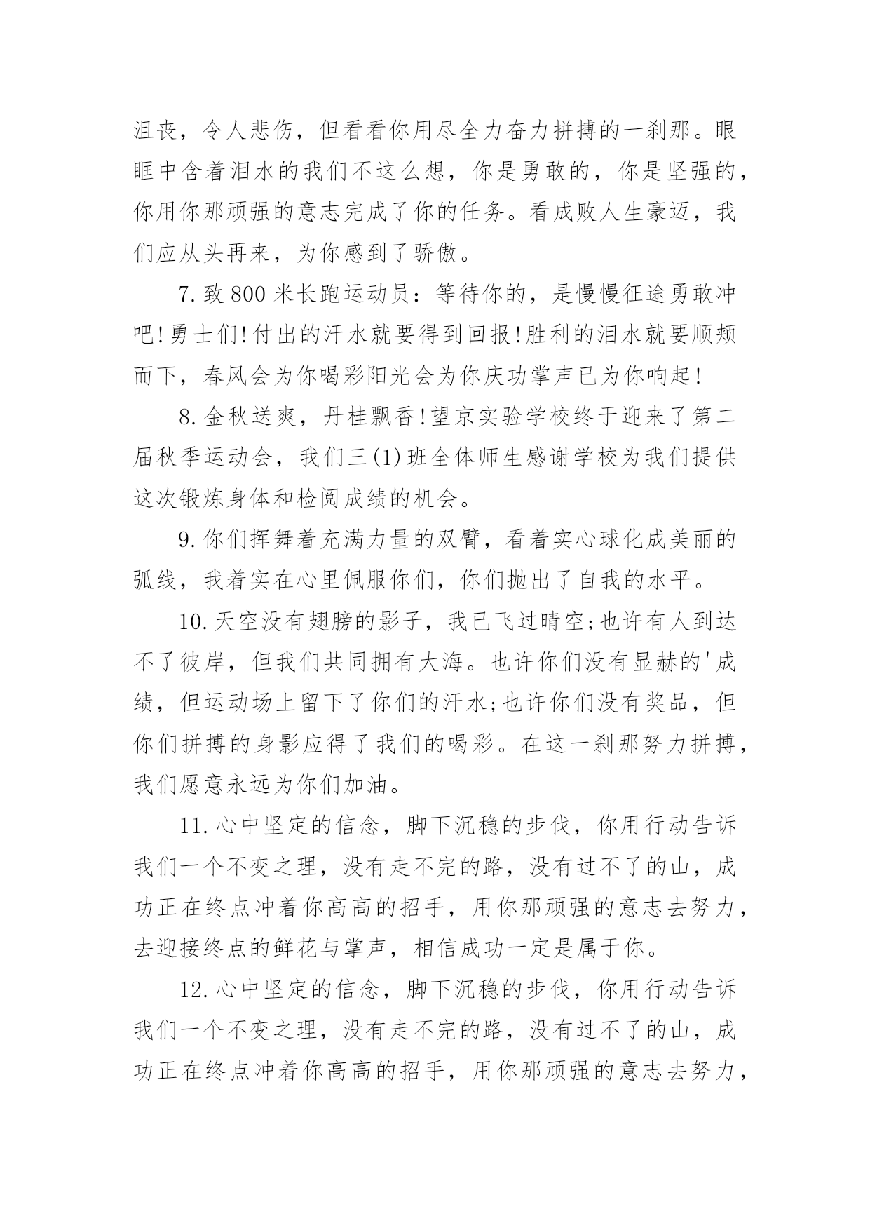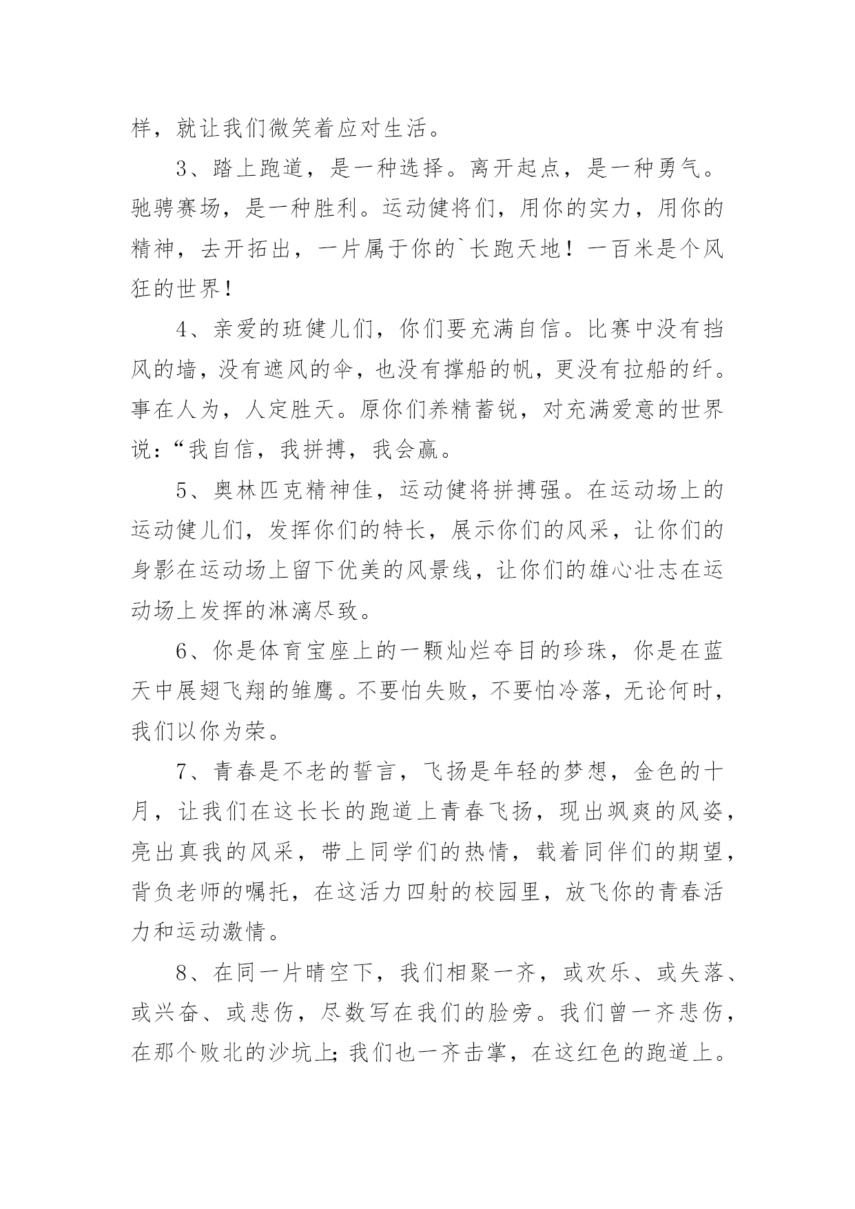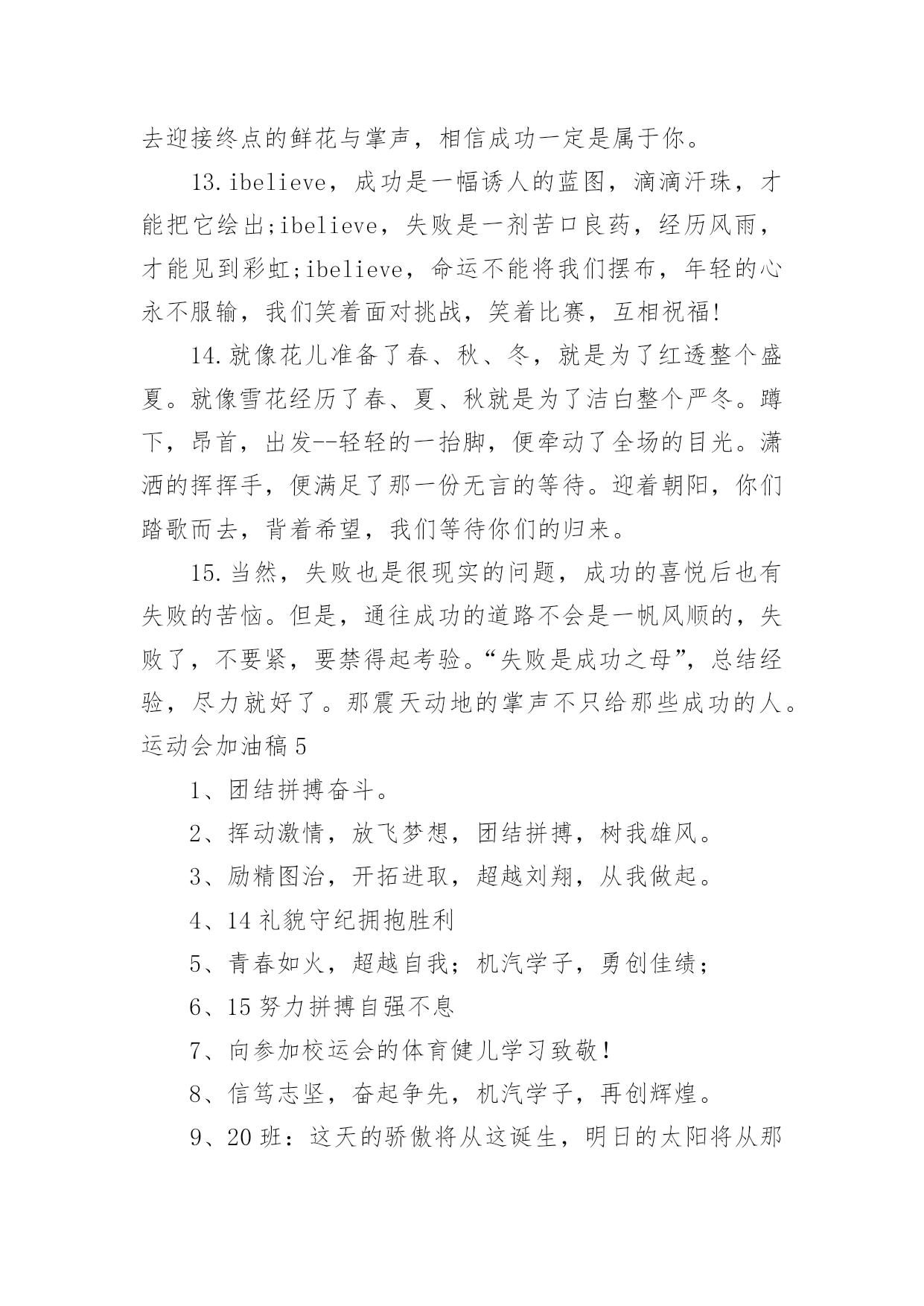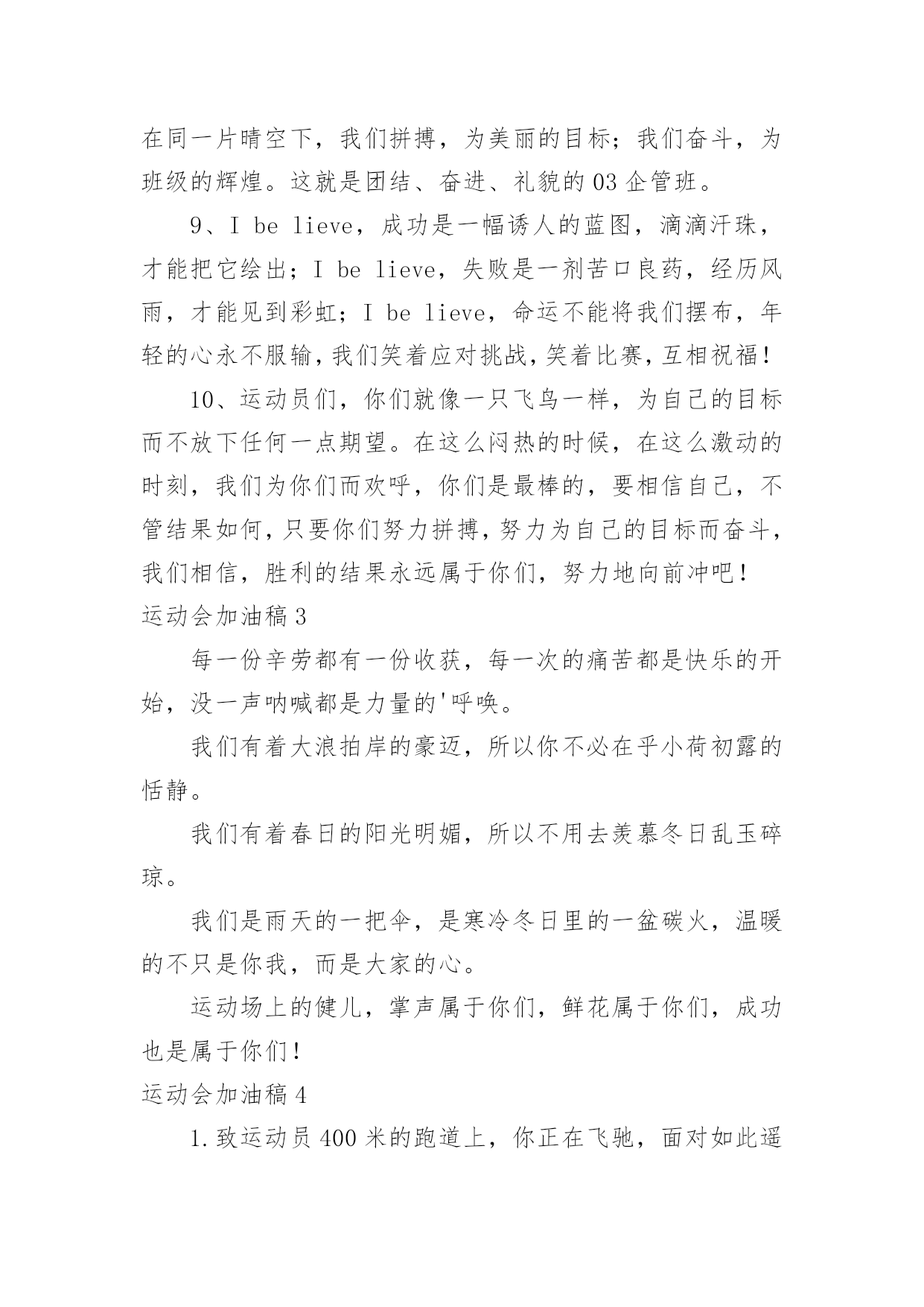 运动会加油稿运动会加油稿15篇在不断进步的时代,需要使用加油稿的场合越来越多,加油稿有着正向的鼓动作用。写起加油稿来就毫无头绪?以下是小编整理的运动会加油稿,仅供参考,希望能够帮助到大家。运动会加油稿11、漫漫长路,你愿一人独撑,忍受着孤独与寂寞,承受着体力与精神的压迫,只任汗水溶于泪水,可脚步却从不停歇。2、生活中,我们每一天都在尝试;我们走向成功,品味失败,走过心灵的阴雨晴空。运动员们,不要放下尝试,无论失败与否,重要的是你勇于参与的精神。3、泥泞的路走过无数,累了,告诉自我:快了,再坚持一会儿;身上的伤流出血来,疼了,告诉自我:别哭,会好的;摔倒了,告诉自我:快爬起来,世上很少有坦途。4、萧瑟的秋风,挡不住你们破竹的锐气,广阔的绿茵场,是为你们搭建的舞台。张扬吧,年轻的心,我们将为你永远喝彩!5、汗水,泪水;笑声,歌声;我们尽情挥洒。开幕式上,运动场上,我们尽情展现,多少艰辛,多少困苦,我们勇敢承担。因为年轻,因为张扬。6、海燕在大海上翱翔,雄鹰在搏击长空,你奔驰在赛场上,高二班的“**”期望你能够勇往直前,向着胜利的彼岸,冲吧!我们一直都会支持你!7、铿锵玫瑰——或许会有人认为赛场是男生的天下,但在赛场上却活跃着许多女生的身影。他们与男生一样驰骋赛场,拼搏赛场,也与男生一样拥有了胜利的.喜悦。8、年轻的我们自信飞扬,青春的气息如同初升的朝阳,蓬勃的力量如同阳光的挥洒。此时此刻,跑道便是我们精彩的舞台,声声加油便是我们的奖项!9、踏着春天的气息,迈着轻盈的脚步,我们迎来了心仪已久的运动会。那里就是展示自我的舞台。我们向往高山的坚忍不拔,我们渴望大海的博大精深。10、心中坚定的信念,脚下沉稳的步伐,你用行动告诉我们一个不变之理,没有走不完的路,没有过不了的山,成功正在终点冲着你高高的招手。运动会加油稿21、赛场上,一道道优美的弧线将轻盈地划过天空。健儿们用手中的标枪向距离的极限发起一轮又一轮的挑战。标枪在空中轻盈的姿态,是健儿们强健的力量和熟练的技巧的结合。谁能在这场激烈的竞争中获胜?让我们拭目以待,让我们为他们呐喊助威吧!2、阳光不会永远灿烂,没有一成不变的幸福,磨难或许是上苍赐予我们的礼物,用来考验我们的意志,如果是这样,就让我们微笑着应对生活。3、踏上跑道,是一种选择。离开起点,是一种勇气。驰骋赛场,是一种胜利。运动健将们,用你的实力,用你的精神,去开拓出,一片属于你的`长跑天地!一百米是个风狂的世界!4、亲爱的班健儿们,你们要充满自信。比赛中没有挡风的墙,没有遮风的伞,也没有撑船的帆,更没有拉船的纤。事在人为,人定胜天。原你们养精蓄锐,对充满爱意的世界说:“我自信,我拼搏,我会赢。5、奥林匹克精神佳,运动健将拼搏强。在运动场上的运动健儿们,发挥你们的特长,展示你们的风采,让你们的身影在运动场上留下优美的风景线,让你们的雄心壮志在运动场上发挥的淋漓尽致。6、你是体育宝座上的一颗灿烂夺目的珍珠,你是在蓝天中展翅飞翔的雏鹰。不要怕失败,不要怕冷落,无论何时,我们以你为荣。7、青春是不老的誓言,飞扬是年轻的梦想,金色的十月,让我们在这长长的跑道上青春飞扬,现出飒爽的风姿,亮出真我的风采,带上同学们的热情,载着同伴们的期望,背负老师的嘱托,在这活力四射的校园里,放飞你的青春活力和运动激情。8、在同一片晴空下,我们相聚一齐,或欢乐、或失落、或兴奋、或悲伤,尽数写在我们的脸旁。我们曾一齐悲伤,在那个败北的沙坑上;我们也一齐击掌,在这红色的跑道上。在同一片晴空下,我们拼搏,为美丽的目标;我们奋斗,为班级的辉煌。这就是团结、奋进、礼貌的03企管班。9、Ibelieve,成功是一幅诱人的蓝图,滴滴汗珠,才能把它绘出;Ibelieve,失败是一剂苦口良药,经历风雨,才能见到彩虹;Ibelieve,命运不能将我们摆布,年轻的心永不服输,我们笑着应对挑战,笑着比赛,互相祝福!10、运动员们,你们就像一只飞鸟一样,为自己的目标而不放下任何一点期望。在这么闷热的时候,在这么激动的时刻,我们为你们而欢呼,你们是最棒的,要相信自己,不管结果如何,只要你们努力拼搏,努力为自己的目标而奋斗,我们相信,胜利的结果永远属于你们,努力地向前冲吧!运动会加油稿3每一份辛劳都有一份收获,每一次的痛苦都是快乐的开始,没一声呐喊都是力量的'呼唤。我们有着大浪拍岸的豪迈,所以你不必在乎小荷初露的恬静。我们有着春日的阳光明媚,所以不用去羡慕冬日乱玉碎琼。我们是雨天的一把伞,是寒冷冬日里的一盆碳火,温暖的不只是你我,而是大家的心。运动场上的健儿,掌声属于你们,鲜花属于你们,成功也是属于你们!运动会加油稿41.致运动员400米的跑道上,你正在飞驰,面对如此遥远的路途,你也许腿脚发麻,你也许有些茫然。但你可知道,在你身后,有同学们一双双期待的眼睛;在你身后,是你日日苦练的