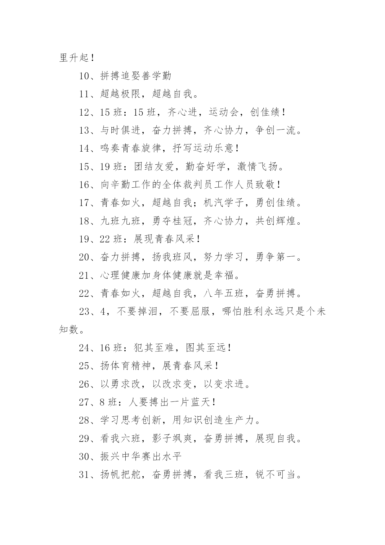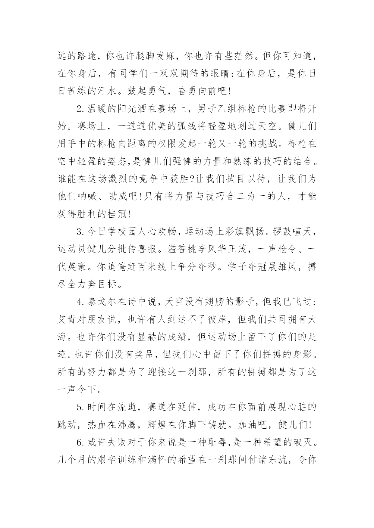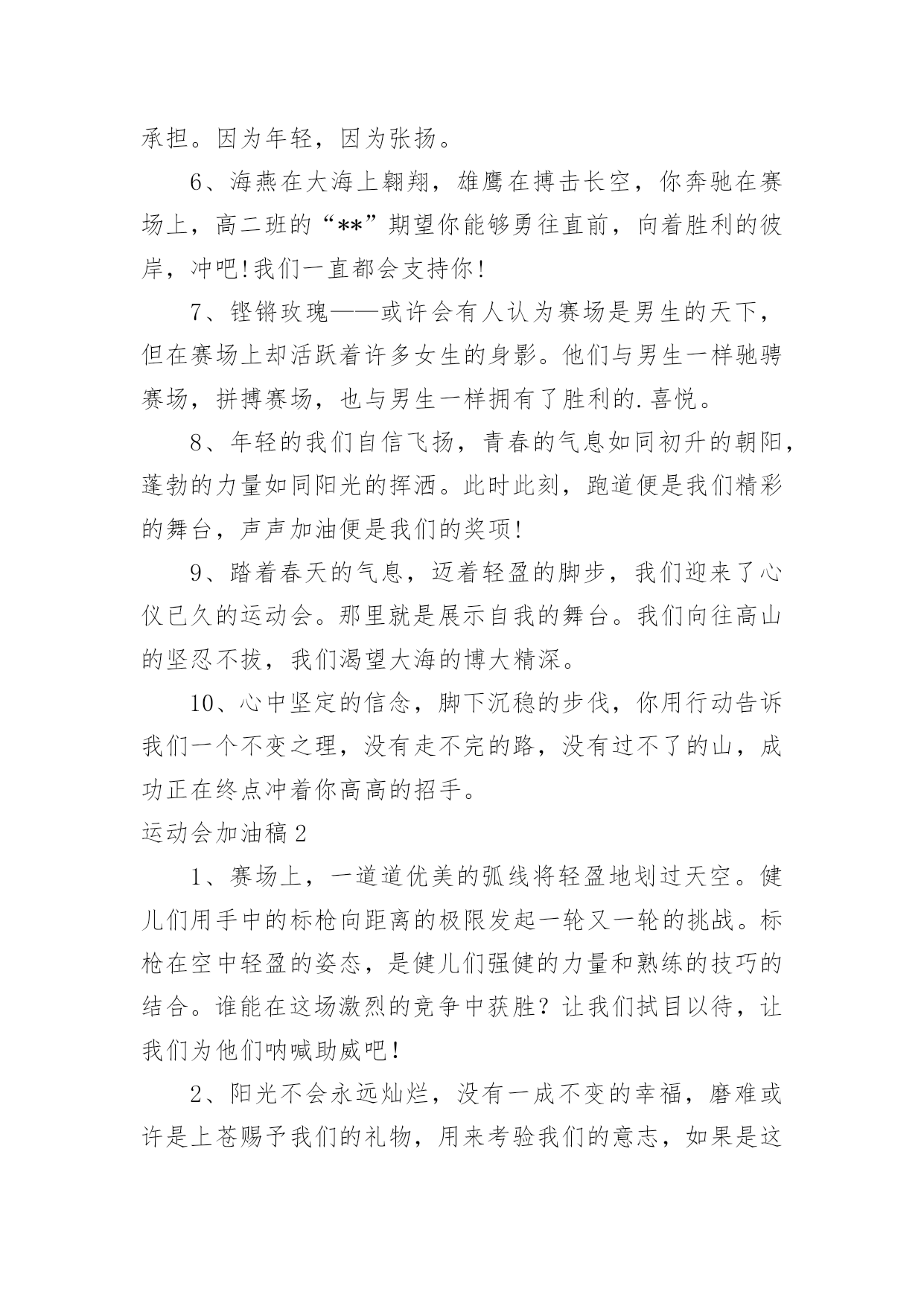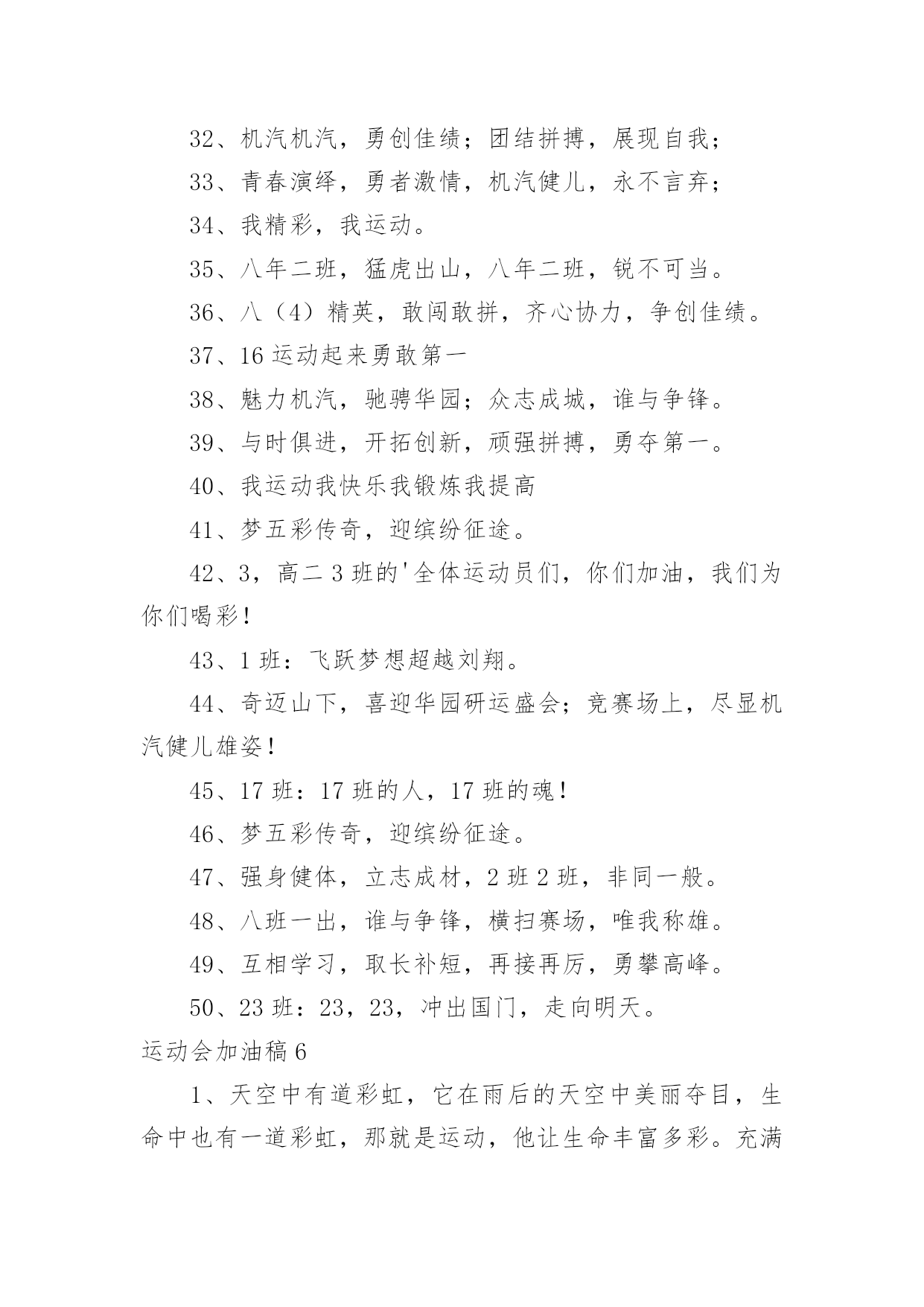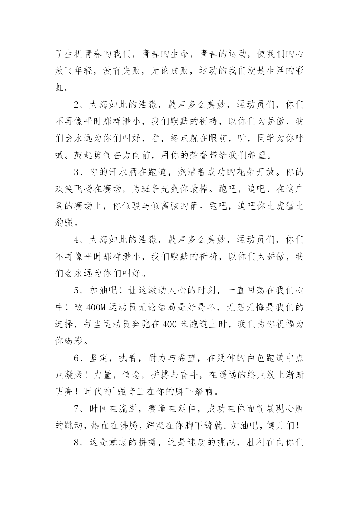 运动会加油稿运动会加油稿15篇在不断进步的时代,需要使用加油稿的场合越来越多,加油稿有着正向的鼓动作用。写起加油稿来就毫无头绪?以下是小编整理的运动会加油稿,仅供参考,希望能够帮助到大家。运动会加油稿11、漫漫长路,你愿一人独撑,忍受着孤独与寂寞,承受着体力与精神的压迫,只任汗水溶于泪水,可脚步却从不停歇。2、生活中,我们每一天都在尝试;我们走向成功,品味失败,走过心灵的阴雨晴空。运动员们,不要放下尝试,无论失败与否,重要的是你勇于参与的精神。3、泥泞的路走过无数,累了,告诉自我:快了,再坚持一会儿;身上的伤流出血来,疼了,告诉自我:别哭,会好的;摔倒了,告诉自我:快爬起来,世上很少有坦途。4、萧瑟的秋风,挡不住你们破竹的锐气,广阔的绿茵场,是为你们搭建的舞台。张扬吧,年轻的心,我们将为你永远喝彩!5、汗水,泪水;笑声,歌声;我们尽情挥洒。开幕式上,运动场上,我们尽情展现,多少艰辛,多少困苦,我们勇敢承担。因为年轻,因为张扬。6、海燕在大海上翱翔,雄鹰在搏击长空,你奔驰在赛场上,高二班的“**”期望你能够勇往直前,向着胜利的彼岸,冲吧!我们一直都会支持你!7、铿锵玫瑰——或许会有人认为赛场是男生的天下,但在赛场上却活跃着许多女生的身影。他们与男生一样驰骋赛场,拼搏赛场,也与男生一样拥有了胜利的.喜悦。8、年轻的我们自信飞扬,青春的气息如同初升的朝阳,蓬勃的力量如同阳光的挥洒。此时此刻,跑道便是我们精彩的舞台,声声加油便是我们的奖项!9、踏着春天的气息,迈着轻盈的脚步,我们迎来了心仪已久的运动会。那里就是展示自我的舞台。我们向往高山的坚忍不拔,我们渴望大海的博大精深。10、心中坚定的信念,脚下沉稳的步伐,你用行动告诉我们一个不变之理,没有走不完的路,没有过不了的山,成功正在终点冲着你高高的招手。运动会加油稿21、赛场上,一道道优美的弧线将轻盈地划过天空。健儿们用手中的标枪向距离的极限发起一轮又一轮的挑战。标枪在空中轻盈的姿态,是健儿们强健的力量和熟练的技巧的结合。谁能在这场激烈的竞争中获胜?让我们拭目以待,让我们为他们呐喊助威吧!2、阳光不会永远灿烂,没有一成不变的幸福,磨难或许是上苍赐予我们的礼物,用来考验我们的意志,如果是这样,就让我们微笑着应对生活。3、踏上跑道,是一种选择。离开起点,是一种勇气。驰骋赛场,是一种胜利。运动健将们,用你的实力,用你的精神,去开拓出,一片属于你的`长跑天地!一百米是个风狂的世界!4、亲爱的班健儿们,你们要充满自信。比赛中没有挡风的墙,没有遮风的伞,也没有撑船的帆,更没有拉船的纤。事在人为,人定胜天。原你们养精蓄锐,对充满爱意的世界说:“我自信,我拼搏,我会赢。5、奥林匹克精神佳,运动健将拼搏强。在运动场上的运动健儿们,发挥你们的特长,展示你们的风采,让你们的身影在运动场上留下优美的风景线,让你们的雄心壮志在运动场上发挥的淋漓尽致。6、你是体育宝座上的一颗灿烂夺目的珍珠,你是在蓝天中展翅飞翔的雏鹰。不要怕失败,不要怕冷落,无论何时,我们以你为荣。7、青春是不老的誓言,飞扬是年轻的梦想,金色的十月,让我们在这长长的跑道上青春飞扬,现出飒爽的风姿,亮出真我的风采,带上同学们的热情,载着同伴们的期望,背负老师的嘱托,在这活力四射的校园里,放飞你的青春活力和运动激情。8、在同一片晴空下,我们相聚一齐,或欢乐、或失落、或兴奋、或悲伤,尽数写在我们的脸旁。我们曾一齐悲伤,在那个败北的沙坑上;我们也一齐击掌,在这红色的跑道上。在同一片晴空下,我们拼搏,为美丽的目标;我们奋斗,为班级的辉煌。这就是团结、奋进、礼貌的03企管班。9、Ibelieve,成功是一幅诱人的蓝图,滴滴汗珠,才能把它绘出;Ibelieve,失败是一剂苦口良药,经历风雨,才能见到彩虹;Ibelieve,命运不能将我们摆布,年轻的心永不服输,我们笑着应对挑战,笑着比赛,互相祝福!10、运动员们,你们就像一只飞鸟一样,为自己的目标而不放下任何一点期望。在这么闷热的时候,在这么激动的时刻,我们为你们而欢呼,你们是最棒的,要相信自己,不管结果如何,只要你们努力拼搏,努力为自己的目标而奋斗,我们相信,胜利的结果永远属于你们,努力地向前冲吧!运动会加油稿3每一份辛劳都有一份收获,每一次的痛苦都是快乐的开始,没一声呐喊都是力量的'呼唤。我们有着大浪拍岸的豪迈,所以你不必在乎小荷初露的恬静。我们有着春日的阳光明媚,所以不用去羡慕冬日乱玉碎琼。我们是雨天的一把伞,是寒冷冬日里的一盆碳火,温暖的不只是你我,而是大家的心。运动场上的健儿,掌声属于你们,鲜花属于你们,成功也是属于你们!运动会加油稿41.致运动员400米的跑道上,你正在飞驰,面对如此遥远的路途,你也许腿脚发麻,你也许有些茫然。但你可知道,在你身后,有同学们一双双期待的眼睛;在你身后,是你日日苦练的