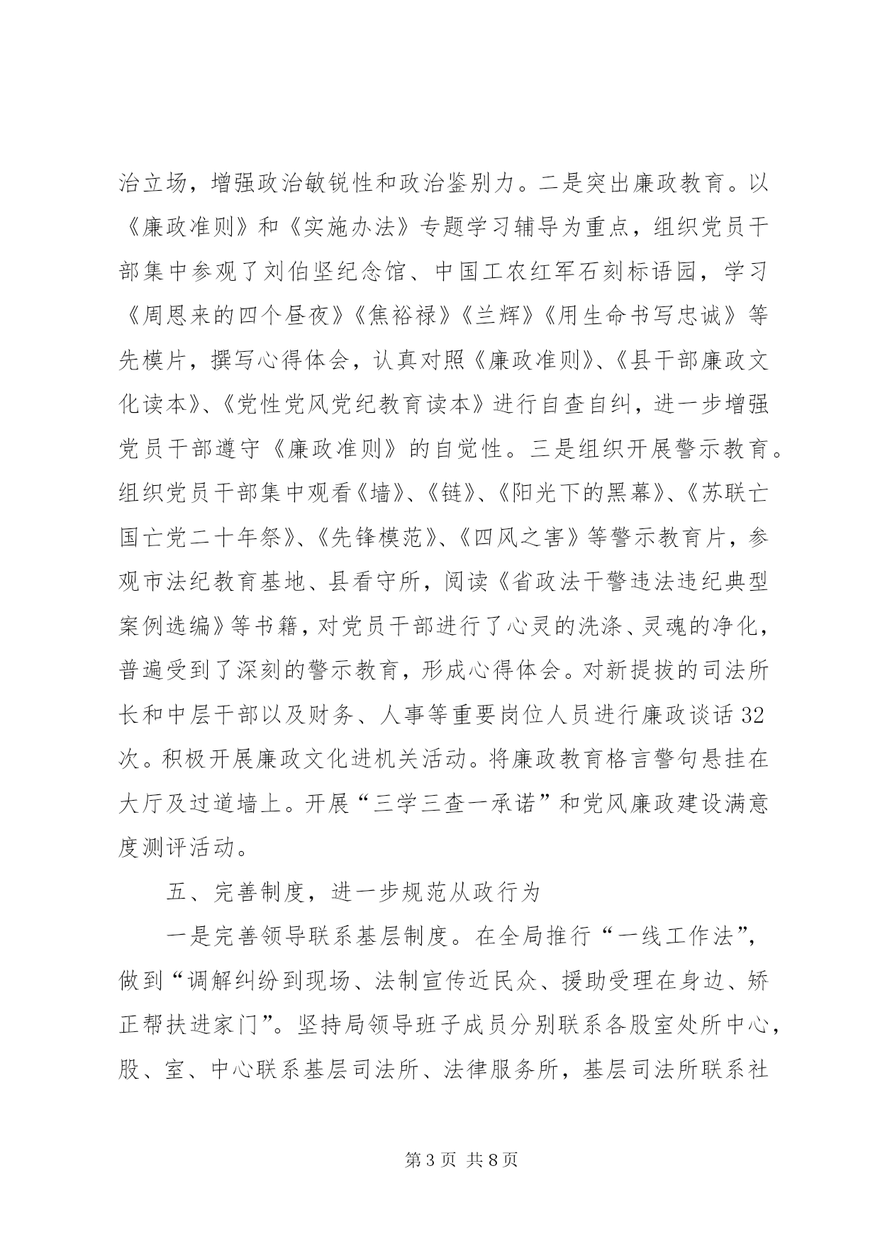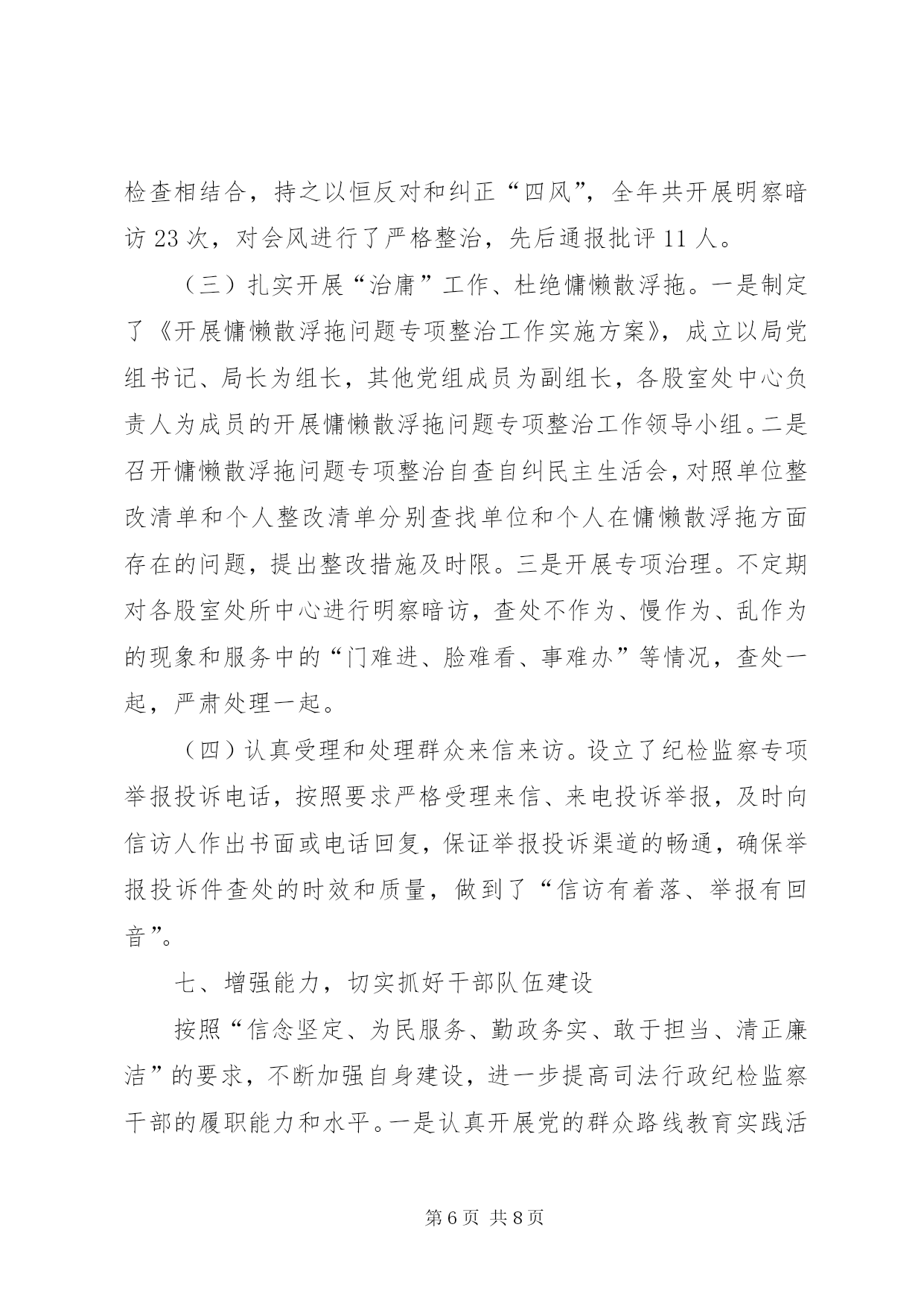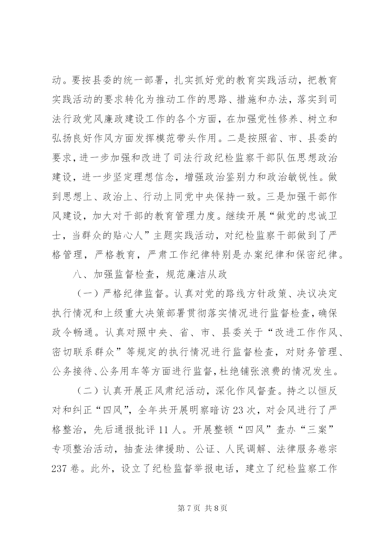 第PAGE\*Arabic\*MERGEFORMAT8页共NUMPAGES\*MERGEFORMAT8页司法纪检监察工作总结2014年,县司法局纪检监察工作在县纪委的正确领导下,认真贯彻党的十八大、十八届三中、四中全会精神、中央纪委十八届三次、四次全会、省纪委十届三次全会、市纪委三届四次全会XX县区纪委十二届四次全会精神,积极开展“转职能、转方式、转作风”,认真落实“两个责任”,圆满完成了各项目标任务。一、完善责任机制,明晰责任分工年初制定了《2014年度党风廉政建设和反腐败工作要点》、《2014年党风廉政建设和反腐败工作任务分解表》、《县司法局廉政风险排查及防控措施一览表》、《建立健全作风建设长效机制及加强党员干部教育管理监督责任分工方案》,成立了以局党组书记、局长为组长,局党组他成员为副组长,股、室、处、中心负责人为成员的司法局党风廉政建设领导小组,明确了“一把手”负总责,班子成员“一岗双责”和股、处、室、所负责人共同负责的责任体系。与班子成员签订了《党风廉政建设责任书》,与各股、室、处、所、中心负责人签订了《廉洁从政承诺书》。二、落实“两个责任”,狠抓作风建设制定《中共县司法局党组关于落实“两个责任”推进正风肃纪工作方案》,明确局党组担负党风廉政建设及作风建设的主体责任,一把手承担第一责任人的责任,班子成员承担分管工作的主要领导责任,局纪检承担监督责任,实行“一岗双责”。局党组书记和纪检组长分别签订《履行党风廉政建设主体责任承诺书》和《履行党风廉政建设监督责任承诺书》,局党组书记签订《2014年度党风廉政建设目标责任书》,副科级、正科级领导干部签订《领导干部拒收不送红包礼金承诺书》,自觉履行工作职责,坚决遏制腐败势头,做到“作风建设常抓不懈,反腐倡廉警钟长鸣”,持之以恒,抓铁有痕,踏石留印,不断开创党风廉政建设和反腐败工作的新局面。三、认真落实“三转”,确保专职专用严格按照“转职能、转方式、转作风”要求,年初制定《局党政领导班子成员分工》文件,做到内部分工明确、专职专用、纪检组长不分管与履行监督职责相冲突业务工作,从领导班子、一把手、班子成员、纪检监督到股、室、处、所、中心负责人及每名干部职工,层层落实责任制,做到了一级抓一级,层层抓落实,活动部署有领导,纪律监督有制约,阶段工作有推进,专人负责有落实。四、突出重点,深入开展反腐倡廉宣传教育一是加强政治纪律教育。利用每周集中学习会议,强化政治学习,组织学习十八大、十八届三中、四中全会精神、中央纪委十八届三次、四次全会、省纪委十届三次全会、市纪委三届四次全会XX县区纪委十二届四次全会精神,引导广大党员干部增强党的意识、宗旨意识、执政意识、大局意识、责任意识,坚定政治立场,增强政治敏锐性和政治鉴别力。二是突出廉政教育。以《廉政准则》和《实施办法》专题学习辅导为重点,组织党员干部集中参观了刘伯坚纪念馆、中国工农红军石刻标语园,学习《周恩来的四个昼夜》《焦裕禄》《兰辉》《用生命书写忠诚》等先模片,撰写心得体会,认真对照《廉政准则》、《县干部廉政文化读本》、《党性党风党纪教育读本》进行自查自纠,进一步增强党员干部遵守《廉政准则》的自觉性。三是组织开展警示教育。组织党员干部集中观看《墙》、《链》、《阳光下的黑幕》、《苏联亡国亡党二十年祭》、《先锋模范》、《四风之害》等警示教育片,参观市法纪教育基地、县看守所,阅读《省政法干警违法违纪典型案例选编》等书籍,对党员干部进行了心灵的洗涤、灵魂的净化,普遍受到了深刻的警示教育,形成心得体会。对新提拔的司法所长和中层干部以及财务、人事等重要岗位人员进行廉政谈话32次。积极开展廉政文化进机关活动。将廉政教育格言警句悬挂在大厅及过道墙上。开展“三学三查一承诺”和党风廉政建设满意度测评活动。五、完善制度,进一步规范从政行为一是完善领导联系基层制度。在全局推行“一线工作法”,做到“调解纠纷到现场、法制宣传近民众、援助受理在身边、矫正帮扶进家门”。坚持局领导班子成员分别联系各股室处所中心,股、室、中心联系基层司法所、法律服务所,基层司法所联系社区(村)等制度。二是拓展领导联系基层工作内涵。发挥领导联系点对接基层、贴近群众的有利条件,组织干警走访服务,用工作实践引领全局同志主动转变作风、密切联系群众,用优良的党风促政风、带行风转变。三是创新学廉倡廉促廉机制。制定《2014年廉政文化建设实施方案》、《廉政文化“进机关”活动实施方案》、《干部廉洁谈话制度》,积极推行常态学习制度,实行重要节日教育制度,推行“学习教育常思廉、工作生活常话廉、开展活动常颂廉、典型警示常扬廉、重点节假常送廉、监督巡查常促廉”,在全局营造风清气正的学廉倡廉促廉文化氛围。四是严格执行民主集中制。制定《“三重一大事项集体决策制度”“主要领导四个不直接分管制度”和“