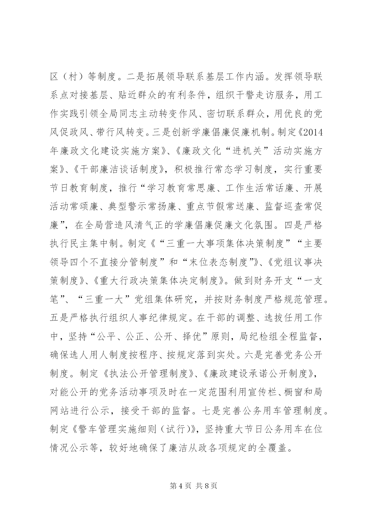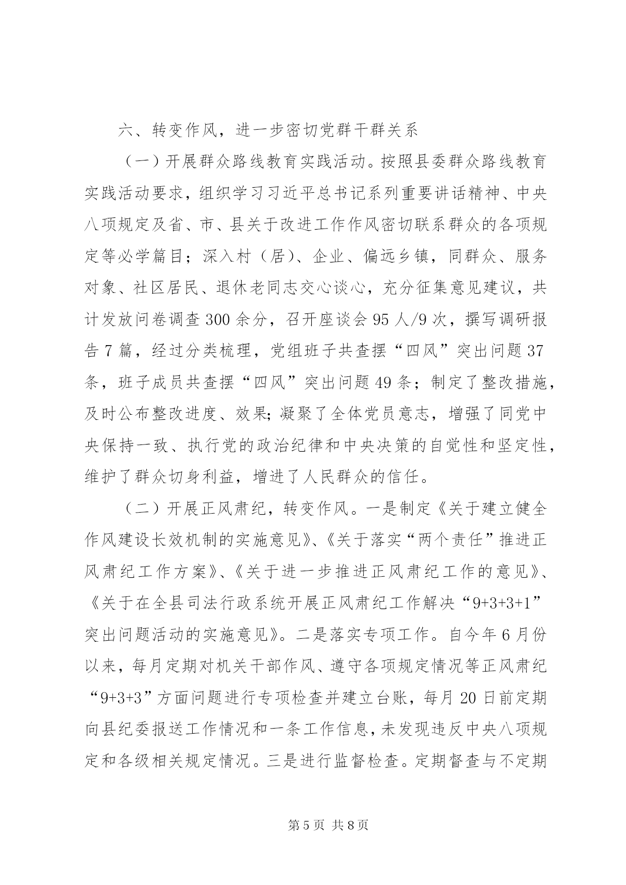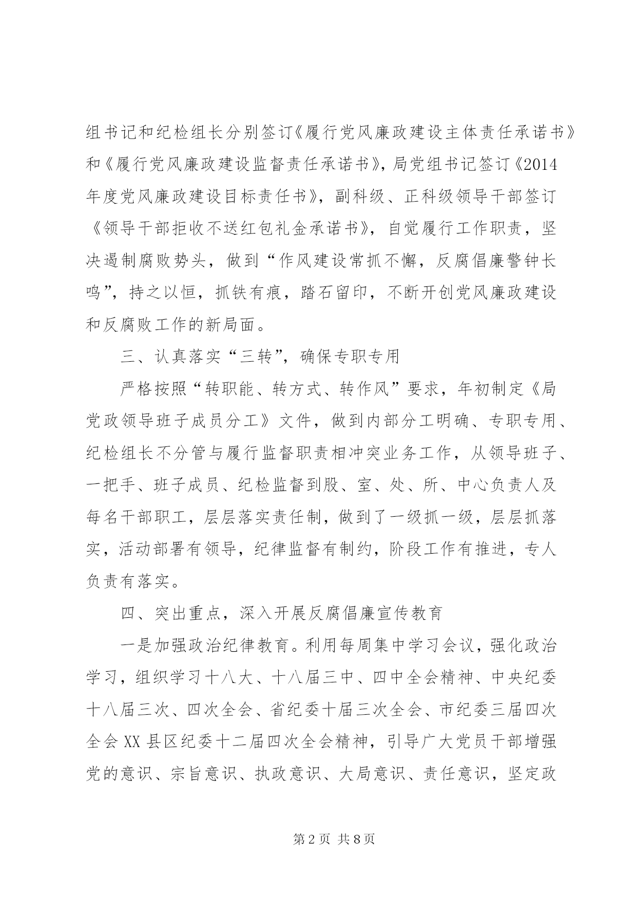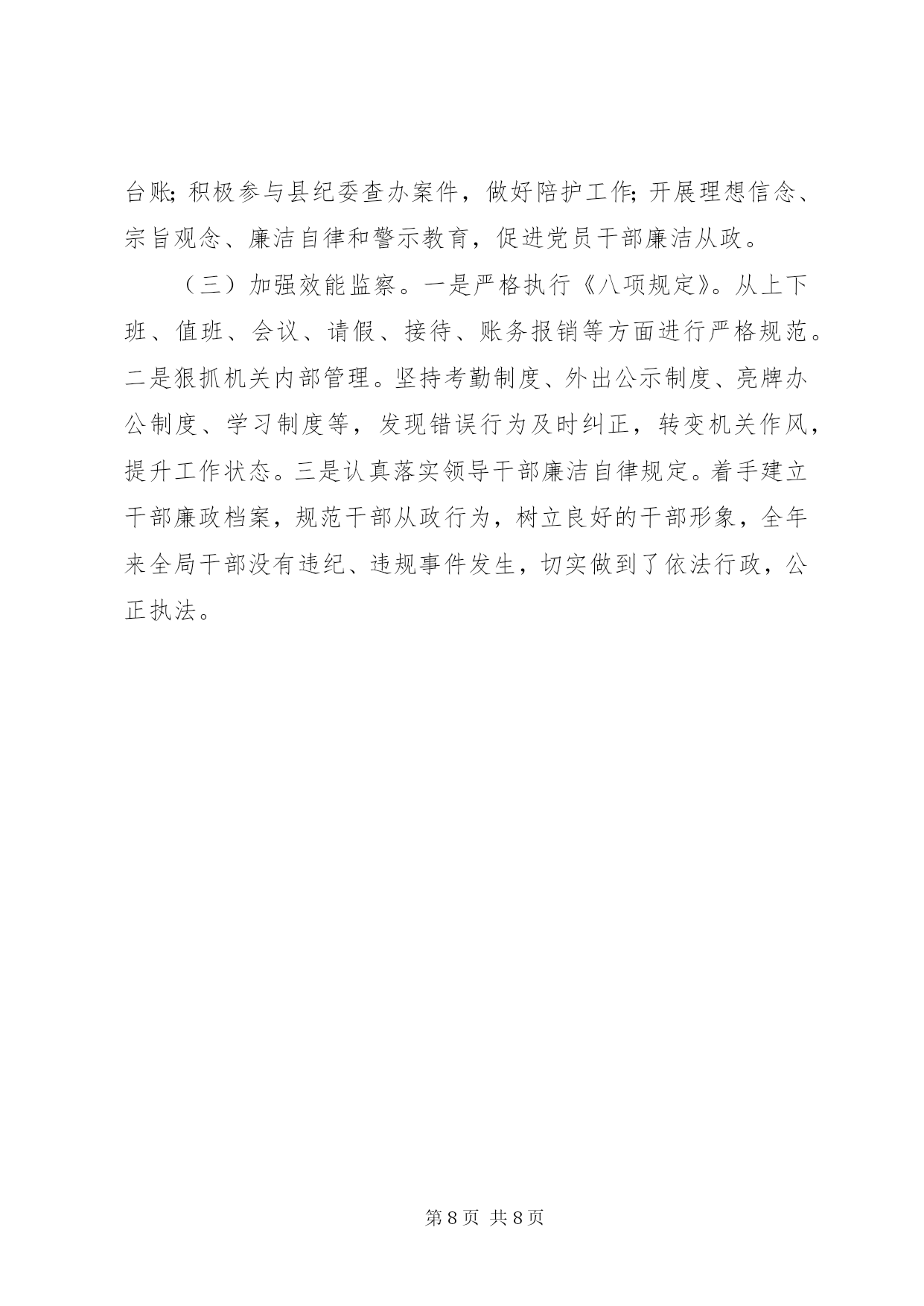第PAGE\*Arabic\*MERGEFORMAT8页共NUMPAGES\*MERGEFORMAT8页司法纪检监察工作总结2014年,县司法局纪检监察工作在县纪委的正确领导下,认真贯彻党的十八大、十八届三中、四中全会精神、中央纪委十八届三次、四次全会、省纪委十届三次全会、市纪委三届四次全会XX县区纪委十二届四次全会精神,积极开展“转职能、转方式、转作风”,认真落实“两个责任”,圆满完成了各项目标任务。一、完善责任机制,明晰责任分工年初制定了《2014年度党风廉政建设和反腐败工作要点》、《2014年党风廉政建设和反腐败工作任务分解表》、《县司法局廉政风险排查及防控措施一览表》、《建立健全作风建设长效机制及加强党员干部教育管理监督责任分工方案》,成立了以局党组书记、局长为组长,局党组他成员为副组长,股、室、处、中心负责人为成员的司法局党风廉政建设领导小组,明确了“一把手”负总责,班子成员“一岗双责”和股、处、室、所负责人共同负责的责任体系。与班子成员签订了《党风廉政建设责任书》,与各股、室、处、所、中心负责人签订了《廉洁从政承诺书》。二、落实“两个责任”,狠抓作风建设制定《中共县司法局党组关于落实“两个责任”推进正风肃纪工作方案》,明确局党组担负党风廉政建设及作风建设的主体责任,一把手承担第一责任人的责任,班子成员承担分管工作的主要领导责任,局纪检承担监督责任,实行“一岗双责”。局党组书记和纪检组长分别签订《履行党风廉政建设主体责任承诺书》和《履行党风廉政建设监督责任承诺书》,局党组书记签订《2014年度党风廉政建设目标责任书》,副科级、正科级领导干部签订《领导干部拒收不送红包礼金承诺书》,自觉履行工作职责,坚决遏制腐败势头,做到“作风建设常抓不懈,反腐倡廉警钟长鸣”,持之以恒,抓铁有痕,踏石留印,不断开创党风廉政建设和反腐败工作的新局面。三、认真落实“三转”,确保专职专用严格按照“转职能、转方式、转作风”要求,年初制定《局党政领导班子成员分工》文件,做到内部分工明确、专职专用、纪检组长不分管与履行监督职责相冲突业务工作,从领导班子、一把手、班子成员、纪检监督到股、室、处、所、中心负责人及每名干部职工,层层落实责任制,做到了一级抓一级,层层抓落实,活动部署有领导,纪律监督有制约,阶段工作有推进,专人负责有落实。四、突出重点,深入开展反腐倡廉宣传教育一是加强政治纪律教育。利用每周集中学习会议,强化政治学习,组织学习十八大、十八届三中、四中全会精神、中央纪委十八届三次、四次全会、省纪委十届三次全会、市纪委三届四次全会XX县区纪委十二届四次全会精神,引导广大党员干部增强党的意识、宗旨意识、执政意识、大局意识、责任意识,坚定政治立场,增强政治敏锐性和政治鉴别力。二是突出廉政教育。以《廉政准则》和《实施办法》专题学习辅导为重点,组织党员干部集中参观了刘伯坚纪念馆、中国工农红军石刻标语园,学习《周恩来的四个昼夜》《焦裕禄》《兰辉》《用生命书写忠诚》等先模片,撰写心得体会,认真对照《廉政准则》、《县干部廉政文化读本》、《党性党风党纪教育读本》进行自查自纠,进一步增强党员干部遵守《廉政准则》的自觉性。三是组织开展警示教育。组织党员干部集中观看《墙》、《链》、《阳光下的黑幕》、《苏联亡国亡党二十年祭》、《先锋模范》、《四风之害》等警示教育片,参观市法纪教育基地、县看守所,阅读《省政法干警违法违纪典型案例选编》等书籍,对党员干部进行了心灵的洗涤、灵魂的净化,普遍受到了深刻的警示教育,形成心得体会。对新提拔的司法所长和中层干部以及财务、人事等重要岗位人员进行廉政谈话32次。积极开展廉政文化进机关活动。将廉政教育格言警句悬挂在大厅及过道墙上。开展“三学三查一承诺”和党风廉政建设满意度测评活动。五、完善制度,进一步规范从政行为一是完善领导联系基层制度。在全局推行“一线工作法”,做到“调解纠纷到现场、法制宣传近民众、援助受理在身边、矫正帮扶进家门”。坚持局领导班子成员分别联系各股室处所中心,股、室、中心联系基层司法所、法律服务所,基层司法所联系社区(村)等制度。二是拓展领导联系基层工作内涵。发挥领导联系点对接基层、贴近群众的有利条件,组织干警走访服务,用工作实践引领全局同志主动转变作风、密切联系群众,用优良的党风促政风、带行风转变。三是创新学廉倡廉促廉机制。制定《2014年廉政文化建设实施方案》、《廉政文化“进机关”活动实施方案》、《干部廉洁谈话制度》,积极推行常态学习制度,实行重要节日教育制度,推行“学习教育常思廉、工作生活常话廉、开展活动常颂廉、典型警示常扬廉、重点节假常送廉、监督巡查常促廉”,在全局营造风清气正的学廉倡廉促廉文化氛围。四是严格执行民主集中制。制定《“三重一大事项集体决策制度”“主要领导四个不直接分管制度”和“