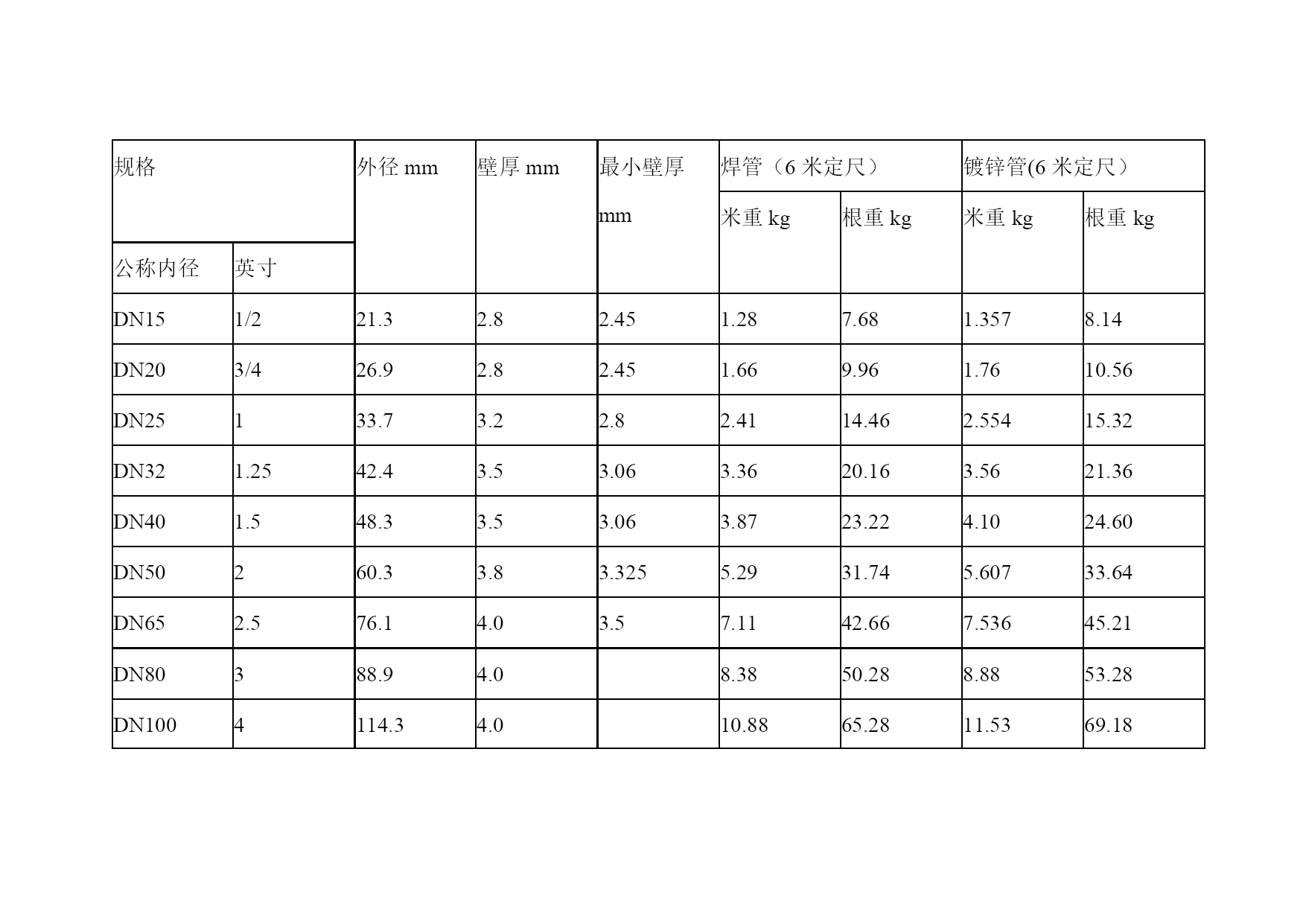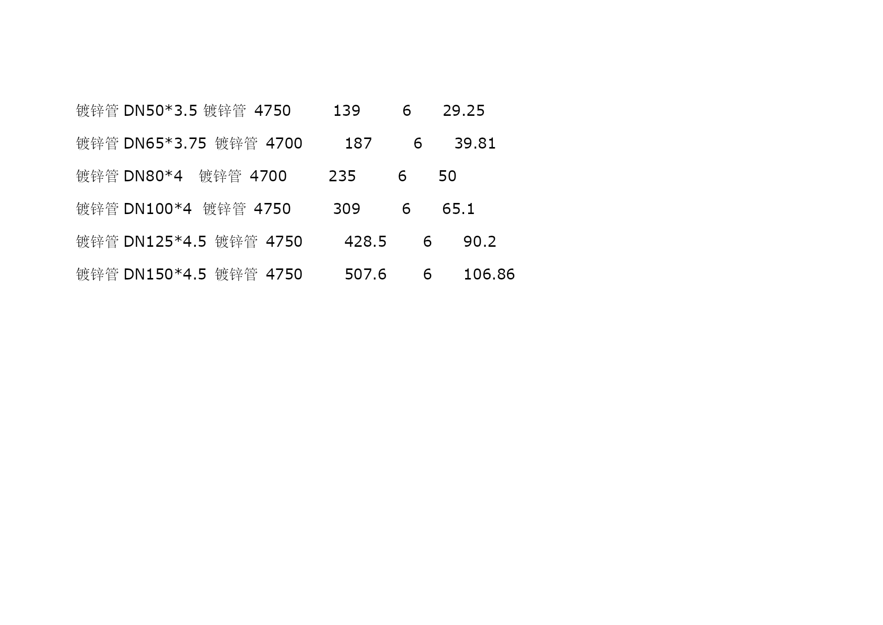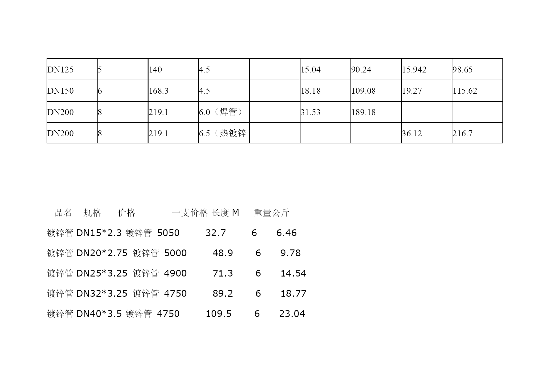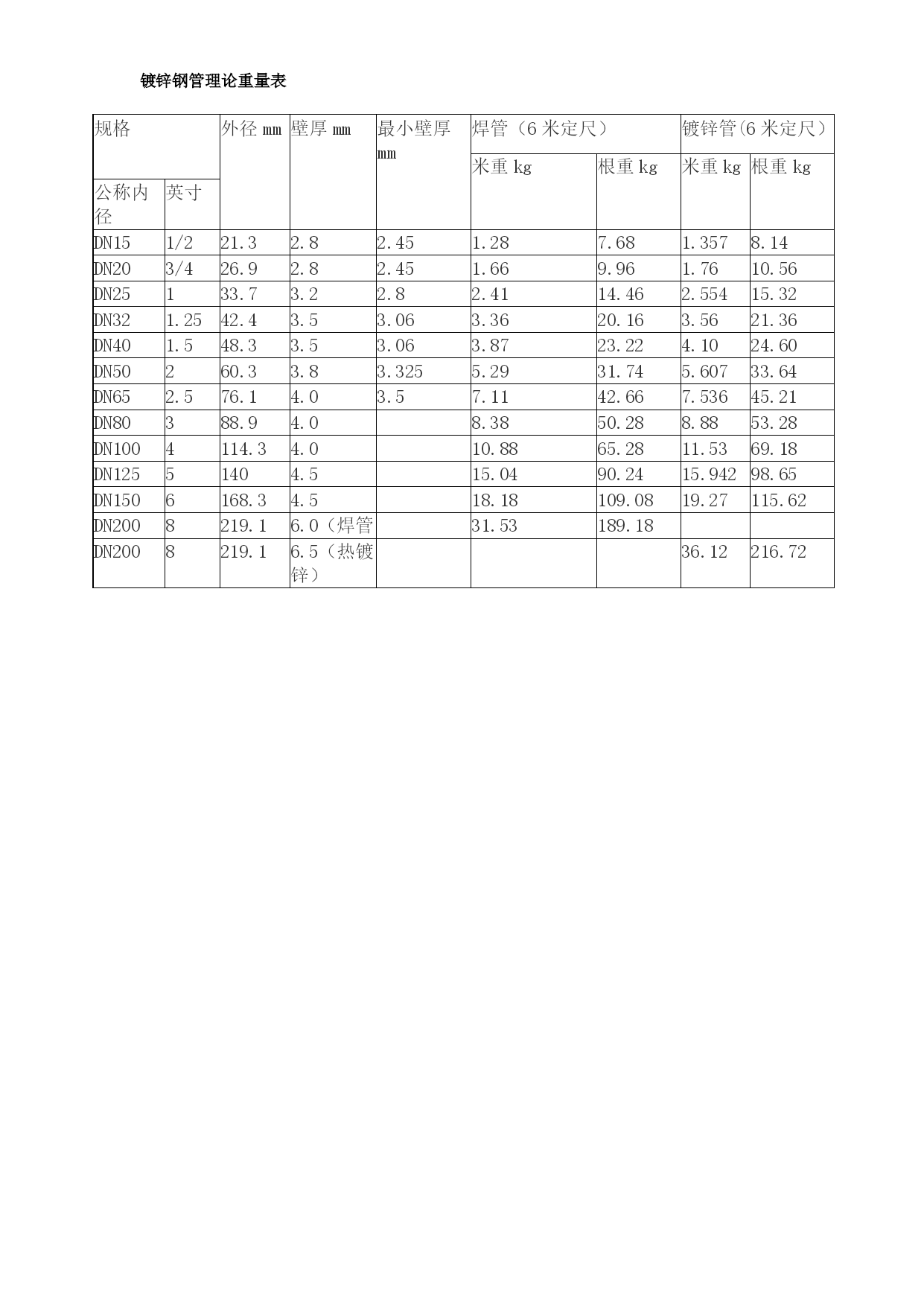 镀锌管理论重量表最新文档(可以直接使用,可编辑最新文档,欢迎下载)镀锌管理论重量表(按GB/T3091—2001标准执行)规格外径mm壁厚mm最小壁厚mm焊管(6米定尺)镀锌管(6米定尺)米重kg根重kg米重kg根重kg公称内径英寸DN151/221.32.82.451.287.681.3578.14DN203/426.92.82.451.669.961.7610.56DN25133.73.22.82.4114.462.55415.32DN321.2542.43.53.063.3620.163.5621.36DN401.548.33.53.063.8723.224.1024.60DN50260.33.83.3255.2931.745.60733.64DN652.576.14.03.57.1142.667.53645.21DN80388.94.08.3850.288.8853.28DN1004114.34.010.8865.2811.5369.18DN12551404.515.0490.2415.94298.65DN1506168.34.518.18109.0819.27115.62DN2008219.16.0(焊管)31.53189.18DN2008219.16.5(热镀锌)36.12216.7品名规格价格一支价格长度M重量公斤镀锌管DN15*2.3镀锌管505032.766.46镀锌管DN20*2.75镀锌管500048.969.78镀锌管DN25*3.25镀锌管490071.3614.54镀锌管DN32*3.25镀锌管475089.2618.77镀锌管DN40*3.5镀锌管4750109.5623.04镀锌管DN50*3.5镀锌管4750139629.25镀锌管DN65*3.75镀锌管4700187639.81镀锌管DN80*4镀锌管4700235650镀锌管DN100*4镀锌管4750309665.1镀锌管DN125*4.5镀锌管4750428.5690.2镀锌管DN150*4.5镀锌管4750507.66106.86镀锌钢管理论重量表规格外径mm壁厚mm最小壁厚mm焊管(6米定尺)镀锌管(6米定尺)米重kg根重kg米重kg根重kg公称内径英寸DN151/221.32.82.451.287.681.3578.14DN203/426.92.82.451.669.961.7610.56DN25133.73.22.82.4114.462.55415.32DN321.2542.43.53.063.3620.163.5621.36DN401.548.33.53.063.8723.224.1024.60DN50260.33.83.3255.2931.745.60733.64DN652.576.14.03.57.1142.667.53645.21DN80388.94.08.3850.288.8853.28DN1004114.34.010.8865.2811.5369.18DN12551404.515.0490.2415.94298.65DN1506168.34.518.18109.0819.27115.62DN2008219.16.0(焊管)31.53189.18DN2008219.16.5(热镀锌)36.12216.72角钢理论重量表发布日期:2009-06-01型号尺寸(mm)长度(m)理论重量(kg/m)边宽边厚220343-90.8891.1452.525343-91.1241.45933030343-91.3731.7863.6363453-91.6562.1632.6544403453-91.8522.4222.9764.54534564-122.0882.7363.3693.98555034564-122.3323.0593.7704.4655.65634584-122.6243.4464.2516.5686.3634568104-123.9074.8225.7217.4699.151770456784-124.3725.3976.4067.3988.3737.5755678104-125.8186.9057.9769.03011.0898805678104-126.2117.3768.5259.65811.87499067810124-198.3509.65610.94613.47615.94010100678101214169.36610.83012.27615.12017.89820.61123.25711110781012144-1911.92813.53216.69019.78222.80912.51251012144-1919.13322.6962