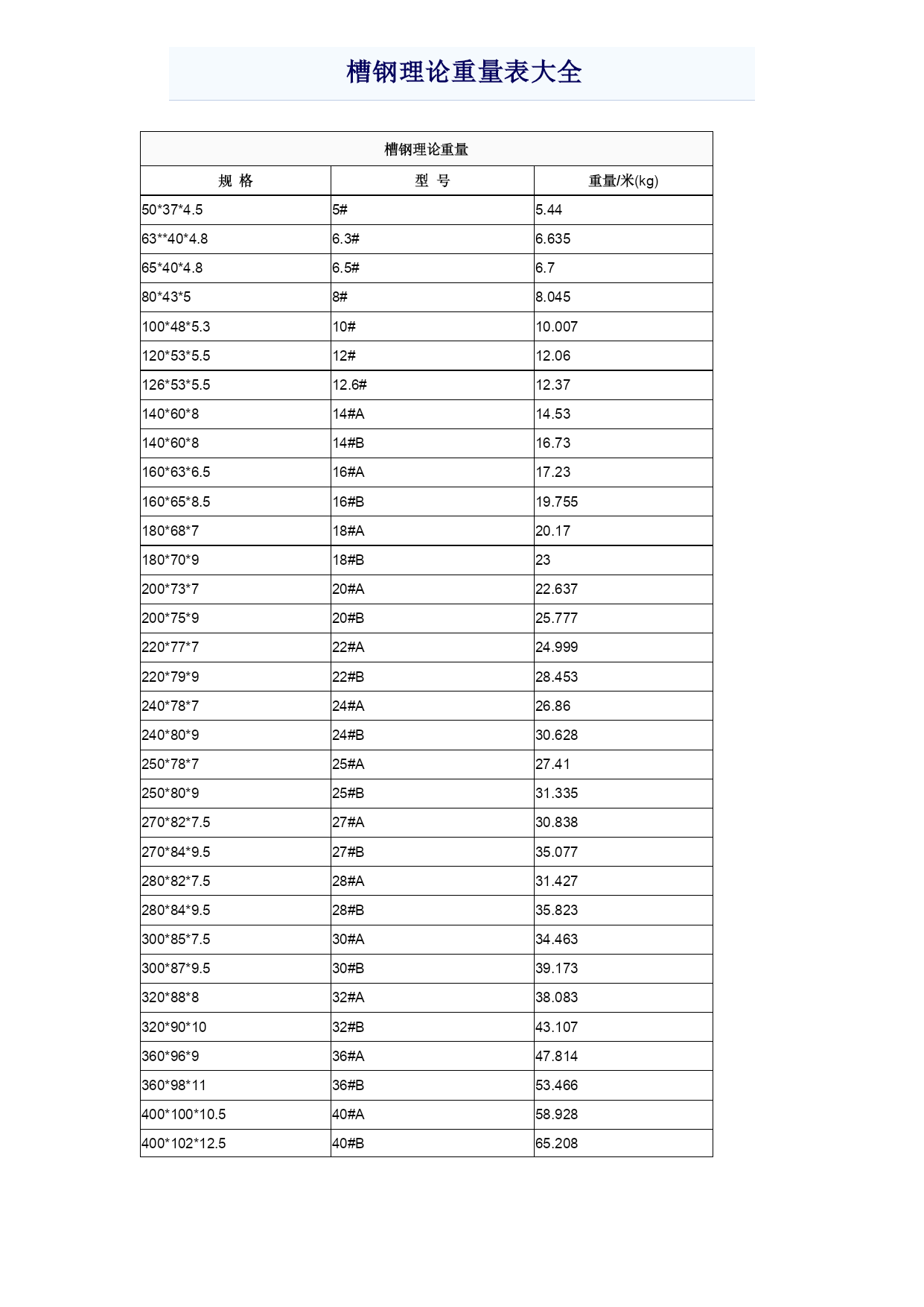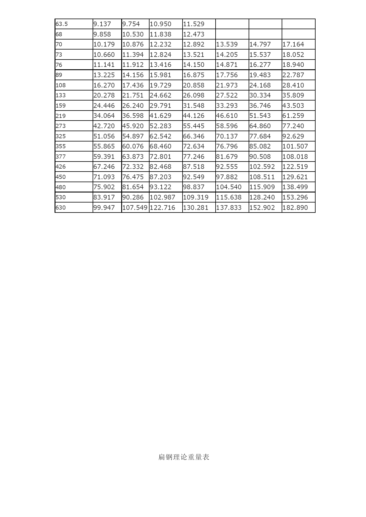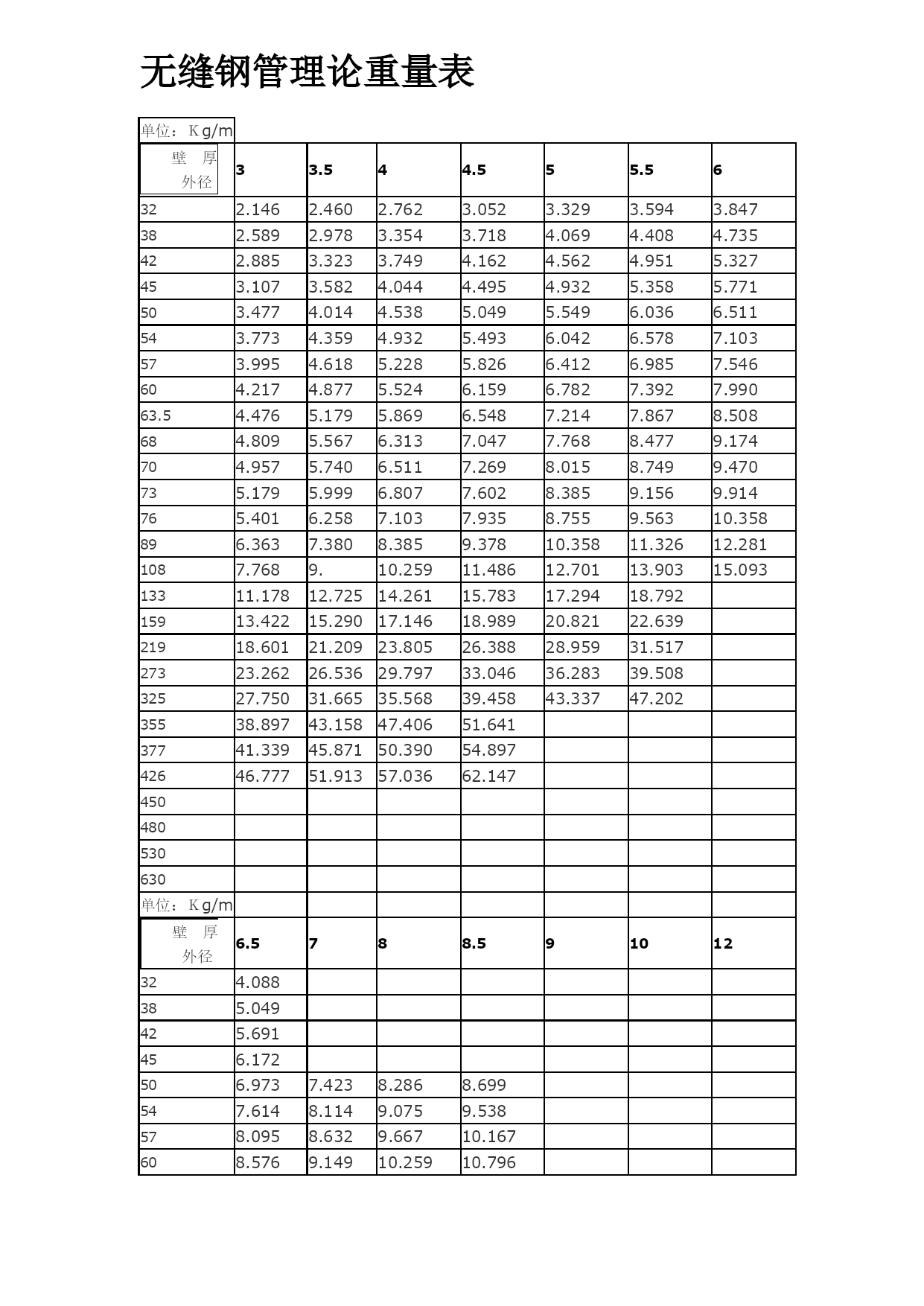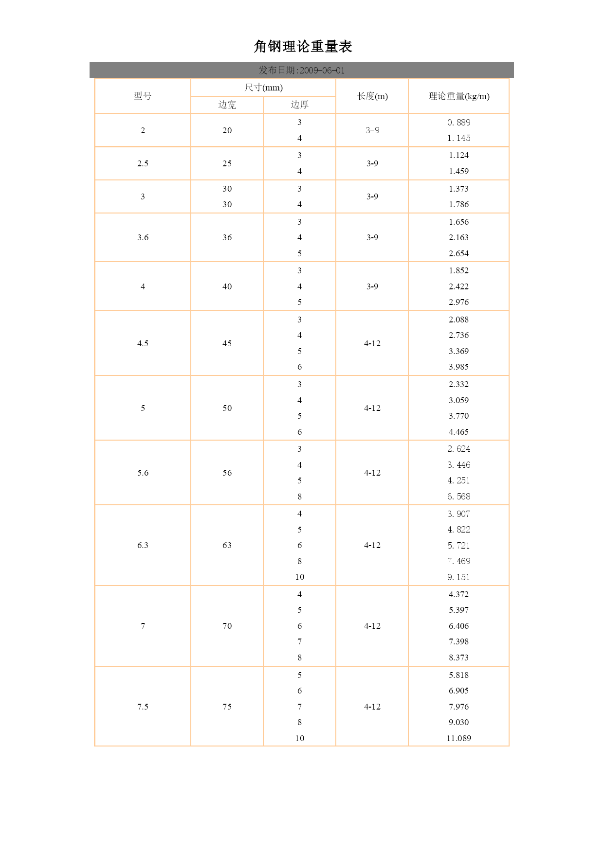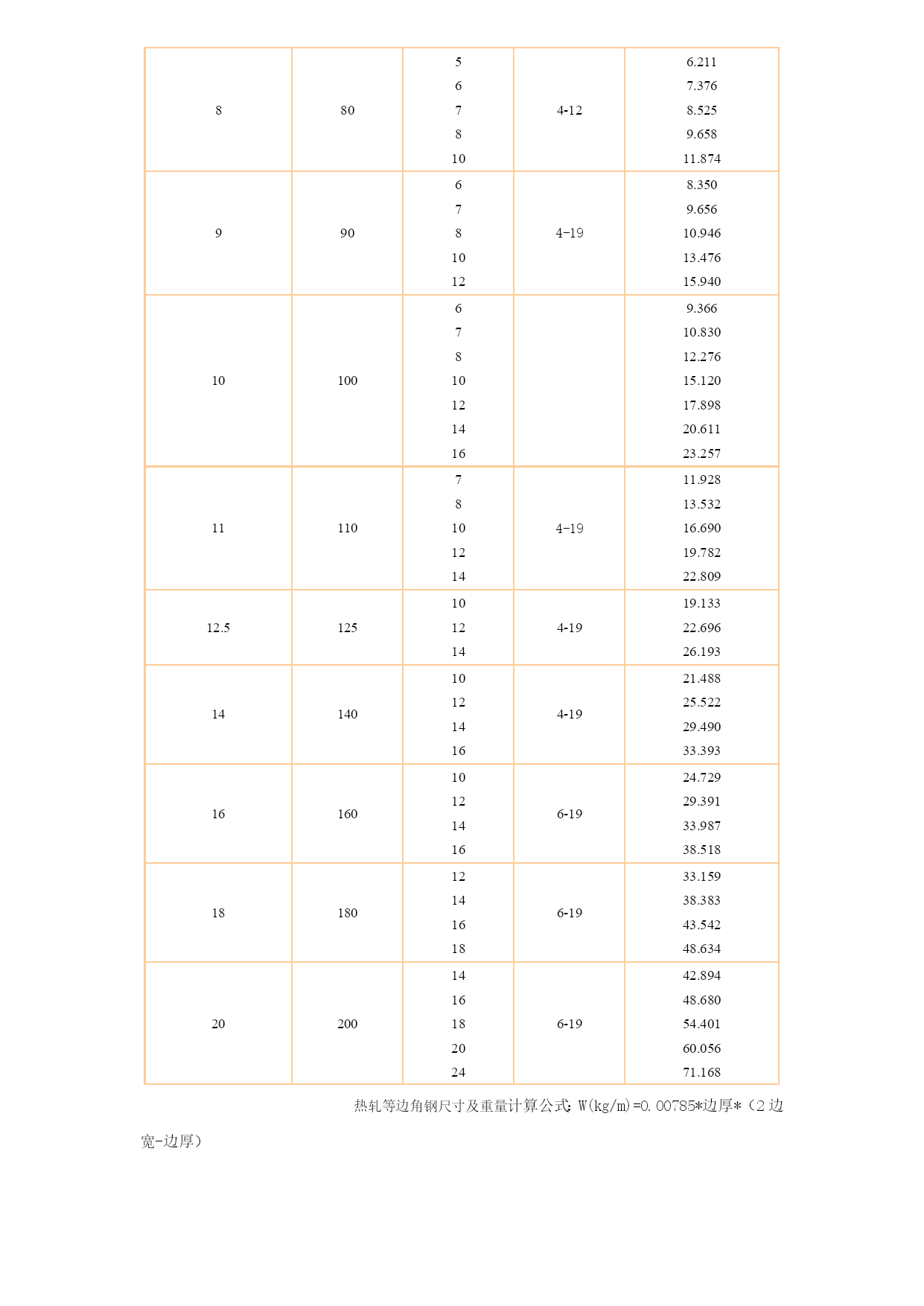 镀锌管理论重量表最新文档(可以直接使用,可编辑最新文档,欢迎下载)镀锌管理论重量表(按GB/T3091—2001标准执行)规格外径mm壁厚mm最小壁厚mm焊管(6米定尺)镀锌管(6米定尺)米重kg根重kg米重kg根重kg公称内径英寸DN151/221.32.82.451.287.681.3578.14DN203/426.92.82.451.669.961.7610.56DN25133.73.22.82.4114.462.55415.32DN321.2542.43.53.063.3620.163.5621.36DN401.548.33.53.063.8723.224.1024.60DN50260.33.83.3255.2931.745.60733.64DN652.576.14.03.57.1142.667.53645.21DN80388.94.08.3850.288.8853.28DN1004114.34.010.8865.2811.5369.18DN12551404.515.0490.2415.94298.65DN1506168.34.518.18109.0819.27115.62DN2008219.16.0(焊管)31.53189.18DN2008219.16.5(热镀锌)36.12216.7品名规格价格一支价格长度M重量公斤镀锌管DN15*2.3镀锌管505032.766.46镀锌管DN20*2.75镀锌管500048.969.78镀锌管DN25*3.25镀锌管490071.3614.54镀锌管DN32*3.25镀锌管475089.2618.77镀锌管DN40*3.5镀锌管4750109.5623.04镀锌管DN50*3.5镀锌管4750139629.25镀锌管DN65*3.75镀锌管4700187639.81镀锌管DN80*4镀锌管4700235650镀锌管DN100*4镀锌管4750309665.1镀锌管DN125*4.5镀锌管4750428.5690.2镀锌管DN150*4.5镀锌管4750507.66106.86镀锌钢管理论重量表规格外径mm壁厚mm最小壁厚mm焊管(6米定尺)镀锌管(6米定尺)米重kg根重kg米重kg根重kg公称内径英寸DN151/221.32.82.451.287.681.3578.14DN203/426.92.82.451.669.961.7610.56DN25133.73.22.82.4114.462.55415.32DN321.2542.43.53.063.3620.163.5621.36DN401.548.33.53.063.8723.224.1024.60DN50260.33.83.3255.2931.745.60733.64DN652.576.14.03.57.1142.667.53645.21DN80388.94.08.3850.288.8853.28DN1004114.34.010.8865.2811.5369.18DN12551404.515.0490.2415.94298.65DN1506168.34.518.18109.0819.27115.62DN2008219.16.0(焊管)31.53189.18DN2008219.16.5(热镀锌)36.12216.72角钢理论重量表发布日期:2009-06-01型号尺寸(mm)长度(m)理论重量(kg/m)边宽边厚220343-90.8891.1452.525343-91.1241.45933030343-91.3731.7863.6363453-91.6562.1632.6544403453-91.8522.4222.9764.54534564-122.0882.7363.3693.98555034564-122.3323.0593.7704.4655.65634584-122.6243.4464.2516.5686.3634568104-123.9074.8225.7217.4699.151770456784-124.3725.3976.4067.3988.3737.5755678104-125.8186.9057.9769.03011.0898805678104-126.2117.3768.5259.65811.87499067810124-198.3509.65610.94613.47615.94010100678101214169.36610.83012.27615.12017.89820.61123.25711110781012144-1911.92813.53216.69019.78222.80912.51251012144-1919.13322.6962