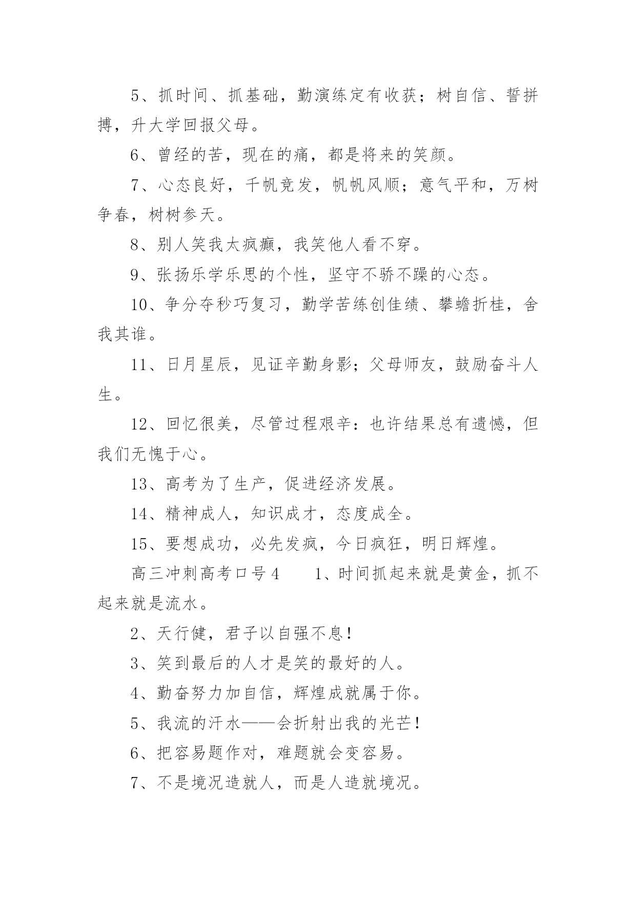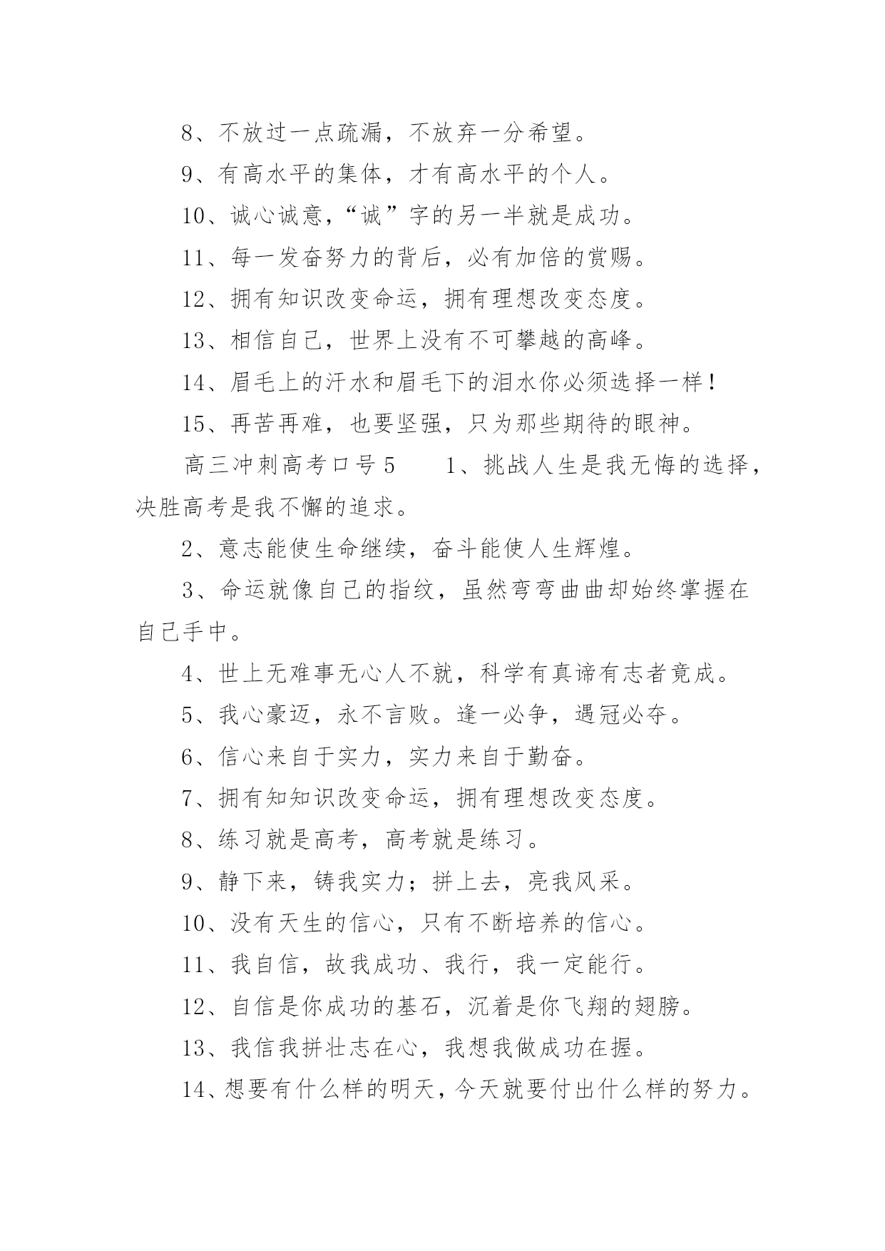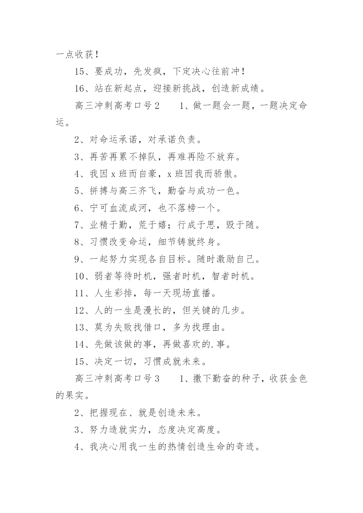 高三冲刺高考口号高三冲刺高考口号(通用5篇)在学习、工作、生活中,大家总少不了接触一些耳熟能详的口号吧,口号在句式上,除了简短,容易记忆之外,还要容易念,容易传。你还在找寻优秀经典的口号吗?以下是小编精心整理的高三冲刺高考口号(通用5篇),仅供参考,大家一起来看看吧。高三冲刺高考口号11、拧成一股绳,搏尽一份力,狠下一条心,共圆一个梦。2、把汗水变成珍珠,把梦想变成现实!3、精神成就事业,态度决定一切。4、静下来,铸我实力;拼上去,亮我风采。5、人活着要呼吸。呼者,出一口气;吸者,争一口气。6、眼泪不是我们的答案,拼搏才是我们的选择。7、拼一载春秋,搏一生无悔。8、拼一分高一分,一分成就终生。9、做一题会一题,一题决定命运。10、贵在坚持、难在坚持、成在坚持11、不苦不累,高三无味;不拼不搏,等于白活。12、忘时,忘物,忘我。诚实,朴实,踏实。13、遇难心不慌,遇易心更细。14、每天都是一个起点,每天都有一点进步,每天都有一点收获!15、要成功,先发疯,下定决心往前冲!16、站在新起点,迎接新挑战,创造新成绩。高三冲刺高考口号21、做一题会一题,一题决定命运。2、对命运承诺,对承诺负责。3、再苦再累不掉队,再难再险不放弃。4、我因x班而自豪,x班因我而骄傲。5、拼搏与高三齐飞,勤奋与成功一色。6、宁可血流成河,也不落榜一个。7、业精于勤,荒于嬉;行成于思,毁于随。8、习惯改变命运,细节铸就终身。9、一起努力实现各自目标。随时激励自己。10、弱者等待时机,强者时机,智者时机。11、人生彩排,每一天现场直播。12、人的一生是漫长的,但关键的几步。13、莫为失败找借口,多为找理由。14、先做该做的事,再做喜欢的.事。15、决定一切,习惯成就未来。高三冲刺高考口号31、撒下勤奋的种子,收获金色的果实。2、把握现在、就是创造未来。3、努力造就实力,态度决定高度。4、我决心用我一生的热情创造生命的奇迹。5、抓时间、抓基础,勤演练定有收获;树自信、誓拼搏,升大学回报父母。6、曾经的苦,现在的痛,都是将来的笑颜。7、心态良好,千帆竞发,帆帆风顺;意气平和,万树争春,树树参天。8、别人笑我太疯癫,我笑他人看不穿。9、张扬乐学乐思的个性,坚守不骄不躁的心态。10、争分夺秒巧复习,勤学苦练创佳绩、攀蟾折桂,舍我其谁。11、日月星辰,见证辛勤身影;父母师友,鼓励奋斗人生。12、回忆很美,尽管过程艰辛:也许结果总有遗憾,但我们无愧于心。13、高考为了生产,促进经济发展。14、精神成人,知识成才,态度成全。15、要想成功,必先发疯,今日疯狂,明日辉煌。高三冲刺高考口号41、时间抓起来就是黄金,抓不起来就是流水。2、天行健,君子以自强不息!3、笑到最后的人才是笑的最好的人。4、勤奋努力加自信,辉煌成就属于你。5、我流的汗水——会折射出我的光芒!6、把容易题作对,难题就会变容易。7、不是境况造就人,而是人造就境况。8、不放过一点疏漏,不放弃一分希望。9、有高水平的集体,才有高水平的个人。10、诚心诚意,“诚”字的另一半就是成功。11、每一发奋努力的背后,必有加倍的赏赐。12、拥有知识改变命运,拥有理想改变态度。13、相信自己,世界上没有不可攀越的高峰。14、眉毛上的汗水和眉毛下的泪水你必须选择一样!15、再苦再难,也要坚强,只为那些期待的眼神。高三冲刺高考口号51、挑战人生是我无悔的选择,决胜高考是我不懈的追求。2、意志能使生命继续,奋斗能使人生辉煌。3、命运就像自己的指纹,虽然弯弯曲曲却始终掌握在自己手中。4、世上无难事无心人不就,科学有真谛有志者竟成。5、我心豪迈,永不言败。逢一必争,遇冠必夺。6、信心来自于实力,实力来自于勤奋。7、拥有知知识改变命运,拥有理想改变态度。8、练习就是高考,高考就是练习。9、静下来,铸我实力;拼上去,亮我风采。10、没有天生的信心,只有不断培养的信心。11、我自信,故我成功、我行,我一定能行。12、自信是你成功的基石,沉着是你飞翔的翅膀。13、我信我拼壮志在心,我想我做成功在握。14、想要有什么样的明天,今天就要付出什么样的努力。15、天行健,君子以自强不息。16、张扬乐学乐思的个性,坚守不骄不躁的心态。17、今日浪费一分钟,来日后悔一辈子。18、辛苦三年,幸福一生。19、有来路、没退路;有退路,是绝路。20、昨晚多几分钟的准备,今天少几小时的麻烦。