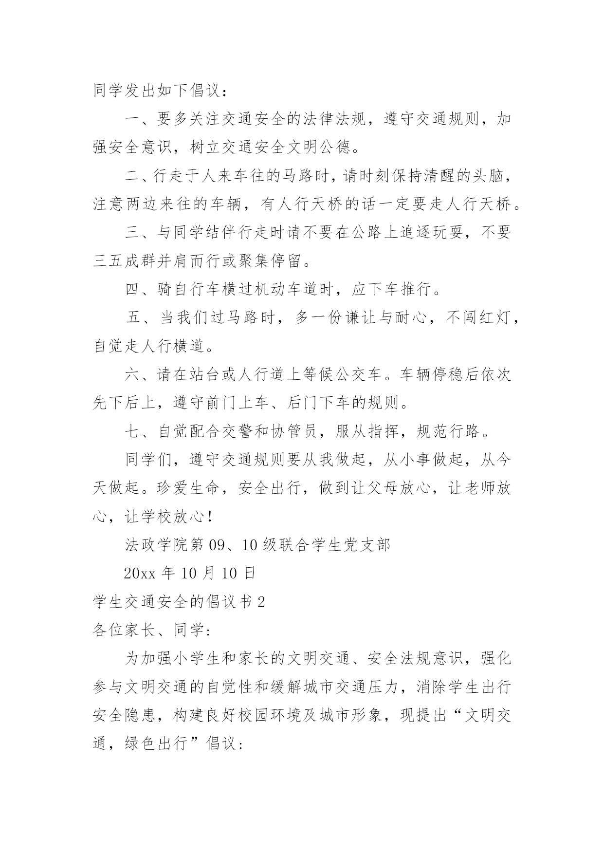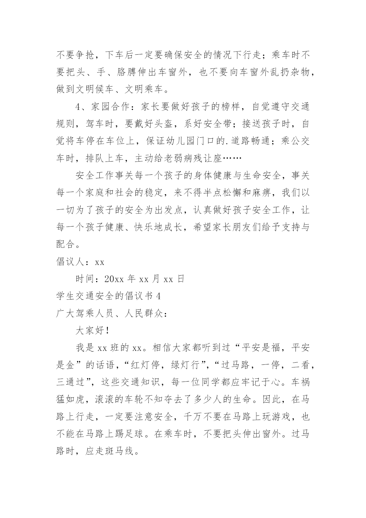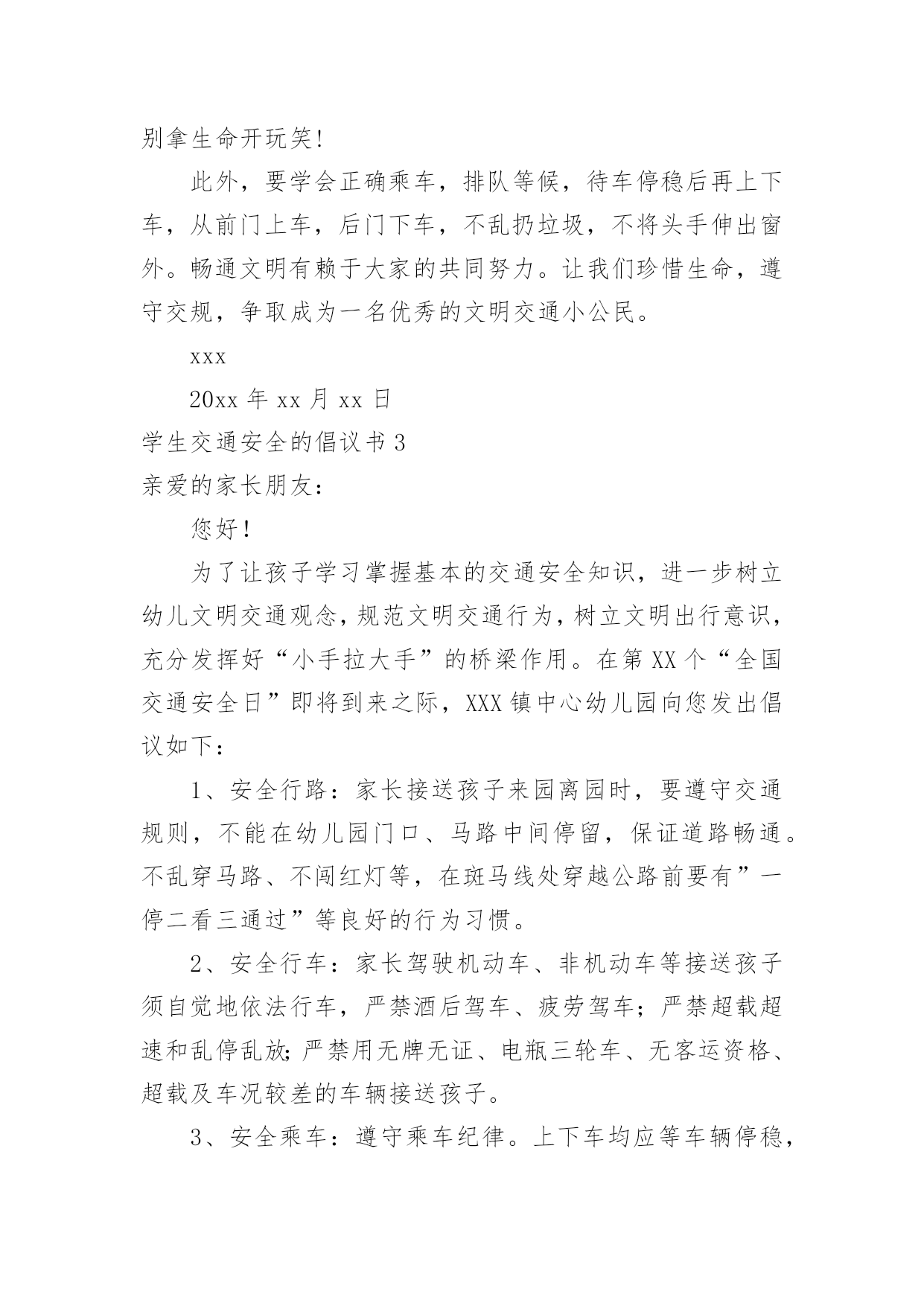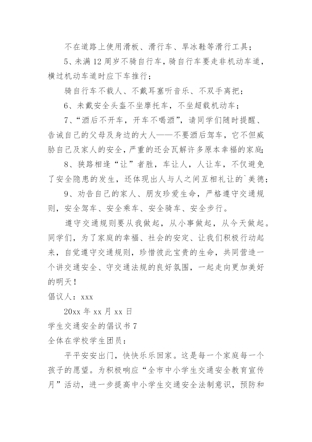 学生交通安全的倡议书学生交通安全的倡议书在充满活力,日益开放的今天,我们都可能会用到倡议书,不同的倡议书内容同样也是不同的。你所见过的倡议书是什么样的呢?以下是小编整理的学生交通安全的倡议书,供大家参考借鉴,希望可以帮助到有需要的朋友。学生交通安全的倡议书1各位同学:车祸猛于虎!此言一点也不虚。今年10月7日仅一天全国就发生三起重大交通事故:“滨保高速天津界内交通事故造成35人死亡,河南社旗县境内交通事故造成11人死亡,安徽萧县境内交通事故造成6人死亡”。血淋淋的事实告诉我们要“珍爱生命,安全出行”!同学们,多少粗心大意者鲜血飞溅;多少人为了赶一点时间而自毁前程;多少鲜活的生命在推杯换盏之后命丧黄泉;多少幸福美满的家庭被不可预期的车祸搞的'烟硝云散……同学们,你们知道吗?全球每年死于交通事故的人就相当于一场中型战争的阵亡人数,我国连续三年交通事故死亡人数年均超过10万人,居世界第一位。这绝对不是耸人听闻!交通安全与我们每个人休戚相关!因此,为了我们自己和家人的幸福,请珍爱生命,安全出行。在此,我们向全体同学发出如下倡议:一、要多关注交通安全的法律法规,遵守交通规则,加强安全意识,树立交通安全文明公德。二、行走于人来车往的马路时,请时刻保持清醒的头脑,注意两边来往的车辆,有人行天桥的话一定要走人行天桥。三、与同学结伴行走时请不要在公路上追逐玩耍,不要三五成群并肩而行或聚集停留。四、骑自行车横过机动车道时,应下车推行。五、当我们过马路时,多一份谦让与耐心,不闯红灯,自觉走人行横道。六、请在站台或人行道上等候公交车。车辆停稳后依次先下后上,遵守前门上车、后门下车的规则。七、自觉配合交警和协管员,服从指挥,规范行路。同学们,遵守交通规则要从我做起,从小事做起,从今天做起。珍爱生命,安全出行,做到让父母放心,让老师放心,让学校放心!法政学院第09、10级联合学生党支部20xx年10月10日学生交通安全的倡议书2各位家长、同学:为加强小学生和家长的文明交通、安全法规意识,强化参与文明交通的自觉性和缓解城市交通压力,消除学生出行安全隐患,构建良好校园环境及城市形象,现提出“文明交通,绿色出行”倡议:1.积极响应“五个一”活动:学生带动家人实践文明出行,家长参加护学志愿活动,学校举办交通安全主题课,家长每周减少开车次数,参加文明交通志愿者行动,成为文明交通典范。2.家长要遵规守法,培养文明交通习惯,尽量避开高峰期接送孩子,倡导“能走不骑,能骑不坐,能坐不开”的出行方式,选择步行、骑行或公共交通工具,减轻交通压力,给孩子树立正面榜样。3.学生应积极参与学校和社会组织的安全教育活动,提高安全意识和法规意识,保障自身安全。同时发挥“小手拉大手”作用,提醒周围人遵守交通规则,维护交通秩序。4.鼓励家长们加入文明交通志愿者行列,参与公益活动,维护校门口行人和车辆秩序,提醒人们注意安全。拥有一流的安全、畅通、和谐、有序交通环境是我们共同的心愿,让我们从自己做起,共同努力营造文明交通,绿色出行的`新风气。同学们请注意,近年来中小学生交通事故频发,让人心惊肉跳。“车祸猛于虎”,切勿轻视交通规则。要学会正确的步行方式,如在人行道上行走,无人行道则靠右侧行走,不随意穿越马路和隔离栏。看清楚红绿灯再行动,做到文明行走。骑自行车的同学也要遵守交通规则,不要抄近道逆行闯入快车道,不与汽车抢占道路,不得载人,行驶时不要在人行道上骑车,以防撞到他人,更不能双手离开把手玩弄技巧。别拿生命开玩笑!此外,要学会正确乘车,排队等候,待车停稳后再上下车,从前门上车,后门下车,不乱扔垃圾,不将头手伸出窗外。畅通文明有赖于大家的共同努力。让我们珍惜生命,遵守交规,争取成为一名优秀的文明交通小公民。xxx20xx年xx月xx日学生交通安全的倡议书3亲爱的家长朋友:您好!为了让孩子学习掌握基本的交通安全知识,进一步树立幼儿文明交通观念,规范文明交通行为,树立文明出行意识,充分发挥好“小手拉大手”的桥梁作用。在第XX个“全国交通安全日”即将到来之际,XXX镇中心幼儿园向您发出倡议如下:1、安全行路:家长接送孩子来园离园时,要遵守交通规则,不能在幼儿园门口、马路中间停留,保证道路畅通。不乱穿马路、不闯红灯等,在斑马线处穿越公路前要有”一停二看三通过”等良好的行为习惯。2、安全行车:家长驾驶机动车、非机动车等接送孩子须自觉地依法行车,严禁酒后驾车、疲劳驾车;严禁超载超速和乱停乱放;严禁用无牌无证、电瓶三轮车、无客运资格、超载及车况较差的车辆接送孩子。3、安全乘车:遵守乘车纪律。上下车均应等车辆停稳,不要争抢,下车后一定要确保安全的情况下行走;乘车时不要把头、手、胳膊伸出车窗外,也不要向车窗外乱扔杂物,做到文明候车、文明乘车。4、家园合作:家长要做好孩子的榜样,自觉遵守交通规则,驾车时,要戴好