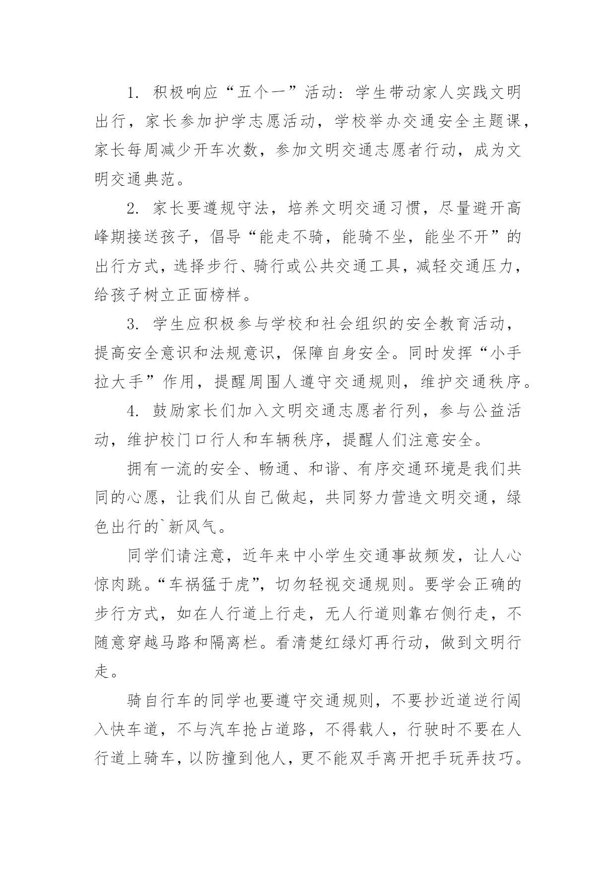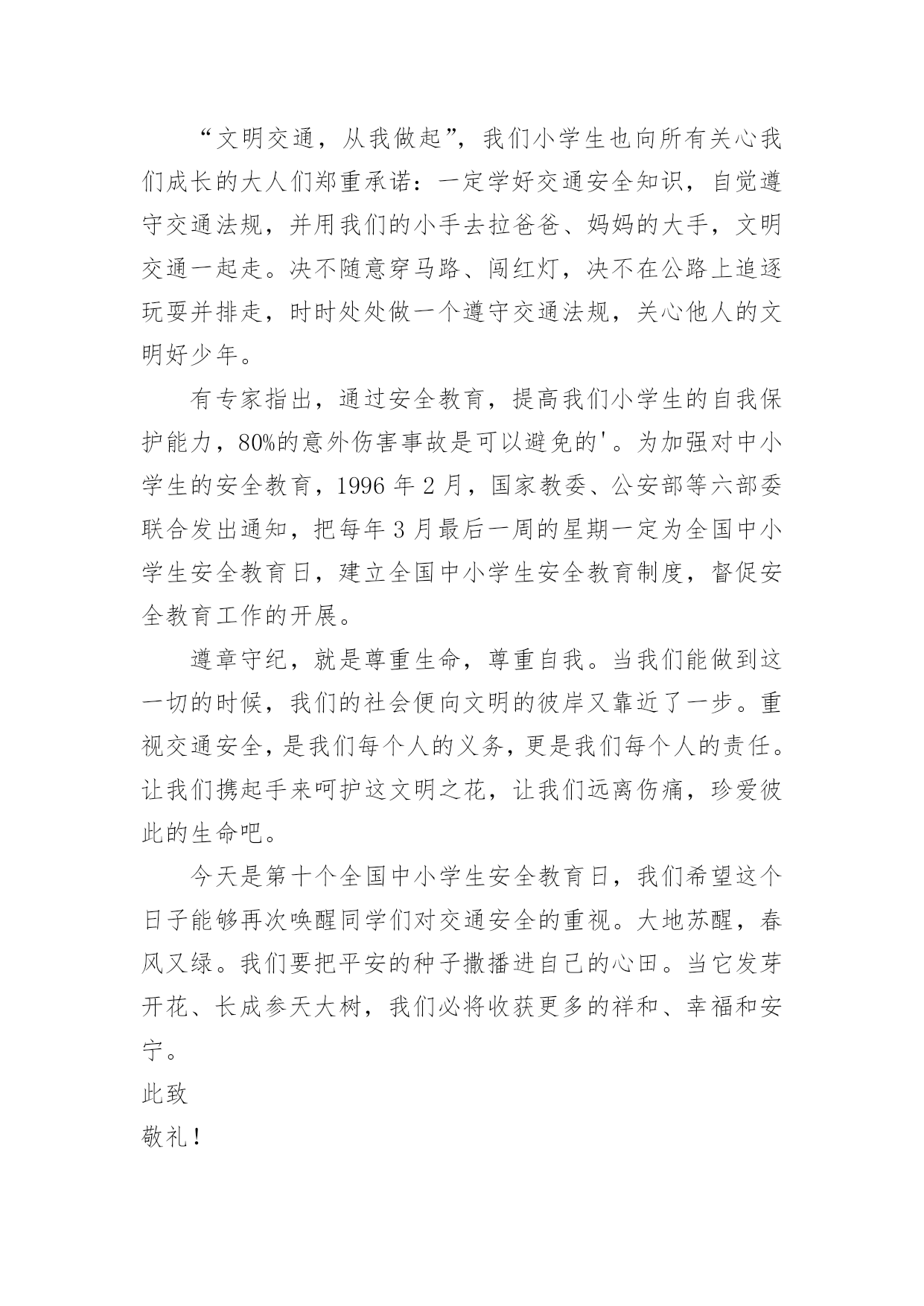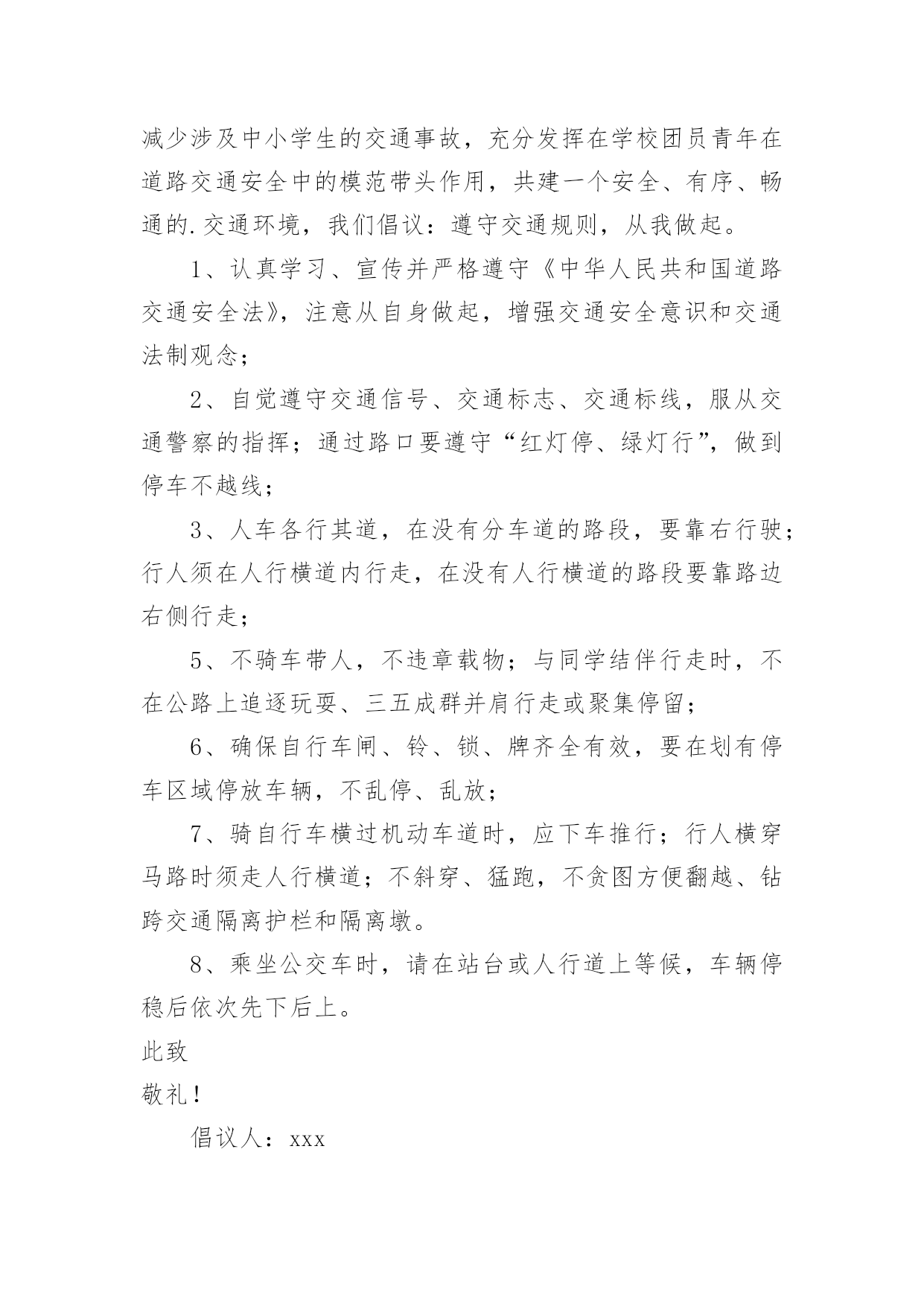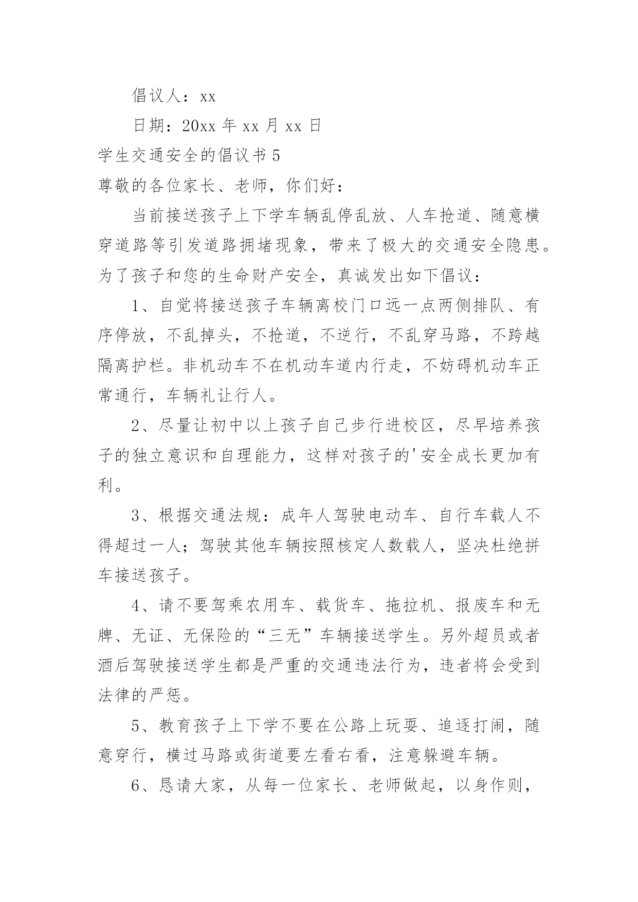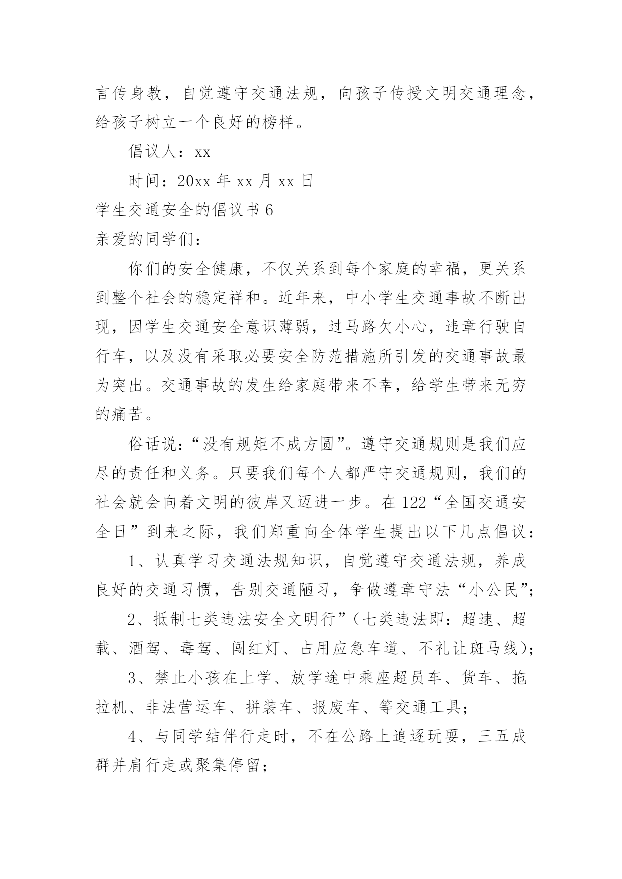 学生交通安全的倡议书学生交通安全的倡议书在充满活力,日益开放的今天,我们都可能会用到倡议书,不同的倡议书内容同样也是不同的。你所见过的倡议书是什么样的呢?以下是小编整理的学生交通安全的倡议书,供大家参考借鉴,希望可以帮助到有需要的朋友。学生交通安全的倡议书1各位同学:车祸猛于虎!此言一点也不虚。今年10月7日仅一天全国就发生三起重大交通事故:“滨保高速天津界内交通事故造成35人死亡,河南社旗县境内交通事故造成11人死亡,安徽萧县境内交通事故造成6人死亡”。血淋淋的事实告诉我们要“珍爱生命,安全出行”!同学们,多少粗心大意者鲜血飞溅;多少人为了赶一点时间而自毁前程;多少鲜活的生命在推杯换盏之后命丧黄泉;多少幸福美满的家庭被不可预期的车祸搞的'烟硝云散……同学们,你们知道吗?全球每年死于交通事故的人就相当于一场中型战争的阵亡人数,我国连续三年交通事故死亡人数年均超过10万人,居世界第一位。这绝对不是耸人听闻!交通安全与我们每个人休戚相关!因此,为了我们自己和家人的幸福,请珍爱生命,安全出行。在此,我们向全体同学发出如下倡议:一、要多关注交通安全的法律法规,遵守交通规则,加强安全意识,树立交通安全文明公德。二、行走于人来车往的马路时,请时刻保持清醒的头脑,注意两边来往的车辆,有人行天桥的话一定要走人行天桥。三、与同学结伴行走时请不要在公路上追逐玩耍,不要三五成群并肩而行或聚集停留。四、骑自行车横过机动车道时,应下车推行。五、当我们过马路时,多一份谦让与耐心,不闯红灯,自觉走人行横道。六、请在站台或人行道上等候公交车。车辆停稳后依次先下后上,遵守前门上车、后门下车的规则。七、自觉配合交警和协管员,服从指挥,规范行路。同学们,遵守交通规则要从我做起,从小事做起,从今天做起。珍爱生命,安全出行,做到让父母放心,让老师放心,让学校放心!法政学院第09、10级联合学生党支部20xx年10月10日学生交通安全的倡议书2各位家长、同学:为加强小学生和家长的文明交通、安全法规意识,强化参与文明交通的自觉性和缓解城市交通压力,消除学生出行安全隐患,构建良好校园环境及城市形象,现提出“文明交通,绿色出行”倡议:1.积极响应“五个一”活动:学生带动家人实践文明出行,家长参加护学志愿活动,学校举办交通安全主题课,家长每周减少开车次数,参加文明交通志愿者行动,成为文明交通典范。2.家长要遵规守法,培养文明交通习惯,尽量避开高峰期接送孩子,倡导“能走不骑,能骑不坐,能坐不开”的出行方式,选择步行、骑行或公共交通工具,减轻交通压力,给孩子树立正面榜样。3.学生应积极参与学校和社会组织的安全教育活动,提高安全意识和法规意识,保障自身安全。同时发挥“小手拉大手”作用,提醒周围人遵守交通规则,维护交通秩序。4.鼓励家长们加入文明交通志愿者行列,参与公益活动,维护校门口行人和车辆秩序,提醒人们注意安全。拥有一流的安全、畅通、和谐、有序交通环境是我们共同的心愿,让我们从自己做起,共同努力营造文明交通,绿色出行的`新风气。同学们请注意,近年来中小学生交通事故频发,让人心惊肉跳。“车祸猛于虎”,切勿轻视交通规则。要学会正确的步行方式,如在人行道上行走,无人行道则靠右侧行走,不随意穿越马路和隔离栏。看清楚红绿灯再行动,做到文明行走。骑自行车的同学也要遵守交通规则,不要抄近道逆行闯入快车道,不与汽车抢占道路,不得载人,行驶时不要在人行道上骑车,以防撞到他人,更不能双手离开把手玩弄技巧。别拿生命开玩笑!此外,要学会正确乘车,排队等候,待车停稳后再上下车,从前门上车,后门下车,不乱扔垃圾,不将头手伸出窗外。畅通文明有赖于大家的共同努力。让我们珍惜生命,遵守交规,争取成为一名优秀的文明交通小公民。xxx20xx年xx月xx日学生交通安全的倡议书3亲爱的家长朋友:您好!为了让孩子学习掌握基本的交通安全知识,进一步树立幼儿文明交通观念,规范文明交通行为,树立文明出行意识,充分发挥好“小手拉大手”的桥梁作用。在第XX个“全国交通安全日”即将到来之际,XXX镇中心幼儿园向您发出倡议如下:1、安全行路:家长接送孩子来园离园时,要遵守交通规则,不能在幼儿园门口、马路中间停留,保证道路畅通。不乱穿马路、不闯红灯等,在斑马线处穿越公路前要有”一停二看三通过”等良好的行为习惯。2、安全行车:家长驾驶机动车、非机动车等接送孩子须自觉地依法行车,严禁酒后驾车、疲劳驾车;严禁超载超速和乱停乱放;严禁用无牌无证、电瓶三轮车、无客运资格、超载及车况较差的车辆接送孩子。3、安全乘车:遵守乘车纪律。上下车均应等车辆停稳,不要争抢,下车后一定要确保安全的情况下行走;乘车时不要把头、手、胳膊伸出车窗外,也不要向车窗外乱扔杂物,做到文明候车、文明乘车。4、家园合作:家长要做好孩子的榜样,自觉遵守交通规则,驾车时,要戴好
