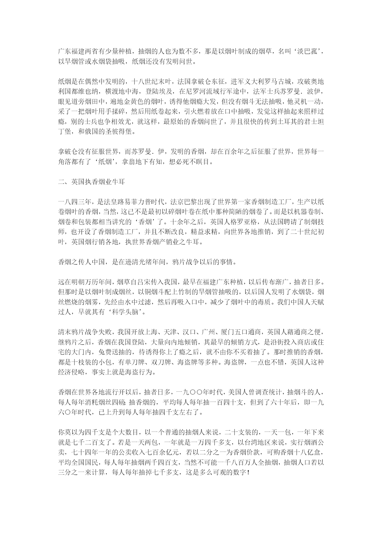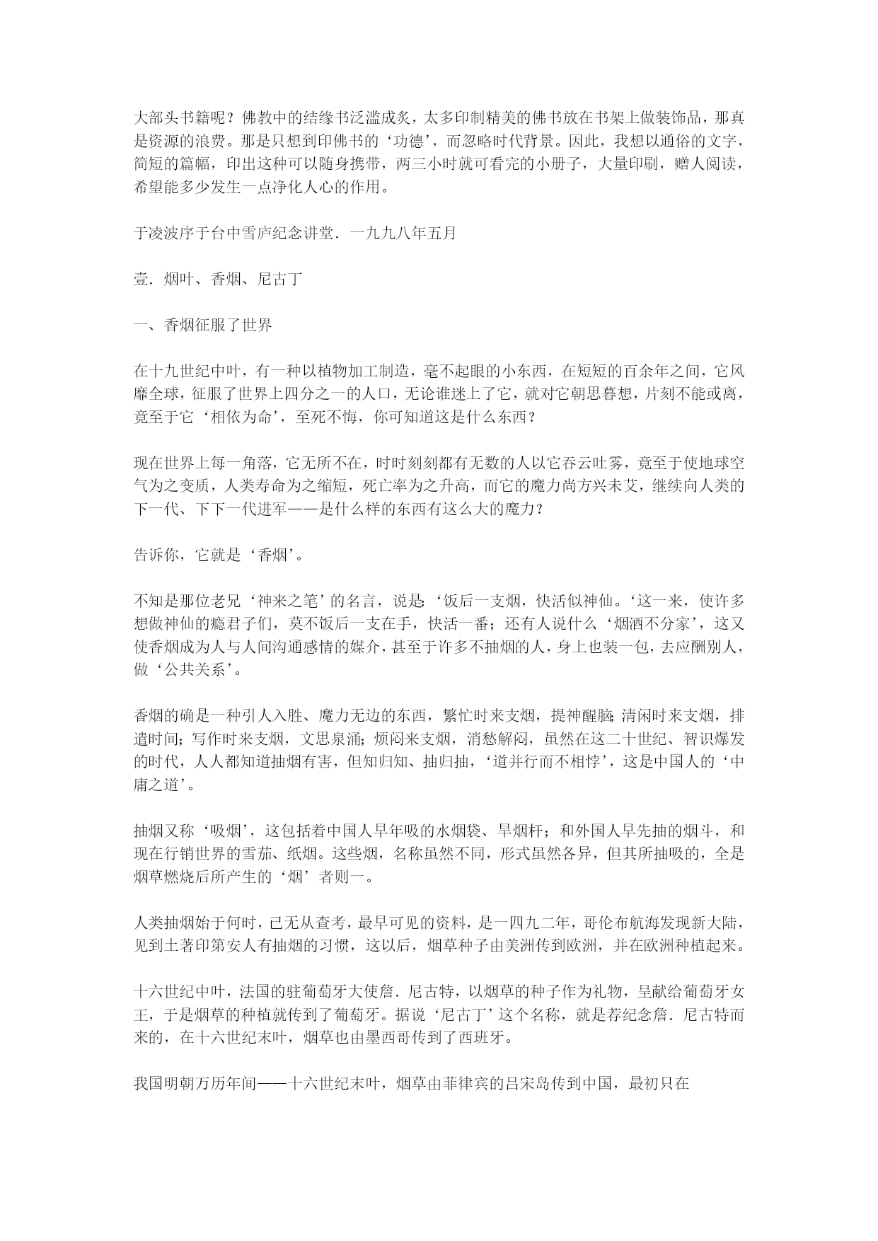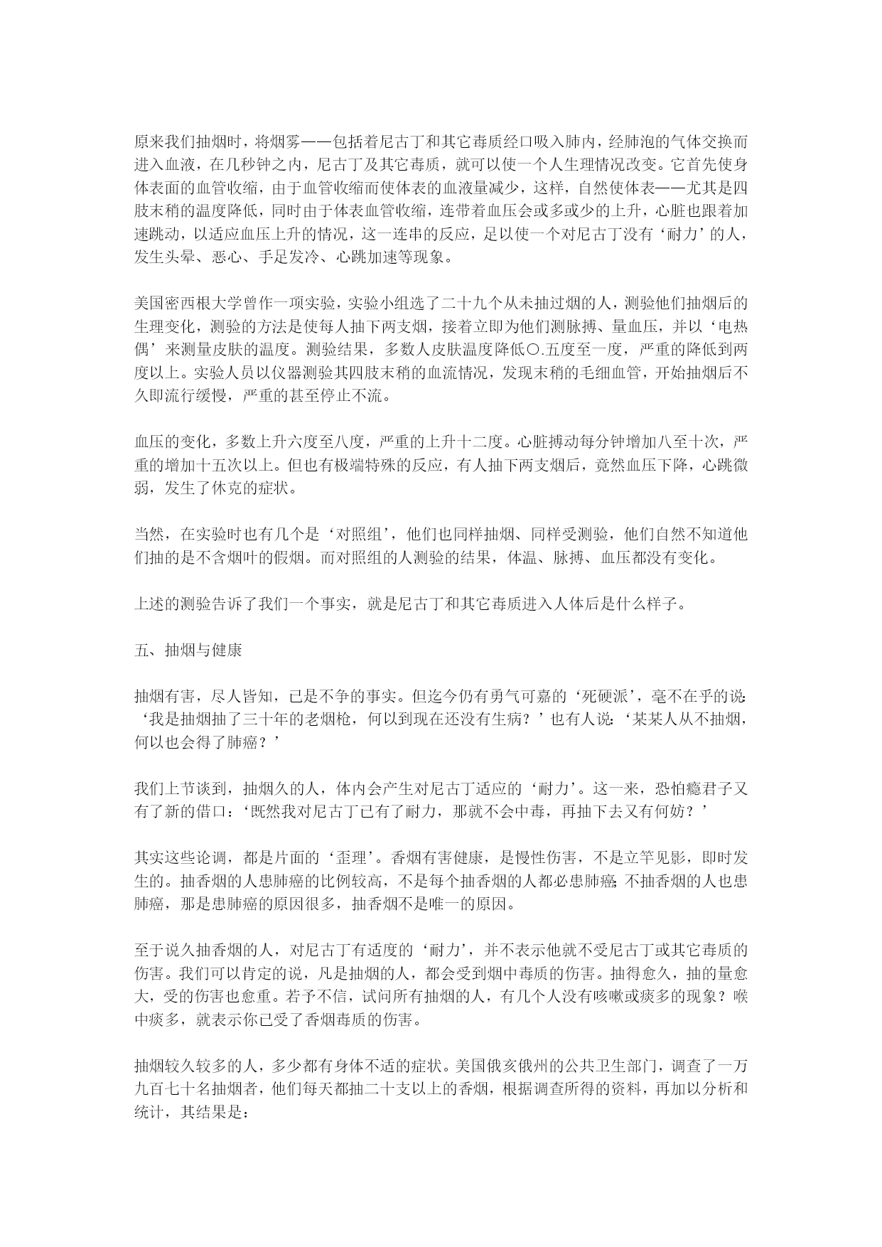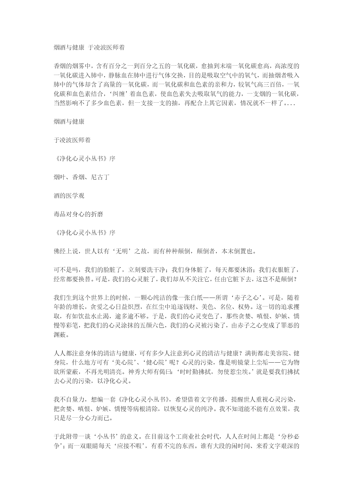 烟酒与健康于凌波医师着(完整版)实用资料(可以直接使用,可编辑完整版实用资料,欢迎下载)烟酒与健康于凌波医师着香烟的烟雾中,含有百分之一到百分之五的一氧化碳,愈抽到末端一氧化碳愈高,高浓度的一氧化碳进入肺中,静脉血在肺中进行气体交换,目的是吸取空气中的氧气,而抽烟者吸入肺中的气体却含了高量的一氧化碳,而一氧化碳和血色素的亲和力,较氧气高三百倍,一氧化碳和血色素结合,‘纠缠’着血色素,使血色素失去吸取氧气的能力,一支烟的一氧化碳,当然影响不了多少血色素,但一支接一支的抽,再配合上其它因素,情况就不一样了。...烟酒与健康于凌波医师着《净化心灵小丛书》序烟叶、香烟、尼古丁酒的医学观毒品对身心的折磨《净化心灵小丛书》序佛经上说,世人以有‘无明’之故,而有种种颠倒,颠倒者,本末倒置也。可不是吗,我们的脸脏了,立刻要洗干净;我们身体脏了,每天都要沐浴;我们衣服脏了,经常都要换替。可是,我们的心灵脏了,我们却从不关注它,任由它脏下去,这岂不是颠倒?我们生到这个世界上的时候,一颗心纯洁的像一张白纸——所谓‘赤子之心’。可是,随着年龄的增长,贪爱之心日益炽烈,在红尘中追逐钱财、美色、名位、权势。这一切的追求攫取,有如饮盐水止渴,逾多逾不够。于是,我们的心灵变色了,那些贪婪、嗔恨、妒嫉、憍慢等彩笔,把我们的心灵涂抹的五颜六色,我们的心灵被污染了,由赤子之心变成了罪恶的渊薮。人人都注意身体的清洁与健康,可有多少人注意到心灵的清洁与健康?满街都走美容院、健身院,什么地方可有‘美心院’、‘健心院’呢?心灵的污染,像是明镜蒙上尘垢——它为物欲所蒙蔽,不再光明清亮。神秀大师有偈曰:‘时时勤拂拭,勿使惹尘埃。’就是要我们拂拭去心灵的污染,以净化心灵。我不自量力,想编一套《净化心灵小丛书》,希望借着文字传播,提醒世人重视心灵污染,把贪婪、嗔恨、妒嫉、憍慢等病根清除,以恢复心灵的纯净。我不知道能不能有点效果,我只是尽一分心力而已。于此附带一谈‘小丛书’的意义。在目前这个工商业社会时代,人人在时间上都是‘分秒必争’;而一双眼睛每天‘应接不暇’,有看不完的东西。谁有大段的闲时间、来看文字艰深的大部头书籍呢?佛教中的结缘书泛滥成炙,太多印制精美的佛书放在书架上做装饰品,那真是资源的浪费。那是只想到印佛书的‘功德’,而忽略时代背景。因此,我想以通俗的文字,简短的篇幅,印出这种可以随身携带,两三小时就可看完的小册子,大量印刷,赠人阅读,希望能多少发生一点净化人心的作用。于凌波序于台中雪庐纪念讲堂.一九九八年五月壹.烟叶、香烟、尼古丁一、香烟征服了世界在十九世纪中叶,有一种以植物加工制造,毫不起眼的小东西,在短短的百余年之间,它风靡全球,征服了世界上四分之一的人口,无论谁迷上了它,就对它朝思暮想,片刻不能或离,竟至于它‘相依为命’,至死不悔,你可知道这是什么东西?现在世界上每一角落,它无所不在,时时刻刻都有无数的人以它吞云吐雾,竟至于使地球空气为之变质,人类寿命为之缩短,死亡率为之升高,而它的魔力尚方兴未艾,继续向人类的下一代、下下一代进军——是什么样的东西有这么大的魔力?告诉你,它就是‘香烟’。不知是那位老兄‘神来之笔’的名言,说是:‘饭后一支烟,快活似神仙。‘这一来,使许多想做神仙的瘾君子们,莫不饭后一支在手,快活一番;还有人说什么‘烟酒不分家’,这又使香烟成为人与人间沟通感情的媒介,甚至于许多不抽烟的人,身上也装一包,去应酬别人,做‘公共关系’。香烟的确是一种引人入胜、魔力无边的东西,繁忙时来支烟,提神醒脑;清闲时来支烟,排遣时间;写作时来支烟,文思泉涌;烦闷来支烟,消愁解闷,虽然在这二十世纪、智识爆发的时代,人人都知道抽烟有害,但知归知、抽归抽,‘道并行而不相悖’,这是中国人的‘中庸之道’。抽烟又称‘吸烟’,这包括着中国人早年吸的水烟袋、旱烟杆;和外国人早先抽的烟斗,和现在行销世界的雪茄、纸烟。这些烟,名称虽然不同,形式虽然各异,但其所抽吸的,全是烟草燃烧后所产生的‘烟’者则一。人类抽烟始于何时,已无从查考,最早可见的资料,是一四九二年,哥伦布航海发现新大陆,见到土著印第安人有抽烟的习惯,这以后,烟草种子由美洲传到欧洲,并在欧洲种植起来。十六世纪中叶,法国的驻葡萄牙大使詹.尼古特,以烟草的种子作为礼物,呈献给葡萄牙女王,于是烟草的种植就传到了葡萄牙。据说‘尼古丁’这个名称,就是荐纪念詹.尼古特而来的,在十六世纪末叶,烟草也由墨西哥传到了西班牙。我国明朝万历年间——十六世纪末叶,烟草由菲律宾的吕宋岛传到中国,最初只在广东福建两省有少量种植,抽烟的人也为数不多,那是以烟叶制成的烟草,名叫‘淡巴菰’,以旱烟管或水烟袋抽吸,纸烟还没有发明问世。纸烟是在偶然中