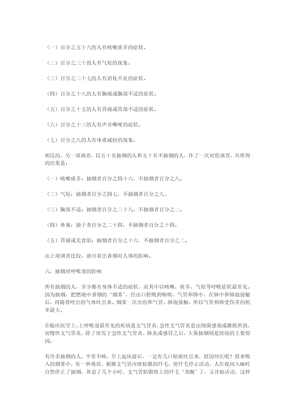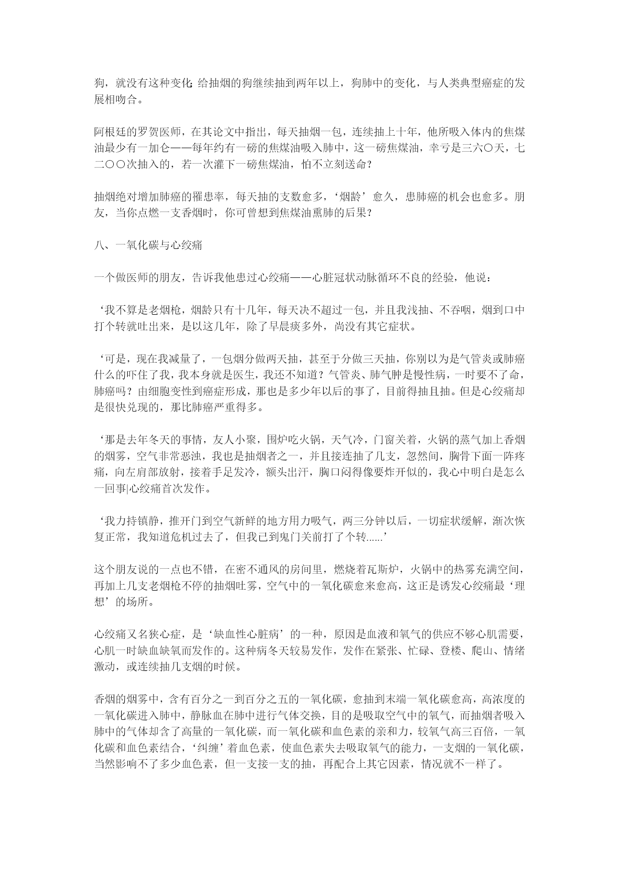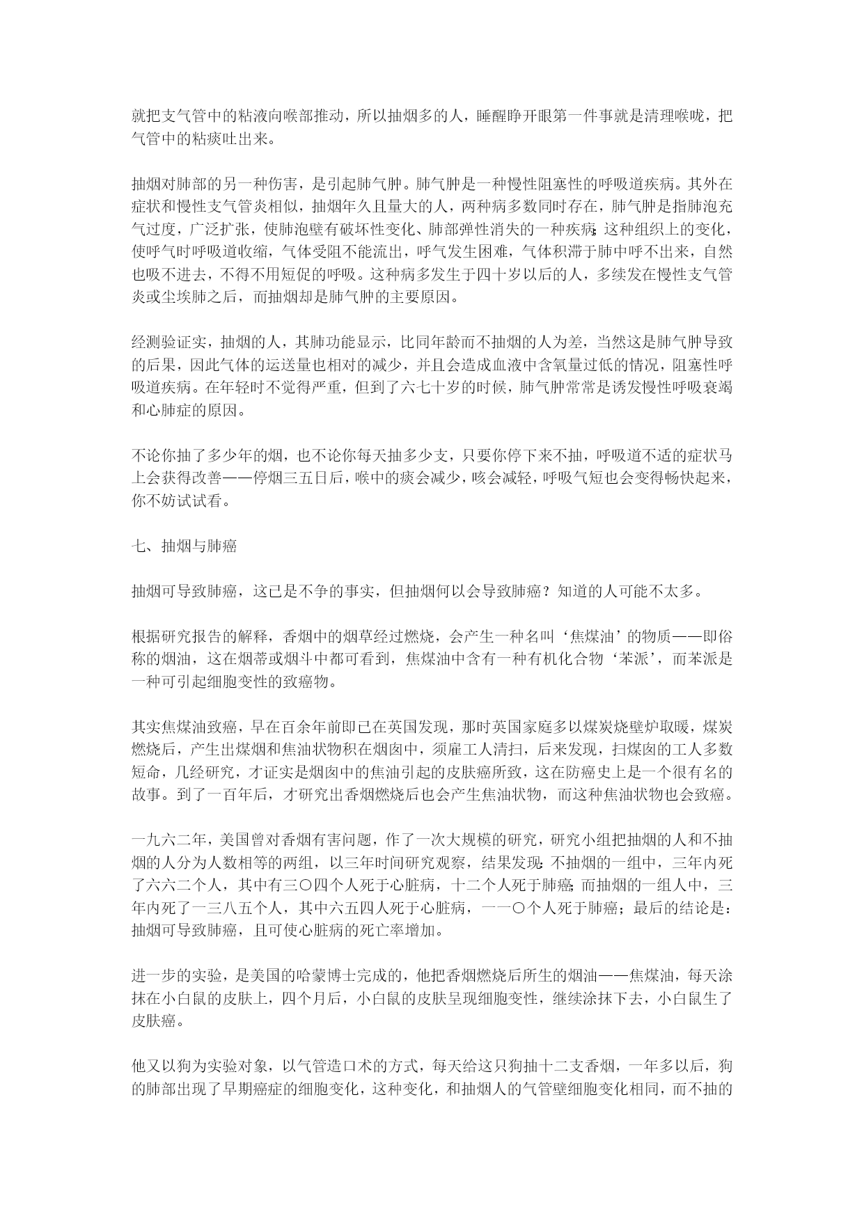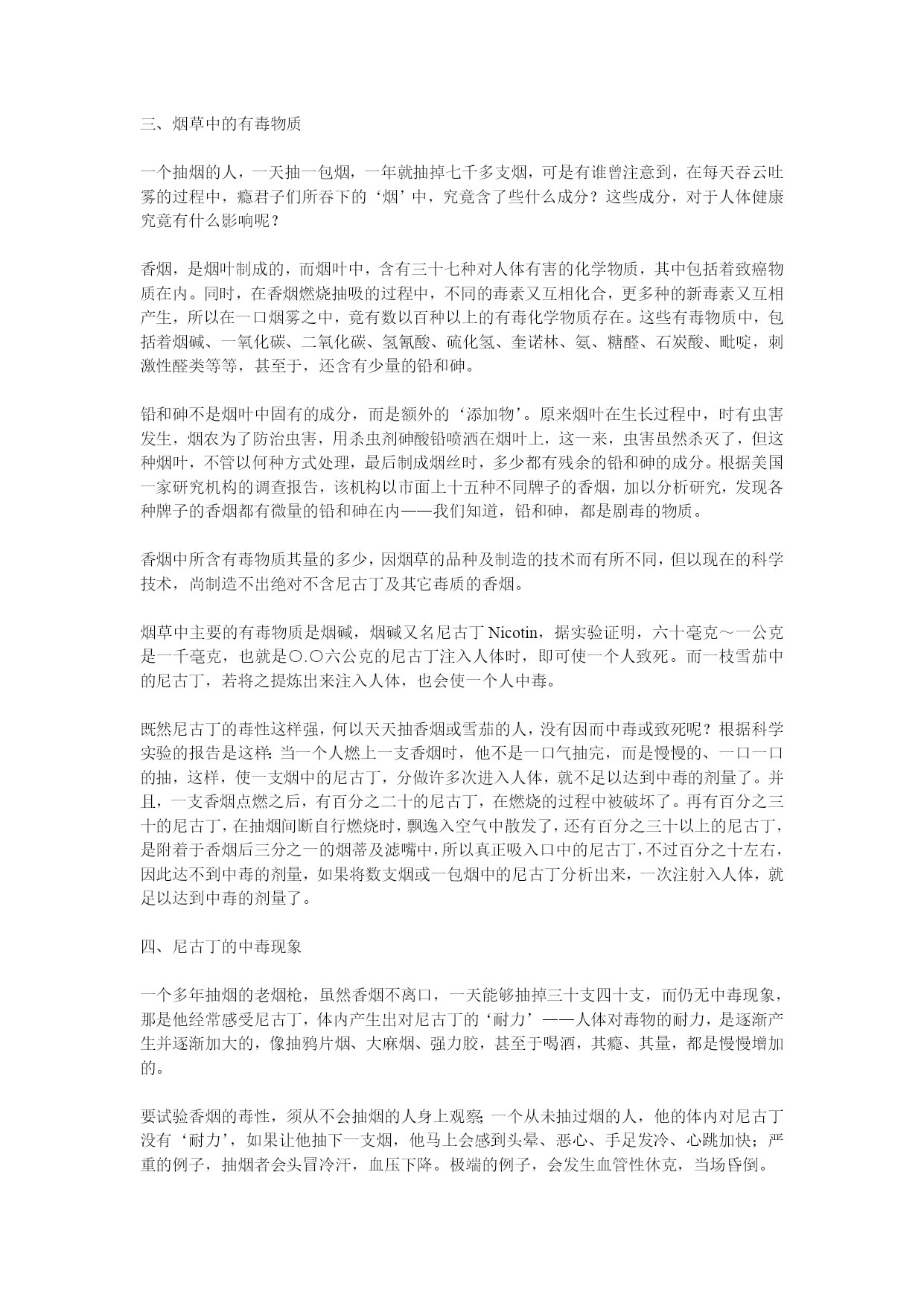 烟酒与健康于凌波医师着(完整版)实用资料(可以直接使用,可编辑完整版实用资料,欢迎下载)烟酒与健康于凌波医师着香烟的烟雾中,含有百分之一到百分之五的一氧化碳,愈抽到末端一氧化碳愈高,高浓度的一氧化碳进入肺中,静脉血在肺中进行气体交换,目的是吸取空气中的氧气,而抽烟者吸入肺中的气体却含了高量的一氧化碳,而一氧化碳和血色素的亲和力,较氧气高三百倍,一氧化碳和血色素结合,‘纠缠’着血色素,使血色素失去吸取氧气的能力,一支烟的一氧化碳,当然影响不了多少血色素,但一支接一支的抽,再配合上其它因素,情况就不一样了。...烟酒与健康于凌波医师着《净化心灵小丛书》序烟叶、香烟、尼古丁酒的医学观毒品对身心的折磨《净化心灵小丛书》序佛经上说,世人以有‘无明’之故,而有种种颠倒,颠倒者,本末倒置也。可不是吗,我们的脸脏了,立刻要洗干净;我们身体脏了,每天都要沐浴;我们衣服脏了,经常都要换替。可是,我们的心灵脏了,我们却从不关注它,任由它脏下去,这岂不是颠倒?我们生到这个世界上的时候,一颗心纯洁的像一张白纸——所谓‘赤子之心’。可是,随着年龄的增长,贪爱之心日益炽烈,在红尘中追逐钱财、美色、名位、权势。这一切的追求攫取,有如饮盐水止渴,逾多逾不够。于是,我们的心灵变色了,那些贪婪、嗔恨、妒嫉、憍慢等彩笔,把我们的心灵涂抹的五颜六色,我们的心灵被污染了,由赤子之心变成了罪恶的渊薮。人人都注意身体的清洁与健康,可有多少人注意到心灵的清洁与健康?满街都走美容院、健身院,什么地方可有‘美心院’、‘健心院’呢?心灵的污染,像是明镜蒙上尘垢——它为物欲所蒙蔽,不再光明清亮。神秀大师有偈曰:‘时时勤拂拭,勿使惹尘埃。’就是要我们拂拭去心灵的污染,以净化心灵。我不自量力,想编一套《净化心灵小丛书》,希望借着文字传播,提醒世人重视心灵污染,把贪婪、嗔恨、妒嫉、憍慢等病根清除,以恢复心灵的纯净。我不知道能不能有点效果,我只是尽一分心力而已。于此附带一谈‘小丛书’的意义。在目前这个工商业社会时代,人人在时间上都是‘分秒必争’;而一双眼睛每天‘应接不暇’,有看不完的东西。谁有大段的闲时间、来看文字艰深的大部头书籍呢?佛教中的结缘书泛滥成炙,太多印制精美的佛书放在书架上做装饰品,那真是资源的浪费。那是只想到印佛书的‘功德’,而忽略时代背景。因此,我想以通俗的文字,简短的篇幅,印出这种可以随身携带,两三小时就可看完的小册子,大量印刷,赠人阅读,希望能多少发生一点净化人心的作用。于凌波序于台中雪庐纪念讲堂.一九九八年五月壹.烟叶、香烟、尼古丁一、香烟征服了世界在十九世纪中叶,有一种以植物加工制造,毫不起眼的小东西,在短短的百余年之间,它风靡全球,征服了世界上四分之一的人口,无论谁迷上了它,就对它朝思暮想,片刻不能或离,竟至于它‘相依为命’,至死不悔,你可知道这是什么东西?现在世界上每一角落,它无所不在,时时刻刻都有无数的人以它吞云吐雾,竟至于使地球空气为之变质,人类寿命为之缩短,死亡率为之升高,而它的魔力尚方兴未艾,继续向人类的下一代、下下一代进军——是什么样的东西有这么大的魔力?告诉你,它就是‘香烟’。不知是那位老兄‘神来之笔’的名言,说是:‘饭后一支烟,快活似神仙。‘这一来,使许多想做神仙的瘾君子们,莫不饭后一支在手,快活一番;还有人说什么‘烟酒不分家’,这又使香烟成为人与人间沟通感情的媒介,甚至于许多不抽烟的人,身上也装一包,去应酬别人,做‘公共关系’。香烟的确是一种引人入胜、魔力无边的东西,繁忙时来支烟,提神醒脑;清闲时来支烟,排遣时间;写作时来支烟,文思泉涌;烦闷来支烟,消愁解闷,虽然在这二十世纪、智识爆发的时代,人人都知道抽烟有害,但知归知、抽归抽,‘道并行而不相悖’,这是中国人的‘中庸之道’。抽烟又称‘吸烟’,这包括着中国人早年吸的水烟袋、旱烟杆;和外国人早先抽的烟斗,和现在行销世界的雪茄、纸烟。这些烟,名称虽然不同,形式虽然各异,但其所抽吸的,全是烟草燃烧后所产生的‘烟’者则一。人类抽烟始于何时,已无从查考,最早可见的资料,是一四九二年,哥伦布航海发现新大陆,见到土著印第安人有抽烟的习惯,这以后,烟草种子由美洲传到欧洲,并在欧洲种植起来。十六世纪中叶,法国的驻葡萄牙大使詹.尼古特,以烟草的种子作为礼物,呈献给葡萄牙女王,于是烟草的种植就传到了葡萄牙。据说‘尼古丁’这个名称,就是荐纪念詹.尼古特而来的,在十六世纪末叶,烟草也由墨西哥传到了西班牙。我国明朝万历年间——十六世纪末叶,烟草由菲律宾的吕宋岛传到中国,最初只在广东福建两省有少量种植,抽烟的人也为数不多,那是以烟叶制成的烟草,名叫‘淡巴菰’,以旱烟管或水烟袋抽吸,纸烟还没有发明问世。纸烟是在偶然中