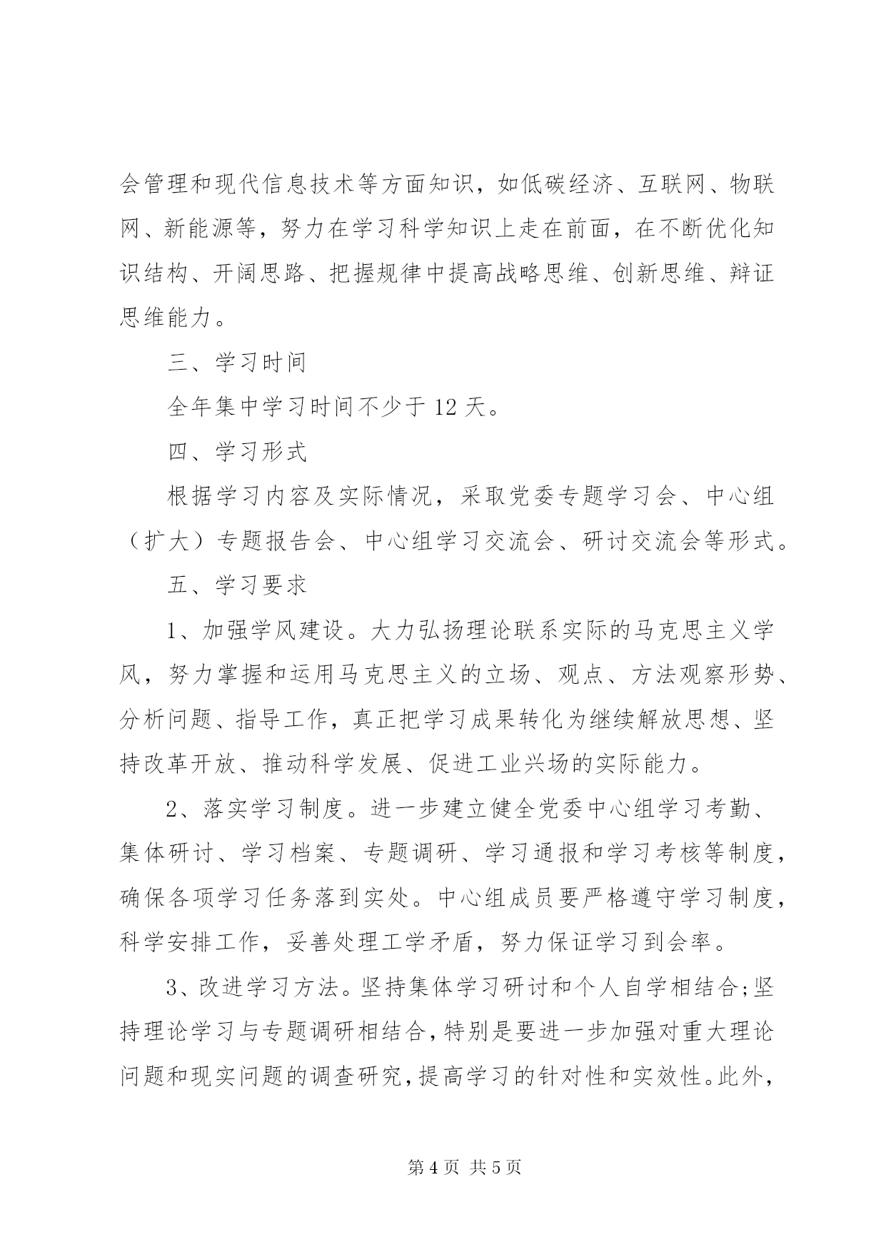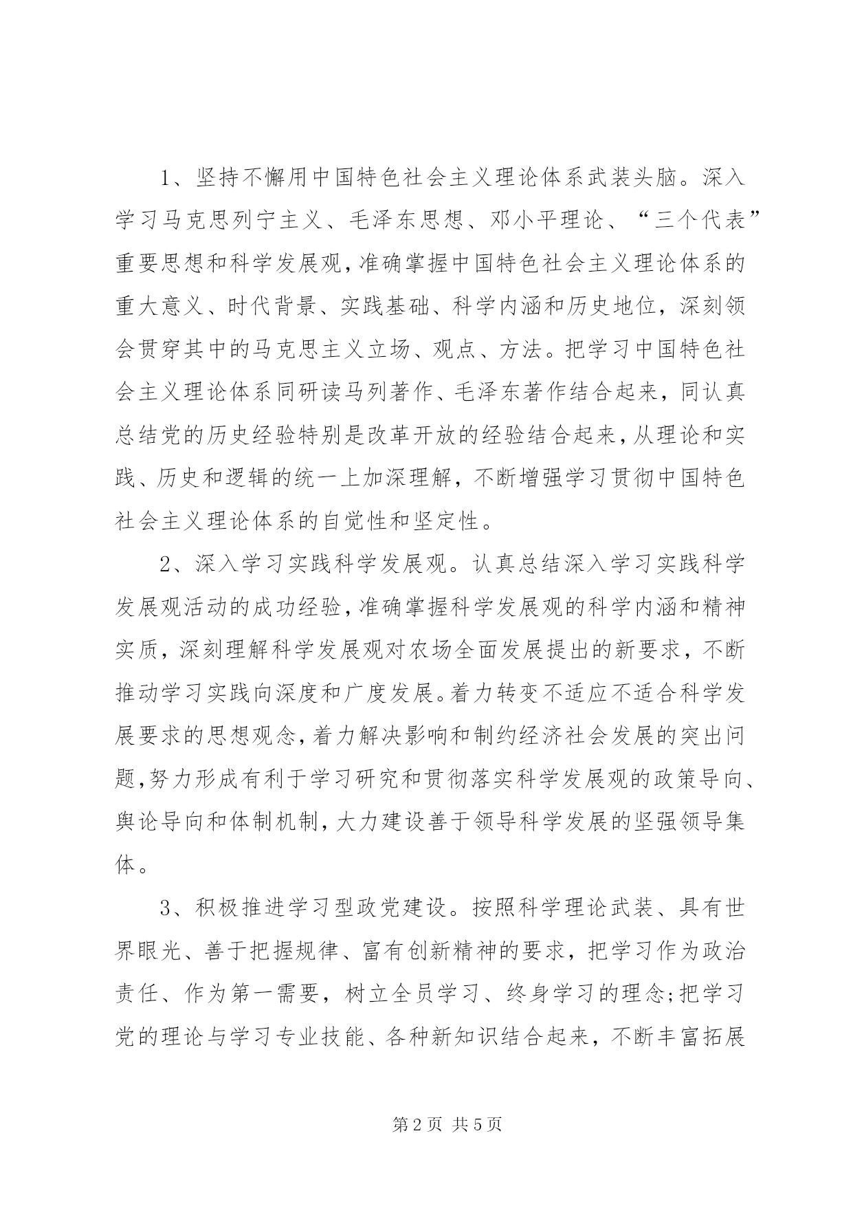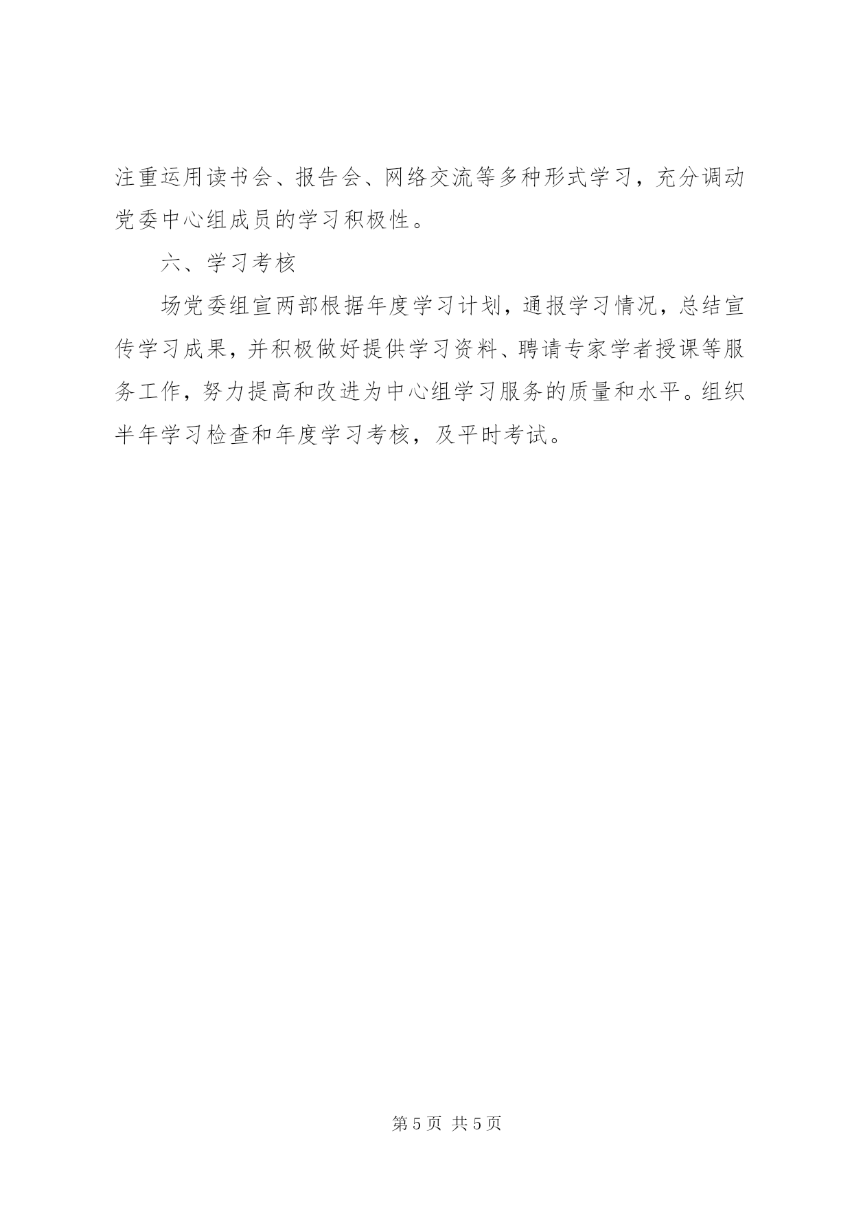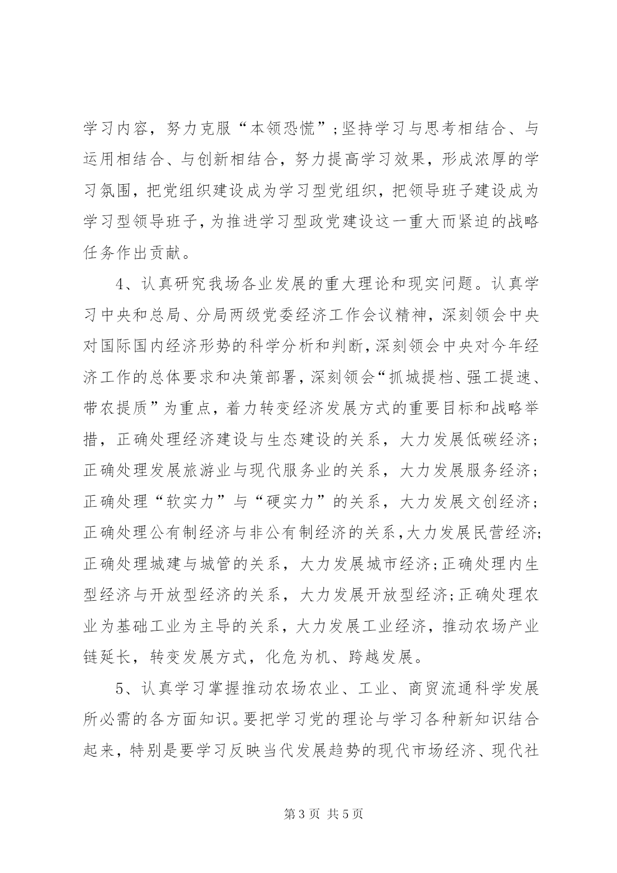 第PAGE\*Arabic\*MERGEFORMAT5页共NUMPAGES\*MERGEFORMAT5页农场理论学习组学习计划2010年,是全面完成“十一五”规划、为“十二五”发展打下坚实基础的重要一年,是农场建设现代化大农业、抓城提档、强工提速、带农提质、跨越发展的关键之年。为进一步提高农场领导班子成员的理论水平,增强运用科学理论分析和解决实际问题的能力,积极推进马克思主义学习型政党建设,根据总局党委建设学习型农场、学习型机关、学习型社区、学习型管理区的部署,学习“海林农场经验”,结合农场工作实际,特制农场党委理论学习中心组2010年学习计划。各基层党委、总支理论学习中心组一并参照执行。一、指导思想高举中国特色社会主义伟大旗帜,以邓小平理论和“三个代表”重要思想为指导,深入贯彻落实科学发展观,全面贯彻党的十七届四中全会和中央经济工作会议精神,全面落实总局党委、分局党委扩大会议精神,坚持用中国特色社会主义理论体系武装头脑,坚持理论联系实际的马克思主义学风,努力掌握和运用科学的新思想、新知识、新经验,优化知识结构,提高综合素质,增强创新能力,大力推进学习型政党、创新型经济建设,为促进农场经济平稳较快发展,共建共享“垦区农场第一城”生活品质提供思想保证。二、学习重点1、坚持不懈用中国特色社会主义理论体系武装头脑。深入学习马克思列宁主义、毛泽东思想、邓小平理论、“三个代表”重要思想和科学发展观,准确掌握中国特色社会主义理论体系的重大意义、时代背景、实践基础、科学内涵和历史地位,深刻领会贯穿其中的马克思主义立场、观点、方法。把学习中国特色社会主义理论体系同研读马列著作、毛泽东著作结合起来,同认真总结党的历史经验特别是改革开放的经验结合起来,从理论和实践、历史和逻辑的统一上加深理解,不断增强学习贯彻中国特色社会主义理论体系的自觉性和坚定性。2、深入学习实践科学发展观。认真总结深入学习实践科学发展观活动的成功经验,准确掌握科学发展观的科学内涵和精神实质,深刻理解科学发展观对农场全面发展提出的新要求,不断推动学习实践向深度和广度发展。着力转变不适应不适合科学发展要求的思想观念,着力解决影响和制约经济社会发展的突出问题,努力形成有利于学习研究和贯彻落实科学发展观的政策导向、舆论导向和体制机制,大力建设善于领导科学发展的坚强领导集体。3、积极推进学习型政党建设。按照科学理论武装、具有世界眼光、善于把握规律、富有创新精神的要求,把学习作为政治责任、作为第一需要,树立全员学习、终身学习的理念;把学习党的理论与学习专业技能、各种新知识结合起来,不断丰富拓展学习内容,努力克服“本领恐慌”;坚持学习与思考相结合、与运用相结合、与创新相结合,努力提高学习效果,形成浓厚的学习氛围,把党组织建设成为学习型党组织,把领导班子建设成为学习型领导班子,为推进学习型政党建设这一重大而紧迫的战略任务作出贡献。4、认真研究我场各业发展的重大理论和现实问题。认真学习中央和总局、分局两级党委经济工作会议精神,深刻领会中央对国际国内经济形势的科学分析和判断,深刻领会中央对今年经济工作的总体要求和决策部署,深刻领会“抓城提档、强工提速、带农提质”为重点,着力转变经济发展方式的重要目标和战略举措,正确处理经济建设与生态建设的关系,大力发展低碳经济;正确处理发展旅游业与现代服务业的关系,大力发展服务经济;正确处理“软实力”与“硬实力”的关系,大力发展文创经济;正确处理公有制经济与非公有制经济的关系,大力发展民营经济;正确处理城建与城管的关系,大力发展城市经济;正确处理内生型经济与开放型经济的关系,大力发展开放型经济;正确处理农业为基础工业为主导的关系,大力发展工业经济,推动农场产业链延长,转变发展方式,化危为机、跨越发展。5、认真学习掌握推动农场农业、工业、商贸流通科学发展所必需的各方面知识。要把学习党的理论与学习各种新知识结合起来,特别是要学习反映当代发展趋势的现代市场经济、现代社会管理和现代信息技术等方面知识,如低碳经济、互联网、物联网、新能源等,努力在学习科学知识上走在前面,在不断优化知识结构、开阔思路、把握规律中提高战略思维、创新思维、辩证思维能力。三、学习时间全年集中学习时间不少于12天。四、学习形式根据学习内容及实际情况,采取党委专题学习会、中心组(扩大)专题报告会、中心组学习交流会、研讨交流会等形式。五、学习要求1、加强学风建设。大力弘扬理论联系实际的马克思主义学风,努力掌握和运用马克思主义的立场、观点、方法观察形势、分析问题、指导工作,真正把学习成果转化为继续解放思想、坚持改革开放、推动科学发展、促进工业兴场的实际能力。2、落实学习制度。进一步建立健全党委中心组学习考勤、集体研讨、学习档案、专题调研、学习通报和学习考核等制度,确保各项学习任务