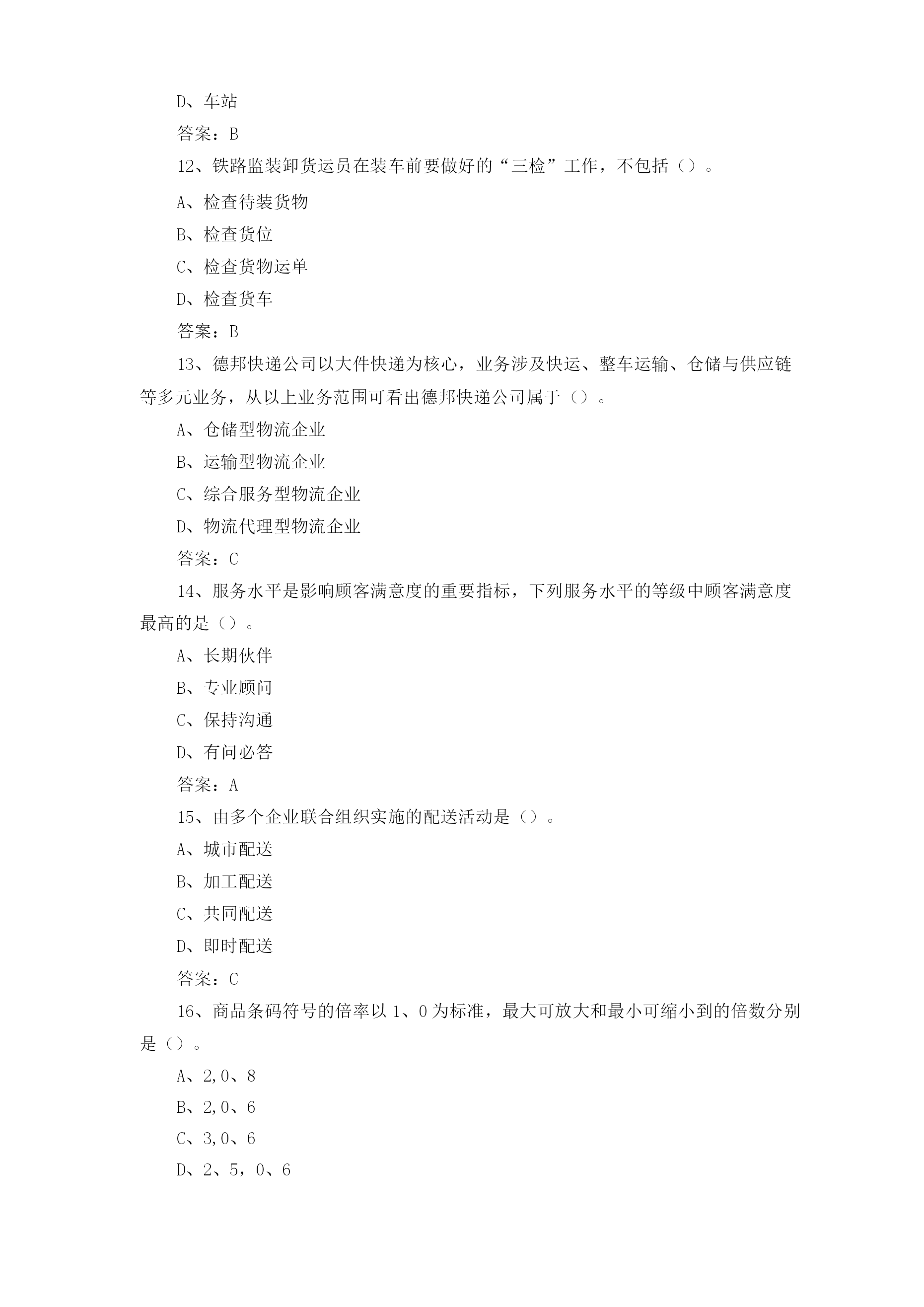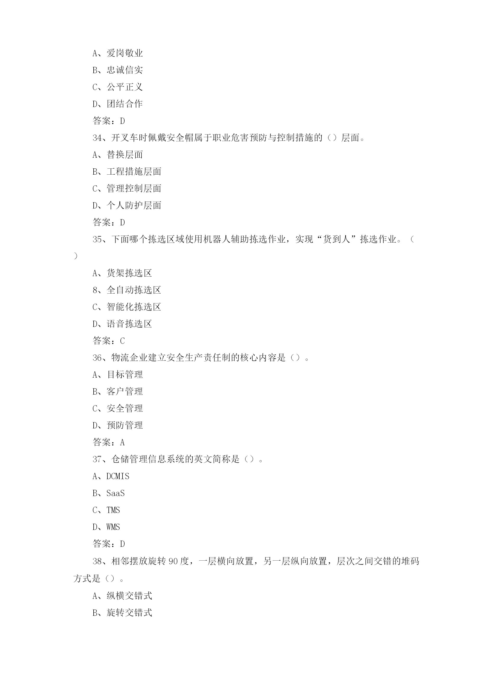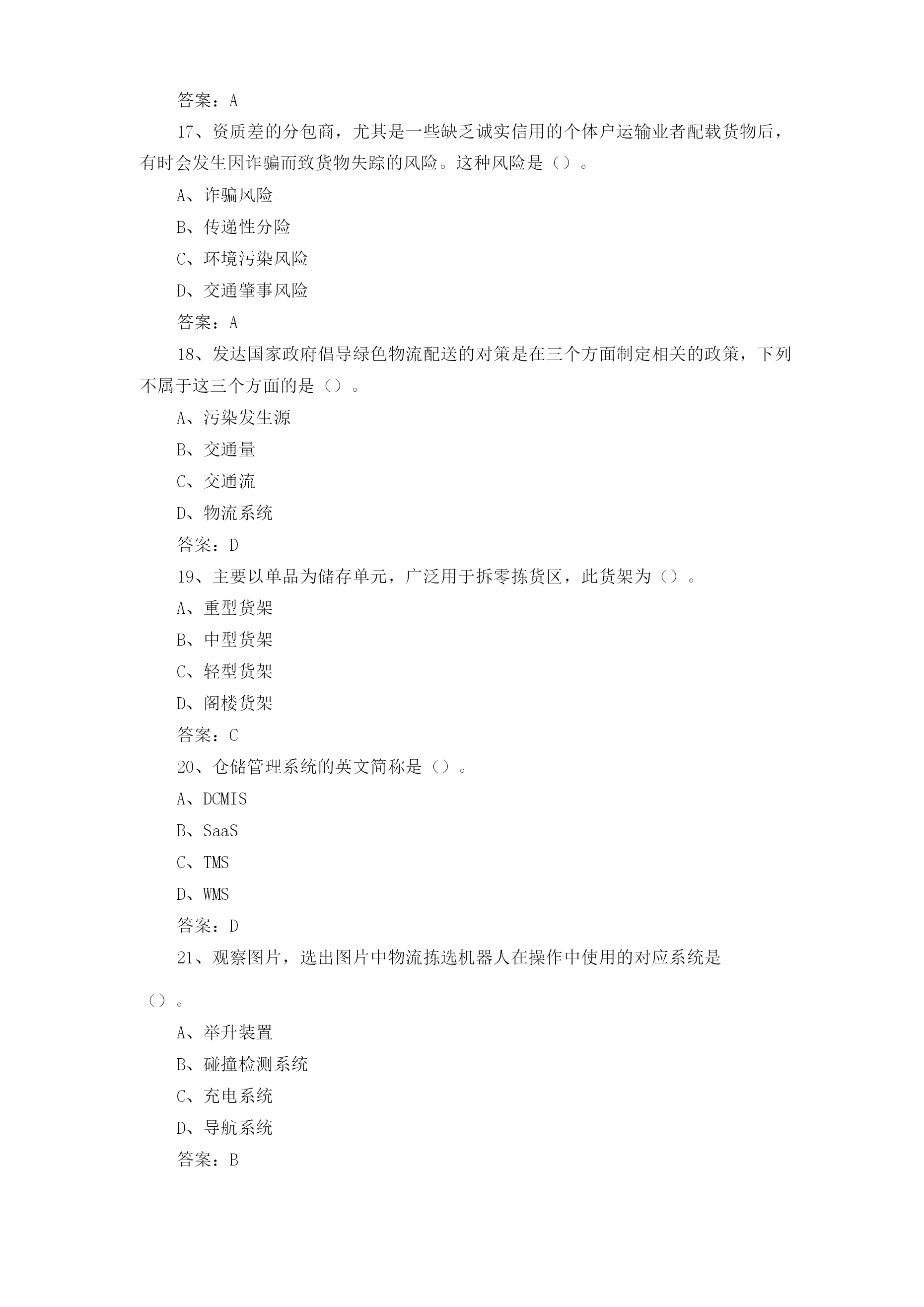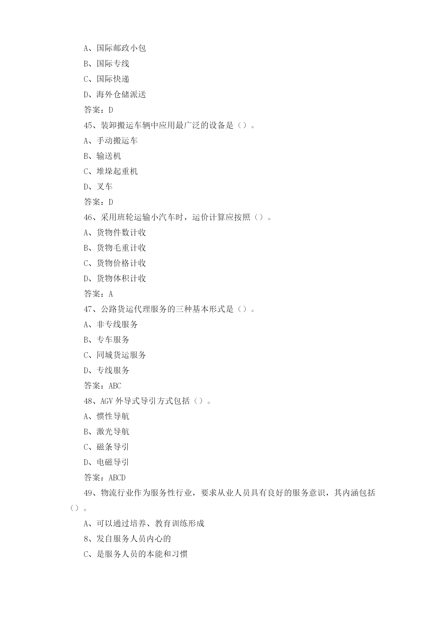 1+X物流管理模拟练习题与答案1、亚马逊公司采用的是()。A、Kiva机器人“货到人”方案B、穿梭车“货到人”方案C、Autostore“货到人”方案D、旋转货架“货到人”方案答案:A2、资质差的分包商有时会发生因诈骗而导致货物失踪的风险,这种风险是()。A、诈骗风险B、传递性分险C、环境污染风险D、交通肇事风险答案:A3、使用95306网站进行铁路运输货物追踪服务,查询需填写的信息是()。A、车号和运单号B、运输合同编号C、出发地点和时间D、货物品名答案:A4、职业病预防和控制的首选措施是()。A、替换B、工程措施C、管理控制D、个体防护答案:D5、装车作业异常多发生在()。A、集货环节B、点货环节C、上车环节D、包装环节答案:A6、天然气着火属于()。A、A类火灾B、B类火灾C、C类火灾D、D类火灾答案:C7、根据国家标准GB2894-28《安全标志及其使用导则》,安全色标中提示安全状态和通行的颜色是()。入、红色8、绿色"黄色。、蓝色答案:B8、货物运输费用中由收货方承担运费的是()。A、运费预付B、协议结算C、回单付D、运费到付答案:D9、哪方在托运单上签字后,货物是责任由托运人转至承运人?()。A、托运人B、承运人C、收货人D、保险代表答案:B10、GPS首要的和最基本的功能是()。入、紧急救助B、导航功能C、信息查询D、实时监控答案:B11、下列属于公路运输技术与装备的是()。A、线路B、货运场站C、信号设备D、车站答案:B12、铁路监装卸货运员在装车前要做好的“三检”工作,不包括()。A、检查待装货物B、检查货位C、检查货物运单D、检查货车答案:B13、德邦快递公司以大件快递为核心,业务涉及快运、整车运输、仓储与供应链等多元业务,从以上业务范围可看出德邦快递公司属于()。A、仓储型物流企业B、运输型物流企业C、综合服务型物流企业D、物流代理型物流企业答案:C14、服务水平是影响顾客满意度的重要指标,下列服务水平的等级中顾客满意度最高的是()。A、长期伙伴B、专业顾问C、保持沟通D、有问必答答案:A15、由多个企业联合组织实施的配送活动是()。A、城市配送B、加工配送C、共同配送D、即时配送答案:C16、商品条码符号的倍率以1、0为标准,最大可放大和最小可缩小到的倍数分别是()。TOC\o"1-5"\h\zA、2,0、8B、2,0、6C、3,0、6D、2、5,0、6答案:A17、资质差的分包商,尤其是一些缺乏诚实信用的个体户运输业者配载货物后,有时会发生因诈骗而致货物失踪的风险。这种风险是()。A、诈骗风险B、传递性分险C、环境污染风险D、交通肇事风险答案:A18、发达国家政府倡导绿色物流配送的对策是在三个方面制定相关的政策,下列不属于这三个方面的是()。A、污染发生源B、交通量C、交通流D、物流系统答案:D19、主要以单品为储存单元,广泛用于拆零拣货区,此货架为()。A、重型货架B、中型货架C、轻型货架D、阁楼货架答案:C20、仓储管理系统的英文简称是()。TOC\o"1-5"\h\zA、DCMISB、SaaSC、TMSD、WMS答案:D21、观察图片,选出图片中物流拣选机器人在操作中使用的对应系统是()。A、举升装置B、碰撞检测系统C、充电系统D、导航系统答案:B22、全部养护工作的基础是()。A、基础保养B、二级保养C、一级保养D、日常保养答案:D23、SWOT分析中,O的含义是()。A、优势B、劣势"机会D、威胁答案:C24、客户有铁路运输需求提报或查询货物运输信息需要时,可拨打电话()。TOC\o"1-5"\h\zA、12305B、12333C、95306D、95333答案:C25、在进行装车时,不需要考虑的是()。A、货物的形状B、货物的生产日期C、货物的体积D、货物的性质答案:B26、铁路货物运输按照作业流程,不包括()。A、发送作业B、途中作业C、到达作业D、跟踪作业答案:D27、下列哪个选项不属于客户档案分类管理原则?()A、分散管理B、动态管理C、分类管理D、集中管理答案:A28、物资出库的程序不包括()。A、备货B、装卸C、搬运D、交接答案:D29、MBTI人格共有几个维度和几个方向?()TOC\o"1-5"\h\zA、2,4B、3,6C、4,8D、5,10答案:C30、企业产成品在出售过程中所发生的物流活动属于()。A