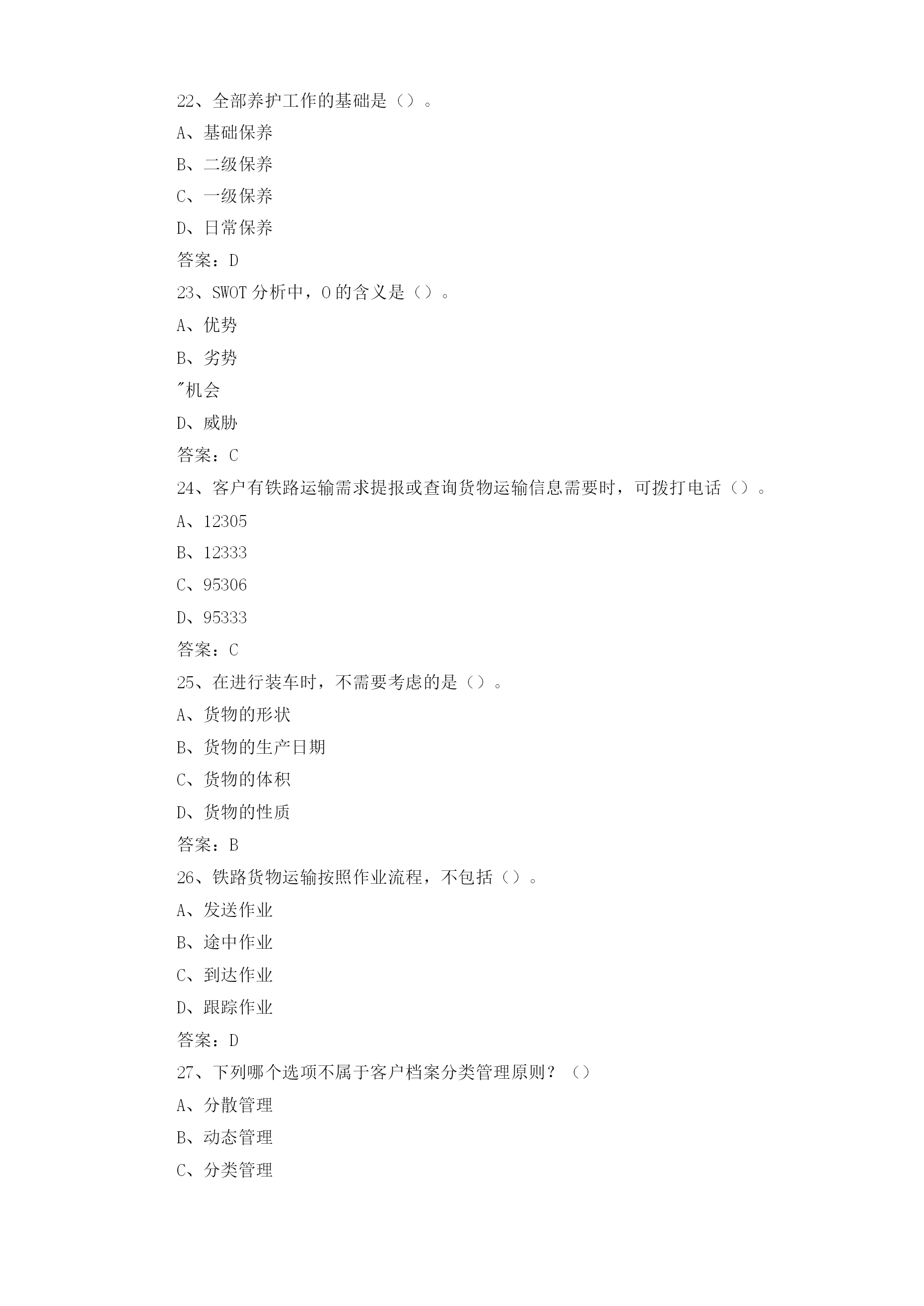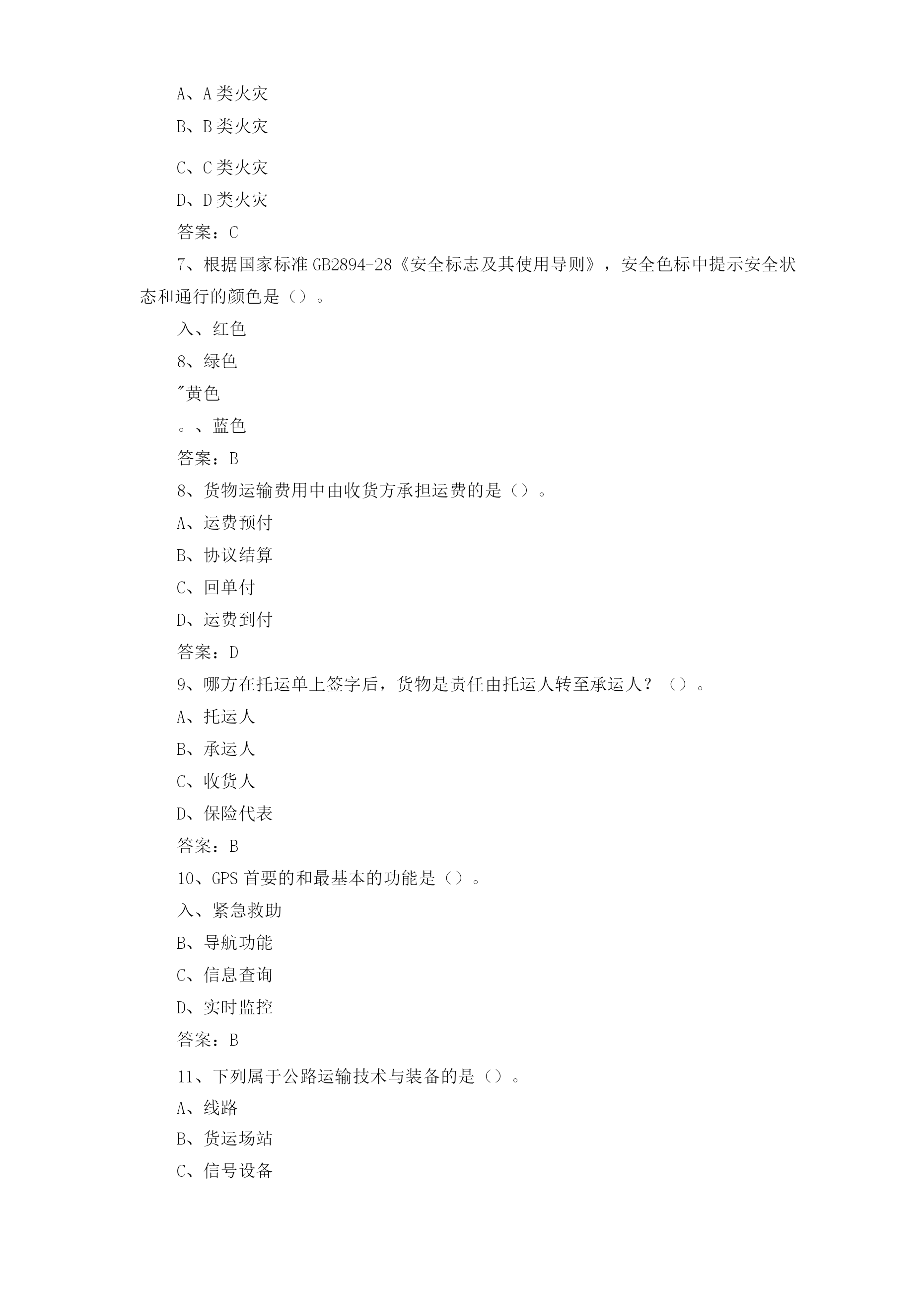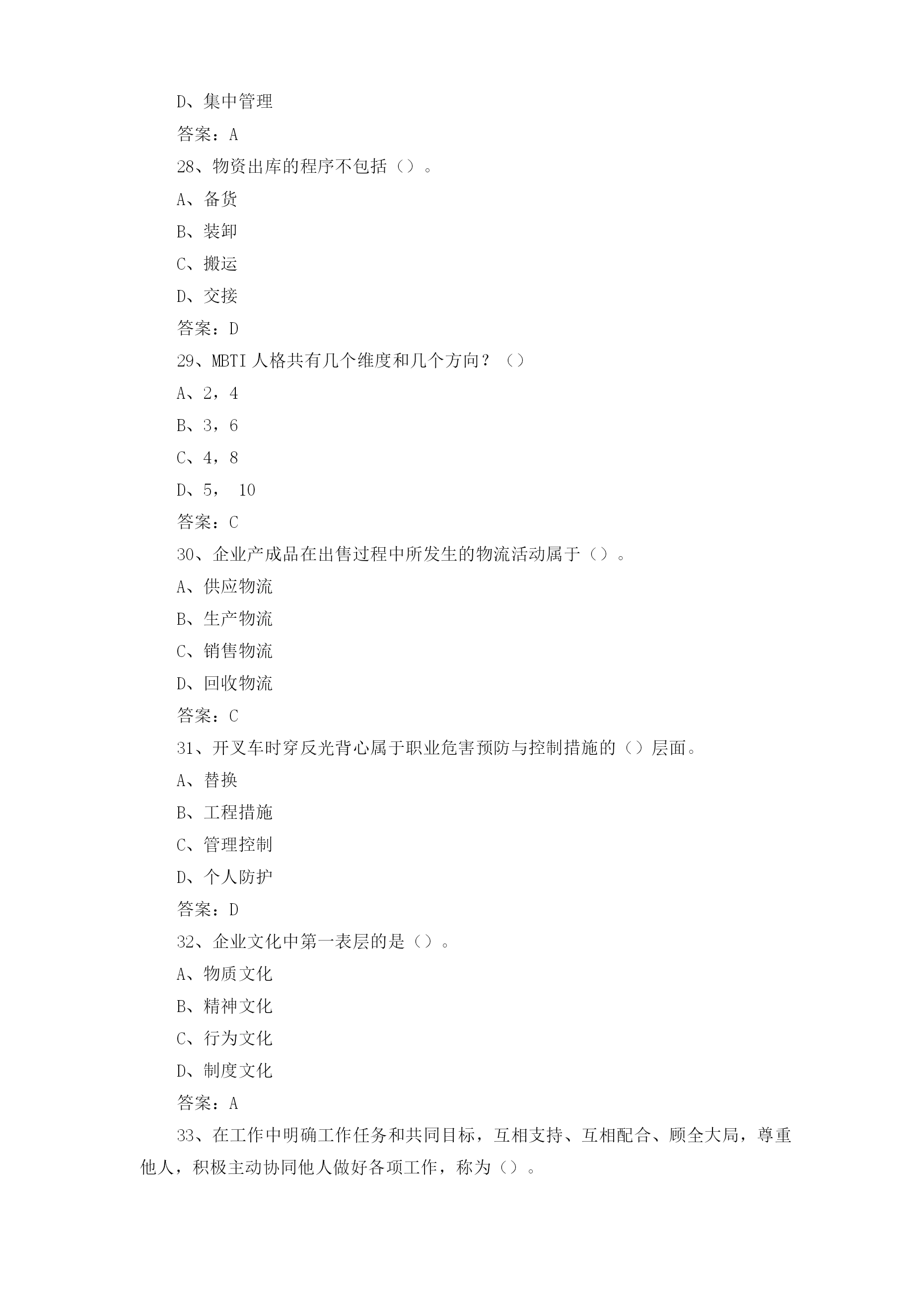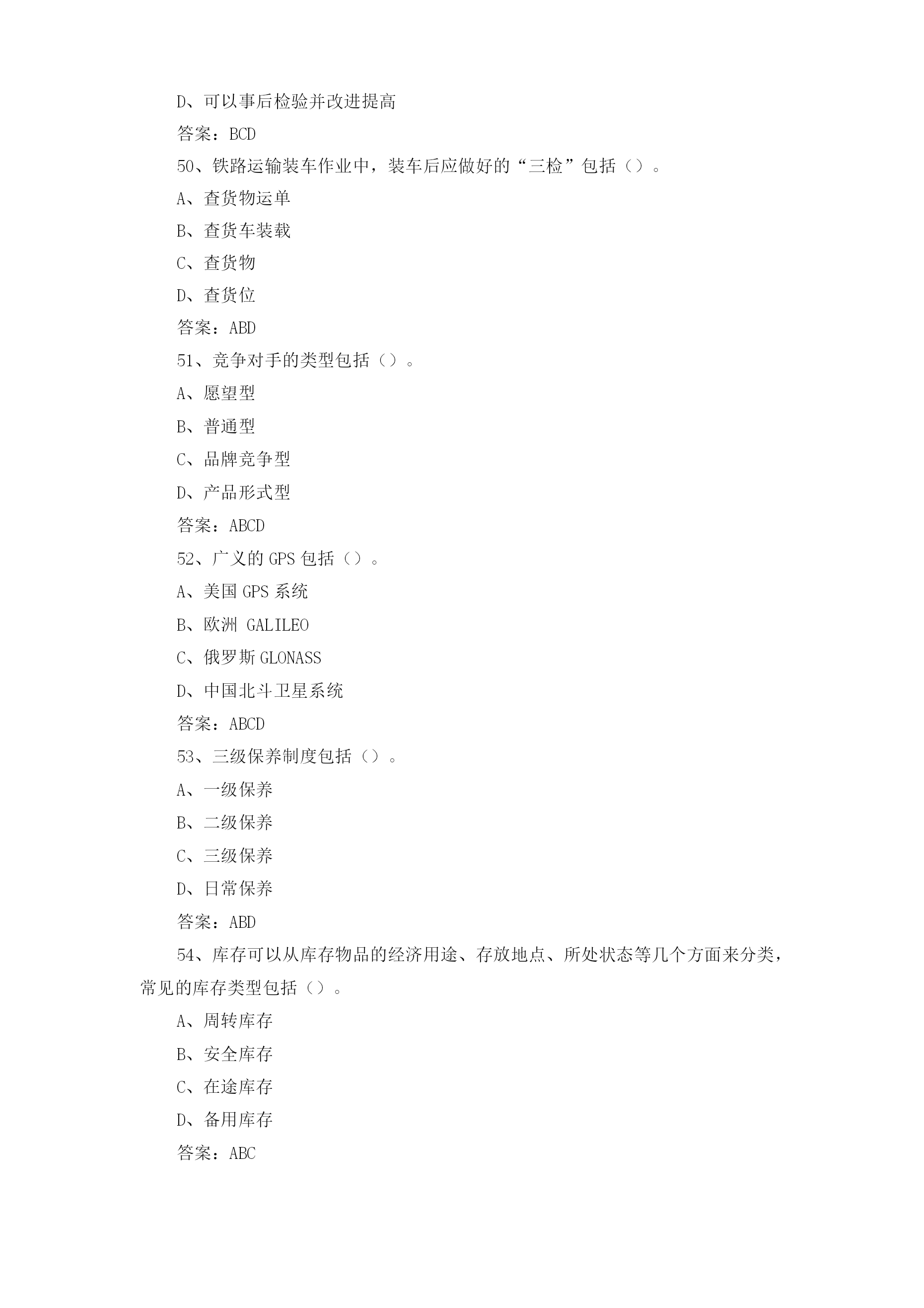 1+X物流管理模拟练习题与答案1、亚马逊公司采用的是()。A、Kiva机器人“货到人”方案B、穿梭车“货到人”方案C、Autostore“货到人”方案D、旋转货架“货到人”方案答案:A2、资质差的分包商有时会发生因诈骗而导致货物失踪的风险,这种风险是()。A、诈骗风险B、传递性分险C、环境污染风险D、交通肇事风险答案:A3、使用95306网站进行铁路运输货物追踪服务,查询需填写的信息是()。A、车号和运单号B、运输合同编号C、出发地点和时间D、货物品名答案:A4、职业病预防和控制的首选措施是()。A、替换B、工程措施C、管理控制D、个体防护答案:D5、装车作业异常多发生在()。A、集货环节B、点货环节C、上车环节D、包装环节答案:A6、天然气着火属于()。A、A类火灾B、B类火灾C、C类火灾D、D类火灾答案:C7、根据国家标准GB2894-28《安全标志及其使用导则》,安全色标中提示安全状态和通行的颜色是()。入、红色8、绿色"黄色。、蓝色答案:B8、货物运输费用中由收货方承担运费的是()。A、运费预付B、协议结算C、回单付D、运费到付答案:D9、哪方在托运单上签字后,货物是责任由托运人转至承运人?()。A、托运人B、承运人C、收货人D、保险代表答案:B10、GPS首要的和最基本的功能是()。入、紧急救助B、导航功能C、信息查询D、实时监控答案:B11、下列属于公路运输技术与装备的是()。A、线路B、货运场站C、信号设备D、车站答案:B12、铁路监装卸货运员在装车前要做好的“三检”工作,不包括()。A、检查待装货物B、检查货位C、检查货物运单D、检查货车答案:B13、德邦快递公司以大件快递为核心,业务涉及快运、整车运输、仓储与供应链等多元业务,从以上业务范围可看出德邦快递公司属于()。A、仓储型物流企业B、运输型物流企业C、综合服务型物流企业D、物流代理型物流企业答案:C14、服务水平是影响顾客满意度的重要指标,下列服务水平的等级中顾客满意度最高的是()。A、长期伙伴B、专业顾问C、保持沟通D、有问必答答案:A15、由多个企业联合组织实施的配送活动是()。A、城市配送B、加工配送C、共同配送D、即时配送答案:C16、商品条码符号的倍率以1、0为标准,最大可放大和最小可缩小到的倍数分别是()。TOC\o"1-5"\h\zA、2,0、8B、2,0、6C、3,0、6D、2、5,0、6答案:A17、资质差的分包商,尤其是一些缺乏诚实信用的个体户运输业者配载货物后,有时会发生因诈骗而致货物失踪的风险。这种风险是()。A、诈骗风险B、传递性分险C、环境污染风险D、交通肇事风险答案:A18、发达国家政府倡导绿色物流配送的对策是在三个方面制定相关的政策,下列不属于这三个方面的是()。A、污染发生源B、交通量C、交通流D、物流系统答案:D19、主要以单品为储存单元,广泛用于拆零拣货区,此货架为()。A、重型货架B、中型货架C、轻型货架D、阁楼货架答案:C20、仓储管理系统的英文简称是()。TOC\o"1-5"\h\zA、DCMISB、SaaSC、TMSD、WMS答案:D21、观察图片,选出图片中物流拣选机器人在操作中使用的对应系统是()。A、举升装置B、碰撞检测系统C、充电系统D、导航系统答案:B22、全部养护工作的基础是()。A、基础保养B、二级保养C、一级保养D、日常保养答案:D23、SWOT分析中,O的含义是()。A、优势B、劣势"机会D、威胁答案:C24、客户有铁路运输需求提报或查询货物运输信息需要时,可拨打电话()。TOC\o"1-5"\h\zA、12305B、12333C、95306D、95333答案:C25、在进行装车时,不需要考虑的是()。A、货物的形状B、货物的生产日期C、货物的体积D、货物的性质答案:B26、铁路货物运输按照作业流程,不包括()。A、发送作业B、途中作业C、到达作业D、跟踪作业答案:D27、下列哪个选项不属于客户档案分类管理原则?()A、分散管理B、动态管理C、分类管理D、集中管理答案:A28、物资出库的程序不包括()。A、备货B、装卸C、搬运D、交接答案:D29、MBTI人格共有几个维度和几个方向?()TOC\o"1-5"\h\zA、2,4B、3,6C、4,8D、5,10答案:C30、企业产成品在出售过程中所发生的物流活动属于()。A