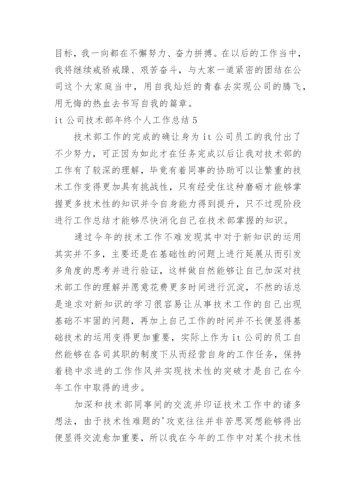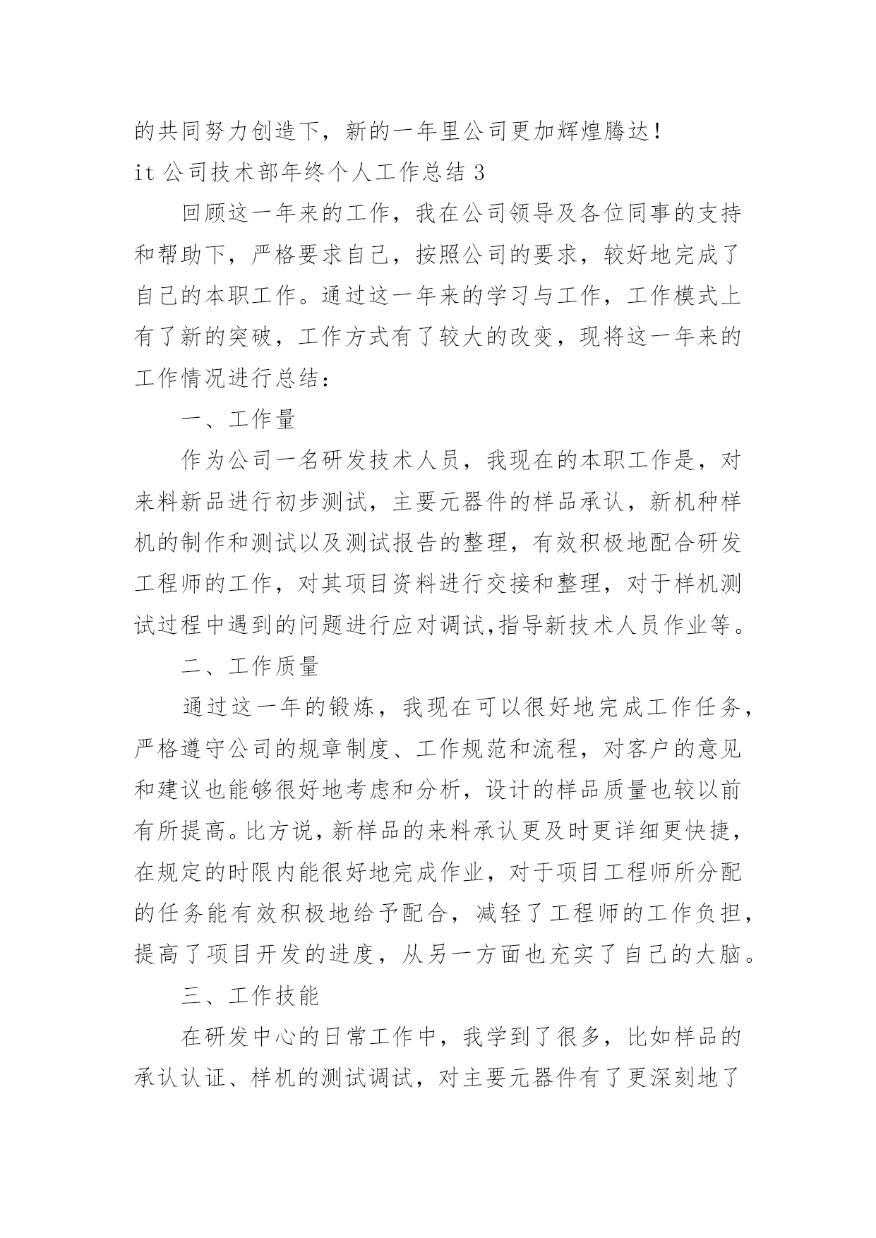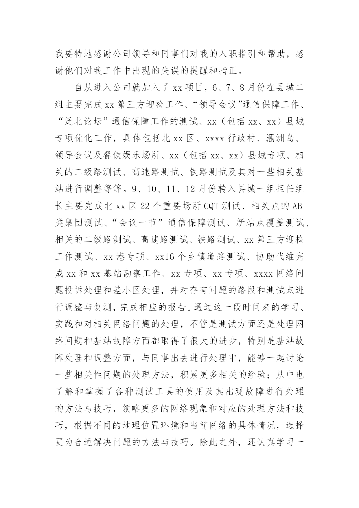 it公司技术部年终个人工作总结it公司技术部年终个人工作总结总结是指对某一阶段的工作、学习或思想中的经验或情况进行分析研究,做出带有规律性结论的书面材料,它可以使我们更有效率,我想我们需要写一份总结了吧。但是却发现不知道该写些什么,以下是小编为大家收集的it公司技术部年终个人工作总结,欢迎阅读与收藏。it公司技术部年终个人工作总结1时间慢慢的驶向了新年,自从毕业以来,自己就在xxx公司实习并工作。转眼一年的时间过去了,自己也渐渐的从一名没什么经验的学生,成长为了一名还算合格的技术部员工。在这段时间里,自己从工作、同事以及社会中,都学到了很多的知识。尽管现在还不够完善,但是我也会渐渐的提升自己,让自己成为一名合格的技术员。回顾这一年来的工作,自己的成长,伴随这努力和失败。在此,我对自己这一年来的工作情况进行总结,希望自己能在下一年的工作中努力的提升自己。我的工作总结如下:一、思想提升大于工作提升在过去这一年的工作中,我渐渐的明白了一个道理。回忆自己在进入了公司一段时间后,经过了一段时间的艰苦培训学习。在那段时间里,我承受了很大的压力和困难,曾一度的想过放弃自己的工作。但是,当自己最困难的时候,领导的鼓励和帮助给了我进一步努力的动力!在努力的度过了难关过后,我认识到,想要学习和提升自己,我必须有更加坚强的意志,和更加清晰的方向。所以在这一年的工作中,我积极的向领导学习,提升自己对公司理念和思想的认识,加强自己对职业的了解和个人意志。此外,我还积极的接触社会事实,从网络中学习知识,提高个人思想。在锻炼了自己的意志后,我感到自己有了更加明确的目标,并且面对工作和困难,也有了更大的责任感,让我在之后的工作中更加的坚韧。二、工作能力的进步在工作中,因为我在经验方面的问题,导致在工作中有很多都只是学习和帮忙,但是在领导的关照下,我认识了很多公司的产品的技术和风格,并积极的向着所需的方向学习前进,努力的提高了自己的经验。在一年里,我用过自己利用空闲时间的锻炼,加强了自己的经验和技巧,在得到了领导的认可后,也开始在工作中展现自己的能力。尽管在很多地方都不如前辈们技巧娴熟,但是我也在慢慢的进步。三、结束语时间慢慢的就过去了,但是自己的行动可不能慢了!技术在不断的革新,想要成为一名出色的IT技术员,我还要加把劲走在技术的前沿,才能更好的发挥自己的力量!it公司技术部年终个人工作总结2时间一晃而过,转眼间来到公司已有了七个月,在这一段时间里,在公司领导的精心培育和教导下,加上自身的不断努力,无论是思想上、学习上还是工作上,都取得了长足的发展和巨大的收获,这是我人生中弥足珍贵的经历,也给我留下了精彩而美好的回忆。回顾这七个月来的工作,我有很多的感想和体会。刚加入公司,在公司领导和同事的指导下,使我在较短的时间内适应了公司的工作环境。在这七个月的生活和工作中,我一直能够严格的要求自己,认真、细心且具有较强的责任心和进取心,富于工作热情与团队协作能力,确实完成领导交付的工作,和公司同事之间能够通力合作,关系相处融洽而和睦,一起配合成功地完成各项工作;积极学习新知识、技能,注重自身的发展和进步。领导的关爱与工作条件在不断改善给了我工作的动力;及其同事间的友情关怀与协作互助给了我工作的舒畅感和踏实感;更给了我工作的信心。当然,在平时的工作过程中,难免也会出现一些小差错;但前事之鉴,后事之师,这些经历也让我不断的成熟起来,在处理各种问题时考虑得更全面,杜绝类似失误的发生。我觉得自己还有以下的缺点和不足:一、处理问题的经验方面还要有待于提高;二、对工作的预见性和创造性还不够;三、专业知识(基站硬件)方面掌握的还不够扎实等。在今后的工作和学习中,我会进一步的严格要求自己,虚心向领导、同事学习,我相信凭着自己高度的责任心和自信心,一定能够改正这些不足之处,争取在各方面取得更大的进步。同时我要特地感谢公司领导和同事们对我的入职指引和帮助,感谢他们对我工作中出现的失误的提醒和指正。自从进入公司就加入了xx项目,6、7、8月份在县城二组主要完成xx第三方迎检工作、“领导会议”通信保障工作、“泛北论坛”通信保障工作的测试、xx(包括xx、xx)县城专项优化工作,具体包括北xx区、xxxx行政村、涠洲岛、领导会议及餐饮娱乐场所、xx(包括xx、xx)县城专项、相关的二级路测试、高速路测试、铁路测试及其对一些相关基站进行调整等等。9、10、11、12月份转入县城一组担任组长主要完成北xx区22个重要场所CQT测试、相关点的AB类集团测试、“会议一节”通信保障测试、新站点覆盖测试、相关的二级路测试、高速路测试、铁路测试、xx第三方迎检工作测试、xx港专项、xx16个乡镇道路测试、协助代维完成xx和xx基站勘察工作、xx专项、xx专项、xxxx网络问题投诉处理和差小区处理,并对存