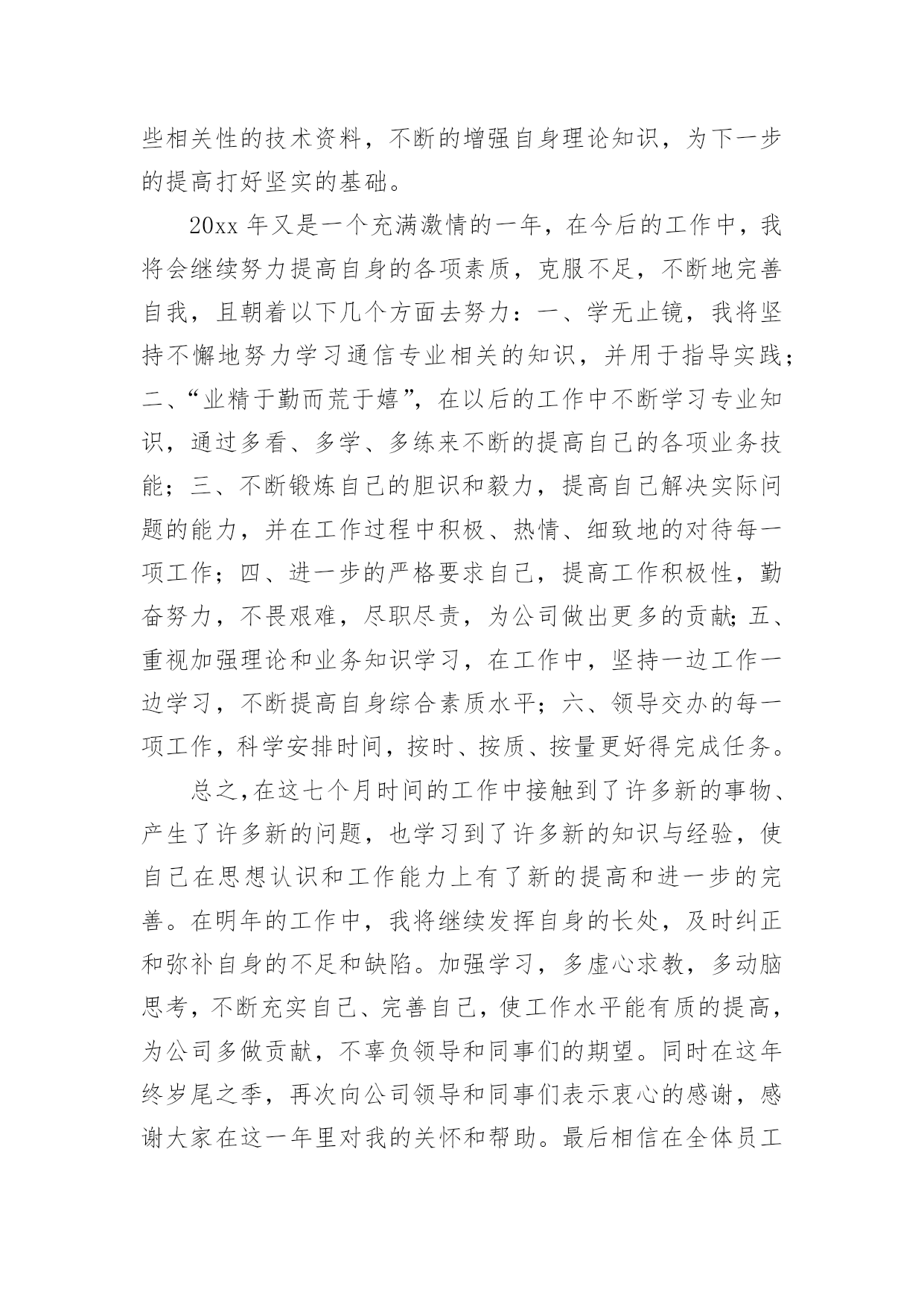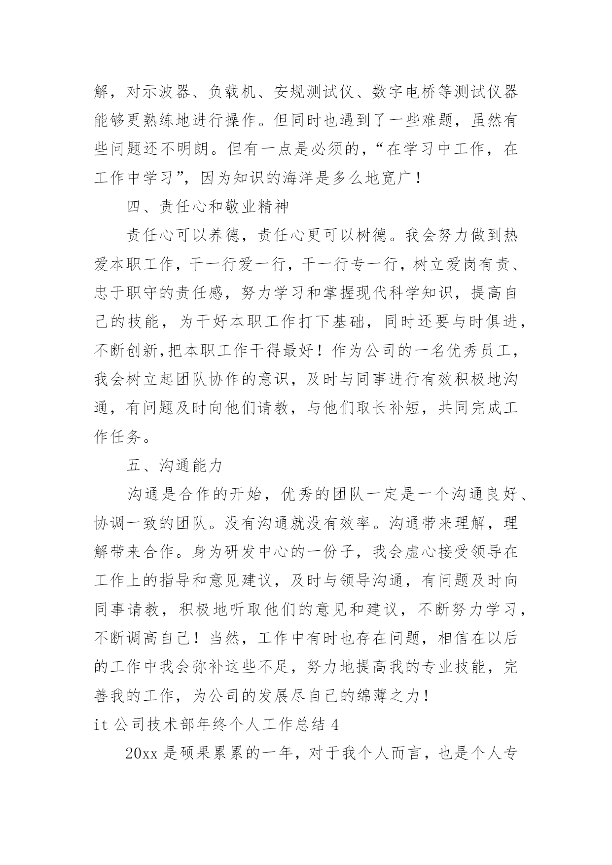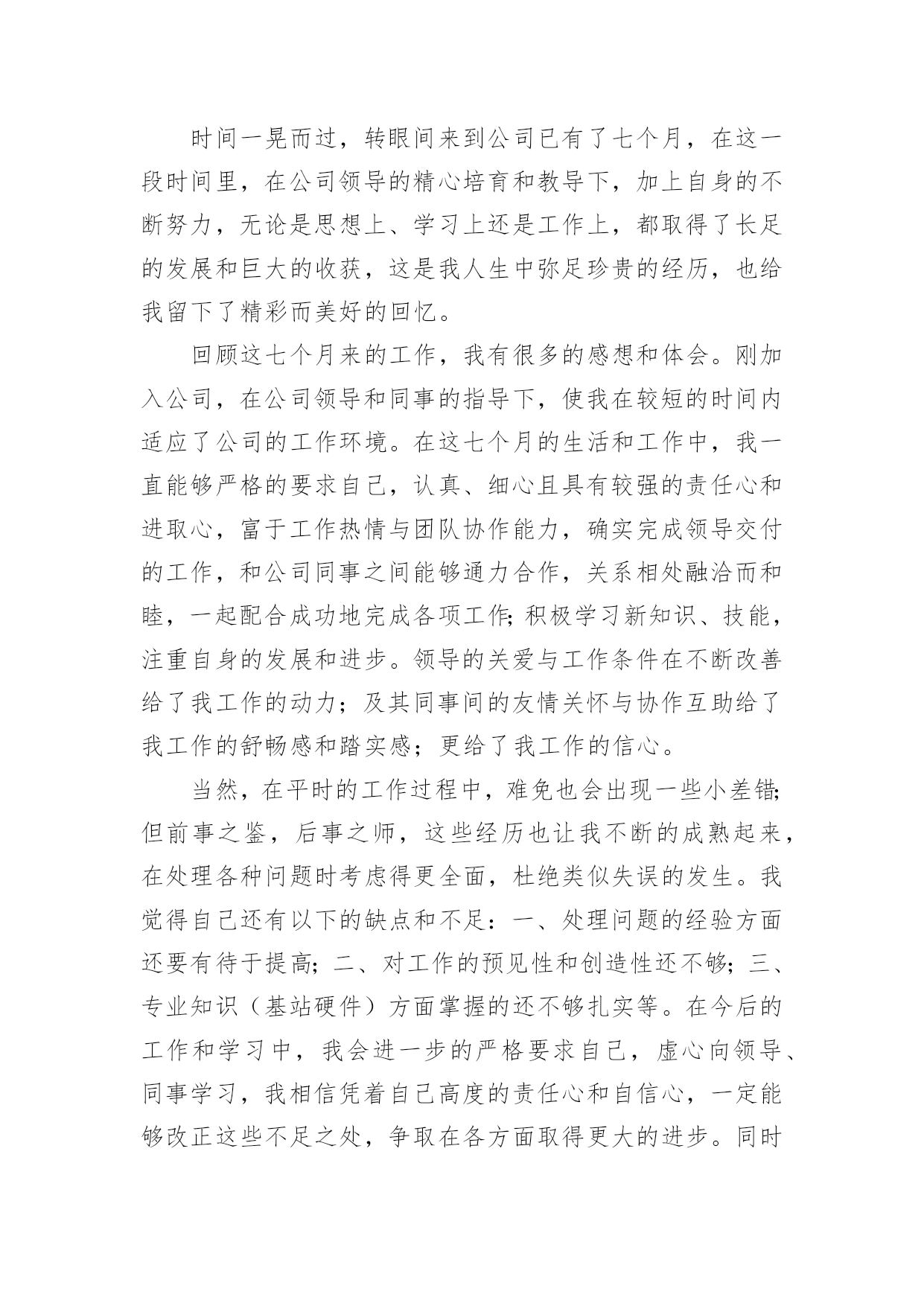 it公司技术部年终个人工作总结it公司技术部年终个人工作总结总结是指对某一阶段的工作、学习或思想中的经验或情况进行分析研究,做出带有规律性结论的书面材料,它可以使我们更有效率,我想我们需要写一份总结了吧。但是却发现不知道该写些什么,以下是小编为大家收集的it公司技术部年终个人工作总结,欢迎阅读与收藏。it公司技术部年终个人工作总结1时间慢慢的驶向了新年,自从毕业以来,自己就在xxx公司实习并工作。转眼一年的时间过去了,自己也渐渐的从一名没什么经验的学生,成长为了一名还算合格的技术部员工。在这段时间里,自己从工作、同事以及社会中,都学到了很多的知识。尽管现在还不够完善,但是我也会渐渐的提升自己,让自己成为一名合格的技术员。回顾这一年来的工作,自己的成长,伴随这努力和失败。在此,我对自己这一年来的工作情况进行总结,希望自己能在下一年的工作中努力的提升自己。我的工作总结如下:一、思想提升大于工作提升在过去这一年的工作中,我渐渐的明白了一个道理。回忆自己在进入了公司一段时间后,经过了一段时间的艰苦培训学习。在那段时间里,我承受了很大的压力和困难,曾一度的想过放弃自己的工作。但是,当自己最困难的时候,领导的鼓励和帮助给了我进一步努力的动力!在努力的度过了难关过后,我认识到,想要学习和提升自己,我必须有更加坚强的意志,和更加清晰的方向。所以在这一年的工作中,我积极的向领导学习,提升自己对公司理念和思想的认识,加强自己对职业的了解和个人意志。此外,我还积极的接触社会事实,从网络中学习知识,提高个人思想。在锻炼了自己的意志后,我感到自己有了更加明确的目标,并且面对工作和困难,也有了更大的责任感,让我在之后的工作中更加的坚韧。二、工作能力的进步在工作中,因为我在经验方面的问题,导致在工作中有很多都只是学习和帮忙,但是在领导的关照下,我认识了很多公司的产品的技术和风格,并积极的向着所需的方向学习前进,努力的提高了自己的经验。在一年里,我用过自己利用空闲时间的锻炼,加强了自己的经验和技巧,在得到了领导的认可后,也开始在工作中展现自己的能力。尽管在很多地方都不如前辈们技巧娴熟,但是我也在慢慢的进步。三、结束语时间慢慢的就过去了,但是自己的行动可不能慢了!技术在不断的革新,想要成为一名出色的IT技术员,我还要加把劲走在技术的前沿,才能更好的发挥自己的力量!it公司技术部年终个人工作总结2时间一晃而过,转眼间来到公司已有了七个月,在这一段时间里,在公司领导的精心培育和教导下,加上自身的不断努力,无论是思想上、学习上还是工作上,都取得了长足的发展和巨大的收获,这是我人生中弥足珍贵的经历,也给我留下了精彩而美好的回忆。回顾这七个月来的工作,我有很多的感想和体会。刚加入公司,在公司领导和同事的指导下,使我在较短的时间内适应了公司的工作环境。在这七个月的生活和工作中,我一直能够严格的要求自己,认真、细心且具有较强的责任心和进取心,富于工作热情与团队协作能力,确实完成领导交付的工作,和公司同事之间能够通力合作,关系相处融洽而和睦,一起配合成功地完成各项工作;积极学习新知识、技能,注重自身的发展和进步。领导的关爱与工作条件在不断改善给了我工作的动力;及其同事间的友情关怀与协作互助给了我工作的舒畅感和踏实感;更给了我工作的信心。当然,在平时的工作过程中,难免也会出现一些小差错;但前事之鉴,后事之师,这些经历也让我不断的成熟起来,在处理各种问题时考虑得更全面,杜绝类似失误的发生。我觉得自己还有以下的缺点和不足:一、处理问题的经验方面还要有待于提高;二、对工作的预见性和创造性还不够;三、专业知识(基站硬件)方面掌握的还不够扎实等。在今后的工作和学习中,我会进一步的严格要求自己,虚心向领导、同事学习,我相信凭着自己高度的责任心和自信心,一定能够改正这些不足之处,争取在各方面取得更大的进步。同时我要特地感谢公司领导和同事们对我的入职指引和帮助,感谢他们对我工作中出现的失误的提醒和指正。自从进入公司就加入了xx项目,6、7、8月份在县城二组主要完成xx第三方迎检工作、“领导会议”通信保障工作、“泛北论坛”通信保障工作的测试、xx(包括xx、xx)县城专项优化工作,具体包括北xx区、xxxx行政村、涠洲岛、领导会议及餐饮娱乐场所、xx(包括xx、xx)县城专项、相关的二级路测试、高速路测试、铁路测试及其对一些相关基站进行调整等等。9、10、11、12月份转入县城一组担任组长主要完成北xx区22个重要场所CQT测试、相关点的AB类集团测试、“会议一节”通信保障测试、新站点覆盖测试、相关的二级路测试、高速路测试、铁路测试、xx第三方迎检工作测试、xx港专项、xx16个乡镇道路测试、协助代维完成xx和xx基站勘察工作、xx专项、xx专项、xxxx网络问题投诉处理和差小区处理,并对存