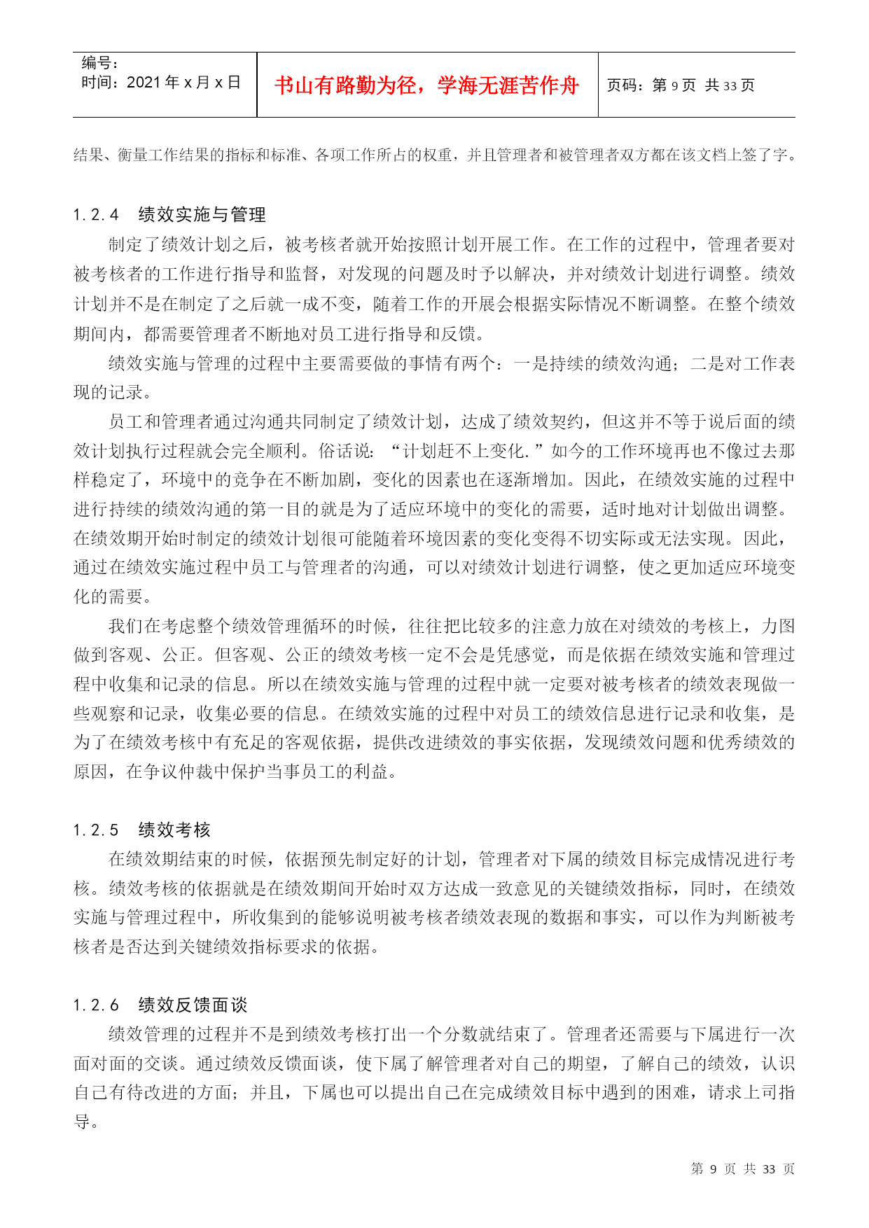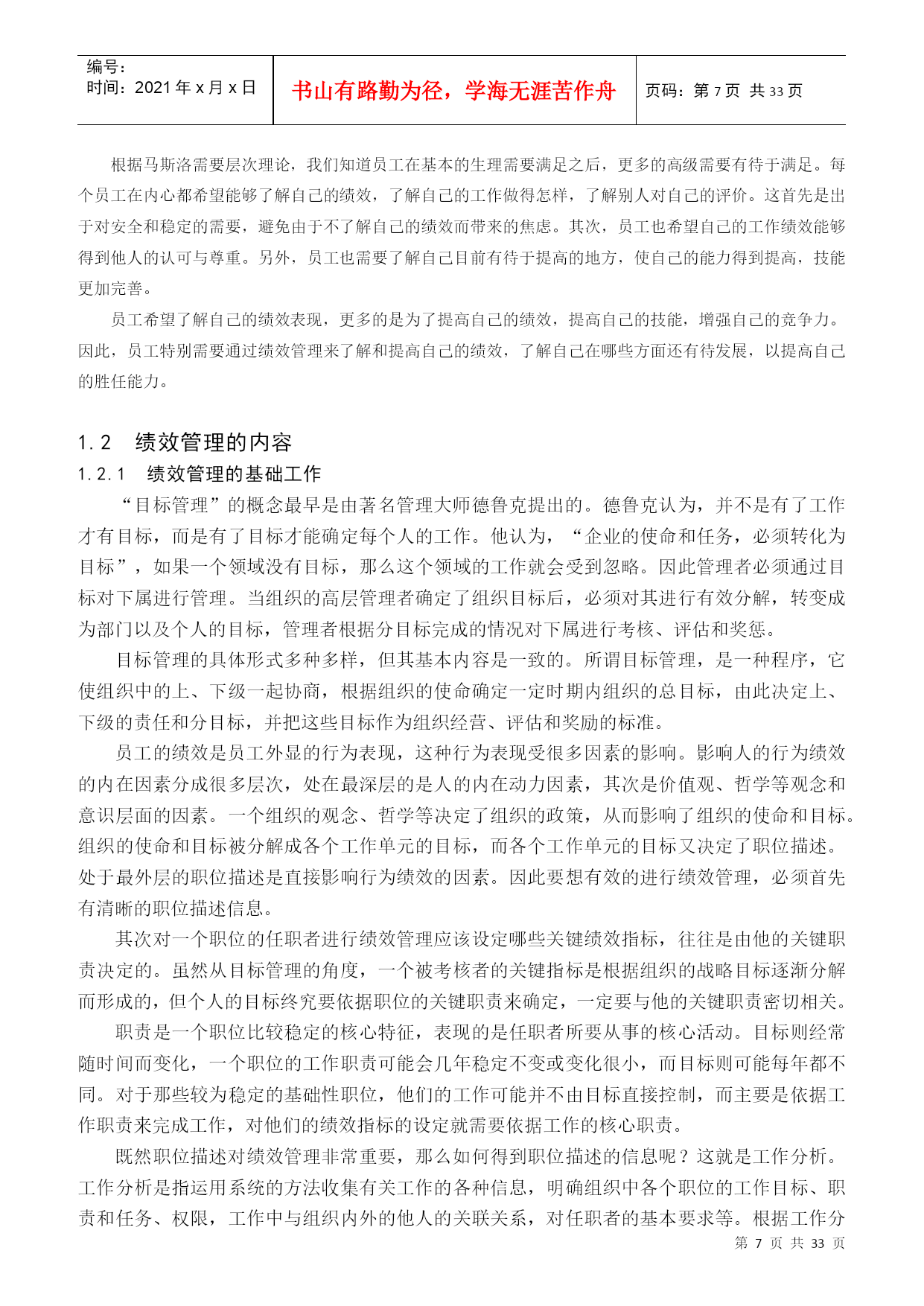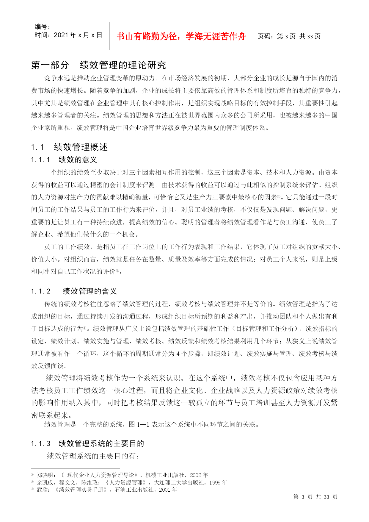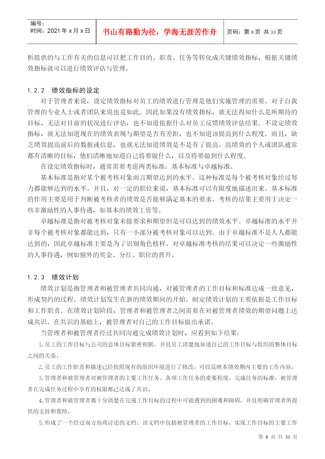 编号:时间:2021年x月x日书山有路勤为径,学海无涯苦作舟页码:第PAGE33页共NUMPAGES33页第PAGE\*MERGEFORMAT33页共NUMPAGES\*MERGEFORMAT33页目录\o"1-3"\h\z前言随着又一个千年的到来,新世纪曙光初露,以知识、科技和信息的产生、创新、流通、分配及应用为基础的知识经济正向我们走来,顾客需求瞬息万变、技术创新不断加速、产品生命周期不断缩短、市场竞争日趋剧烈,企业管理面临着越来越多的挑战和冲击。知识经济的核心就是以人力资源和知识资本为中心的新经济。1992年诺贝尔经济学奖得主,美国经济学家贝克尔深刻指出,发达国家资本的75%以上不再是物质资本,而是人力资本①李啸尘:《新人力资源管理》,石油工业出版社,2000年。人力资本成了人类财富和经济进步的源泉。人是生产力诸要素中最重要的要素,一切知识、科技、信息无不以人为载体,在企业管理领域,人已成为实现企业自身战略目标的一个非常关键的因素。企业中人心的向背和员工对工作的投入程度在很大程度上决定了企业的兴衰与成败。如何能保持企业员工的工作责任感,激励他们的工作热情,减少人才的流失,已成为困扰企业高层领导、人力资源经理和部门主管的一个日益尖锐的问题。企业管理从根本上来讲就是对人的管理。从国际上看,20世纪末高新技术的发展使劳动者在社会生产中的地位发生了质的变化。回顾工业革命以来的历史就可以看到,工业革命曾使往日的自由劳动者成了机器的附庸;劳动异化为资本的奴隶;人制造的机器反过来成了人的主宰。与此相对应,工业革命时代管理学的构架在很长时期内围绕着“事”为中心建造,人不过为完成“事”而存在。高新技术的发展改变了工业革命的传统格局,劳动者在生产中的地位迅速上升。无论是知识的创新,还是高科技成果的应用,劳动再次超越资本成为价值增值的主要源泉。在知识经济时代,企业中的人力资源管理也必须突破工业经济时代的模式,才能构建新的激励机制,才能最大限度地发挥劳动者的积极性和创造性,企业才能形成具有持续发展的竞争力。人力资源的开发与管理在发达国家已有六七十年,我们以前一直沿用传统的人事管理模式,真正当代意义上的人力资源开发与管理才起步几年。我们无论在理论上还是在实践上都欠缺太多,然而我们又必须面对扑面而来的严峻挑战。当前,中国企业面临的环境越来越复杂:市场的不确定性,技术的创新性,组织的变革性,人员的流动性。尤其是世界经济一体化的浪潮席卷全球,中国加入,如何面对挑战?如何保持自己的竞争优势?现代企业之间的竞争,归根到底是人的竞争,要使优秀的员工成为企业的核心竞争力,怎样去获取、领导与发展他们,已成为人力资源管理的重点所在。员工的绩效如何评定?如何改进?这是任何企业都必须面对的一个难题。国际上许多企业都通过建立和健全绩效管理体系来解决这一难题。传统的绩效考核体系只重视员工绩效考核本身,是一种事后评估,绩效管理是一个系统的控制过程,它是企业将战略转化为行动的过程,是企业战略管理的一个子系统,其深层目标是基于企业的发展战略,通过员工与管理者持续、动态的沟通,明确员工的工作任务及绩效目标,并确定对员工工作结果的衡量办法,在过程中影响员工的行为,从而实现公司的目标,并使员工得到发展。本文拟用绩效管理的思想对公司原有的绩效考核体系进行重新设计,以实现公司战略目标,促进员工成长,公司得以持续发展。第一部分绩效管理的理论研究竞争永远是推动企业管理变革的原动力。在市场经济发展的初期,大部分企业的成长是源自于国内的消费市场的快速增长。随着竞争的加剧,企业的成长将主要依靠高效的管理体系和制度所培育的独特的竞争力。其中尤其是绩效管理在企业管理中具有核心控制作用,是组织实现战略目标的有效控制手段,其重要性引起越来越多管理者的关注。绩效管理的思想和方法正在被世界范围内众多的公司所采用,也被越来越多的中国企业家所重视。绩效管理将是中国企业培育世界级竞争力最为重要的管理制度体系。1.1绩效管理概述1.1.1绩效的意义一个组织的绩效至少取决于对三个因素相互作用的控制,这三个因素是资本、技术和人力资源。由资本获得的收益可以通过精密的会计制度来评测。由技术获得的收益可以通过与此相似的控制系统来评估。组织的人力资源对生产力的贡献难以精确衡量,可恰恰它又是生产力三要素中最核心的因素②郑晓明:《现代企业人力资源管理导论》,机械工业出版社,2002年。它只能通过一段时间员工的工作结果与员工的工作行为来评价。并且,对员工业绩的考核,不仅仅是发现问题、解决问题,更重要的是让员工有一种持续改进,提高绩效的信心。聪明的管理者将绩效管理看