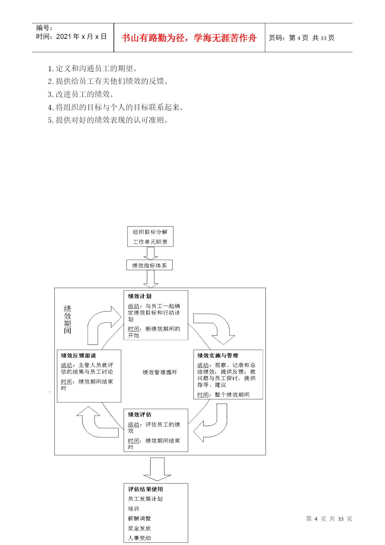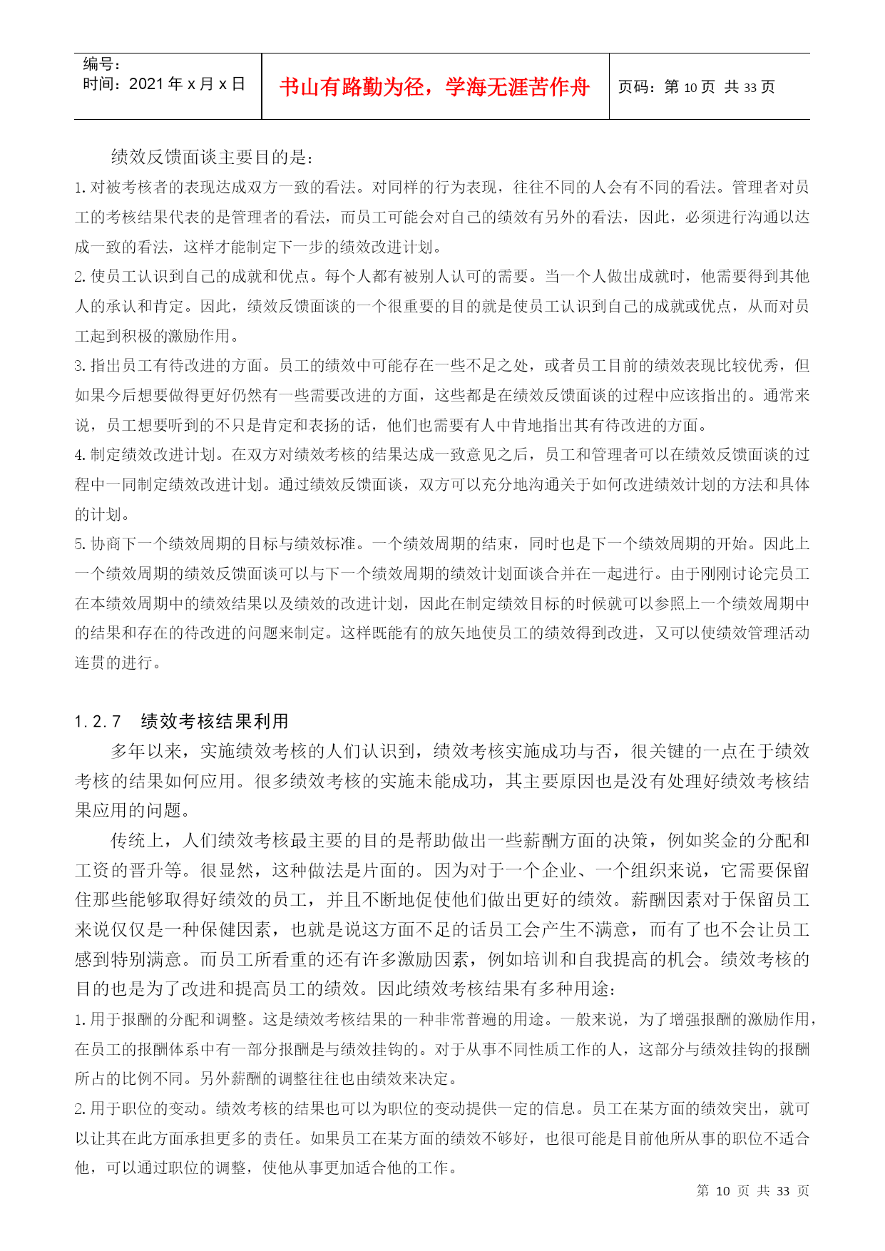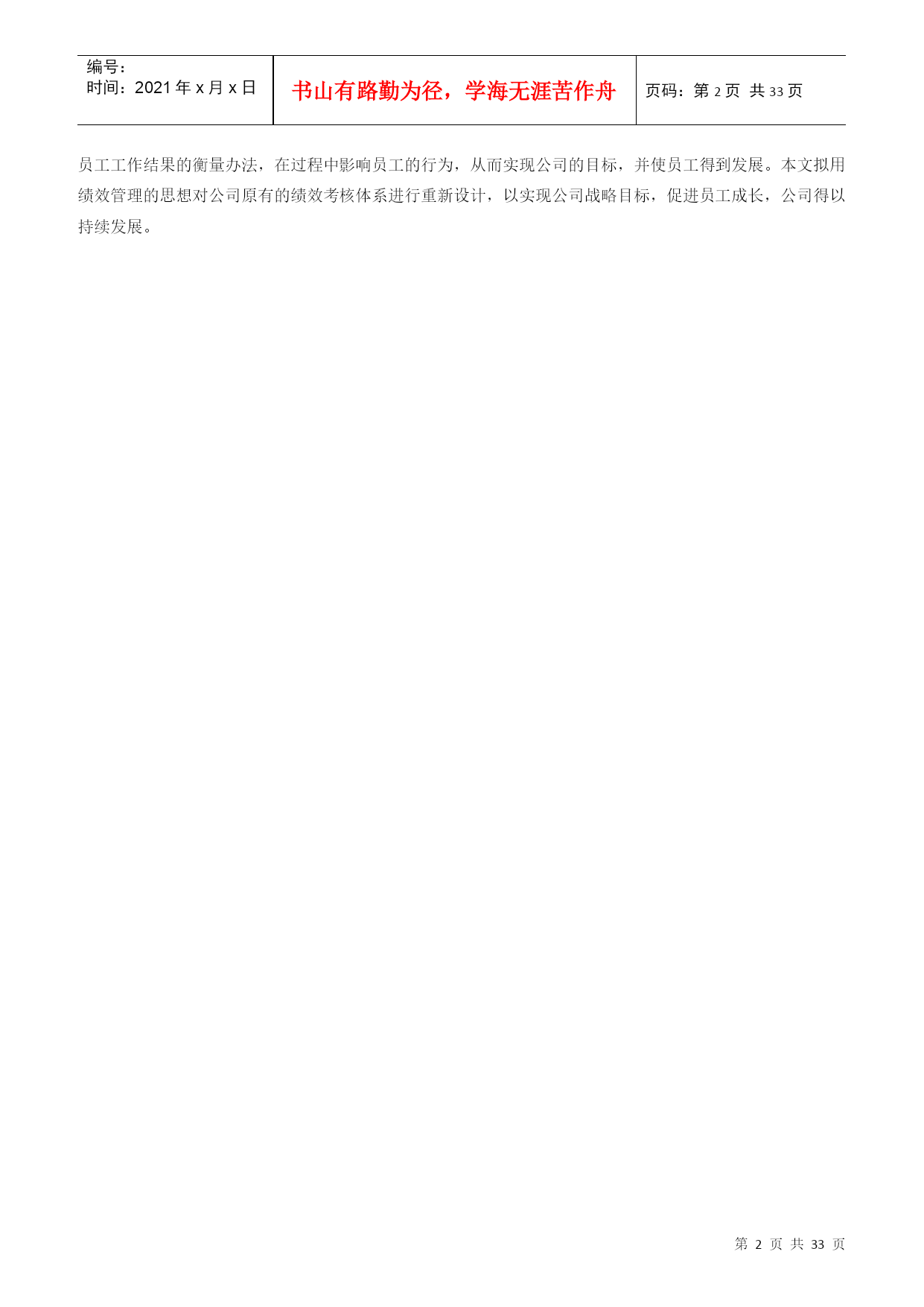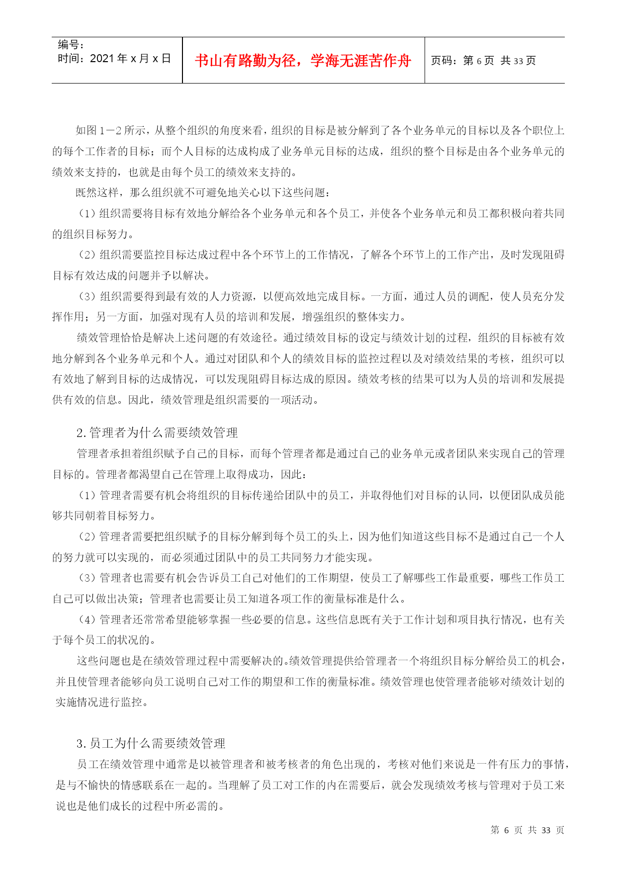 编号:时间:2021年x月x日书山有路勤为径,学海无涯苦作舟页码:第PAGE33页共NUMPAGES33页第PAGE\*MERGEFORMAT33页共NUMPAGES\*MERGEFORMAT33页目录\o"1-3"\h\z前言随着又一个千年的到来,新世纪曙光初露,以知识、科技和信息的产生、创新、流通、分配及应用为基础的知识经济正向我们走来,顾客需求瞬息万变、技术创新不断加速、产品生命周期不断缩短、市场竞争日趋剧烈,企业管理面临着越来越多的挑战和冲击。知识经济的核心就是以人力资源和知识资本为中心的新经济。1992年诺贝尔经济学奖得主,美国经济学家贝克尔深刻指出,发达国家资本的75%以上不再是物质资本,而是人力资本①李啸尘:《新人力资源管理》,石油工业出版社,2000年。人力资本成了人类财富和经济进步的源泉。人是生产力诸要素中最重要的要素,一切知识、科技、信息无不以人为载体,在企业管理领域,人已成为实现企业自身战略目标的一个非常关键的因素。企业中人心的向背和员工对工作的投入程度在很大程度上决定了企业的兴衰与成败。如何能保持企业员工的工作责任感,激励他们的工作热情,减少人才的流失,已成为困扰企业高层领导、人力资源经理和部门主管的一个日益尖锐的问题。企业管理从根本上来讲就是对人的管理。从国际上看,20世纪末高新技术的发展使劳动者在社会生产中的地位发生了质的变化。回顾工业革命以来的历史就可以看到,工业革命曾使往日的自由劳动者成了机器的附庸;劳动异化为资本的奴隶;人制造的机器反过来成了人的主宰。与此相对应,工业革命时代管理学的构架在很长时期内围绕着“事”为中心建造,人不过为完成“事”而存在。高新技术的发展改变了工业革命的传统格局,劳动者在生产中的地位迅速上升。无论是知识的创新,还是高科技成果的应用,劳动再次超越资本成为价值增值的主要源泉。在知识经济时代,企业中的人力资源管理也必须突破工业经济时代的模式,才能构建新的激励机制,才能最大限度地发挥劳动者的积极性和创造性,企业才能形成具有持续发展的竞争力。人力资源的开发与管理在发达国家已有六七十年,我们以前一直沿用传统的人事管理模式,真正当代意义上的人力资源开发与管理才起步几年。我们无论在理论上还是在实践上都欠缺太多,然而我们又必须面对扑面而来的严峻挑战。当前,中国企业面临的环境越来越复杂:市场的不确定性,技术的创新性,组织的变革性,人员的流动性。尤其是世界经济一体化的浪潮席卷全球,中国加入,如何面对挑战?如何保持自己的竞争优势?现代企业之间的竞争,归根到底是人的竞争,要使优秀的员工成为企业的核心竞争力,怎样去获取、领导与发展他们,已成为人力资源管理的重点所在。员工的绩效如何评定?如何改进?这是任何企业都必须面对的一个难题。国际上许多企业都通过建立和健全绩效管理体系来解决这一难题。传统的绩效考核体系只重视员工绩效考核本身,是一种事后评估,绩效管理是一个系统的控制过程,它是企业将战略转化为行动的过程,是企业战略管理的一个子系统,其深层目标是基于企业的发展战略,通过员工与管理者持续、动态的沟通,明确员工的工作任务及绩效目标,并确定对员工工作结果的衡量办法,在过程中影响员工的行为,从而实现公司的目标,并使员工得到发展。本文拟用绩效管理的思想对公司原有的绩效考核体系进行重新设计,以实现公司战略目标,促进员工成长,公司得以持续发展。第一部分绩效管理的理论研究竞争永远是推动企业管理变革的原动力。在市场经济发展的初期,大部分企业的成长是源自于国内的消费市场的快速增长。随着竞争的加剧,企业的成长将主要依靠高效的管理体系和制度所培育的独特的竞争力。其中尤其是绩效管理在企业管理中具有核心控制作用,是组织实现战略目标的有效控制手段,其重要性引起越来越多管理者的关注。绩效管理的思想和方法正在被世界范围内众多的公司所采用,也被越来越多的中国企业家所重视。绩效管理将是中国企业培育世界级竞争力最为重要的管理制度体系。1.1绩效管理概述1.1.1绩效的意义一个组织的绩效至少取决于对三个因素相互作用的控制,这三个因素是资本、技术和人力资源。由资本获得的收益可以通过精密的会计制度来评测。由技术获得的收益可以通过与此相似的控制系统来评估。组织的人力资源对生产力的贡献难以精确衡量,可恰恰它又是生产力三要素中最核心的因素②郑晓明:《现代企业人力资源管理导论》,机械工业出版社,2002年。它只能通过一段时间员工的工作结果与员工的工作行为来评价。并且,对员工业绩的考核,不仅仅是发现问题、解决问题,更重要的是让员工有一种持续改进,提高绩效的信心。聪明的管理者将绩效管理看