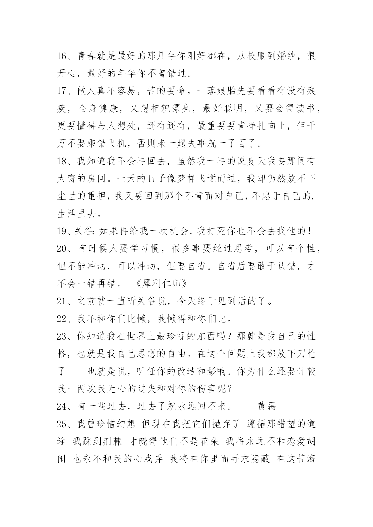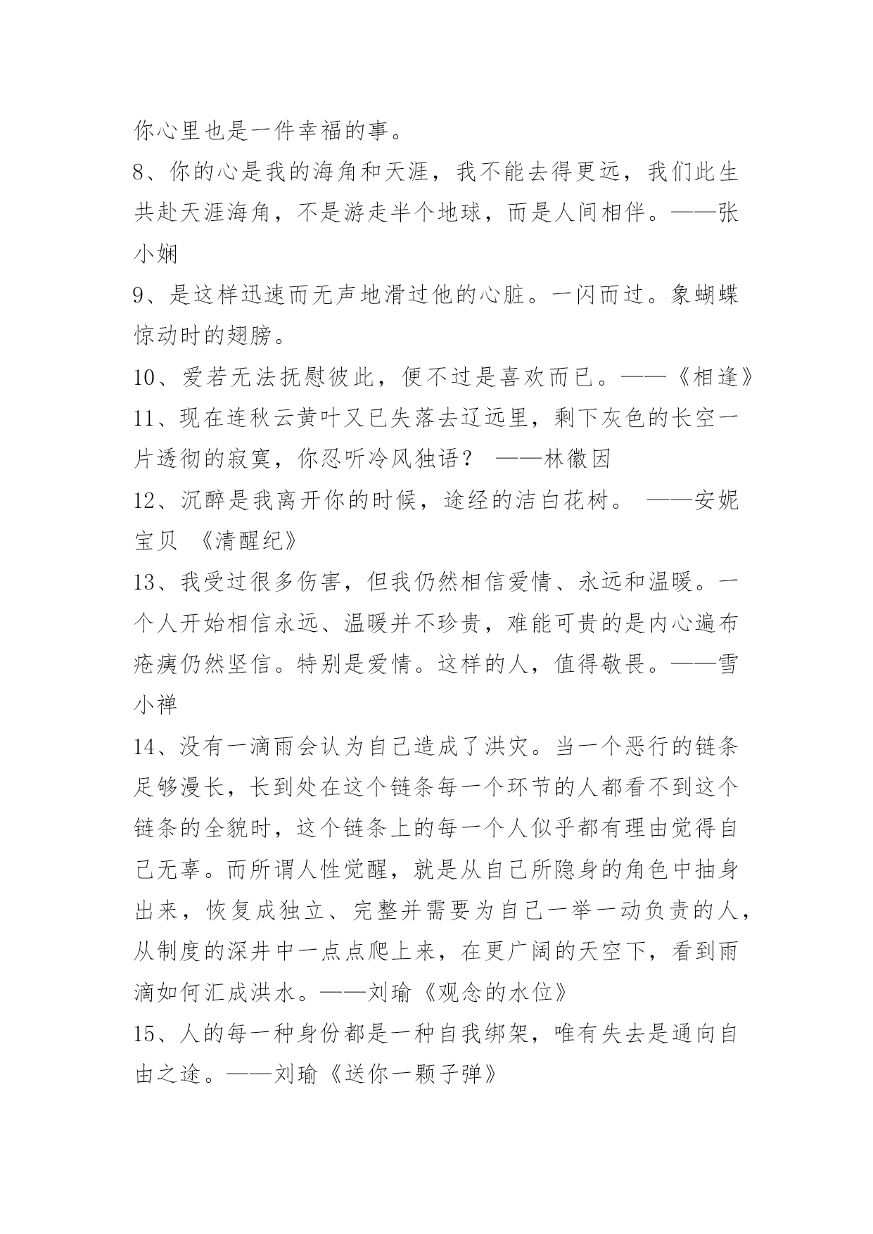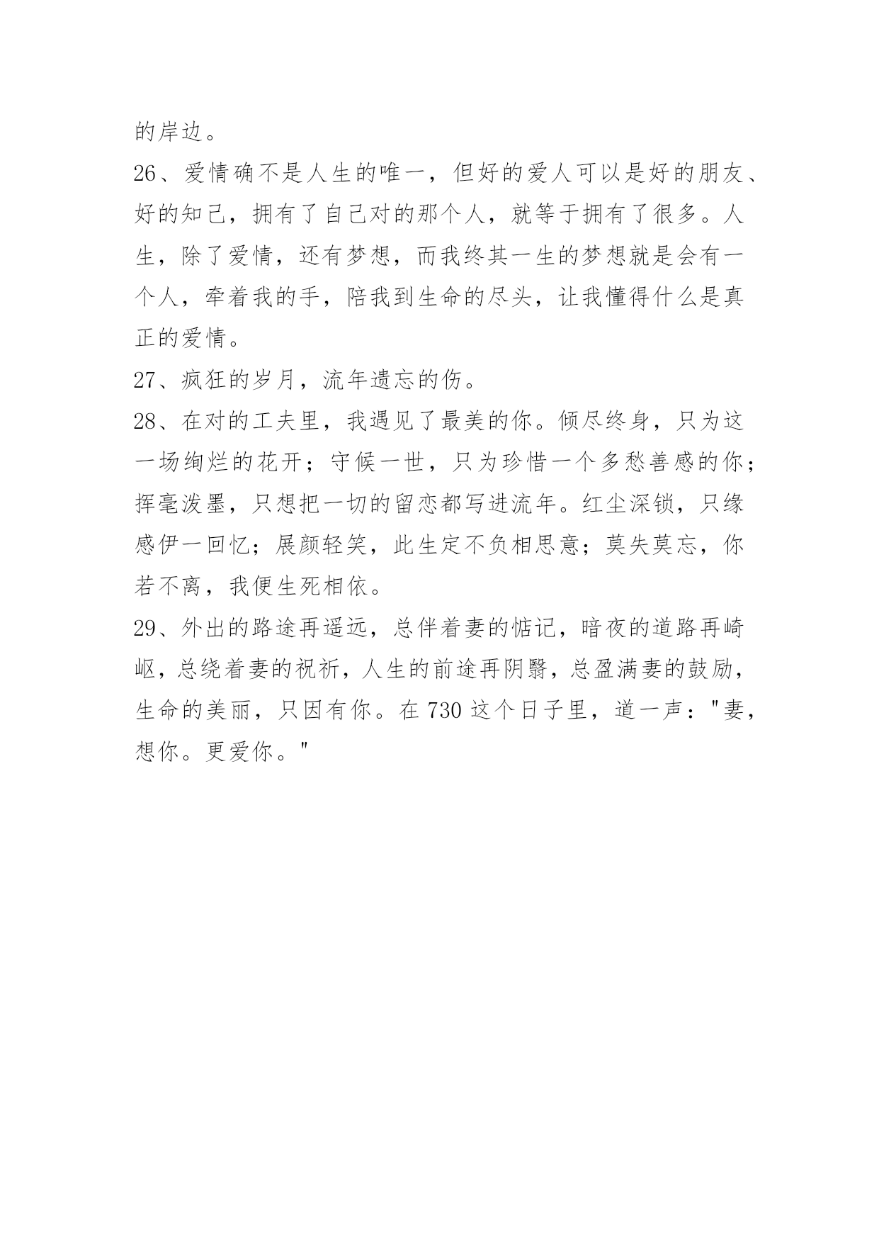 常用爱情的语录29条2022年常用爱情的语录29条爱一个人不必非得跟他在一起,喜爱普罗旺斯也不见得一定要赤着脚板徜徉在薰衣草花田里。下面是小编为大家整理推荐的爱情的语录29条,欢迎大家借鉴与参考,希望对大家有所帮助。1、"为什么每次出门,都要合影?"2、原谅捧花的我盛装出席只为错过你。我站在众多的宾客之间,远远地看着你站在你爱的那个人面前,笑得灿烂。我只看见你白色的婚纱、美丽的妆容,还有,还有轻轻挽着那个人的手臂。3、我努力地爬上一颗不断滚动的圆球,却始终站不稳,常常跌落……你说男孩别哭。《我只能为你画一张小卡片》4、青春,如同一场盛大而华丽的戏,我们有着不同的假面,扮演着不同的角色,演绎着不同的经历,却有着相同的悲哀。——席慕容5、如果谎言是一种伤害,请选择沈默。如果沈默是一种伤害,请选择离开。6、人都有这个脾气,凡是他愿意相信的事情,总是特别容易相信。7、偷偷喜欢一个人是这样的,不一定要和他一起,不一定时刻打听他的消息,偶尔联系,知道他生活得很好,那就安心了。喜欢一个人不一定要住进他的心里,让他安静的住在你心里也是一件幸福的事。8、你的心是我的海角和天涯,我不能去得更远,我们此生共赴天涯海角,不是游走半个地球,而是人间相伴。——张小娴9、是这样迅速而无声地滑过他的心脏。一闪而过。象蝴蝶惊动时的翅膀。10、爱若无法抚慰彼此,便不过是喜欢而已。——《相逢》11、现在连秋云黄叶又已失落去辽远里,剩下灰色的长空一片透彻的寂寞,你忍听冷风独语?——林徽因12、沉醉是我离开你的时候,途经的洁白花树。——安妮宝贝《清醒纪》13、我受过很多伤害,但我仍然相信爱情、永远和温暖。一个人开始相信永远、温暖并不珍贵,难能可贵的是内心遍布疮痍仍然坚信。特别是爱情。这样的人,值得敬畏。——雪小禅14、没有一滴雨会认为自己造成了洪灾。当一个恶行的链条足够漫长,长到处在这个链条每一个环节的人都看不到这个链条的全貌时,这个链条上的每一个人似乎都有理由觉得自己无辜。而所谓人性觉醒,就是从自己所隐身的角色中抽身出来,恢复成独立、完整并需要为自己一举一动负责的人,从制度的深井中一点点爬上来,在更广阔的天空下,看到雨滴如何汇成洪水。——刘瑜《观念的水位》15、人的每一种身份都是一种自我绑架,唯有失去是通向自由之途。——刘瑜《送你一颗子弹》16、青春就是最好的那几年你刚好都在,从校服到婚纱,很开心,最好的年华你不曾错过。17、做人真不容易,苦的要命。一落娘胎先要看看有没有残疾,全身健康,又想相貌漂亮,最好聪明,又要会得读书,更要懂得与人想处,还有还有,最重要要肯挣扎向上,但千万不要乘错飞机,否则来一趟失事就一了百了。18、我知道我不会再回去,虽然我一再的说夏天我要那间有大窗的房间。七天的日子像梦样飞逝而过,我却仍然放不下尘世的重担,我又要回到那个不肯面对自己,不忠于自己的.生活里去。19、关谷:如果再给我一次机会,我打死你也不会去找他的!20、有时候人要学习慢,很多事要经过思考,可以有个性,但不能冲动,可以冲动,但要自省。自省后要敢于认错,才不会一错再错。《犀利仁师》21、之前就一直听关谷说,今天终于见到活的了。22、我不和你们比懒,我懒得和你们比。23、你知道我在世界上最珍视的东西吗?那就是我自己的性格,也就是我自己思想的自由。在这个问题上我都放下刀枪了——也就是说,听任你的改造和影响。你为什么还要计较我一两次我无心的过失和对你的伤害呢?24、有一些过去,过去了就永远回不来。——黄磊25、我曾珍惜幻想但现在我把它们抛弃了遵循那错望的道途我踩到荆棘才晓得他们不是花朵我将永远不和恋爱胡闹也永不和我的心戏弄我将在你里面寻求隐蔽在这苦海的岸边。26、爱情确不是人生的唯一,但好的爱人可以是好的朋友、好的知己,拥有了自己对的那个人,就等于拥有了很多。人生,除了爱情,还有梦想,而我终其一生的梦想就是会有一个人,牵着我的手,陪我到生命的尽头,让我懂得什么是真正的爱情。27、疯狂的岁月,流年遗忘的伤。28、在对的工夫里,我遇见了最美的你。倾尽终身,只为这一场绚烂的花开;守候一世,只为珍惜一个多愁善感的你;挥毫泼墨,只想把一切的留恋都写进流年。红尘深锁,只缘感伊一回忆;展颜轻笑,此生定不负相思意;莫失莫忘,你若不离,我便生死相依。29、外出的路途再遥远,总伴着妻的惦记,暗夜的道路再崎岖,总绕着妻的祝祈,人生的前途再阴翳,总盈满妻的鼓励,生命的美丽,只因有你。在730这个日子里,道一声:"妻,想你。更爱你。"