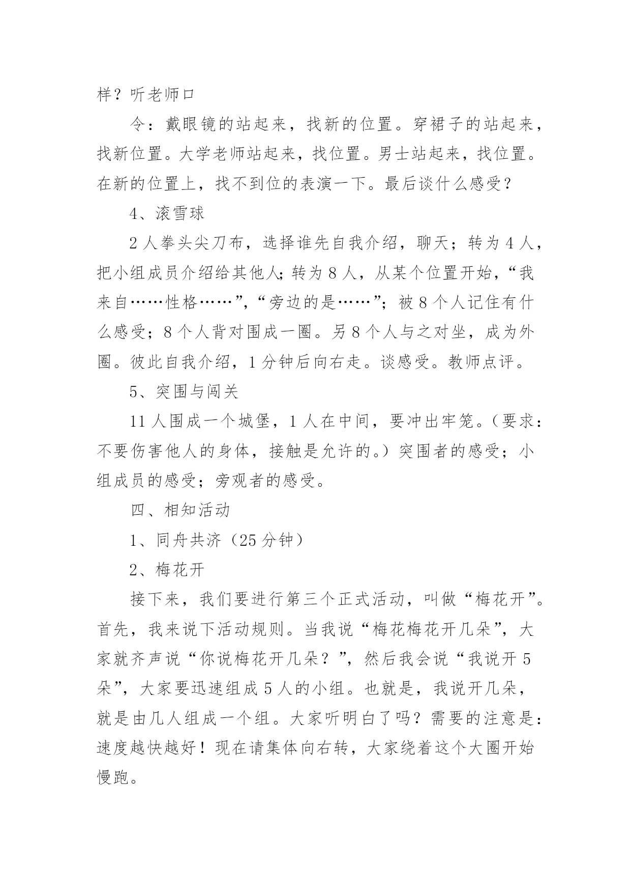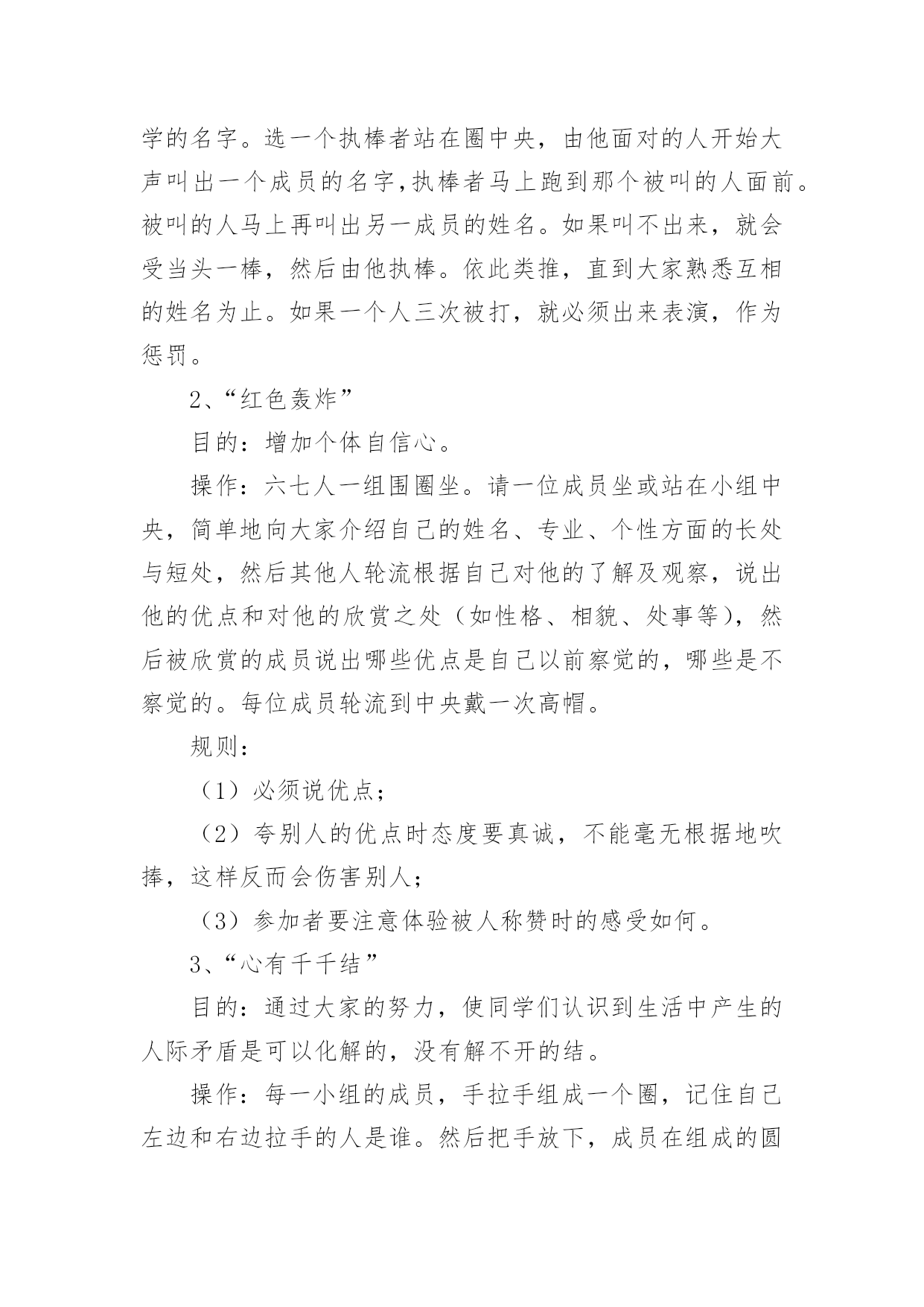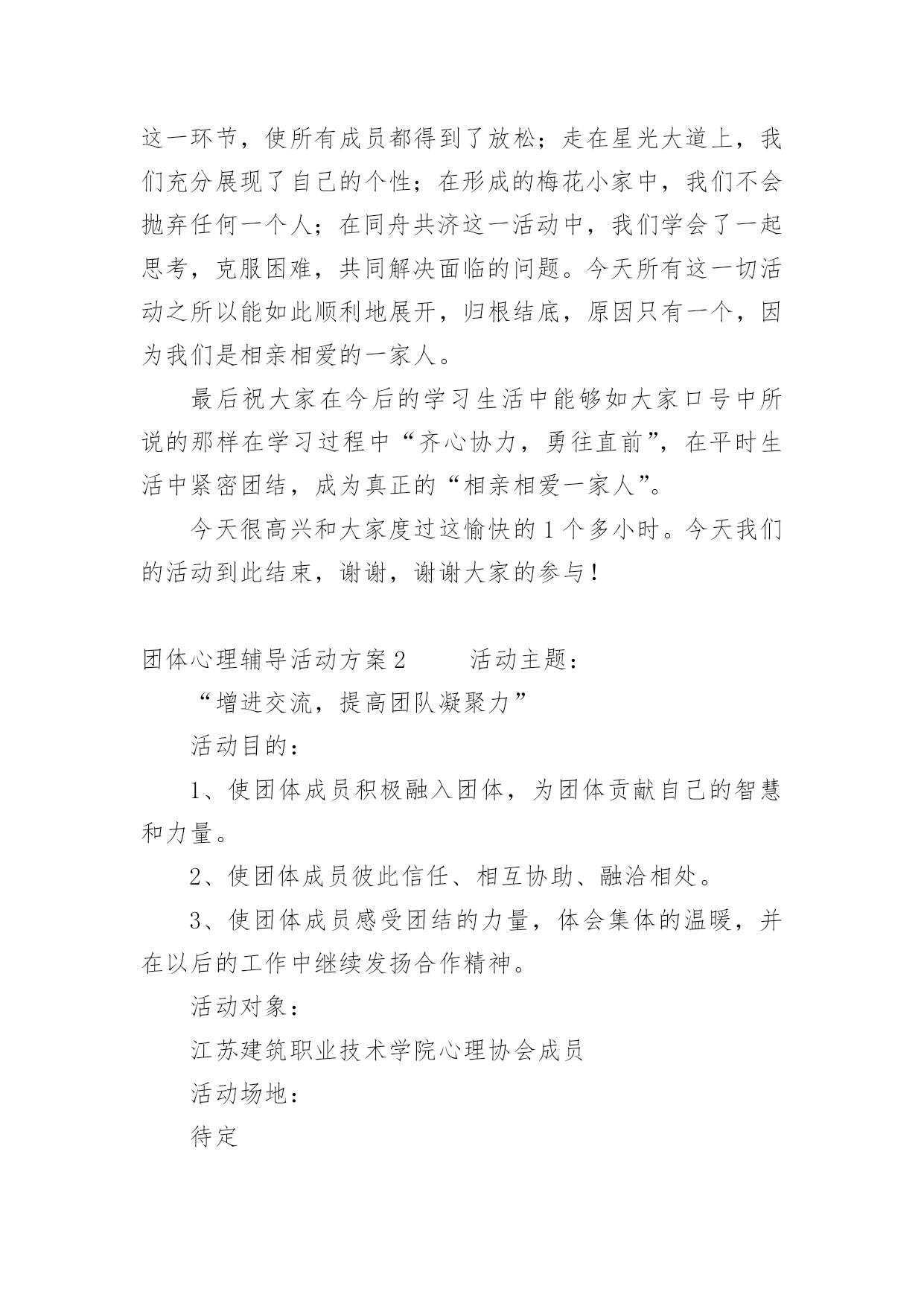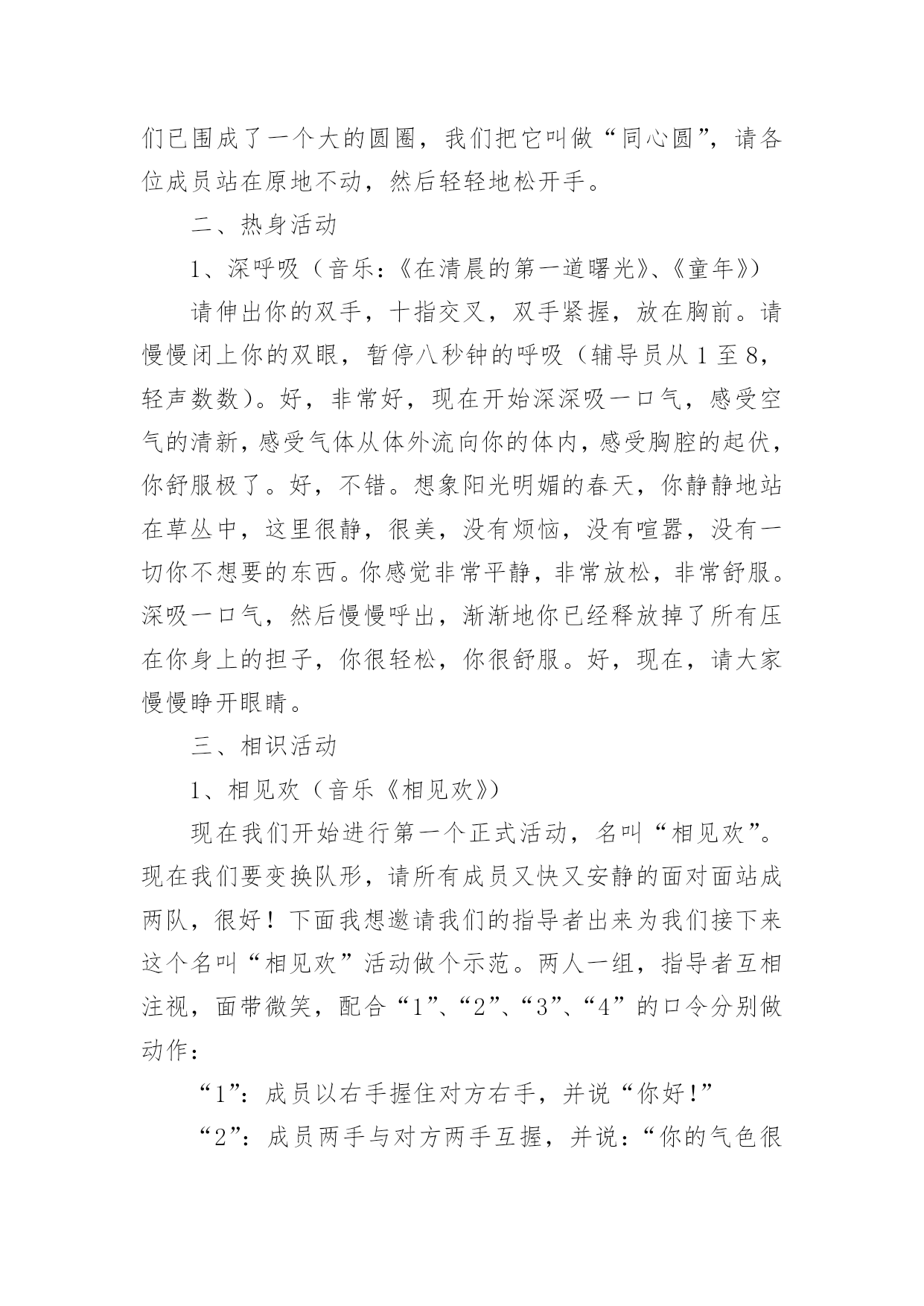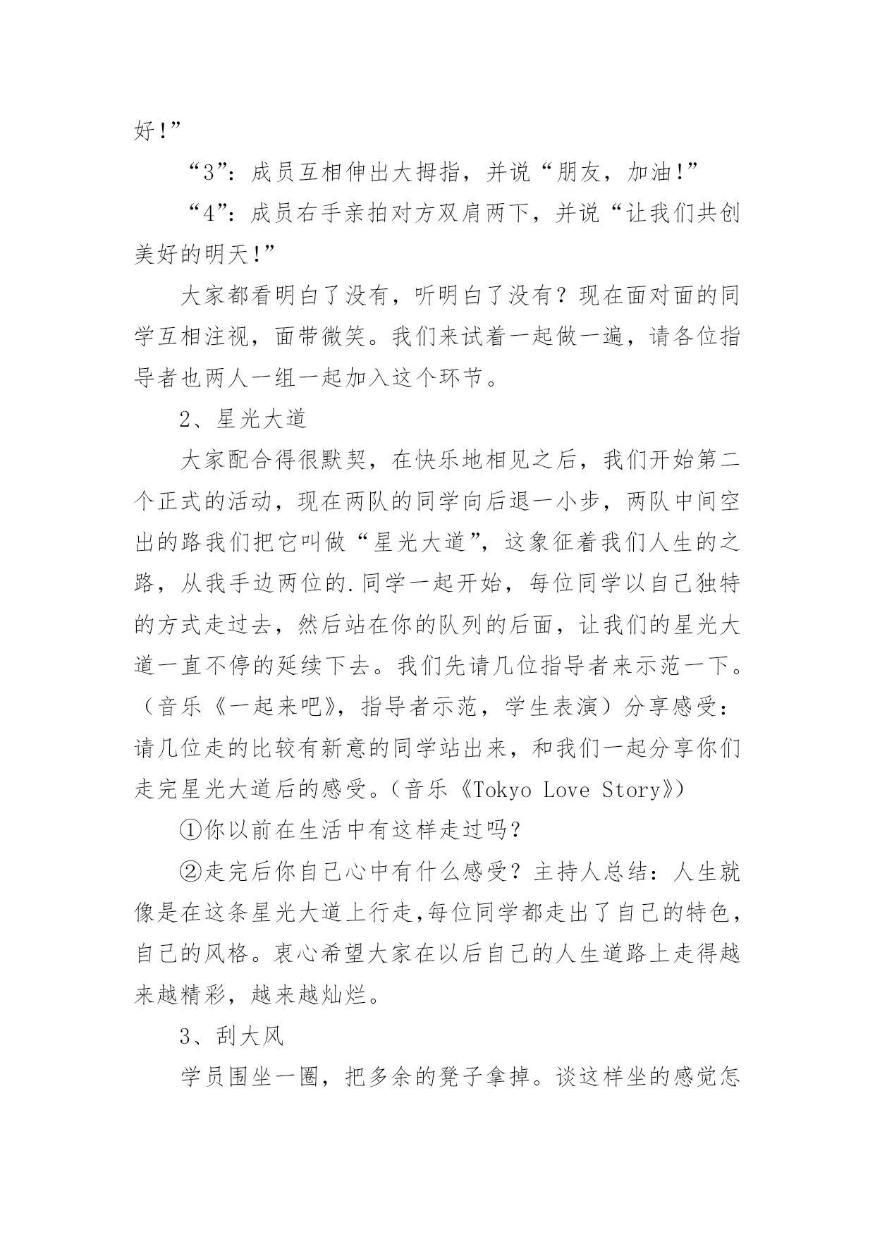 团体心理辅导活动方案为了确保活动科学有序进行,往往需要预先制定好活动方案,活动方案是对具体将要进行的活动进行书面的计划。我们该怎么去写活动方案呢?下面是小编收集整理的团体心理辅导活动方案(精选17篇),欢迎阅读,希望大家能够喜欢。团体心理辅导活动方案1活动主题:“年轻的朋友来相会”活动过程:一、导入开场白(音乐《木林听风》):亲爱的各位同学,你们好!今天我将和大家共同开展一次充满活力、充满趣味的活动。活动的主题是:“年轻的朋友来相会”。在活动时,需要大家按照我的指示、积极配合,你们能做到吗?好,刚才大家的声音让我充分感受到了你们的热情与信心,让我们一起为这份热情与信心表示一下鼓励,好吗。(鼓掌)同心圆:音乐《爱》接下来,在我们今天的活动正式开始之前,先请大家在5秒钟之内,男女相间,手拉手,以我为中心围成一个大的圆圈。(学生演练,主持人倒计时5—4—3—2—1)。好,我们已围成了一个大的圆圈,我们把它叫做“同心圆”,请各位成员站在原地不动,然后轻轻地松开手。二、热身活动1、深呼吸(音乐:《在清晨的第一道曙光》、《童年》)请伸出你的双手,十指交叉,双手紧握,放在胸前。请慢慢闭上你的双眼,暂停八秒钟的呼吸(辅导员从1至8,轻声数数)。好,非常好,现在开始深深吸一口气,感受空气的清新,感受气体从体外流向你的体内,感受胸腔的起伏,你舒服极了。好,不错。想象阳光明媚的春天,你静静地站在草丛中,这里很静,很美,没有烦恼,没有喧嚣,没有一切你不想要的东西。你感觉非常平静,非常放松,非常舒服。深吸一口气,然后慢慢呼出,渐渐地你已经释放掉了所有压在你身上的担子,你很轻松,你很舒服。好,现在,请大家慢慢睁开眼睛。三、相识活动1、相见欢(音乐《相见欢》)现在我们开始进行第一个正式活动,名叫“相见欢”。现在我们要变换队形,请所有成员又快又安静的面对面站成两队,很好!下面我想邀请我们的指导者出来为我们接下来这个名叫“相见欢”活动做个示范。两人一组,指导者互相注视,面带微笑,配合“1”、“2”、“3”、“4”的口令分别做动作:“1”:成员以右手握住对方右手,并说“你好!”“2”:成员两手与对方两手互握,并说:“你的气色很好!”“3”:成员互相伸出大拇指,并说“朋友,加油!”“4”:成员右手亲拍对方双肩两下,并说“让我们共创美好的明天!”大家都看明白了没有,听明白了没有?现在面对面的同学互相注视,面带微笑。我们来试着一起做一遍,请各位指导者也两人一组一起加入这个环节。2、星光大道大家配合得很默契,在快乐地相见之后,我们开始第二个正式的活动,现在两队的同学向后退一小步,两队中间空出的路我们把它叫做“星光大道”,这象征着我们人生的之路,从我手边两位的.同学一起开始,每位同学以自己独特的方式走过去,然后站在你的队列的后面,让我们的星光大道一直不停的延续下去。我们先请几位指导者来示范一下。(音乐《一起来吧》,指导者示范,学生表演)分享感受:请几位走的比较有新意的同学站出来,和我们一起分享你们走完星光大道后的感受。(音乐《TokyoLoveStory》)①你以前在生活中有这样走过吗?②走完后你自己心中有什么感受?主持人总结:人生就像是在这条星光大道上行走,每位同学都走出了自己的特色,自己的风格。衷心希望大家在以后自己的人生道路上走得越来越精彩,越来越灿烂。3、刮大风学员围坐一圈,把多余的凳子拿掉。谈这样坐的感觉怎样?听老师口令:戴眼镜的站起来,找新的位置。穿裙子的站起来,找新位置。大学老师站起来,找位置。男士站起来,找位置。在新的位置上,找不到位的表演一下。最后谈什么感受?4、滚雪球2人拳头尖刀布,选择谁先自我介绍,聊天;转为4人,把小组成员介绍给其他人;转为8人,从某个位置开始,“我来自……性格……”,“旁边的是……”;被8个人记住有什么感受;8个人背对围成一圈。另8个人与之对坐,成为外圈。彼此自我介绍,1分钟后向右走。谈感受。教师点评。5、突围与闯关11人围成一个城堡,1人在中间,要冲出牢笼。(要求:不要伤害他人的身体,接触是允许的。)突围者的感受;小组成员的感受;旁观者的感受。四、相知活动1、同舟共济(25分钟)2、梅花开接下来,我们要进行第三个正式活动,叫做“梅花开”。首先,我来说下活动规则。当我说“梅花梅花开几朵”,大家就齐声说“你说梅花开几朵?”,然后我会说“我说开5朵”,大家要迅速组成5人的小组。也就是,我说开几朵,就是由几人组成一个组。大家听明白了吗?需要的注意是:速度越快越好!现在请集体向右转,大家绕着这个大圈开始慢跑。通过刚才的示范活动,大家都明白了这个游戏的规则,我们就再来一次,请大家依旧站成一个同心圆。(音乐《巴西拉丁舞》)好,在刚刚的活动中,尽管有些同学没能成为美丽的梅花中一朵,但是那并不重要,因为我们其他的梅花小家都已经接纳了他们,使他