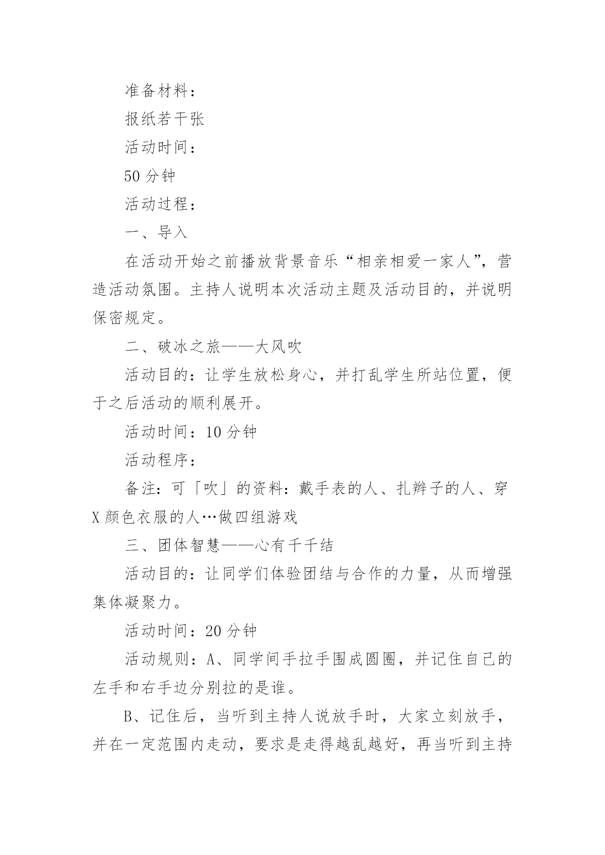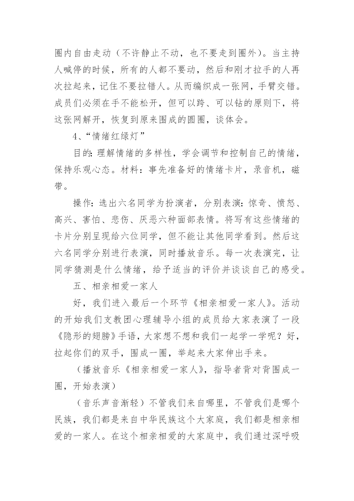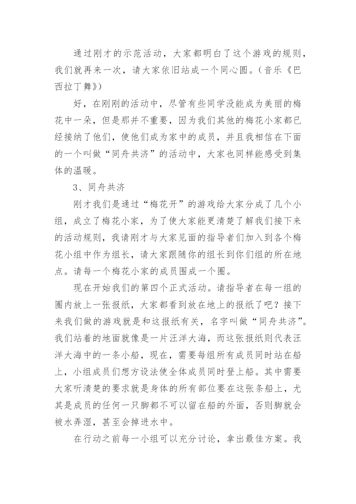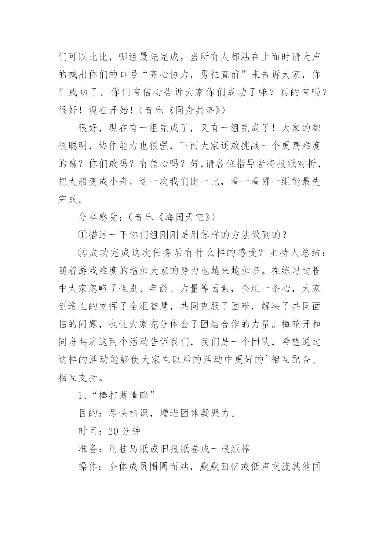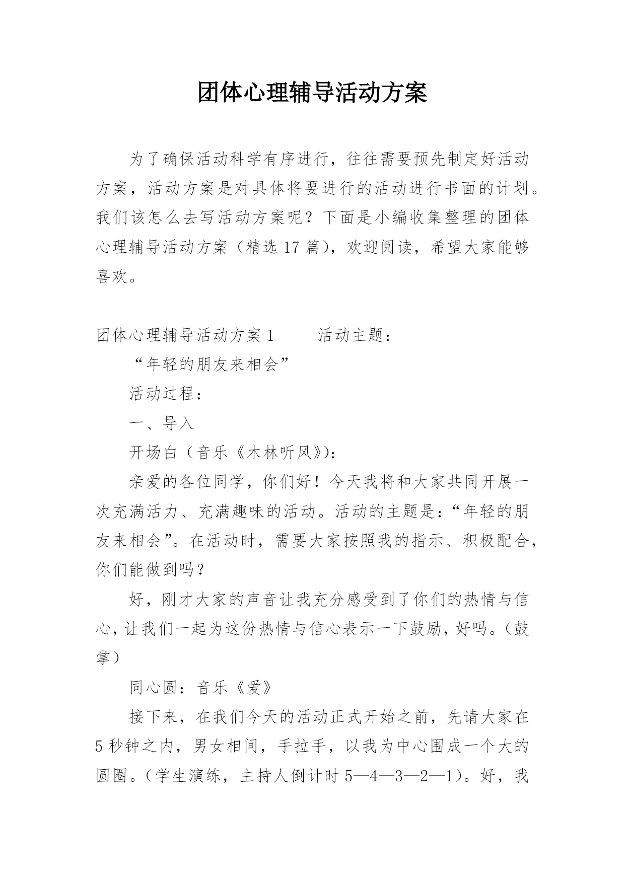 团体心理辅导活动方案为了确保活动科学有序进行,往往需要预先制定好活动方案,活动方案是对具体将要进行的活动进行书面的计划。我们该怎么去写活动方案呢?下面是小编收集整理的团体心理辅导活动方案(精选17篇),欢迎阅读,希望大家能够喜欢。团体心理辅导活动方案1活动主题:“年轻的朋友来相会”活动过程:一、导入开场白(音乐《木林听风》):亲爱的各位同学,你们好!今天我将和大家共同开展一次充满活力、充满趣味的活动。活动的主题是:“年轻的朋友来相会”。在活动时,需要大家按照我的指示、积极配合,你们能做到吗?好,刚才大家的声音让我充分感受到了你们的热情与信心,让我们一起为这份热情与信心表示一下鼓励,好吗。(鼓掌)同心圆:音乐《爱》接下来,在我们今天的活动正式开始之前,先请大家在5秒钟之内,男女相间,手拉手,以我为中心围成一个大的圆圈。(学生演练,主持人倒计时5—4—3—2—1)。好,我们已围成了一个大的圆圈,我们把它叫做“同心圆”,请各位成员站在原地不动,然后轻轻地松开手。二、热身活动1、深呼吸(音乐:《在清晨的第一道曙光》、《童年》)请伸出你的双手,十指交叉,双手紧握,放在胸前。请慢慢闭上你的双眼,暂停八秒钟的呼吸(辅导员从1至8,轻声数数)。好,非常好,现在开始深深吸一口气,感受空气的清新,感受气体从体外流向你的体内,感受胸腔的起伏,你舒服极了。好,不错。想象阳光明媚的春天,你静静地站在草丛中,这里很静,很美,没有烦恼,没有喧嚣,没有一切你不想要的东西。你感觉非常平静,非常放松,非常舒服。深吸一口气,然后慢慢呼出,渐渐地你已经释放掉了所有压在你身上的担子,你很轻松,你很舒服。好,现在,请大家慢慢睁开眼睛。三、相识活动1、相见欢(音乐《相见欢》)现在我们开始进行第一个正式活动,名叫“相见欢”。现在我们要变换队形,请所有成员又快又安静的面对面站成两队,很好!下面我想邀请我们的指导者出来为我们接下来这个名叫“相见欢”活动做个示范。两人一组,指导者互相注视,面带微笑,配合“1”、“2”、“3”、“4”的口令分别做动作:“1”:成员以右手握住对方右手,并说“你好!”“2”:成员两手与对方两手互握,并说:“你的气色很好!”“3”:成员互相伸出大拇指,并说“朋友,加油!”“4”:成员右手亲拍对方双肩两下,并说“让我们共创美好的明天!”大家都看明白了没有,听明白了没有?现在面对面的同学互相注视,面带微笑。我们来试着一起做一遍,请各位指导者也两人一组一起加入这个环节。2、星光大道大家配合得很默契,在快乐地相见之后,我们开始第二个正式的活动,现在两队的同学向后退一小步,两队中间空出的路我们把它叫做“星光大道”,这象征着我们人生的之路,从我手边两位的.同学一起开始,每位同学以自己独特的方式走过去,然后站在你的队列的后面,让我们的星光大道一直不停的延续下去。我们先请几位指导者来示范一下。(音乐《一起来吧》,指导者示范,学生表演)分享感受:请几位走的比较有新意的同学站出来,和我们一起分享你们走完星光大道后的感受。(音乐《TokyoLoveStory》)①你以前在生活中有这样走过吗?②走完后你自己心中有什么感受?主持人总结:人生就像是在这条星光大道上行走,每位同学都走出了自己的特色,自己的风格。衷心希望大家在以后自己的人生道路上走得越来越精彩,越来越灿烂。3、刮大风学员围坐一圈,把多余的凳子拿掉。谈这样坐的感觉怎样?听老师口令:戴眼镜的站起来,找新的位置。穿裙子的站起来,找新位置。大学老师站起来,找位置。男士站起来,找位置。在新的位置上,找不到位的表演一下。最后谈什么感受?4、滚雪球2人拳头尖刀布,选择谁先自我介绍,聊天;转为4人,把小组成员介绍给其他人;转为8人,从某个位置开始,“我来自……性格……”,“旁边的是……”;被8个人记住有什么感受;8个人背对围成一圈。另8个人与之对坐,成为外圈。彼此自我介绍,1分钟后向右走。谈感受。教师点评。5、突围与闯关11人围成一个城堡,1人在中间,要冲出牢笼。(要求:不要伤害他人的身体,接触是允许的。)突围者的感受;小组成员的感受;旁观者的感受。四、相知活动1、同舟共济(25分钟)2、梅花开接下来,我们要进行第三个正式活动,叫做“梅花开”。首先,我来说下活动规则。当我说“梅花梅花开几朵”,大家就齐声说“你说梅花开几朵?”,然后我会说“我说开5朵”,大家要迅速组成5人的小组。也就是,我说开几朵,就是由几人组成一个组。大家听明白了吗?需要的注意是:速度越快越好!现在请集体向右转,大家绕着这个大圈开始慢跑。通过刚才的示范活动,大家都明白了这个游戏的规则,我们就再来一次,请大家依旧站成一个同心圆。(音乐《巴西拉丁舞》)好,在刚刚的活动中,尽管有些同学没能成为美丽的梅花中一朵,但是那并不重要,因为我们其他的梅花小家都已经接纳了他们,使他
