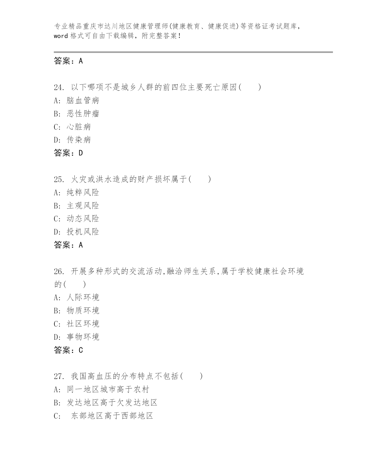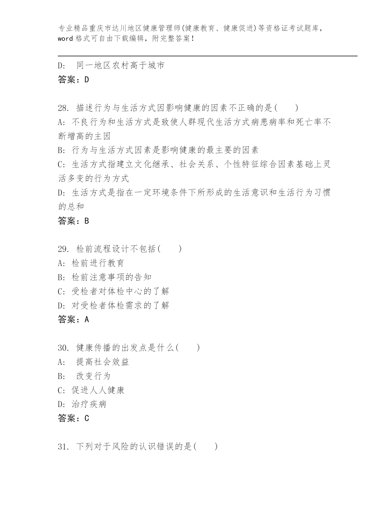内部培训重庆市达川地区健康管理师(健康教育、健康促进)等资格证考试【综合卷】.docx