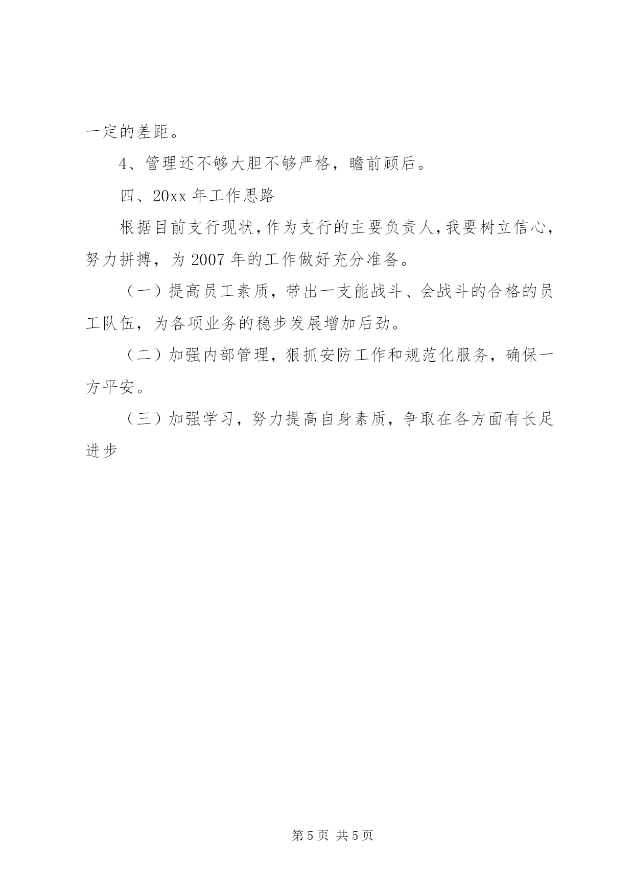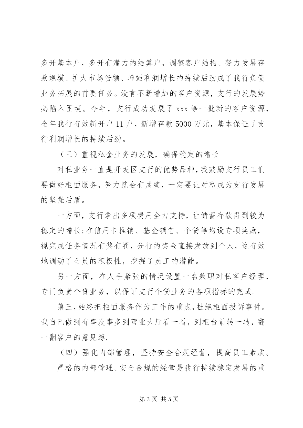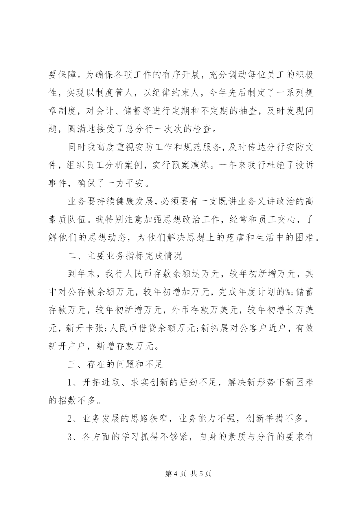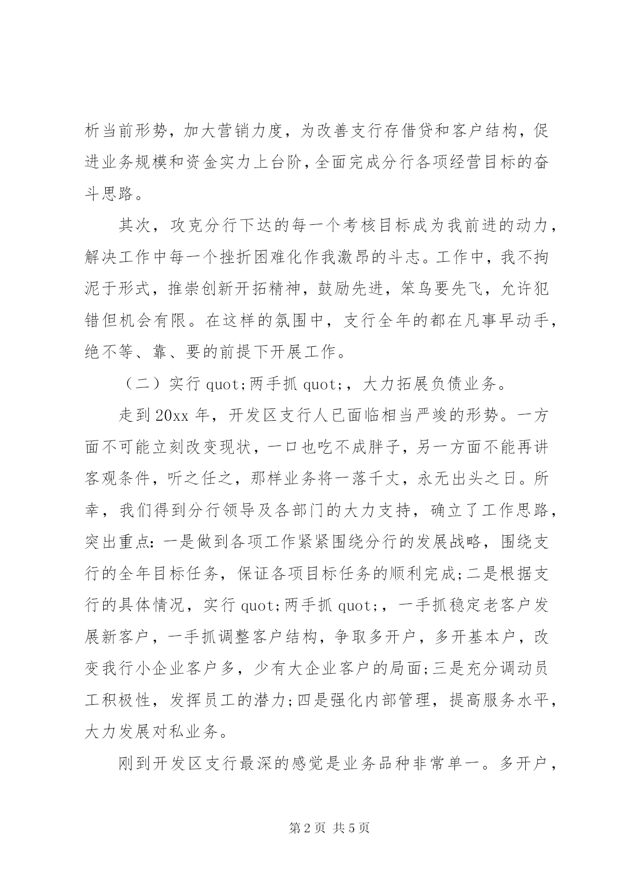 第PAGE\*Arabic\*MERGEFORMAT5页共NUMPAGES\*MERGEFORMAT5页工商银行行长述职报告20xx年是工商银行发展史上浓墨重彩的一年,是分行党委决心锐意改革,快速发展的一年,我是20xx年初担任支行行长的。一年来,在分行党委的正确领导下,在全行员工的大力支持下,我认真履行行长的职责,较好地完成了上级行交给的年度的工作任务,回顾刚刚过去的一年,我深切地感受到这一年的不平凡。现按照分行的要求,将自己一年来的工作简要汇报如下:一、主要履职情况(一)以旺盛的斗志、饱满的精神状态投入到工作中,鞭策自我,激励全行。开发区支行是中心支行中规模较小、业务结构不够合理的支行,有一定的quot;先天不足quot;,加之两年来业务发展辗转俳徊,发展劲头明显不足。此时作为支行负责人,我深知没有扎实稳健的工作作风、坚持不懈的敬业精神,支行将难以生存和发展,但是困难不能说明问题,解决困难才能说明更多的问题。因此,quot;不仅要带着干,而且要带头干quot;成为我的工作姿态。首先,要成为一名优秀的指挥官、锐意的战斗员,我的定位是一只率先垂范的quot;领头羊quot;。自己不断进取,勤奋勤政的精神面貌才能带动一支能征善战的员工队伍,这也是赢得日趋严酷竞争市场的必要条件。对此,我确立了开发区支行:每位员工都要深入贯彻分行党委的转型和发展的工作要求,认清并分析当前形势,加大营销力度,为改善支行存借贷和客户结构,促进业务规模和资金实力上台阶,全面完成分行各项经营目标的奋斗思路。其次,攻克分行下达的每一个考核目标成为我前进的动力,解决工作中每一个挫折困难化作我激昂的斗志。工作中,我不拘泥于形式,推崇创新开拓精神,鼓励先进,笨鸟要先飞,允许犯错但机会有限。在这样的氛围中,支行全年的都在凡事早动手,绝不等、靠、要的前提下开展工作。(二)实行quot;两手抓quot;,大力拓展负债业务。走到20xx年,开发区支行人已面临相当严竣的形势。一方面不可能立刻改变现状,一口也吃不成胖子,另一方面不能再讲客观条件,听之任之,那样业务将一落千丈,永无出头之日。所幸,我们得到分行领导及各部门的大力支持,确立了工作思路,突出重点:一是做到各项工作紧紧围绕分行的发展战略,围绕支行的全年目标任务,保证各项目标任务的顺利完成;二是根据支行的具体情况,实行quot;两手抓quot;,一手抓稳定老客户发展新客户,一手抓调整客户结构,争取多开户,多开基本户,改变我行小企业客户多,少有大企业客户的局面;三是充分调动员工积极性,发挥员工的潜力;四是强化内部管理,提高服务水平,大力发展对私业务。刚到开发区支行最深的感觉是业务品种非常单一。多开户,多开基本户,多开有潜力的结算户,调整客户结构、努力发展存款规模、扩大市场份额、增强利润增长的持续后劲成了我行负债业务拓展的首要任务。没有不断增加的客户资源,支行的发展势必陷入困境。今年,支行成功发展了xxx等一批新的客户资源,全年我行有效新开户11户,新增存款5000万元,基本保证了支行利润增长的持续后劲。(三)重视私金业务的发展,确保稳定的增长对私业务一直是开发区支行的优势品种,我鼓励支行员工们要做好柜面服务,努力就会有成绩,一定要让对私成为支行发展的坚强后盾。一方面,支行拿出多项费用全力支持,让储蓄存款得到较为稳定的增长;在信用卡推销、基金销售、个贷等均设专项奖励,视完成任务情况有奖有罚,分行的奖金直接发放到个人,这有效地调动了全员的积极性,挖掘了员工的潜能。另一方面,在人手紧张的情况设置一名兼职对私客户经理,专门负责个贷业务,以保证支行个贷业务的各项指标的完成.第三,始终把柜面服务作为工作的重点,杜绝柜面投诉事件。我自己做到有事没事多到营业大厅看一看,到柜台前转一转,翻一翻客户的意见簿.(四)强化内部管理,坚持安全合规经营,提高员工素质。严格的内部管理、安全合规的经营是我行持续稳定发展的重要保障。为确保各项工作的有序开展,充分调动每位员工的积极性,实现以制度管人,以纪律约束人,今年先后制定了一系列规章制度,对会计、储蓄等进行定期和不定期的抽查,及时发现问题,圆满地接受了总分行一次次的检查。同时我高度重视安防工作和规范服务,及时传达分行安防文件,组织员工分析案例,实行预案演练。一年来我行杜绝了投诉事件,确保了一方平安。业务要持续健康发展,必须要有一支既讲业务又讲政治的高素质队伍。我特别注意加强思想政治工作,经常和员工交心,了解他们的思想动态,为他们解决思想上的疙瘩和生活中的困难。二、主要业务指标完成情况到年末,我行人民币存款余额达万元,较年初新增万元,其中对公存款余额万元,较年初增加万元,完成年度计划的%;储蓄存款万元,较年初新增万元,外币存款万美元,较年初增长万美元,新开卡张;人民币借贷余额万元